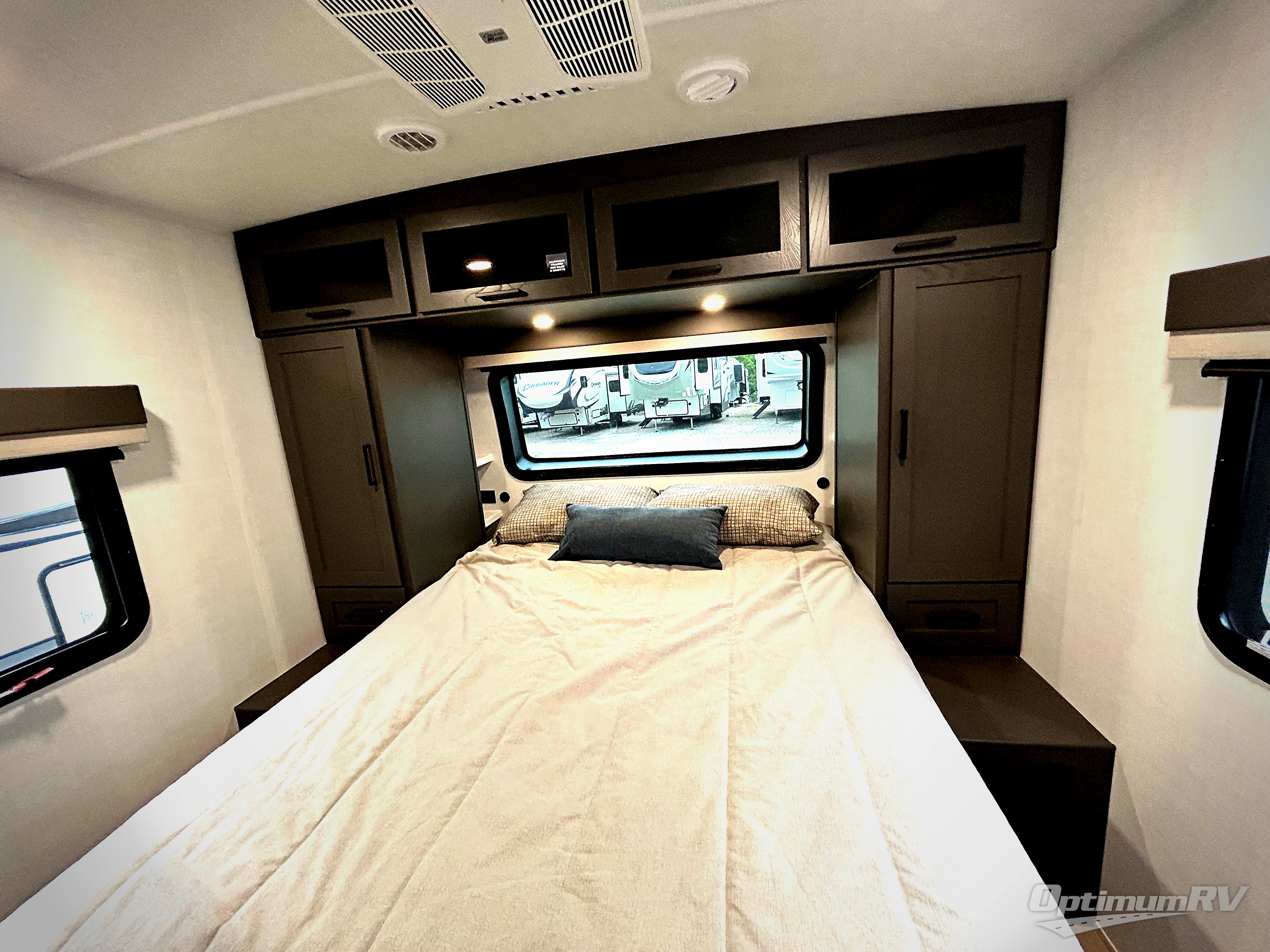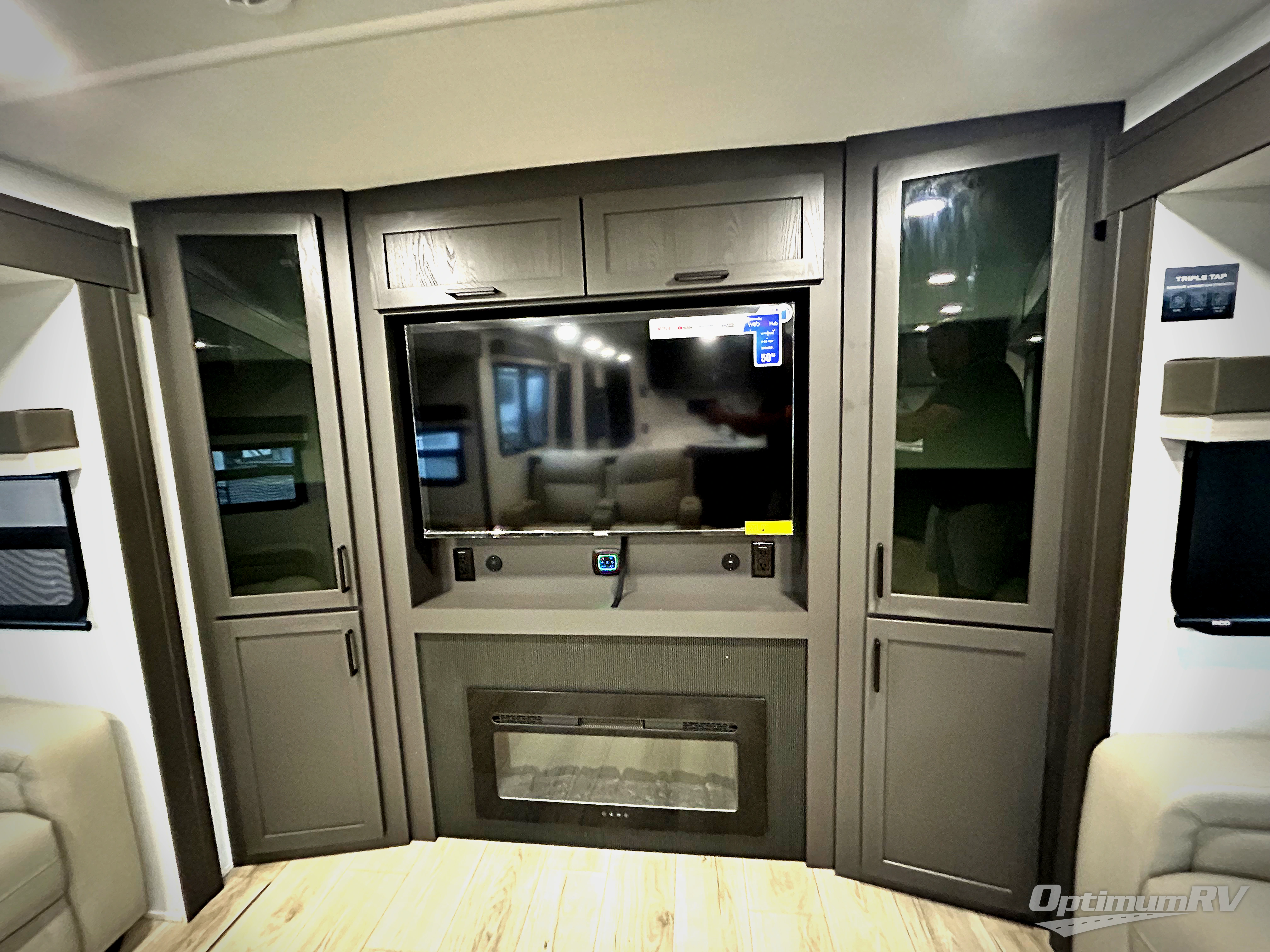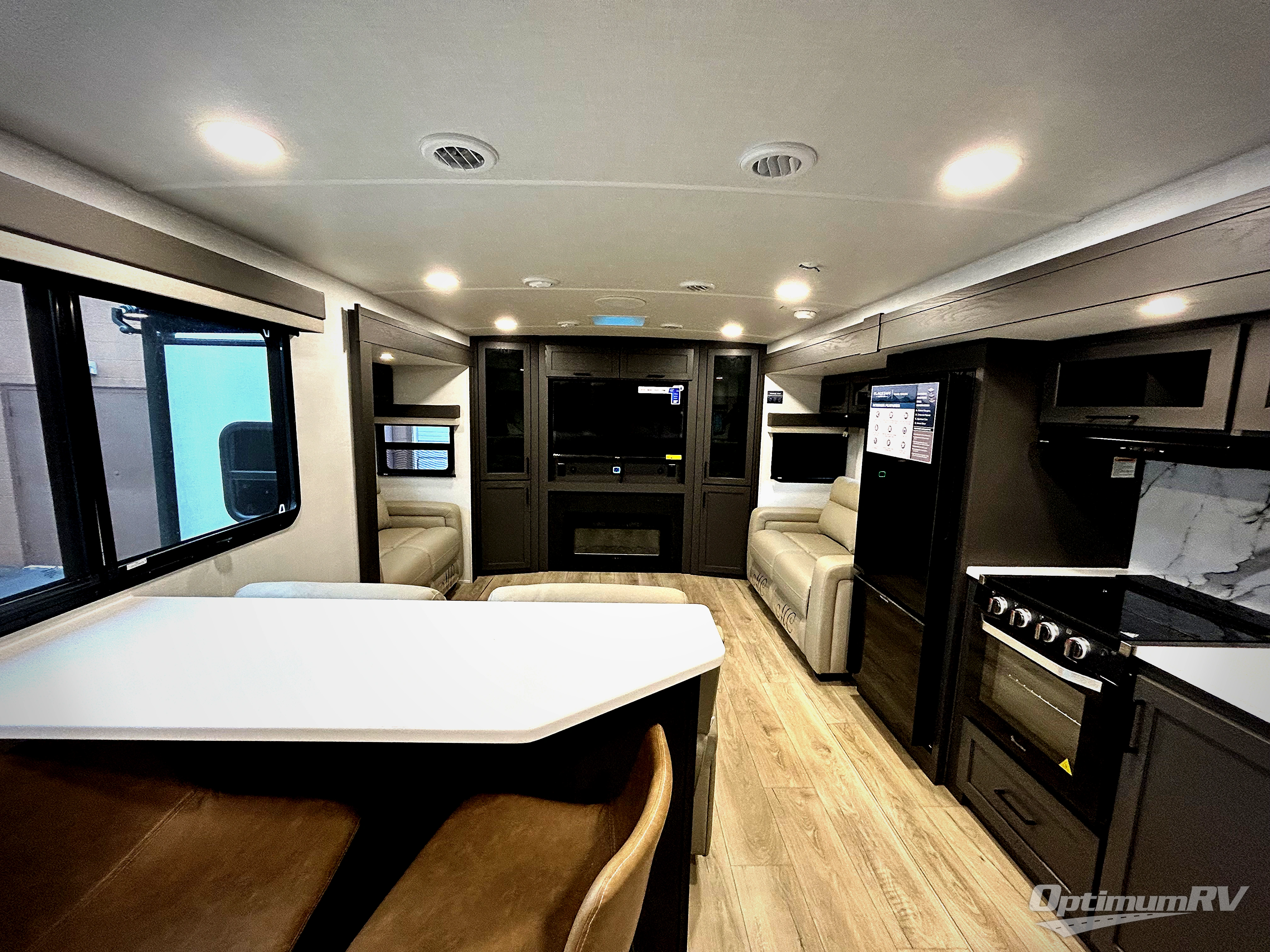 Weekends at the lake are made easy in this spacious travel trailer that can sleep six each night. Once you arrive at the campsite, unload your things from the pass-thru storage with an optional steel sliding tray, set up the 19' power awning, then head out on a trail to stretch your legs. You can freshen up in the full bath when you return before preparing lunch for everyone. A three burner cooktop comes standard, along with a gas oven and microwave oven, and there is a table with bar stools that overlooks the rear living area for those who want to relax. Your guests can convert the rear living area into their bedroom at night since there are dual hide-a-bed sofas, and the rear entertainment center includes a Smart TV so they can watch a movie in bed. And check out the private bedroom with a queen bed, triple wardrobes, and a TV option if you enjoy watching movies in bed.