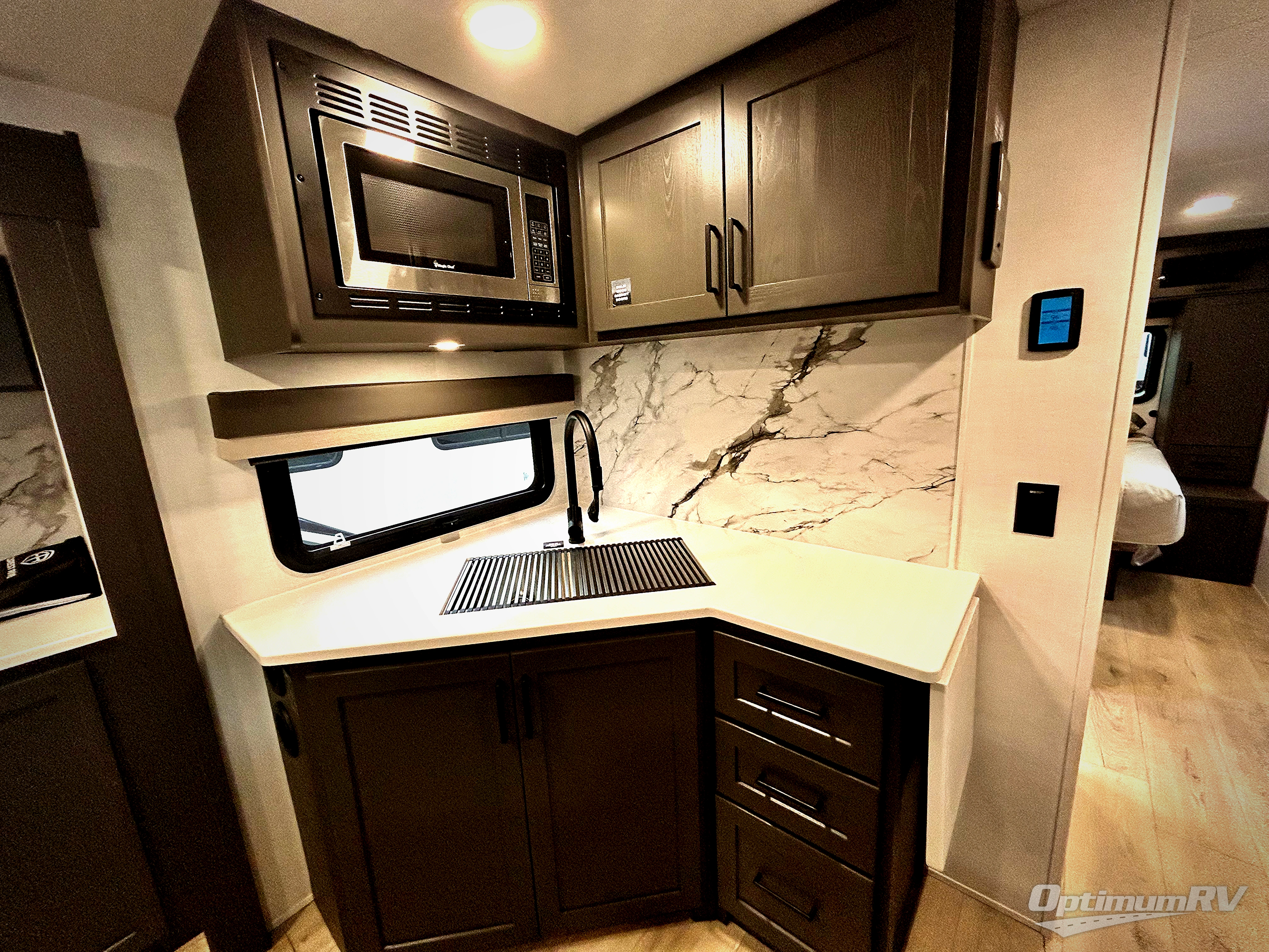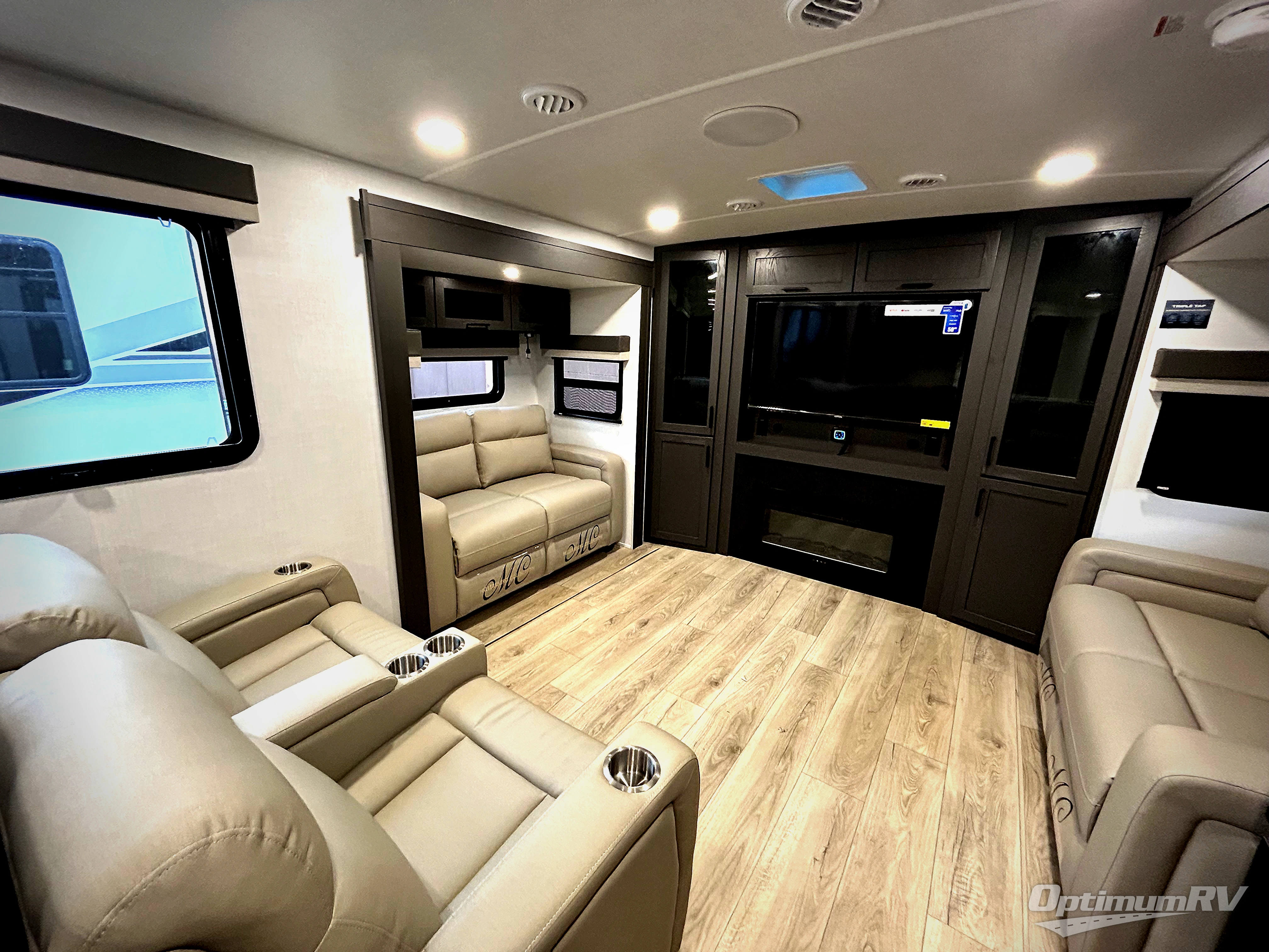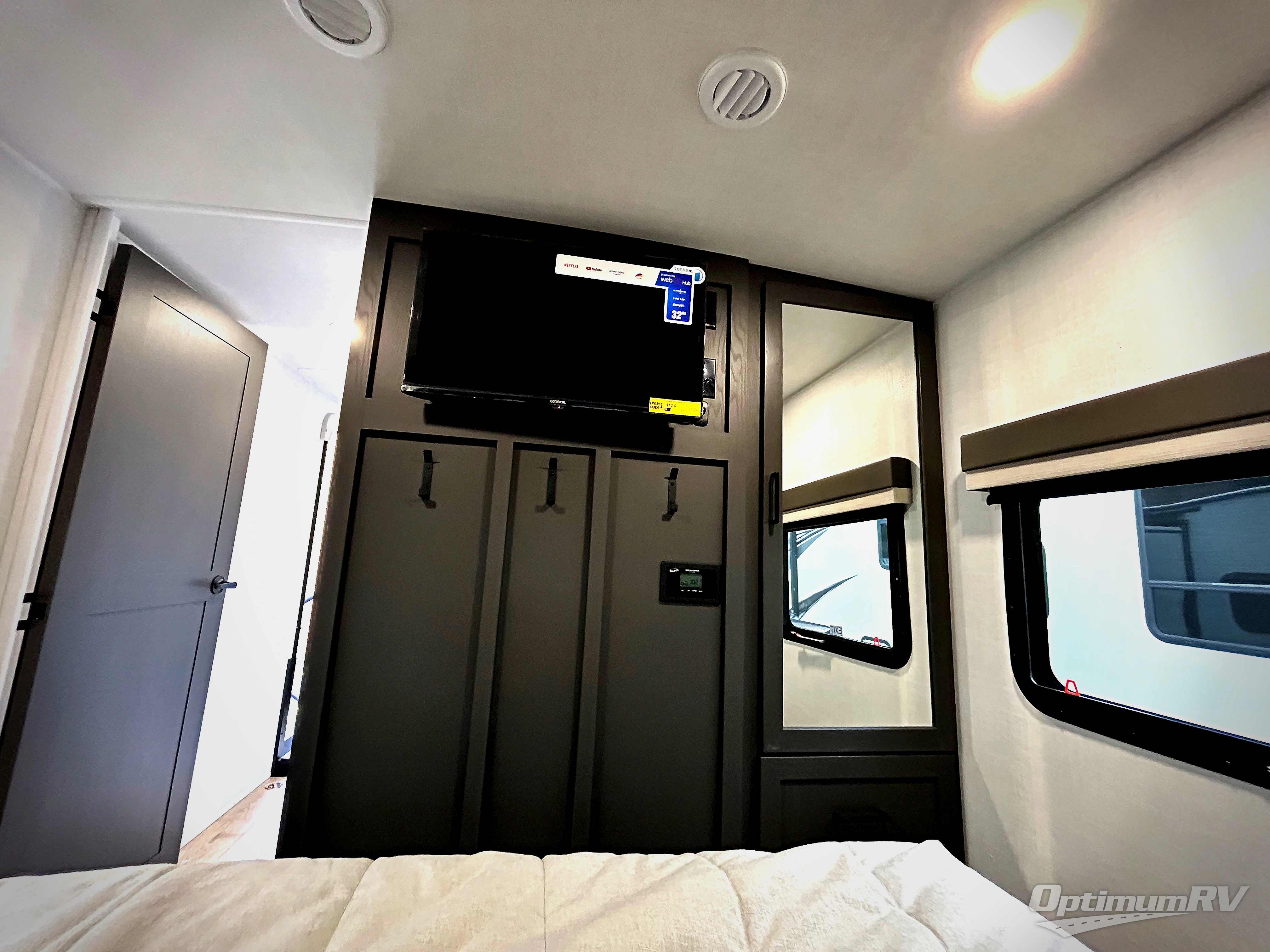 Weekends at the lake are made easy in this spacious travel trailer that can sleep six each night. Once you arrive at the campsite, unload your things from the pass-thru storage with an optional steel sliding tray, set up the 19' power awning, then head out on a trail to stretch your legs. You can freshen up in the full bath when you return before preparing lunch for everyone. A three burner cooktop comes standard, along with a gas oven and microwave oven, and there is a table with bar stools that overlooks the rear living area for those who want to relax. Your guests can convert the rear living area into their bedroom at night since there are dual hide-a-bed sofas, and the rear entertainment center includes a Smart TV so they can watch a movie in bed. And check out the private bedroom with a queen bed, triple wardrobes, and a TV option if you enjoy watching movies in bed.