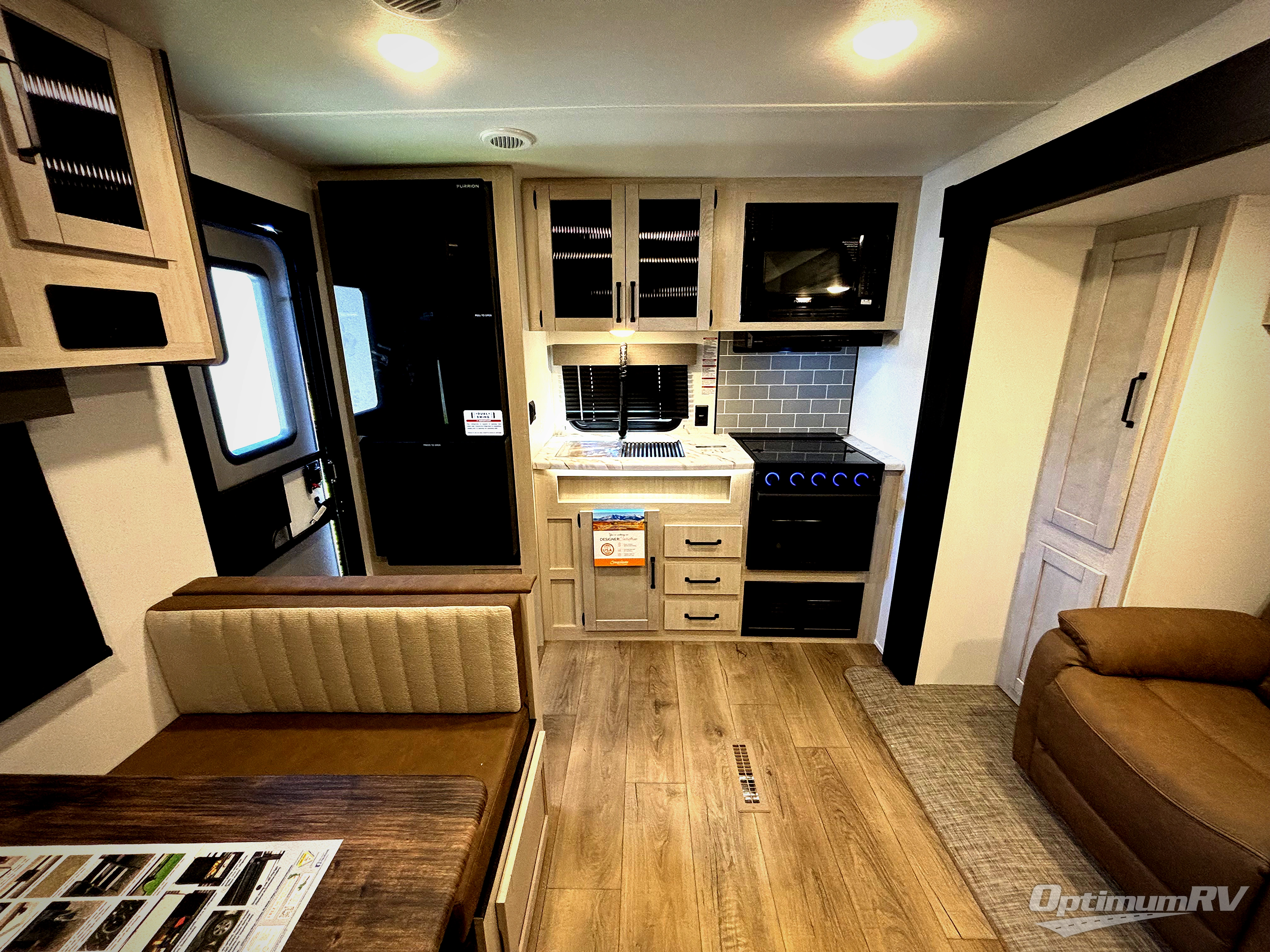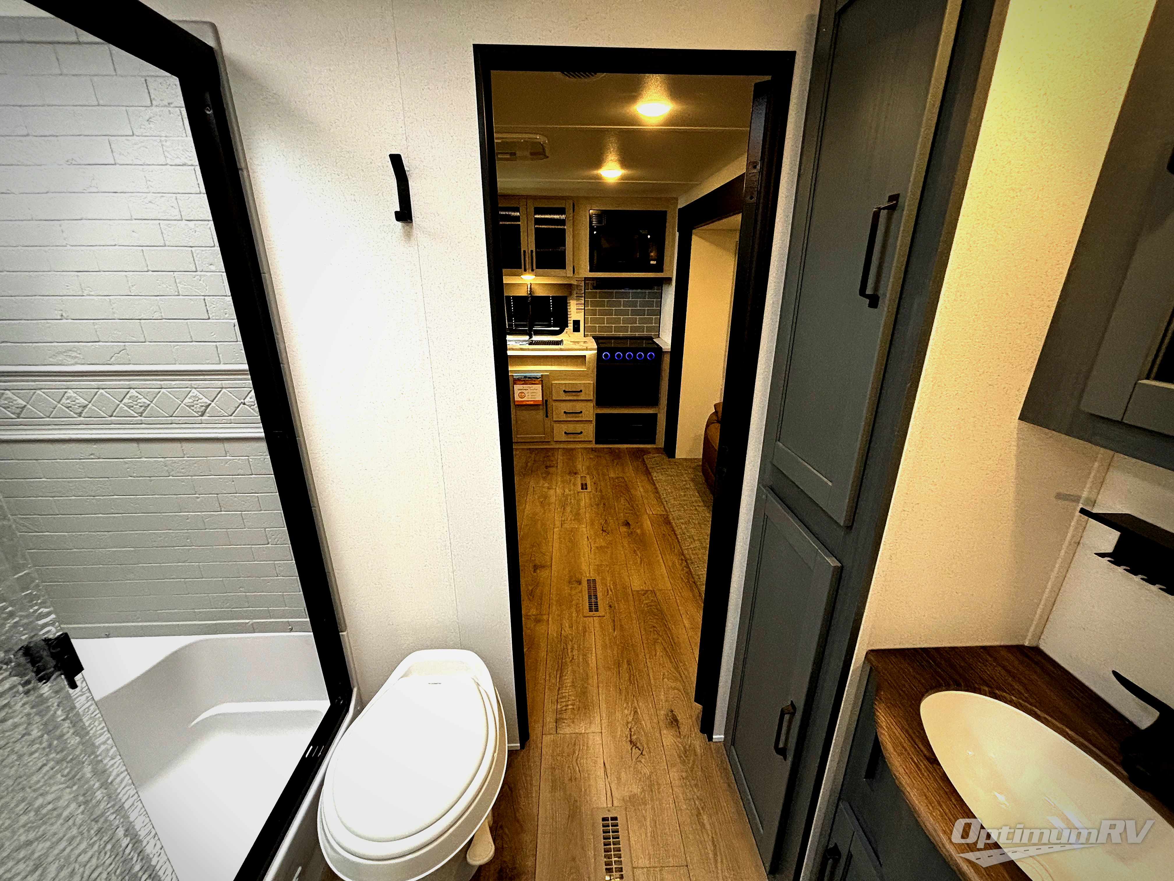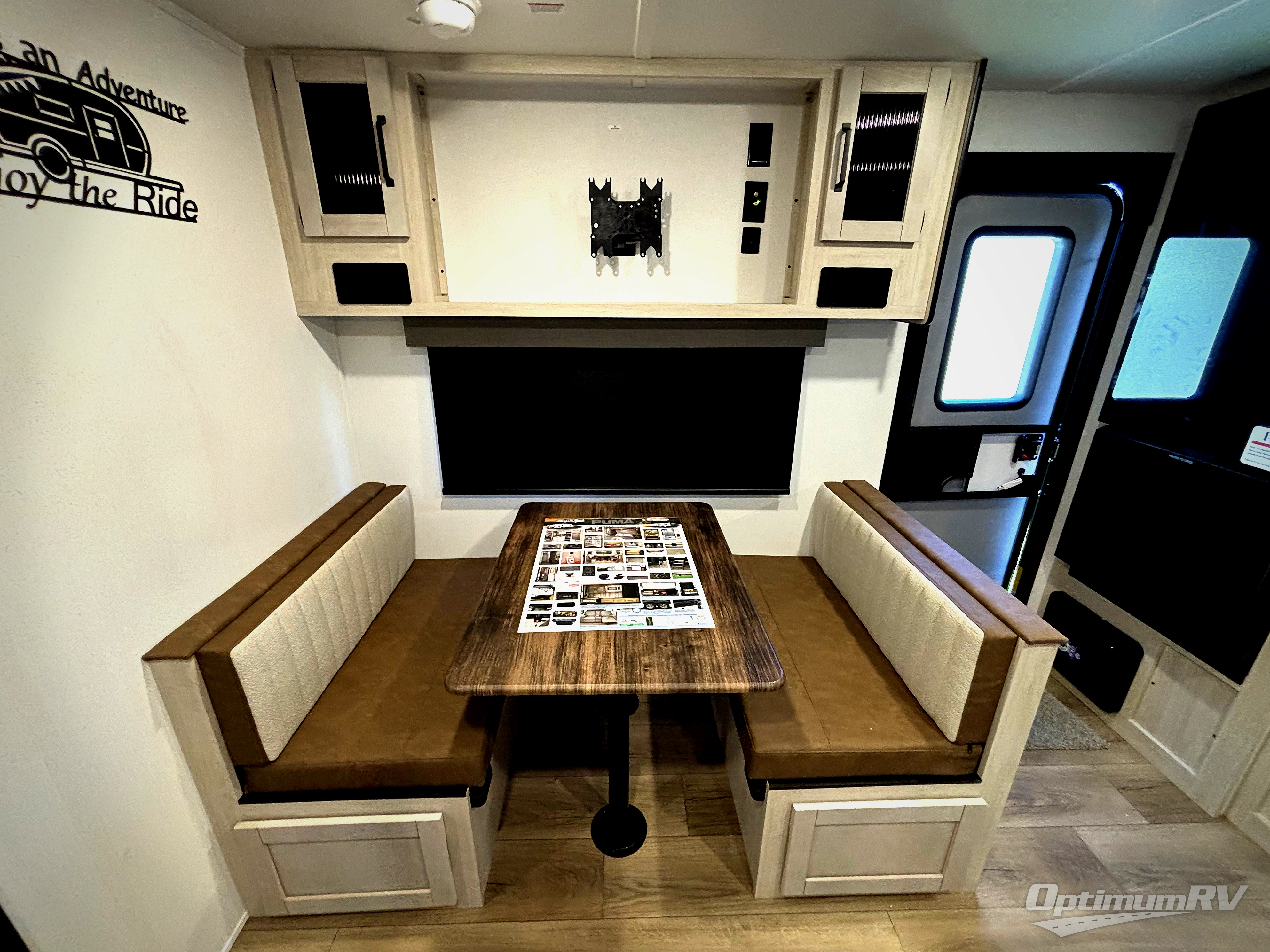 This rear kitchen travel trailer will be perfect for camping trips to the lake or woods! Once you've made breakfast on the stainless steel oven and range, you can dine at the booth dinette or take your plate outdoors to sit under the 18' electric awning. There is also a sofa slide out inside for a comfy place to relax. The walk-thru bath features a shower with a seat for added comfort, and you'll love having your own space in the front master bedroom. Here, you'll find a queen bed plus dual bedside closets to keep your things organized!