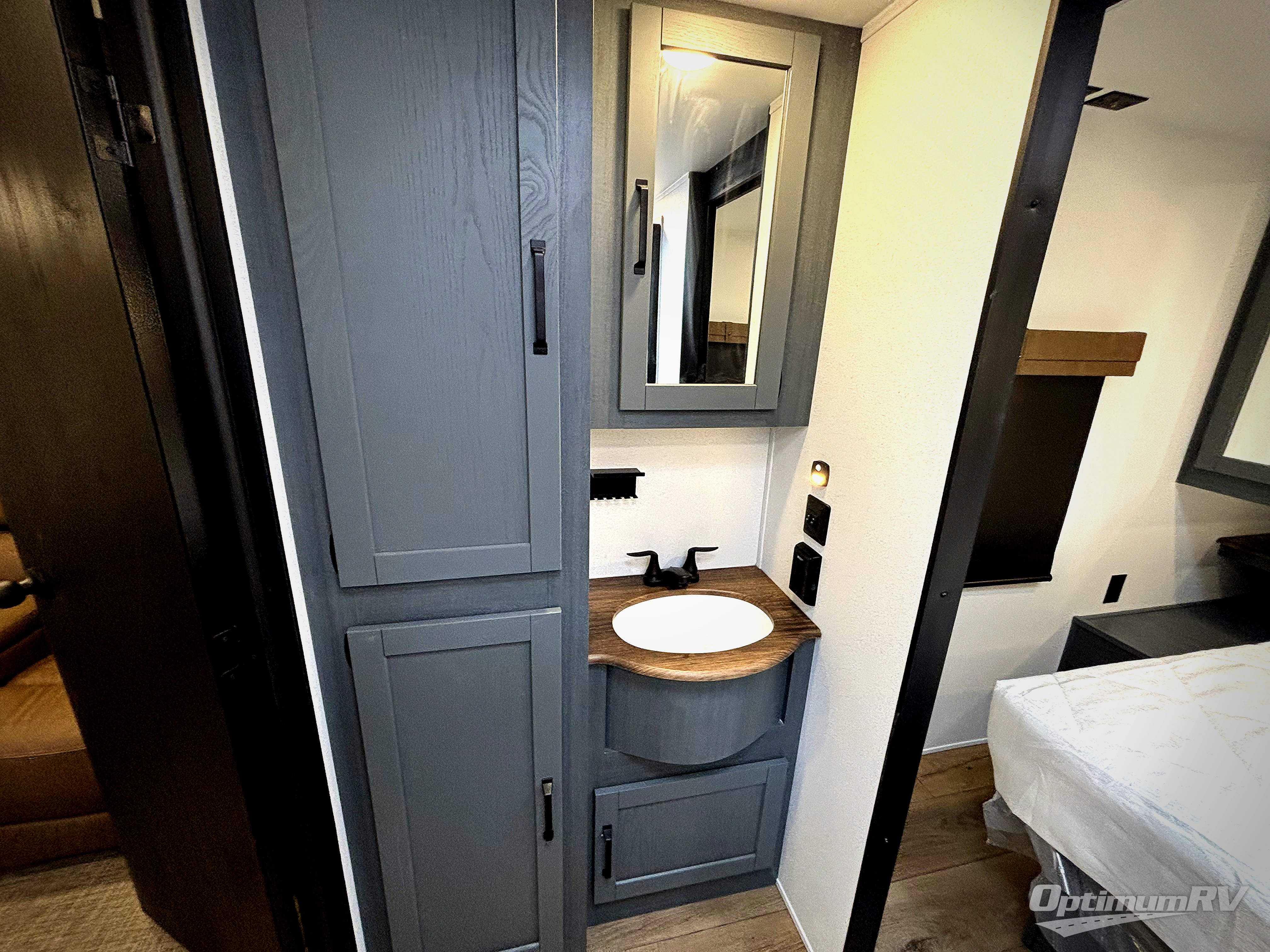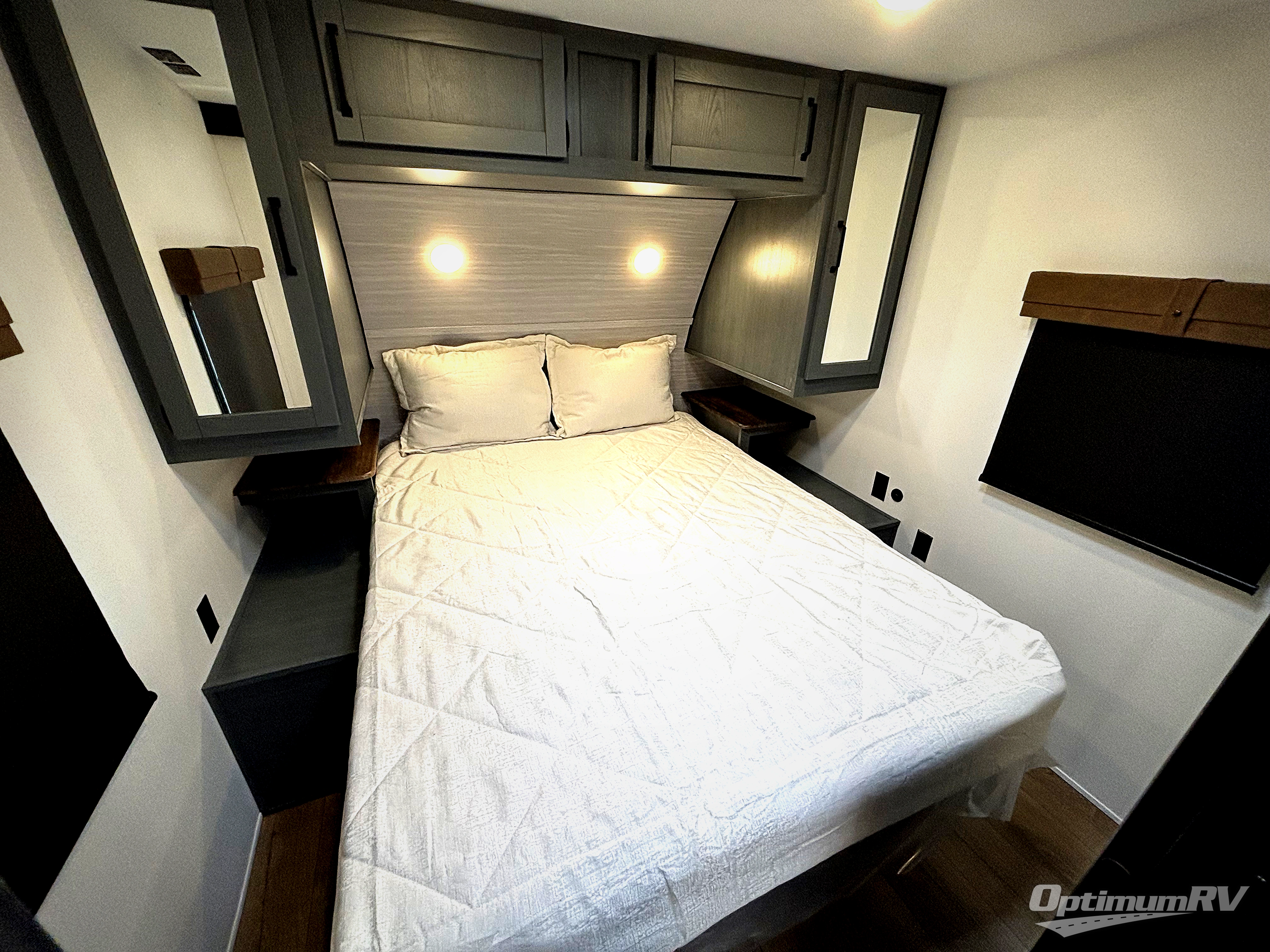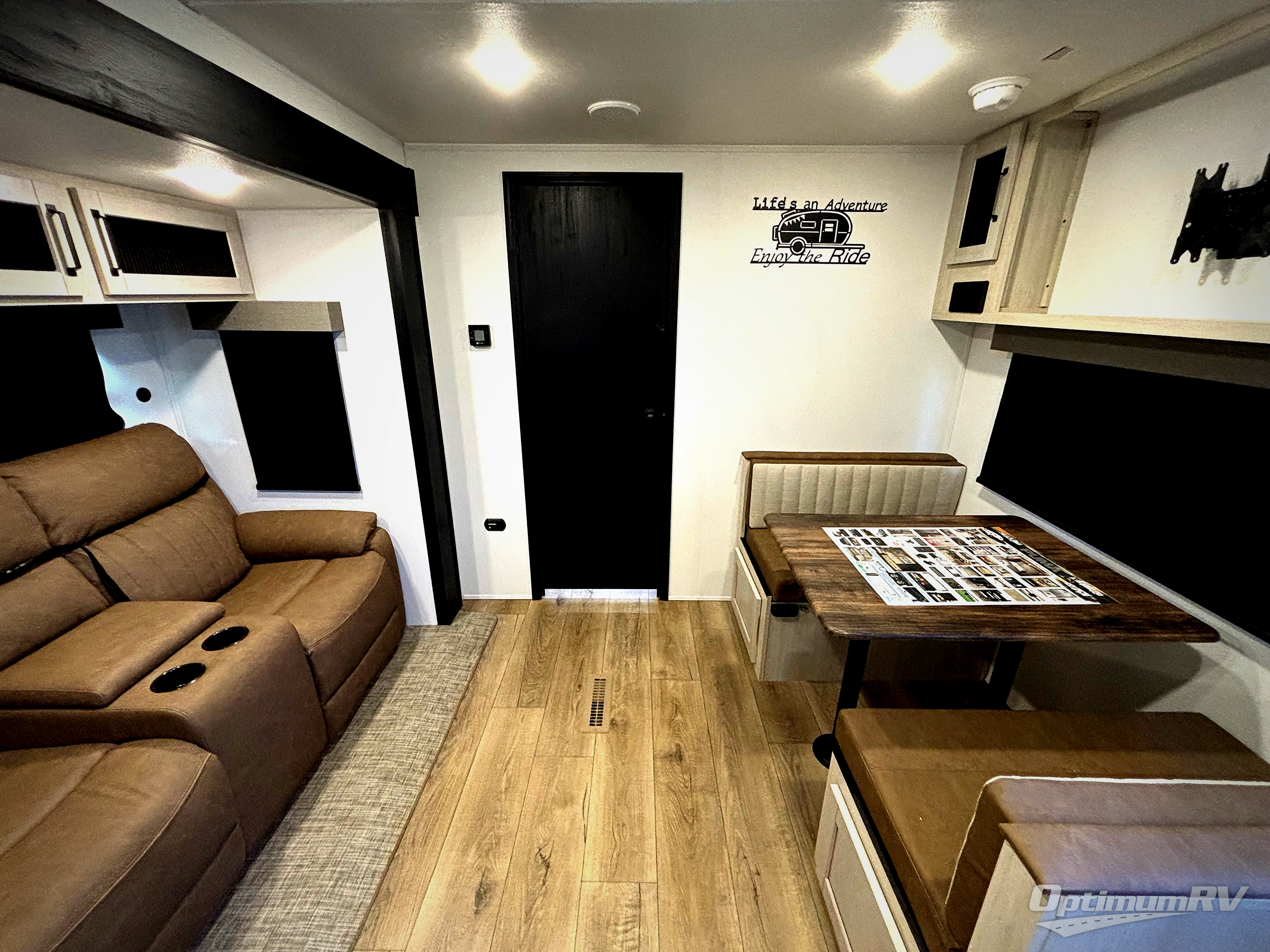 This rear kitchen travel trailer will be perfect for camping trips to the lake or woods! Once you've made breakfast on the stainless steel oven and range, you can dine at the booth dinette or take your plate outdoors to sit under the 18' electric awning. There is also a sofa slide out inside for a comfy place to relax. The walk-thru bath features a shower with a seat for added comfort, and you'll love having your own space in the front master bedroom. Here, you'll find a queen bed plus dual bedside closets to keep your things organized!