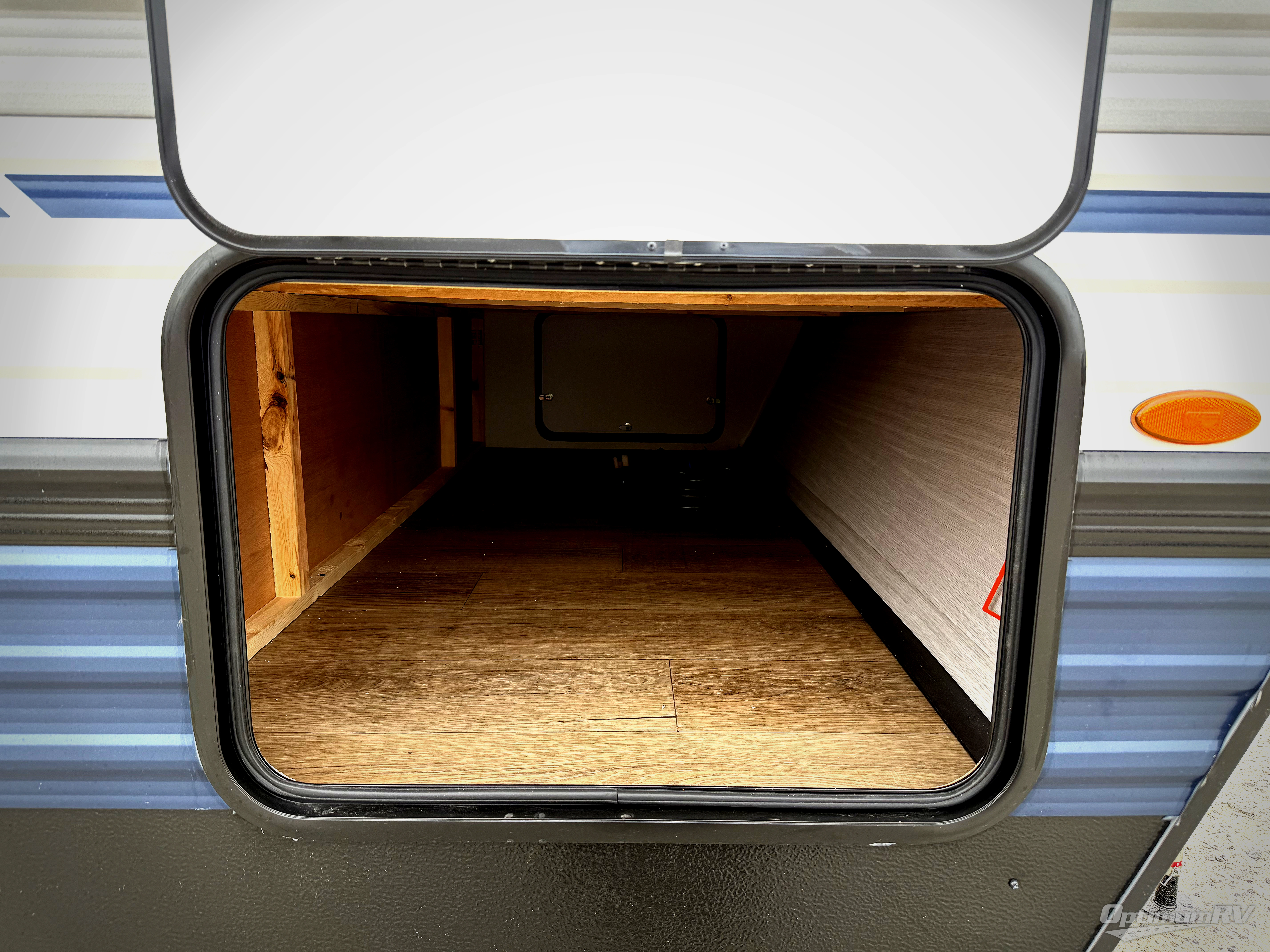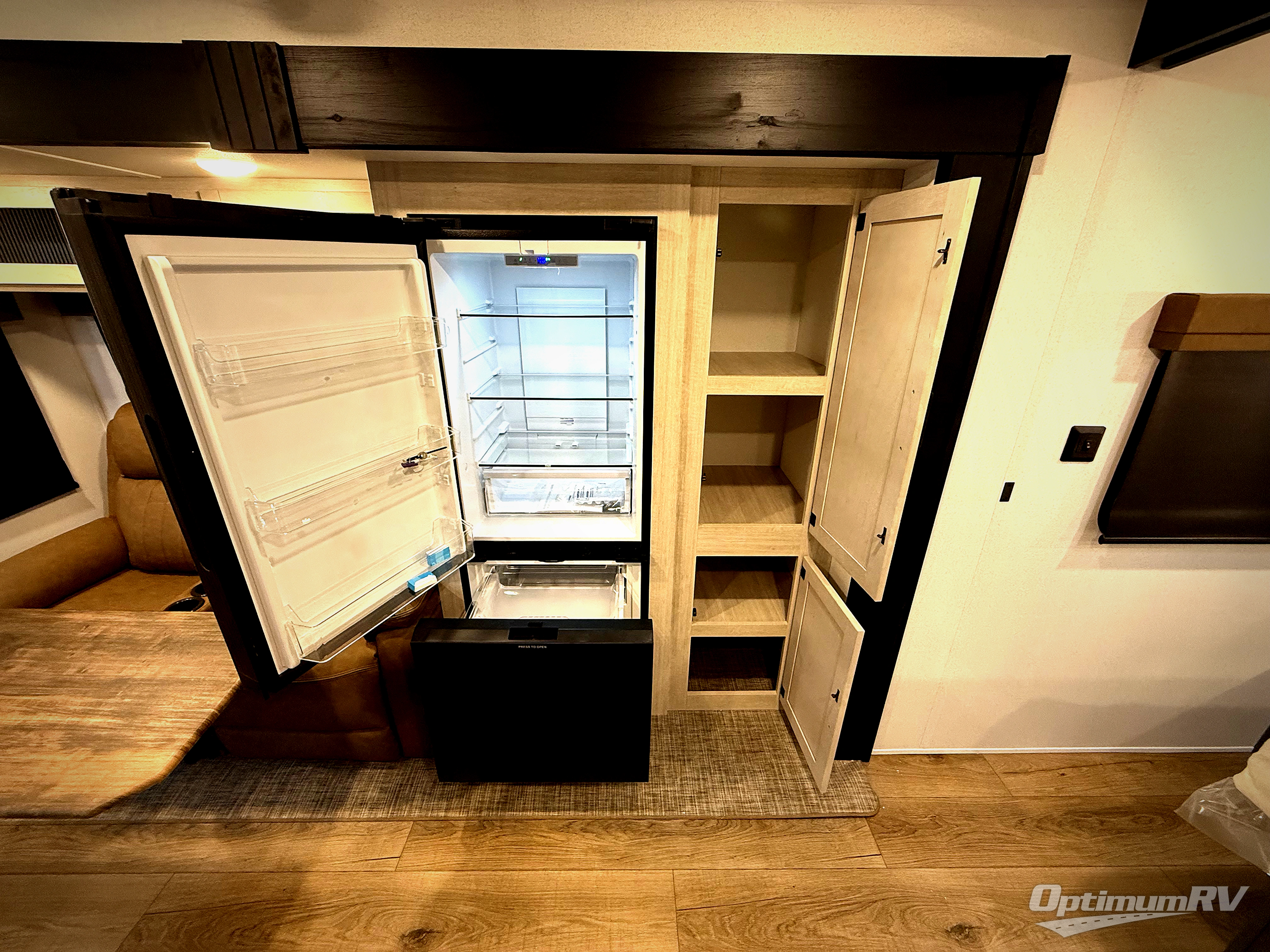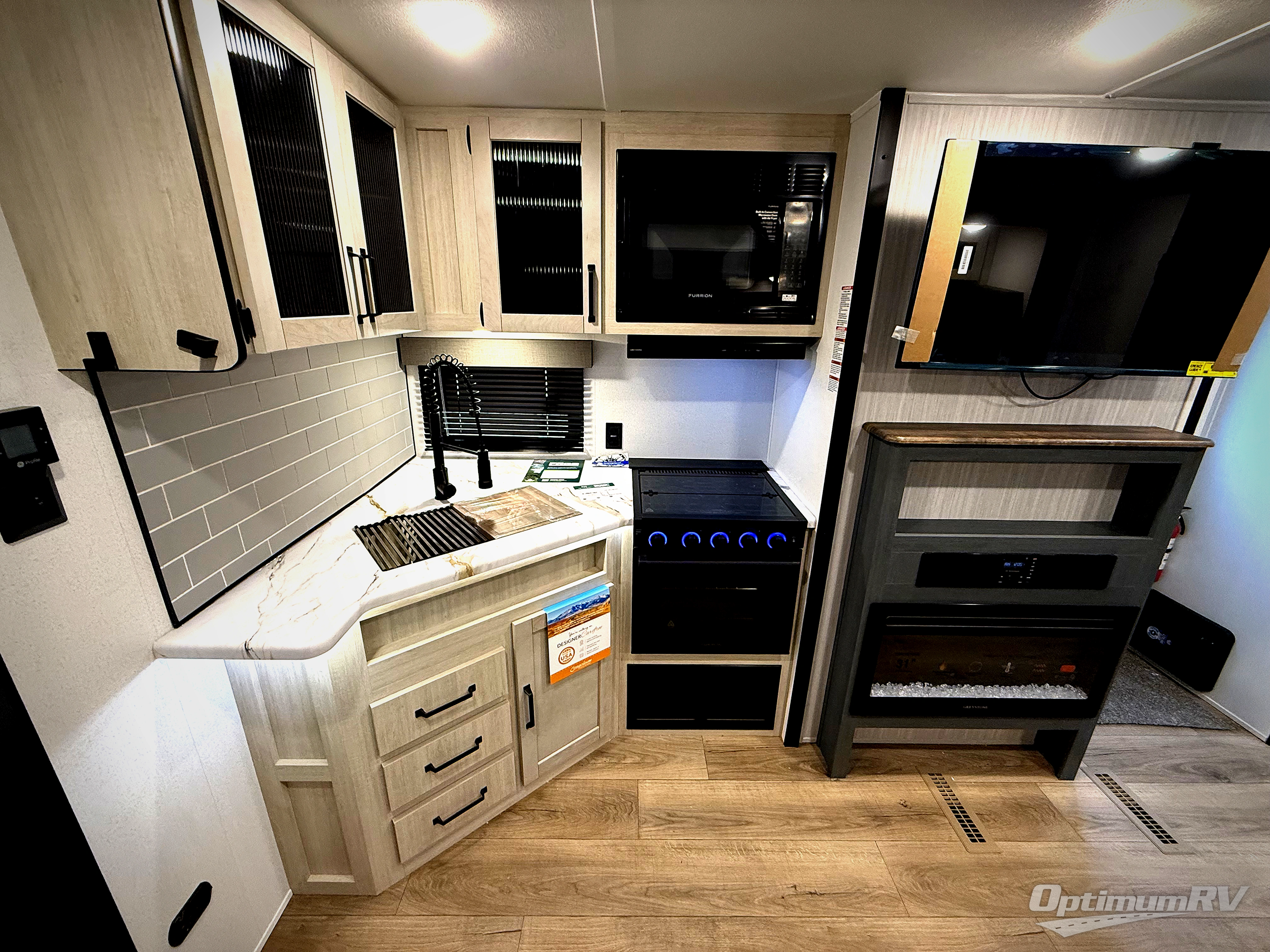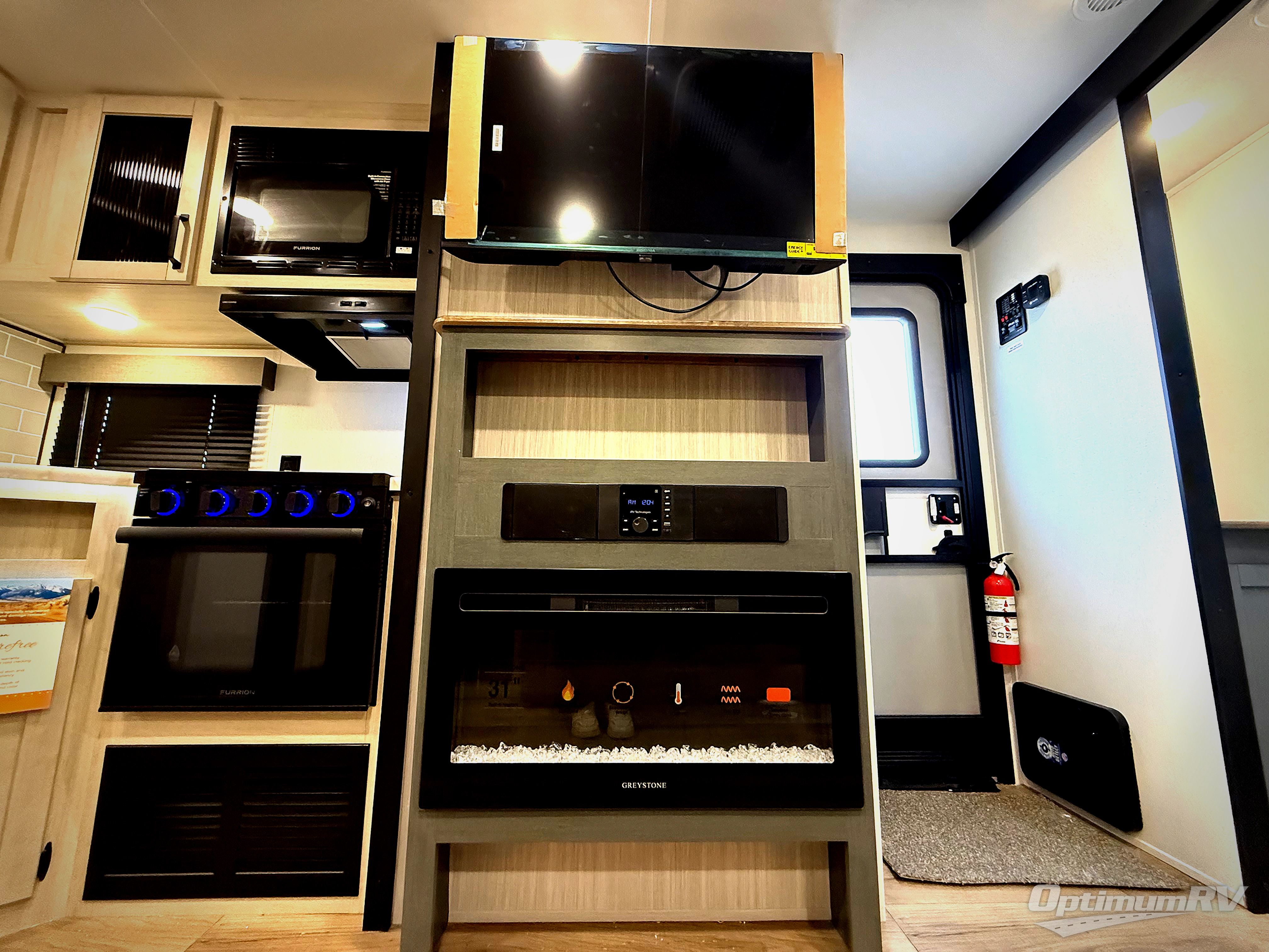 This travel trailer is inviting and spacious thanks to the large slide out, which houses the sofa, 12V refrigerator and second pantry! There is a fireplace across from the sofa for added comfort, and the full rear bath will be easy to get to. A full kitchen inside includes a stainless steel oven and range plus a stainless steel microwave to cook meals, and you can choose to add the optional micro kitchen with a griddle if you enjoy cooking outdoors! When you're ready to call it a night, the queen bed in the front private bedroom will be calling your name!