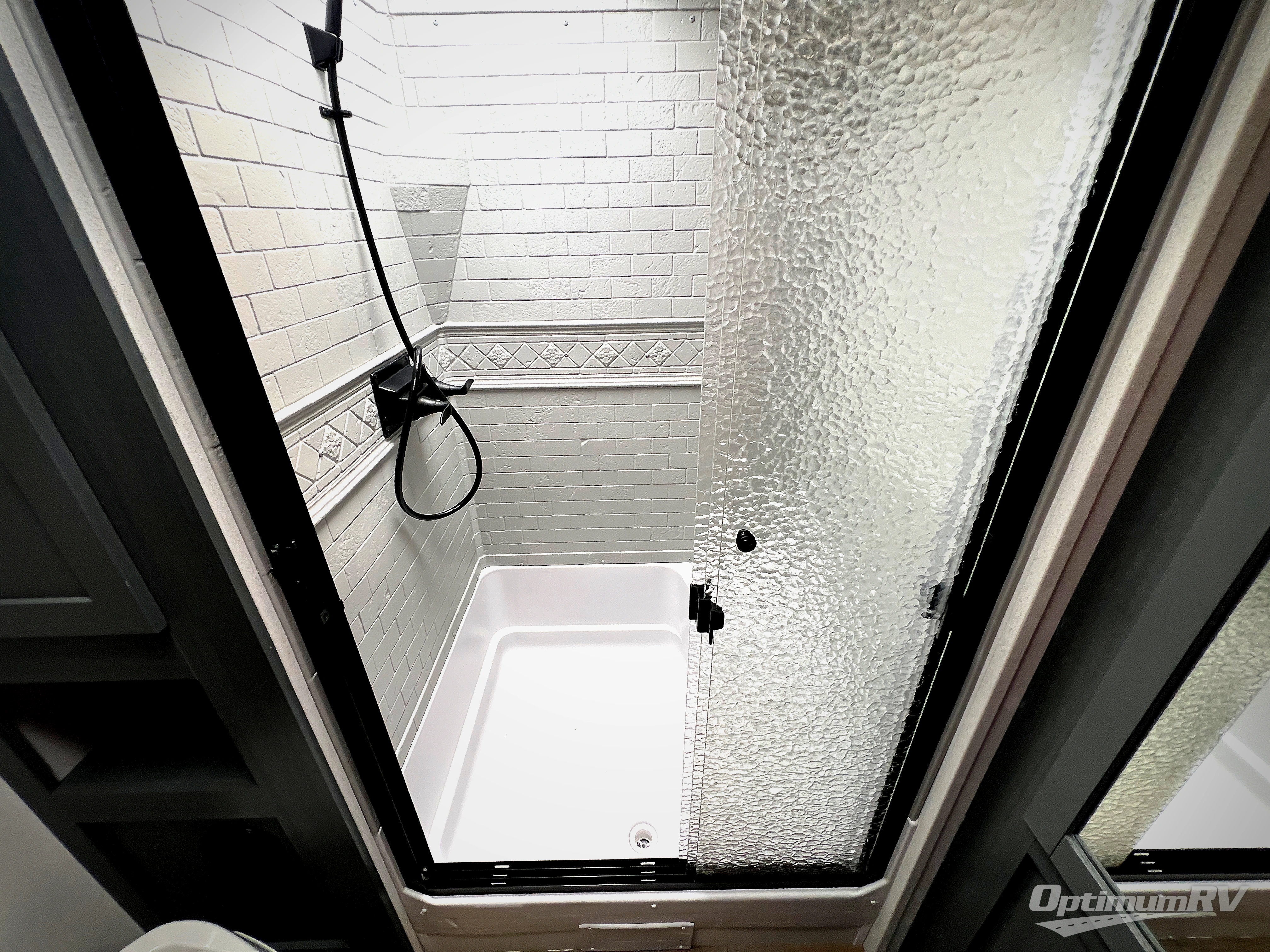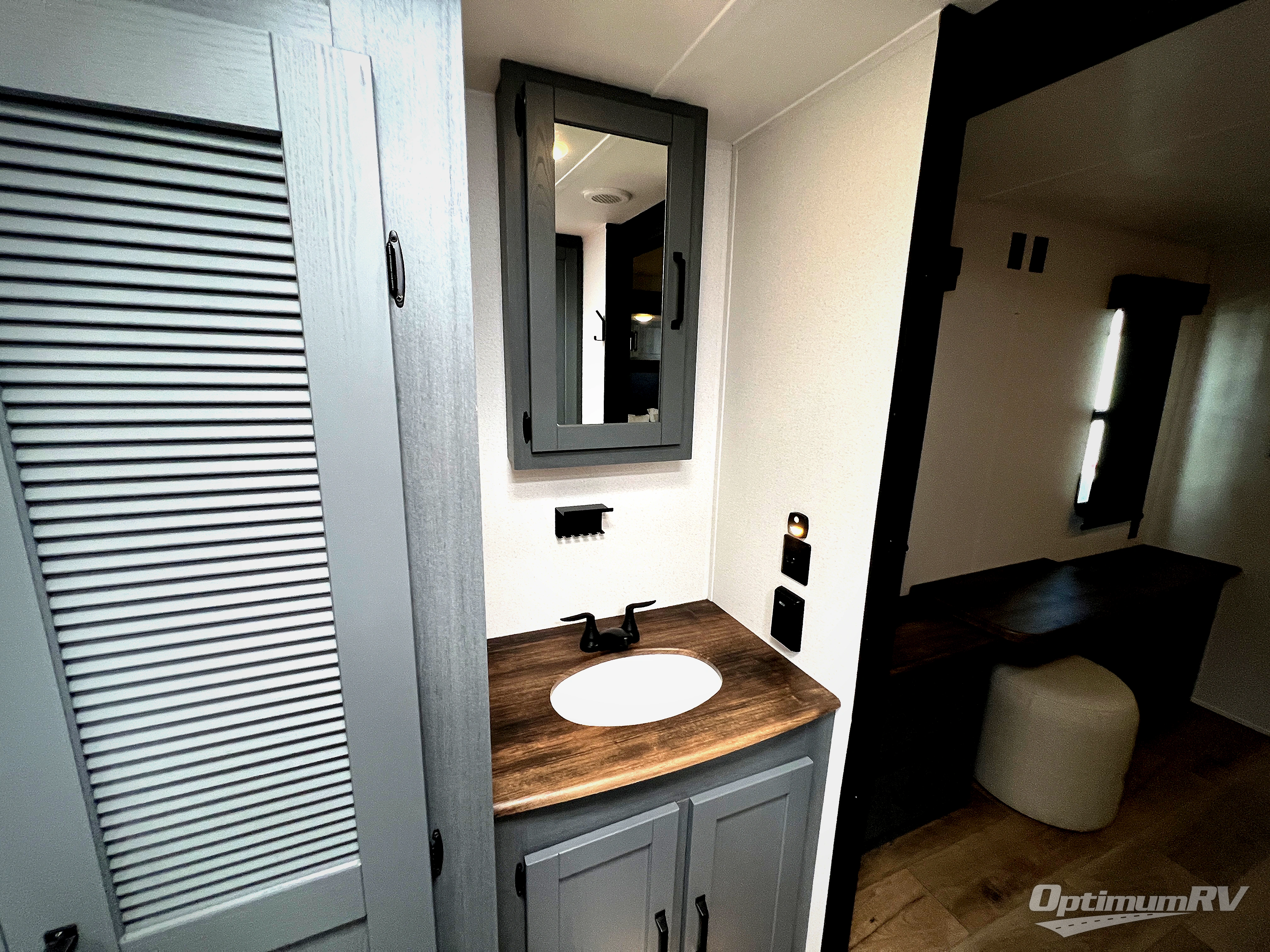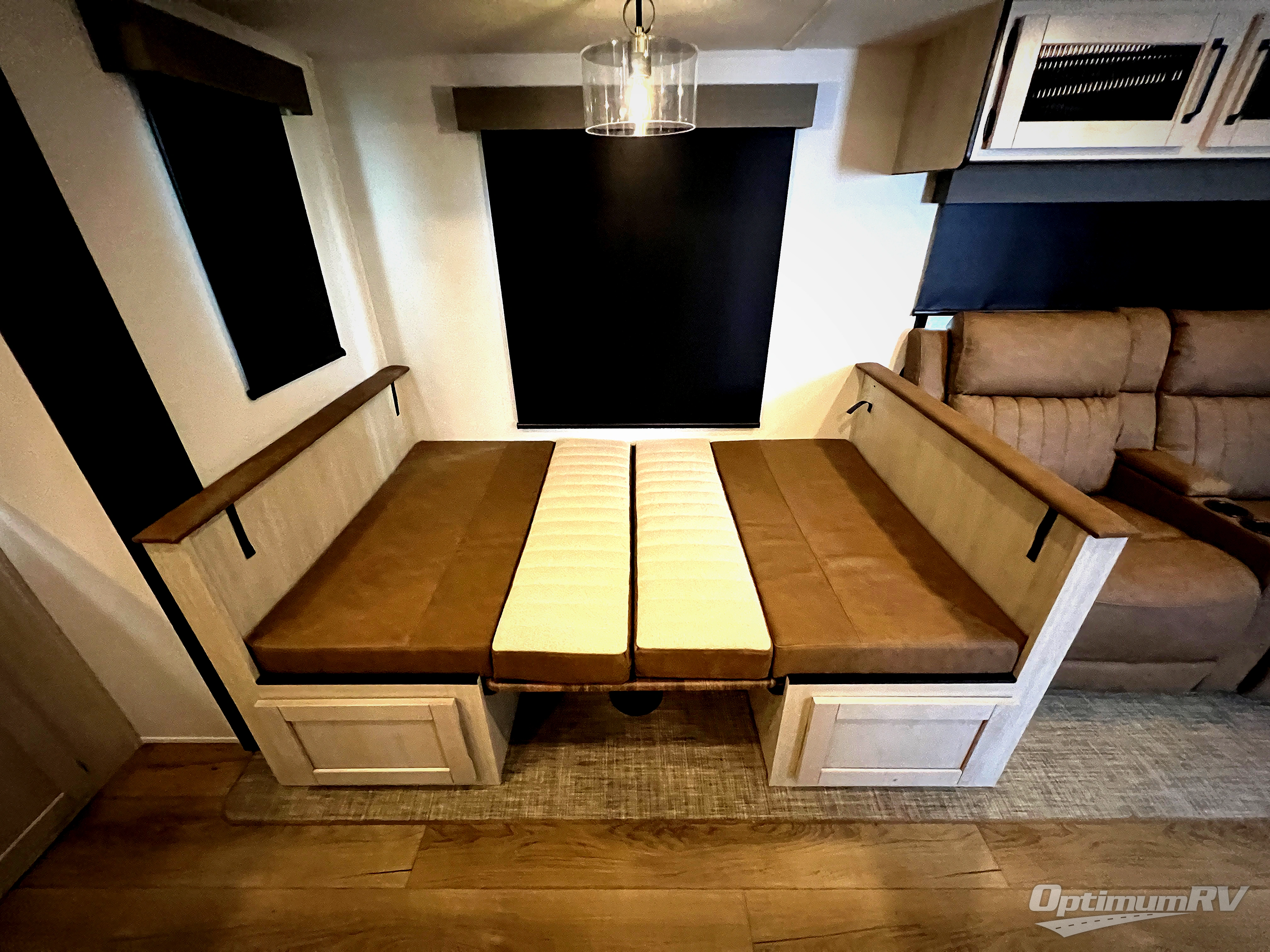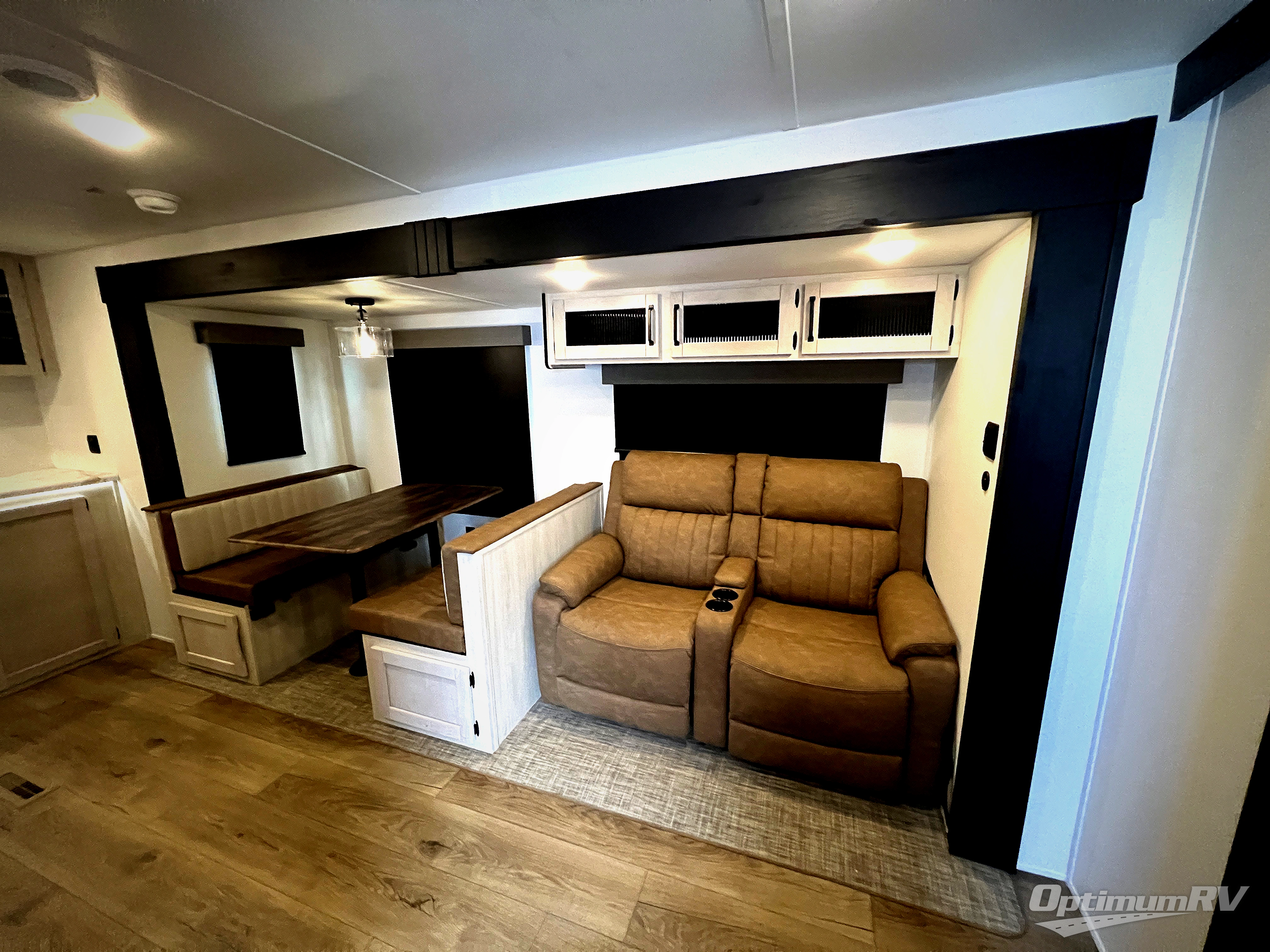 You'll love camping in this double slide out travel trailer with a rear kitchen and a spacious front bath! There is a 40" shower here, along with a linen closet, shirt closet, plus a closet with washer/dryer prep. The master bedroom includes a king bed slide out, dual bedroom dressers, a desk and a TV hookup if you want the option to watch movies in bed. The combined kitchen and living area is made open by the large slide out, which houses the sofa and booth dinette. These pieces of furniture area conveniently across from the entertainment center and fireplace to make it feel more like home. The chef of your group will appreciate generous counter space in the rear kitchen, and if they like to cook outdoors, and optional mini kitchen with a griddle can be added!