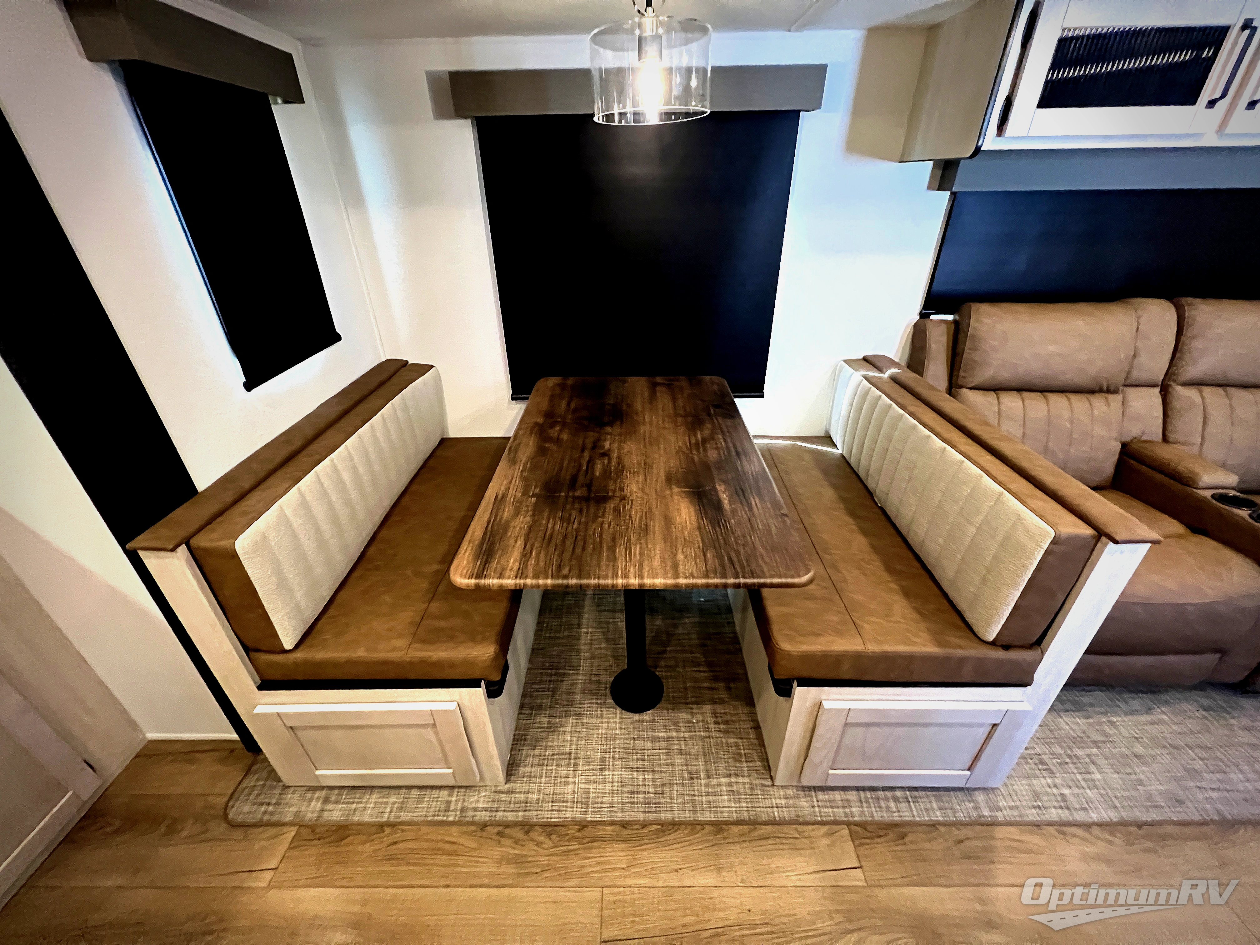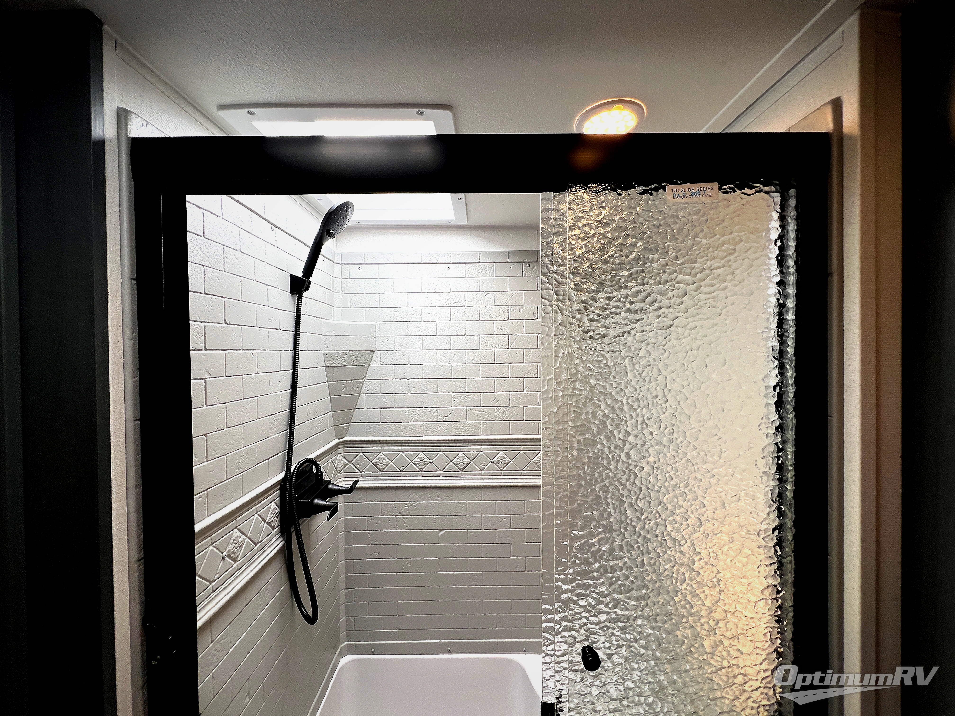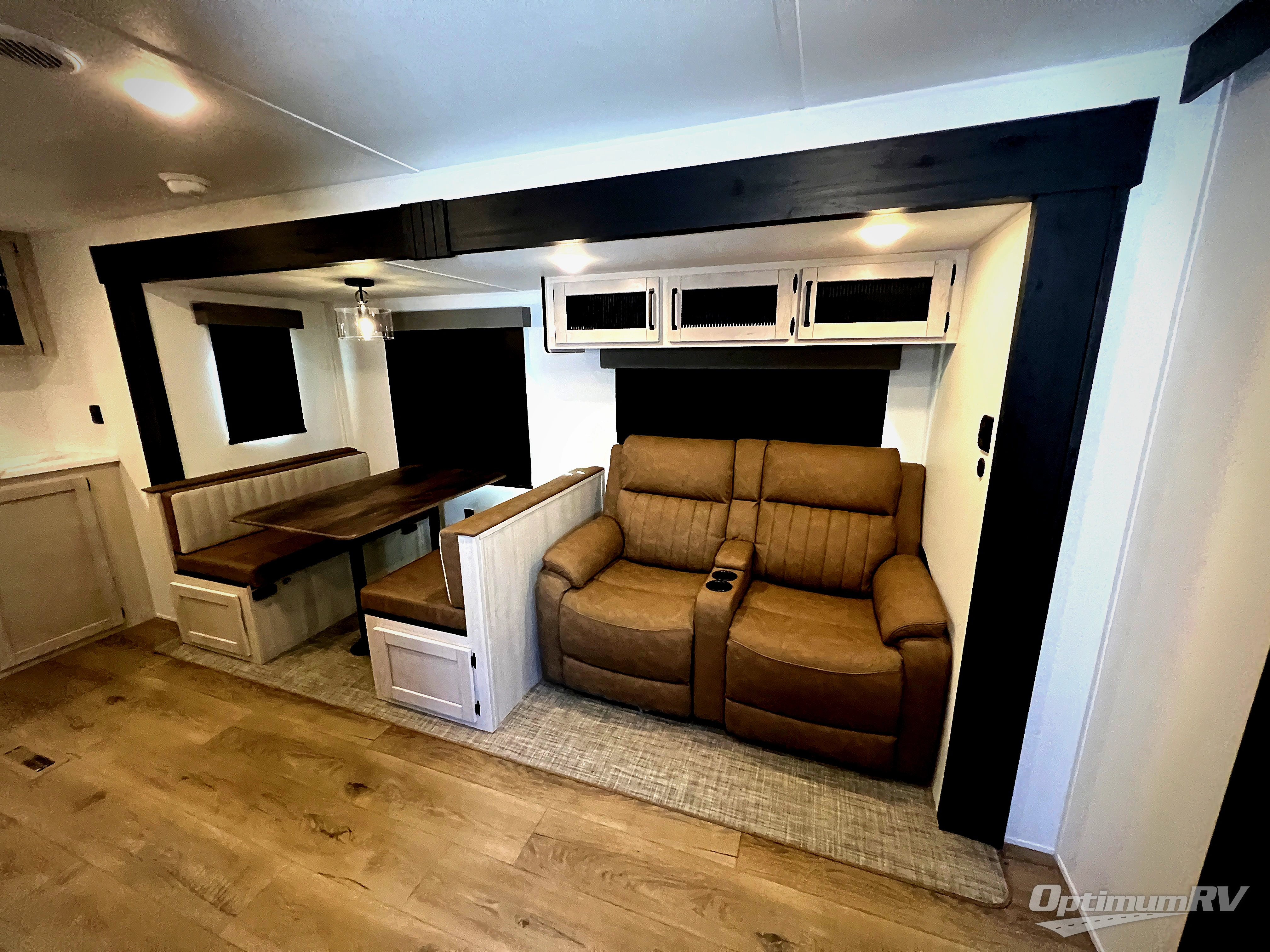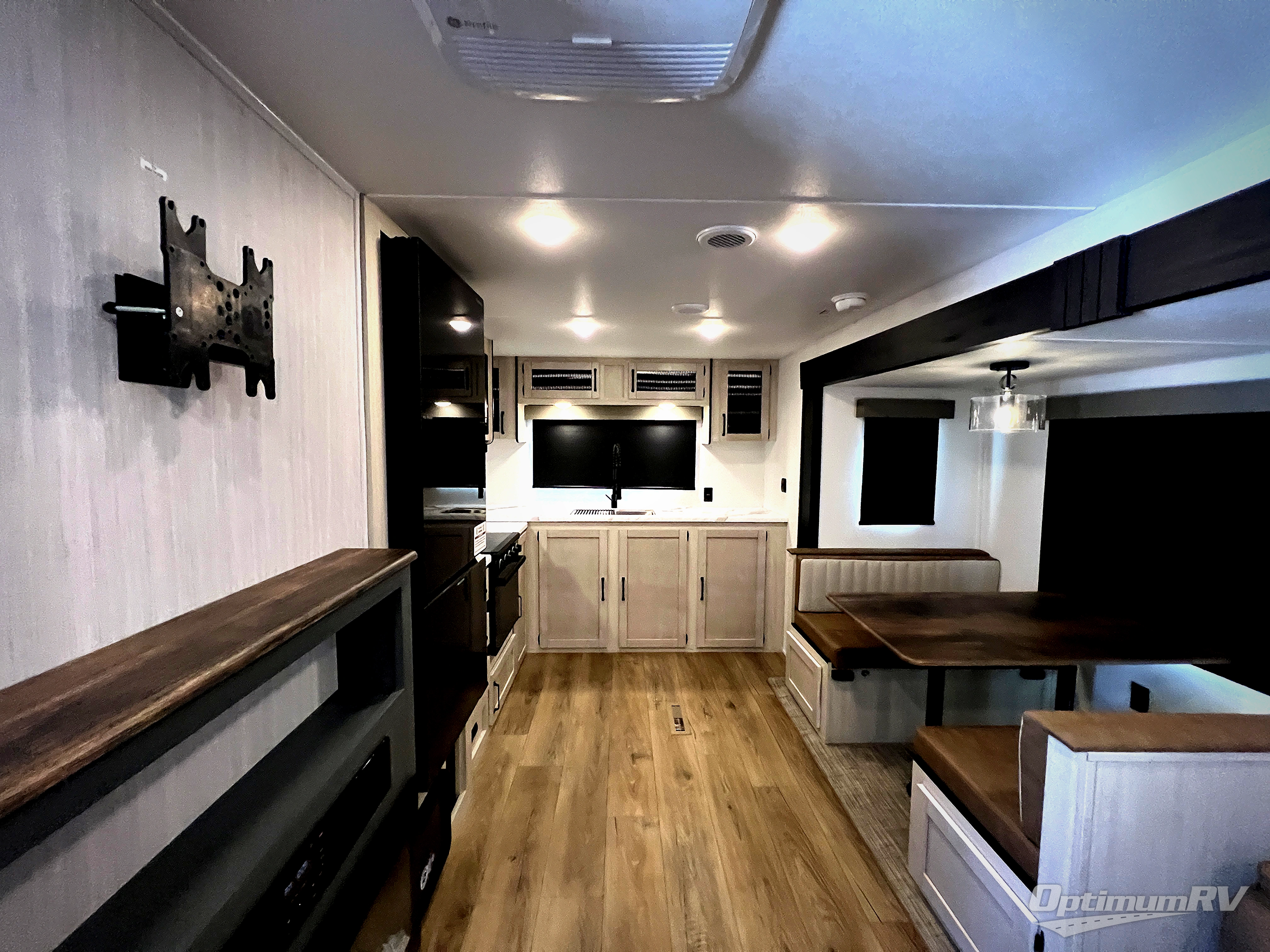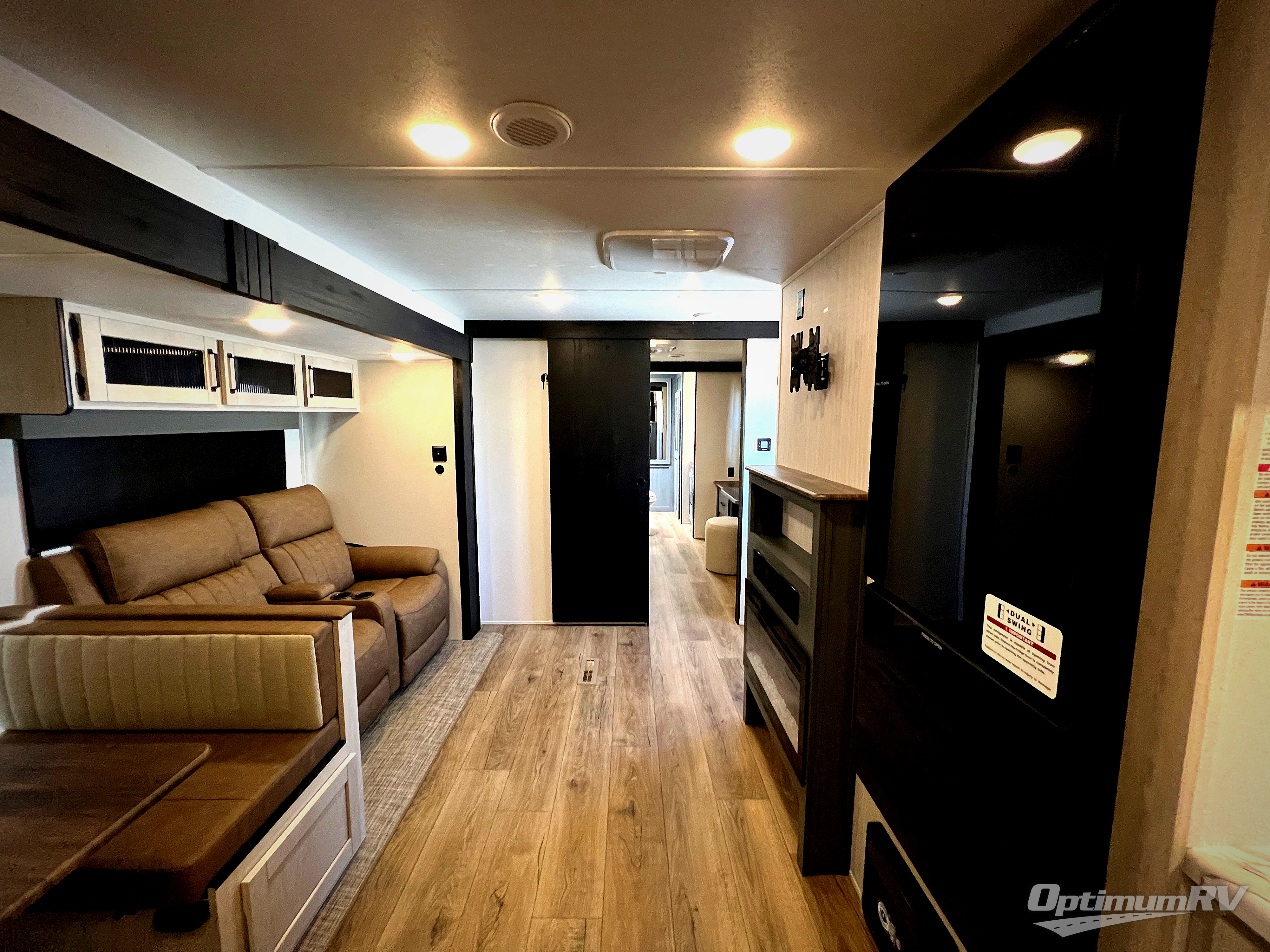 You'll love camping in this double slide out travel trailer with a rear kitchen and a spacious front bath! There is a 40" shower here, along with a linen closet, shirt closet, plus a closet with washer/dryer prep. The master bedroom includes a king bed slide out, dual bedroom dressers, a desk and a TV hookup if you want the option to watch movies in bed. The combined kitchen and living area is made open by the large slide out, which houses the sofa and booth dinette. These pieces of furniture area conveniently across from the entertainment center and fireplace to make it feel more like home. The chef of your group will appreciate generous counter space in the rear kitchen, and if they like to cook outdoors, and optional mini kitchen with a griddle can be added!