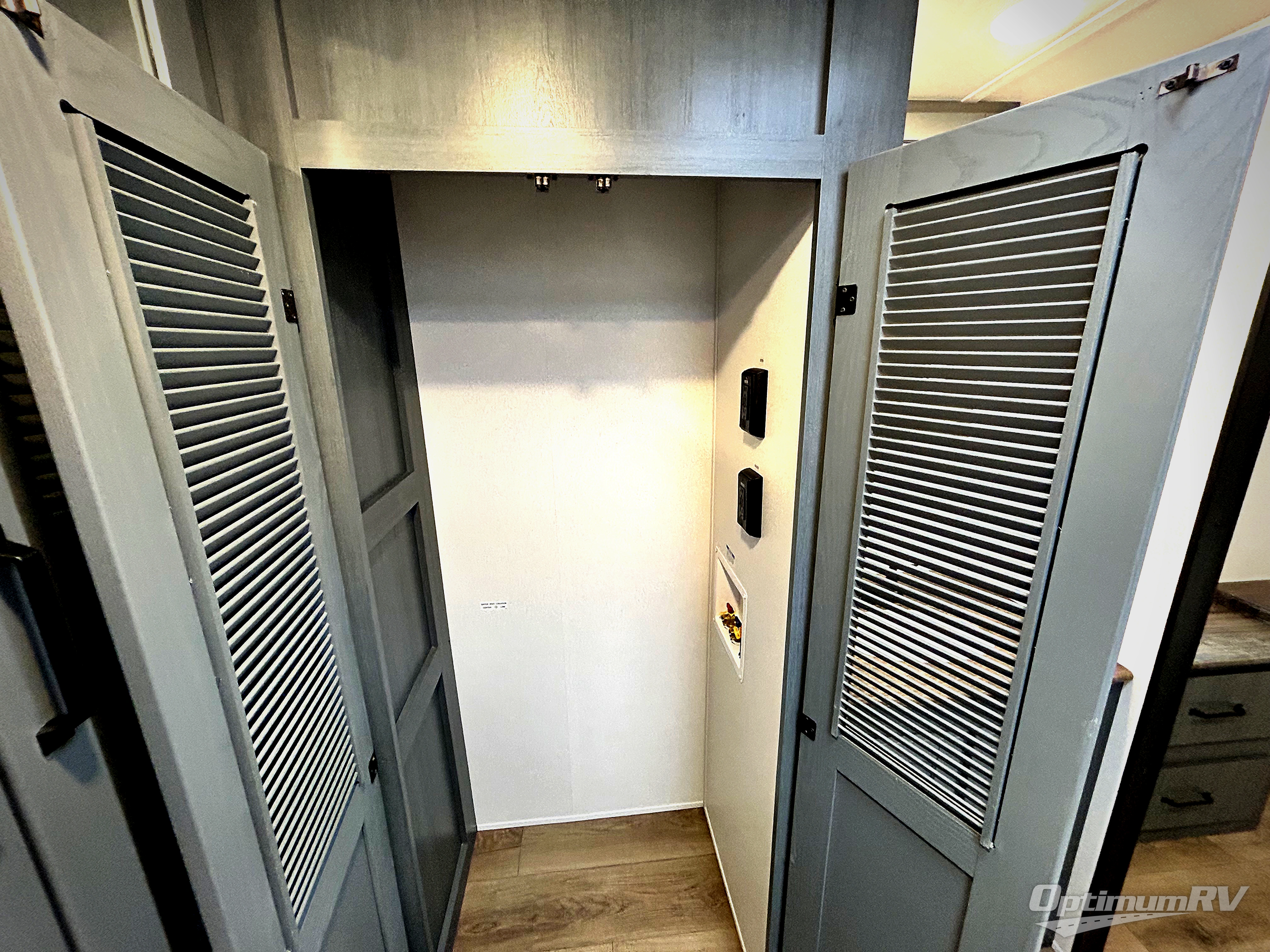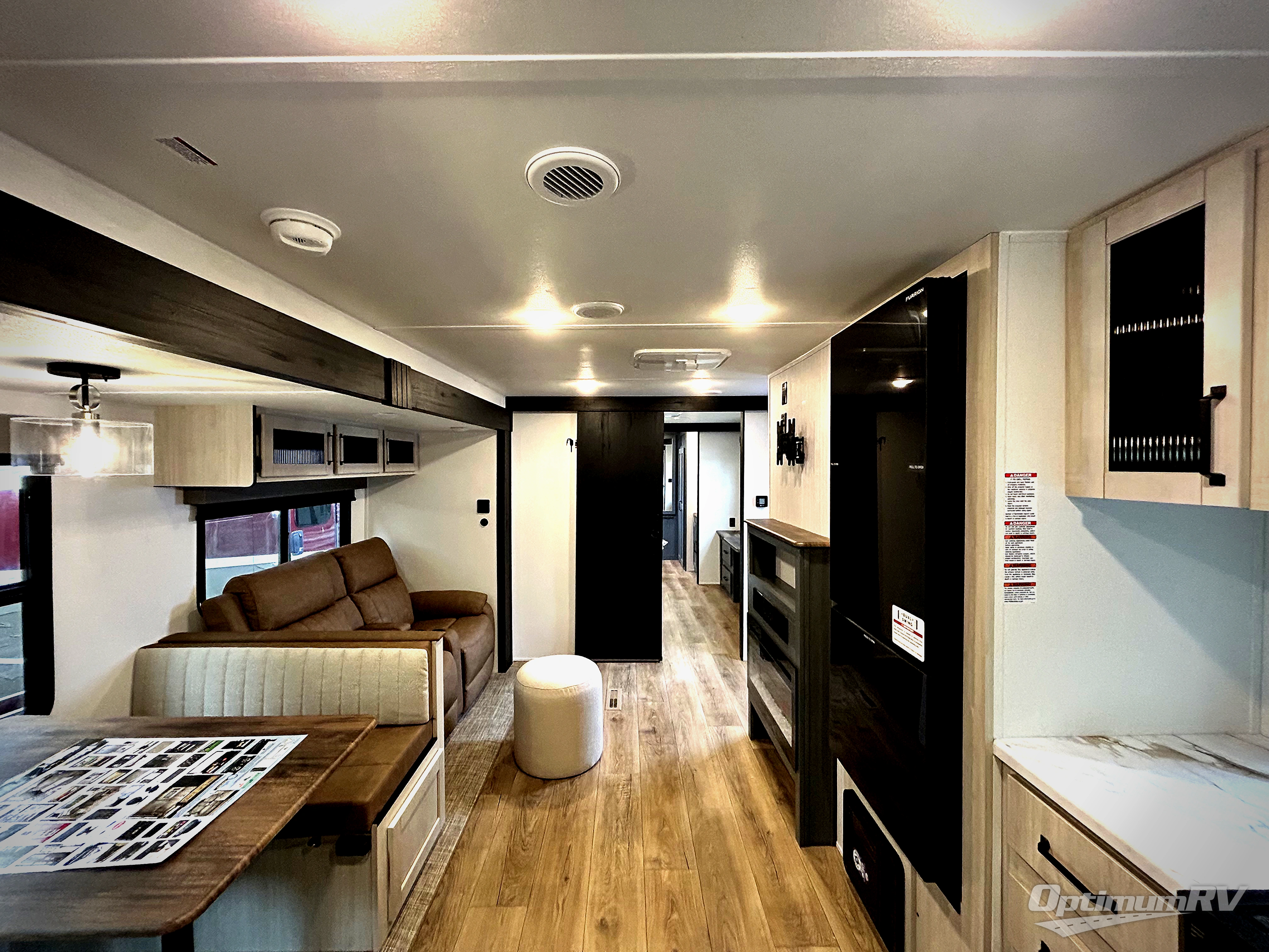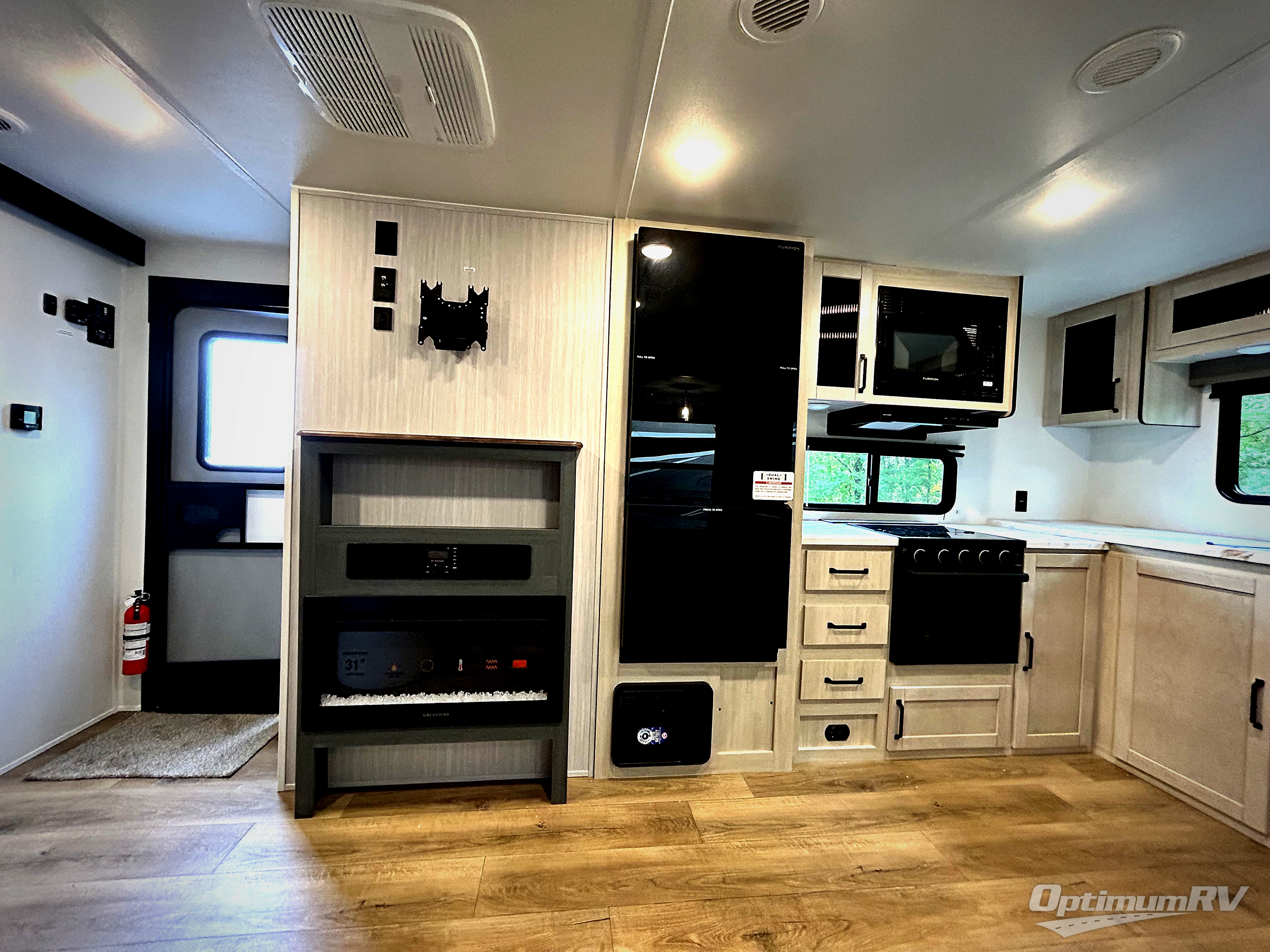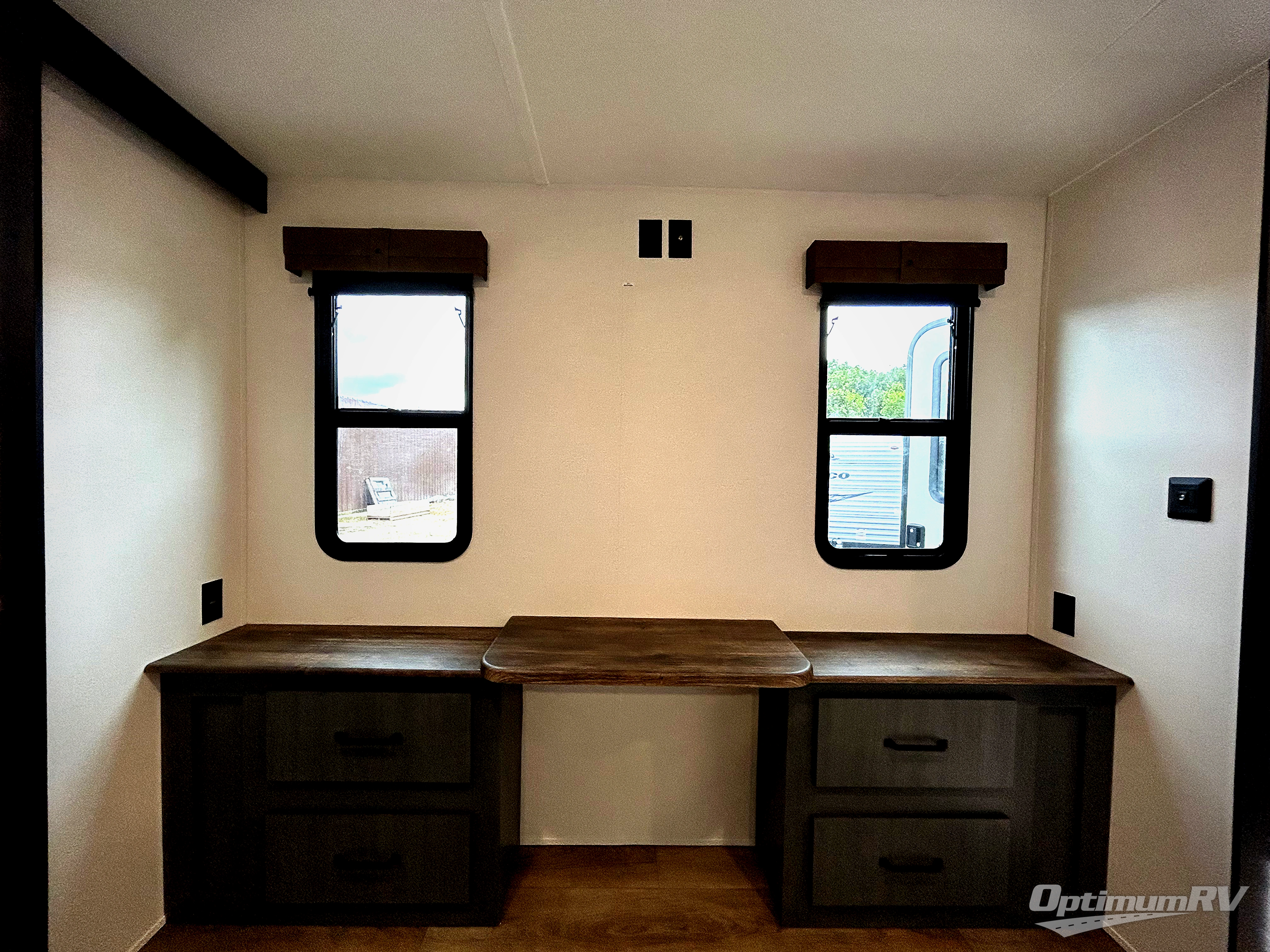 You'll love camping in this double slide out travel trailer with a rear kitchen and a spacious front bath! There is a 40" shower here, along with a linen closet, shirt closet, plus a closet with washer/dryer prep. The master bedroom includes a king bed slide out, dual bedroom dressers, a desk and a TV hookup if you want the option to watch movies in bed. The combined kitchen and living area is made open by the large slide out, which houses the sofa and booth dinette. These pieces of furniture area conveniently across from the entertainment center and fireplace to make it feel more like home. The chef of your group will appreciate generous counter space in the rear kitchen, and if they like to cook outdoors, and optional mini kitchen with a griddle can be added!