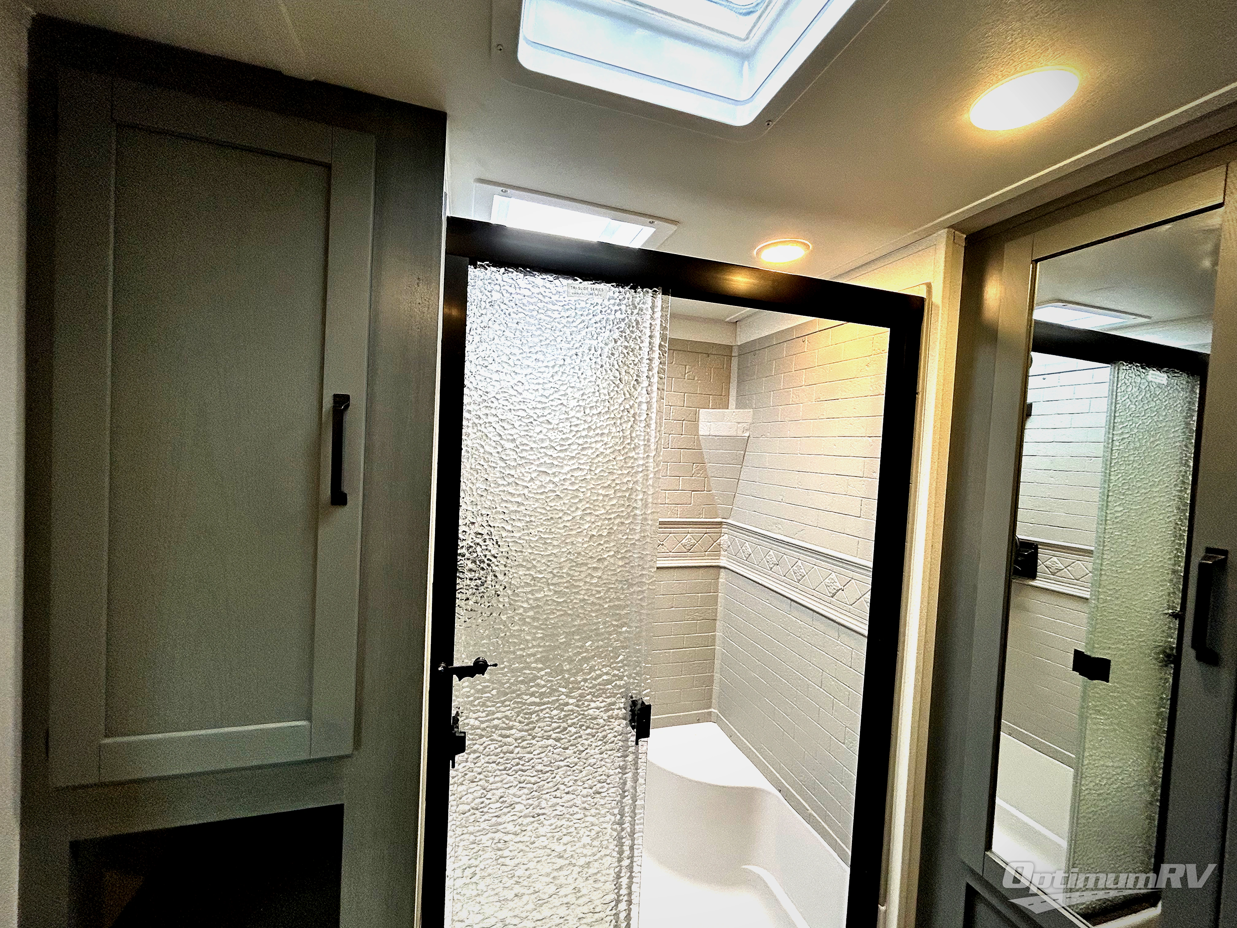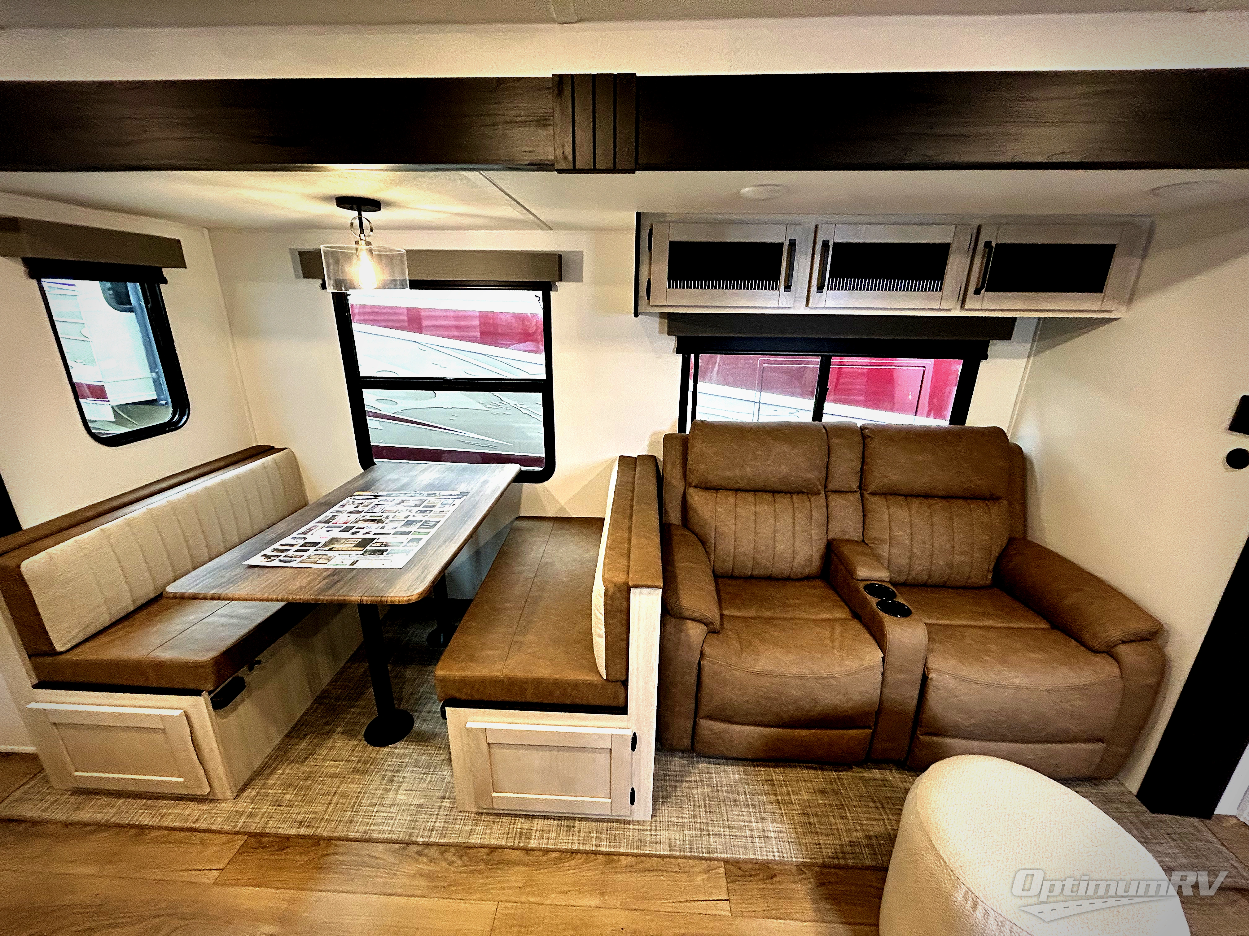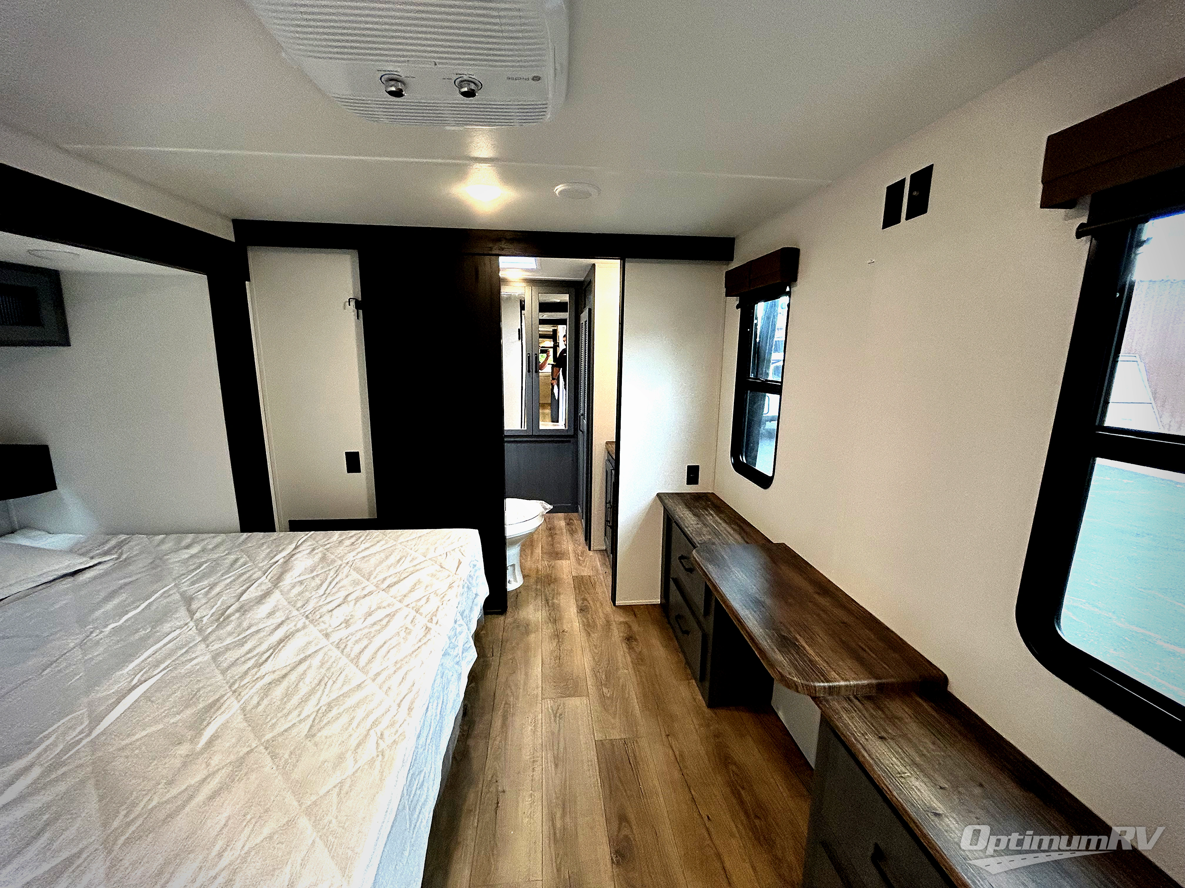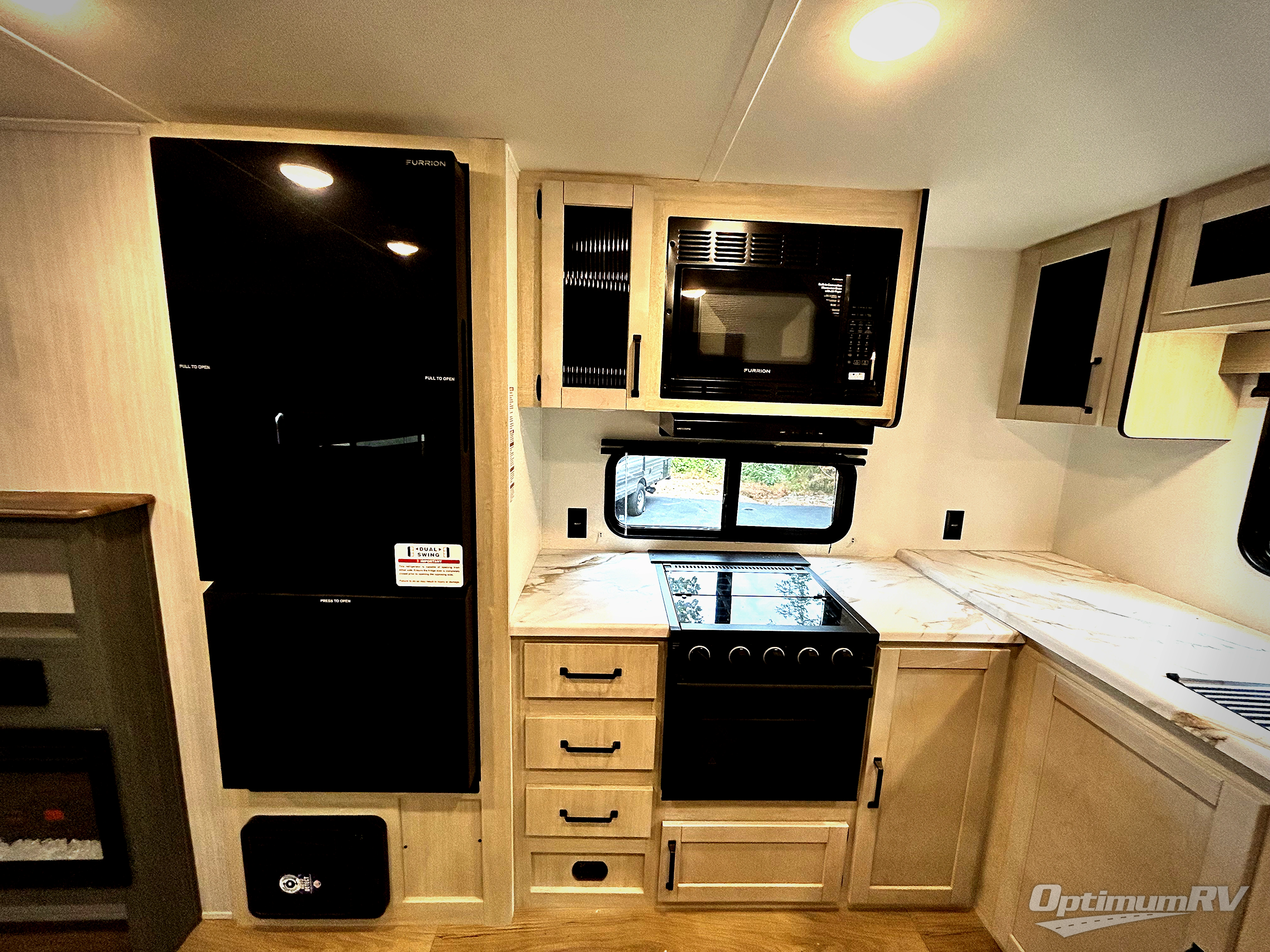 You'll love camping in this double slide out travel trailer with a rear kitchen and a spacious front bath! There is a 40" shower here, along with a linen closet, shirt closet, plus a closet with washer/dryer prep. The master bedroom includes a king bed slide out, dual bedroom dressers, a desk and a TV hookup if you want the option to watch movies in bed. The combined kitchen and living area is made open by the large slide out, which houses the sofa and booth dinette. These pieces of furniture area conveniently across from the entertainment center and fireplace to make it feel more like home. The chef of your group will appreciate generous counter space in the rear kitchen, and if they like to cook outdoors, and optional mini kitchen with a griddle can be added!
