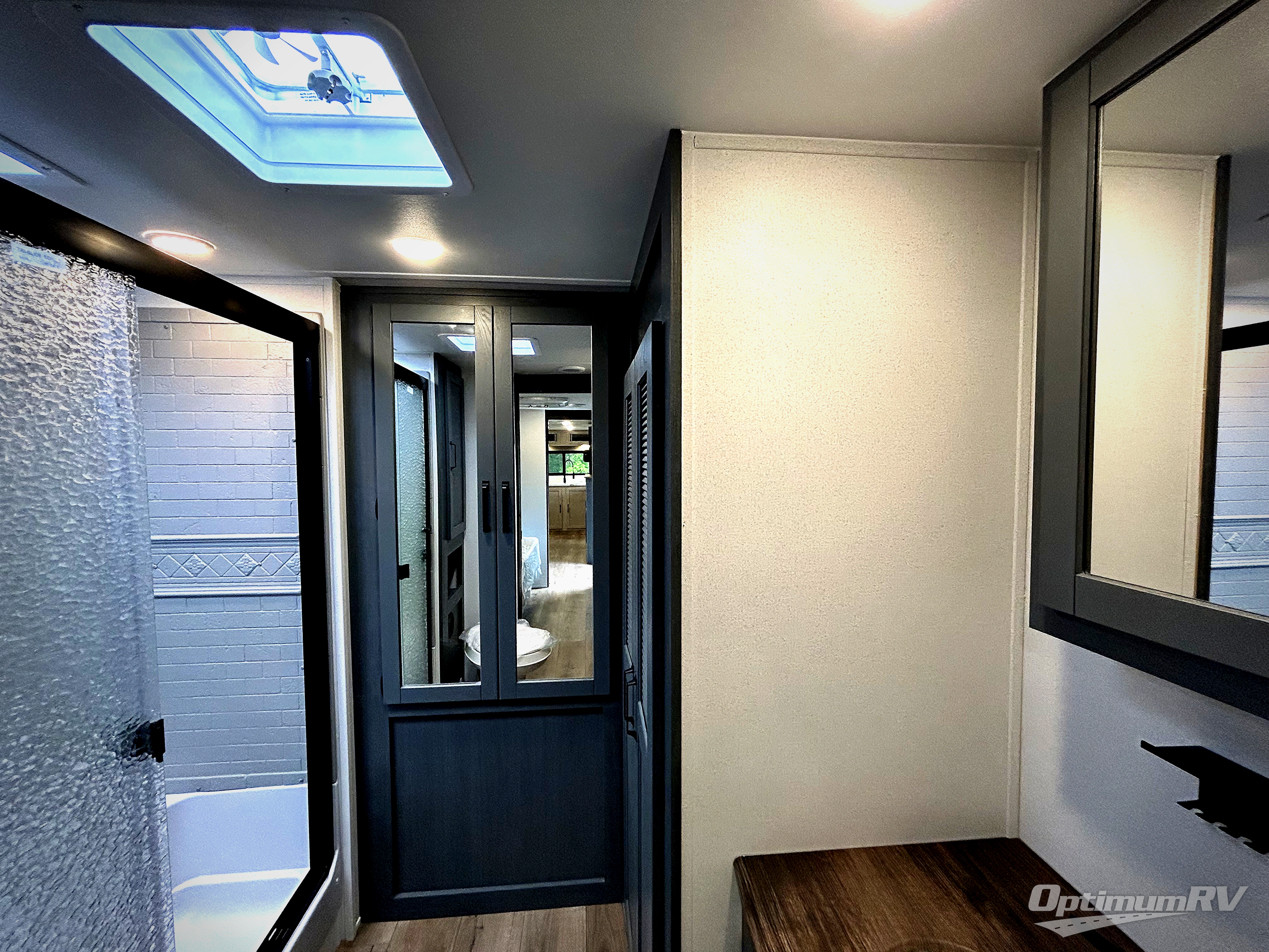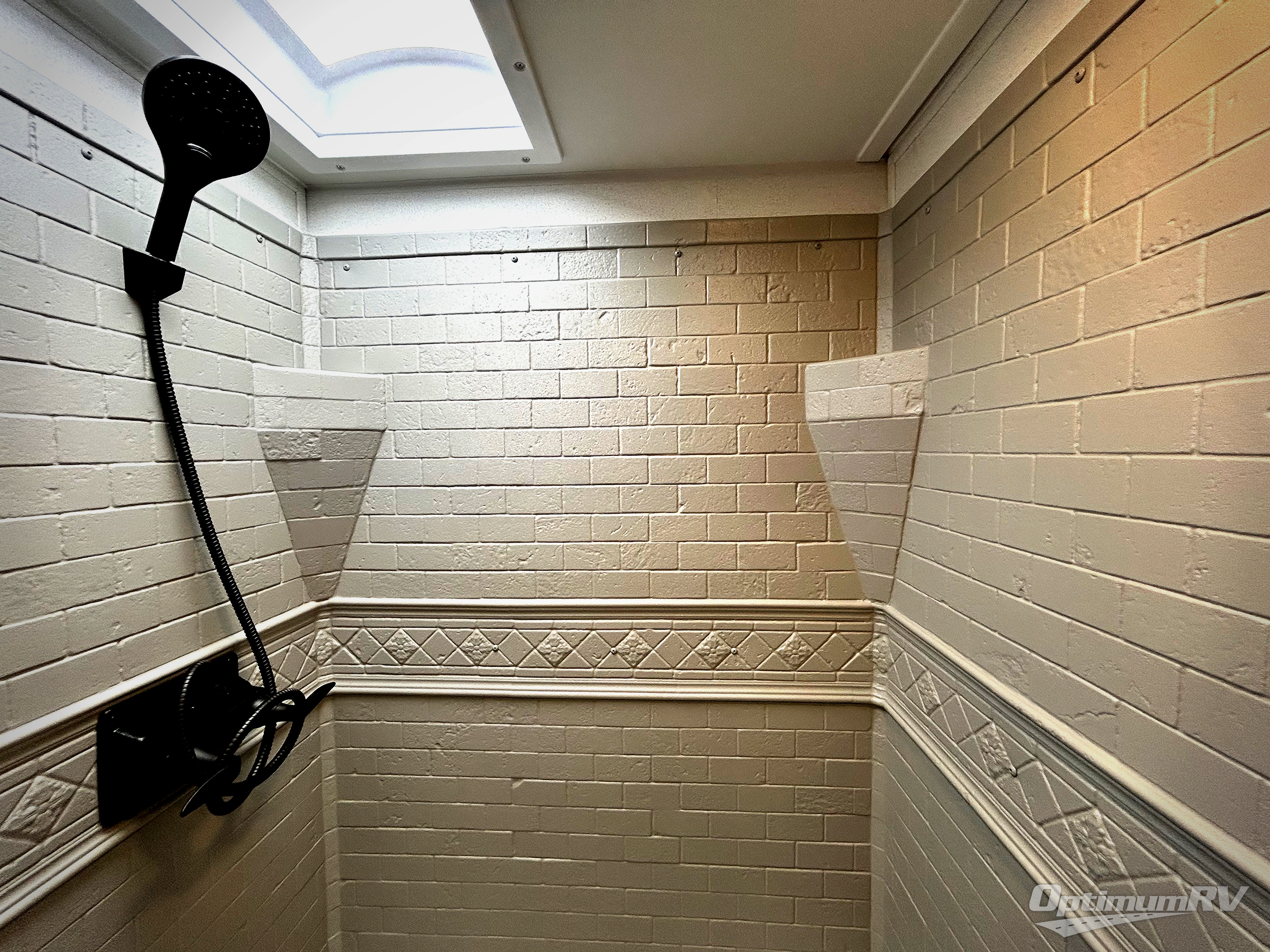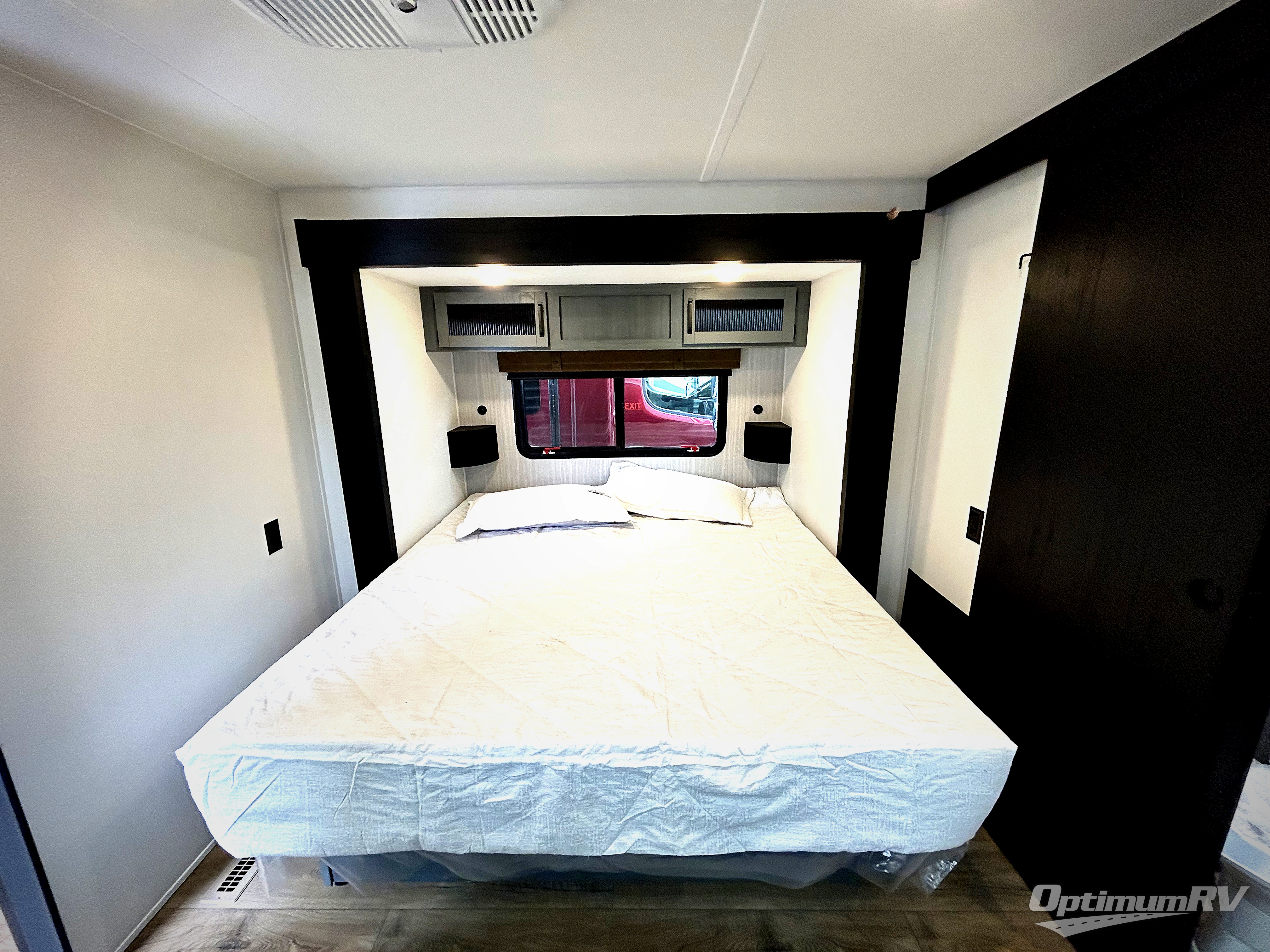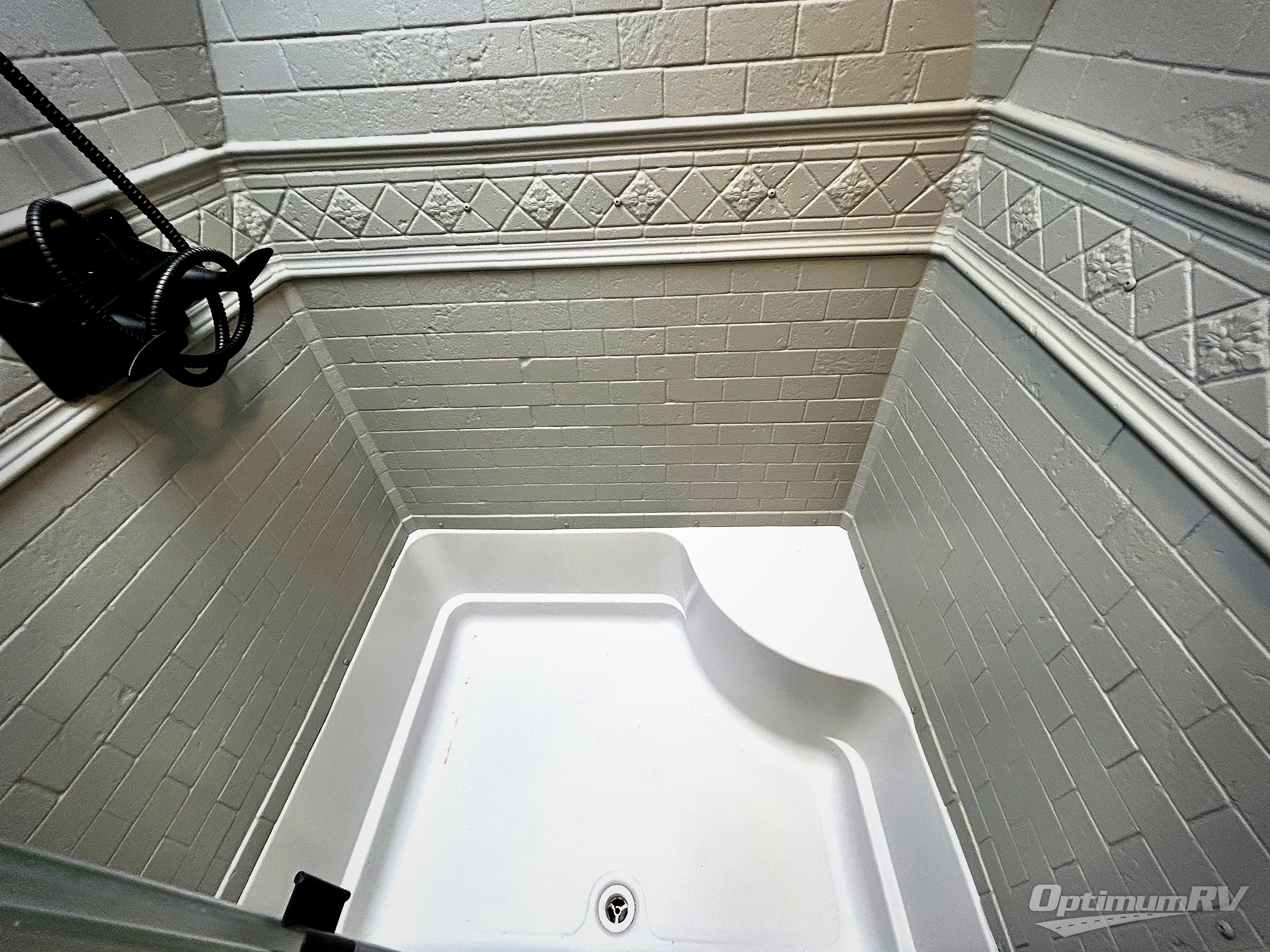 You'll love camping in this double slide out travel trailer with a rear kitchen and a spacious front bath! There is a 40" shower here, along with a linen closet, shirt closet, plus a closet with washer/dryer prep. The master bedroom includes a king bed slide out, dual bedroom dressers, a desk and a TV hookup if you want the option to watch movies in bed. The combined kitchen and living area is made open by the large slide out, which houses the sofa and booth dinette. These pieces of furniture area conveniently across from the entertainment center and fireplace to make it feel more like home. The chef of your group will appreciate generous counter space in the rear kitchen, and if they like to cook outdoors, and optional mini kitchen with a griddle can be added!