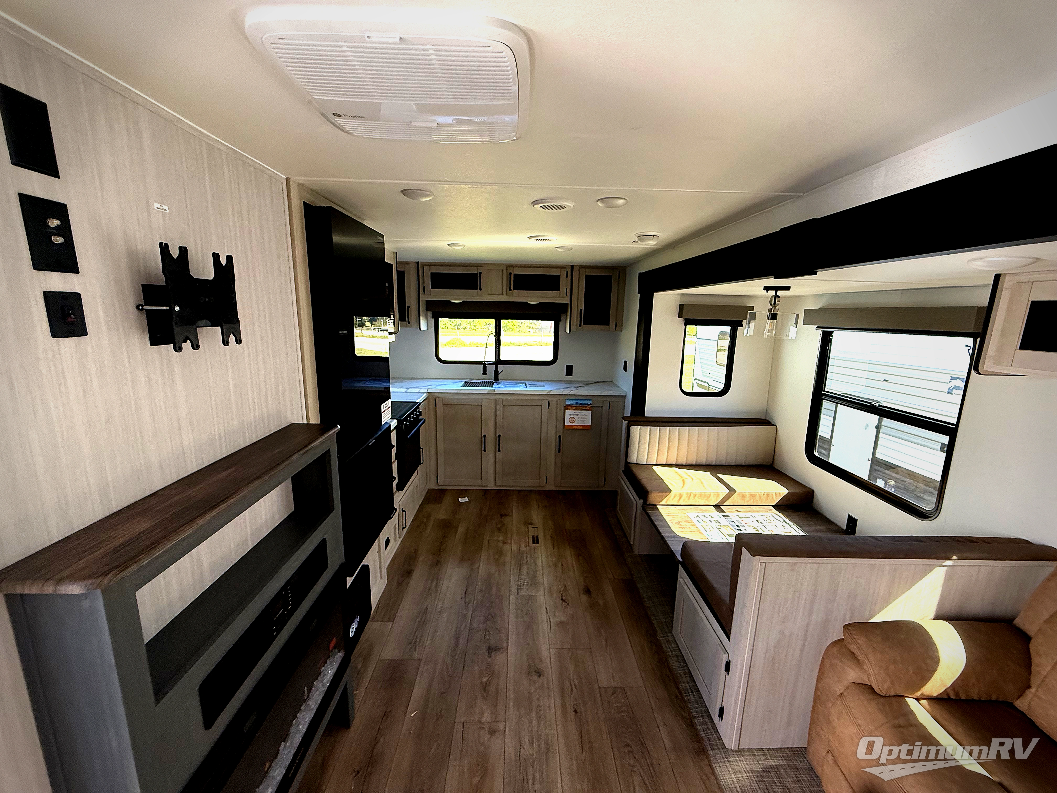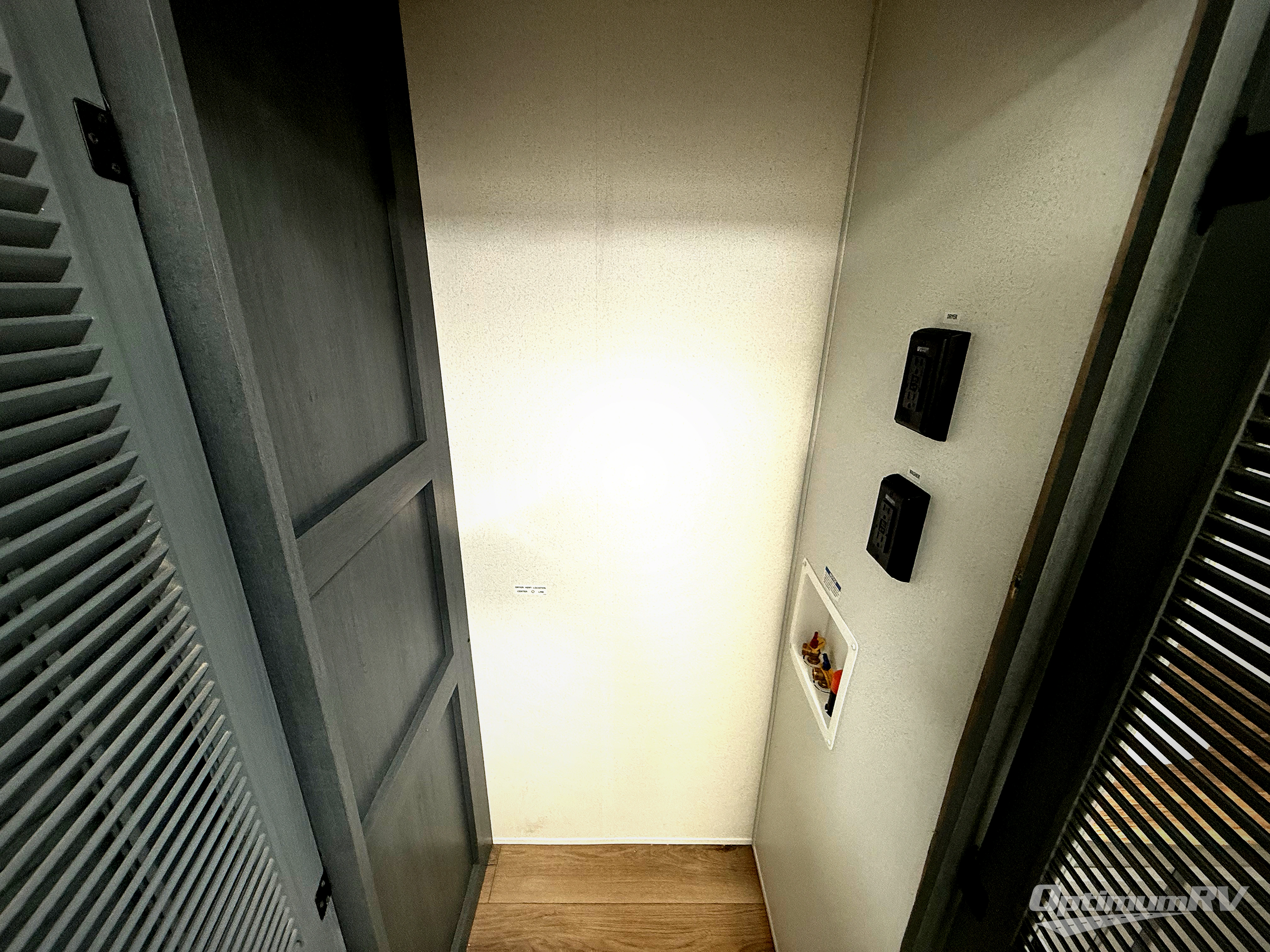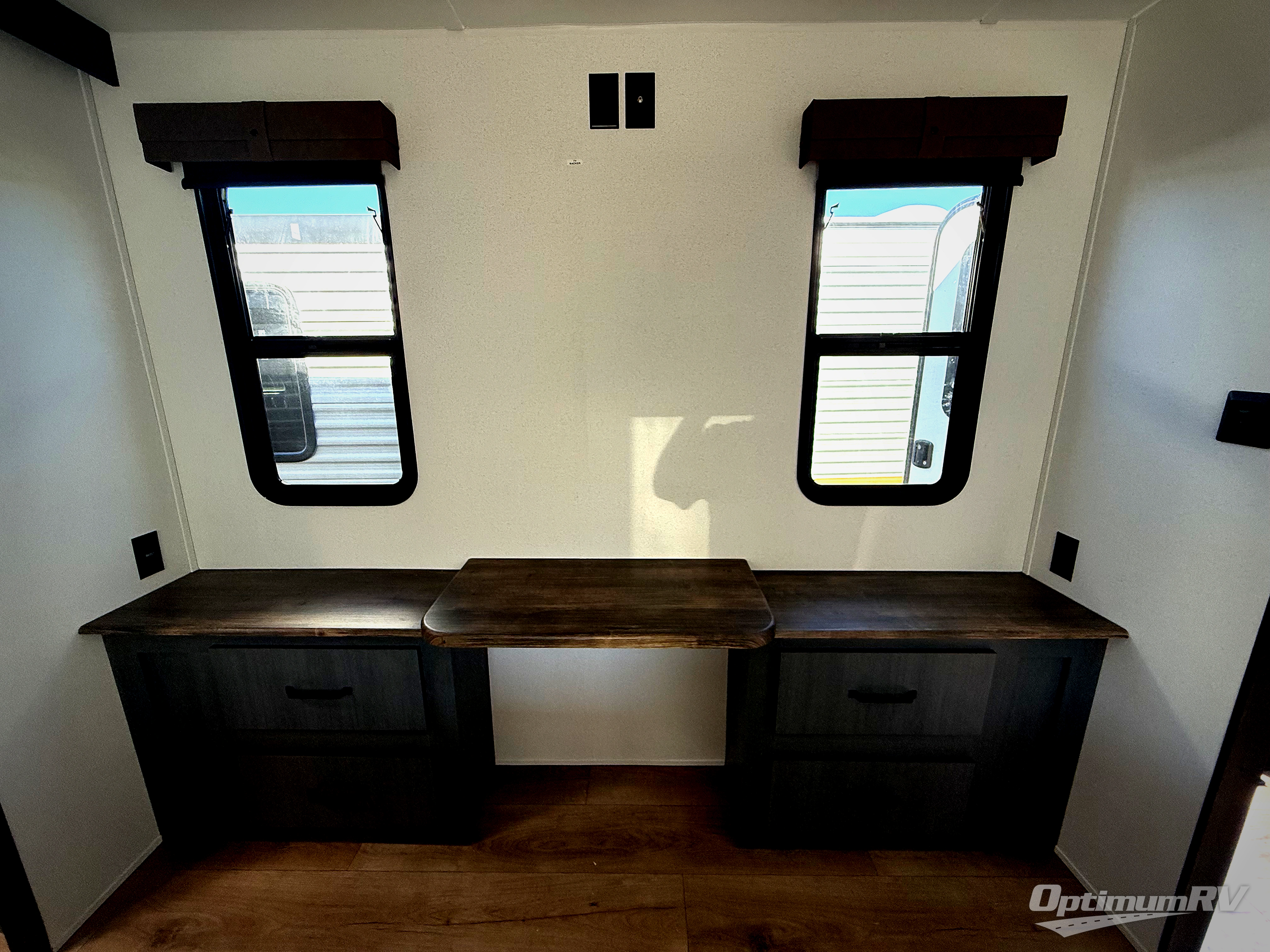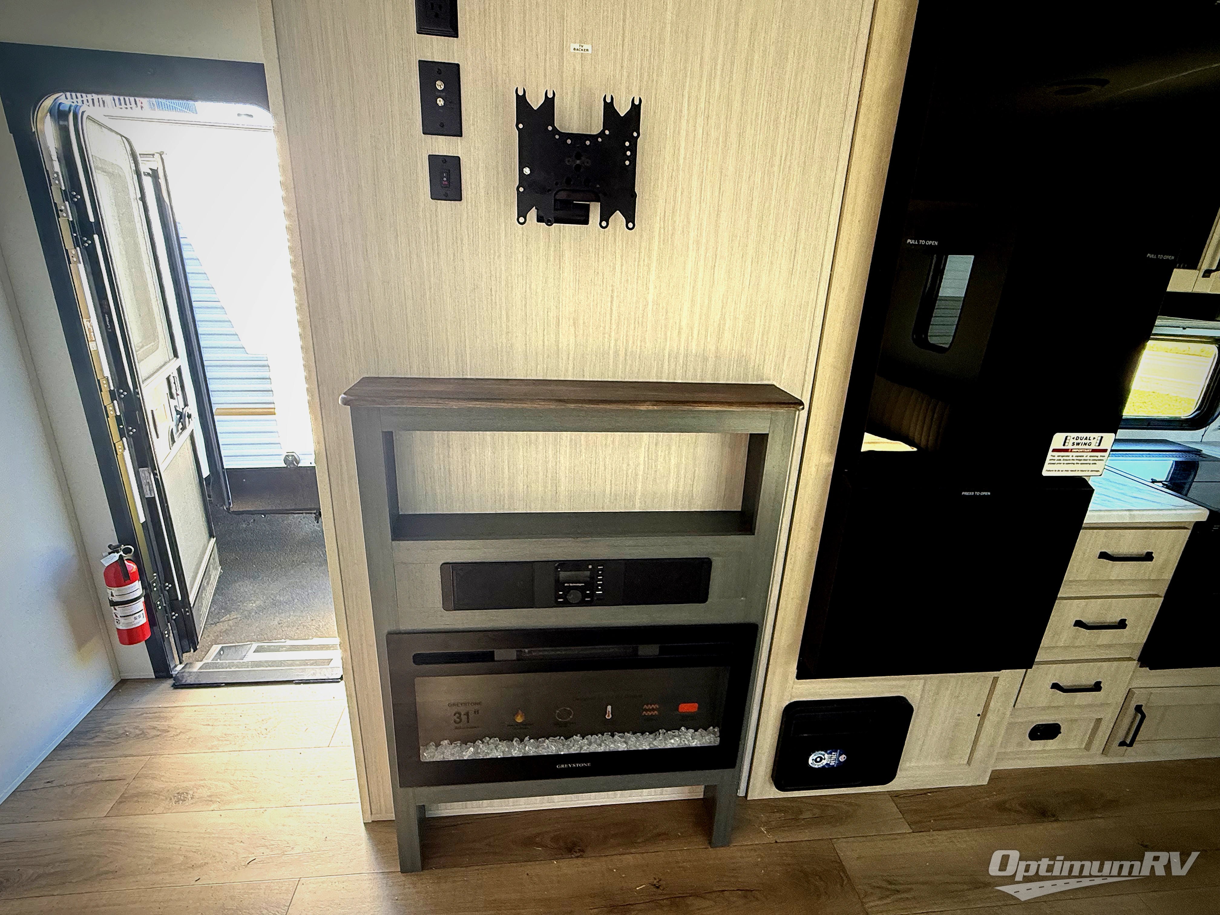 You'll love camping in this double slide out travel trailer with a rear kitchen and a spacious front bath! There is a 40" shower here, along with a linen closet, shirt closet, plus a closet with washer/dryer prep. The master bedroom includes a king bed slide out, dual bedroom dressers, a desk and a TV hookup if you want the option to watch movies in bed. The combined kitchen and living area is made open by the large slide out, which houses the sofa and booth dinette. These pieces of furniture area conveniently across from the entertainment center and fireplace to make it feel more like home. The chef of your group will appreciate generous counter space in the rear kitchen, and if they like to cook outdoors, and optional mini kitchen with a griddle can be added!