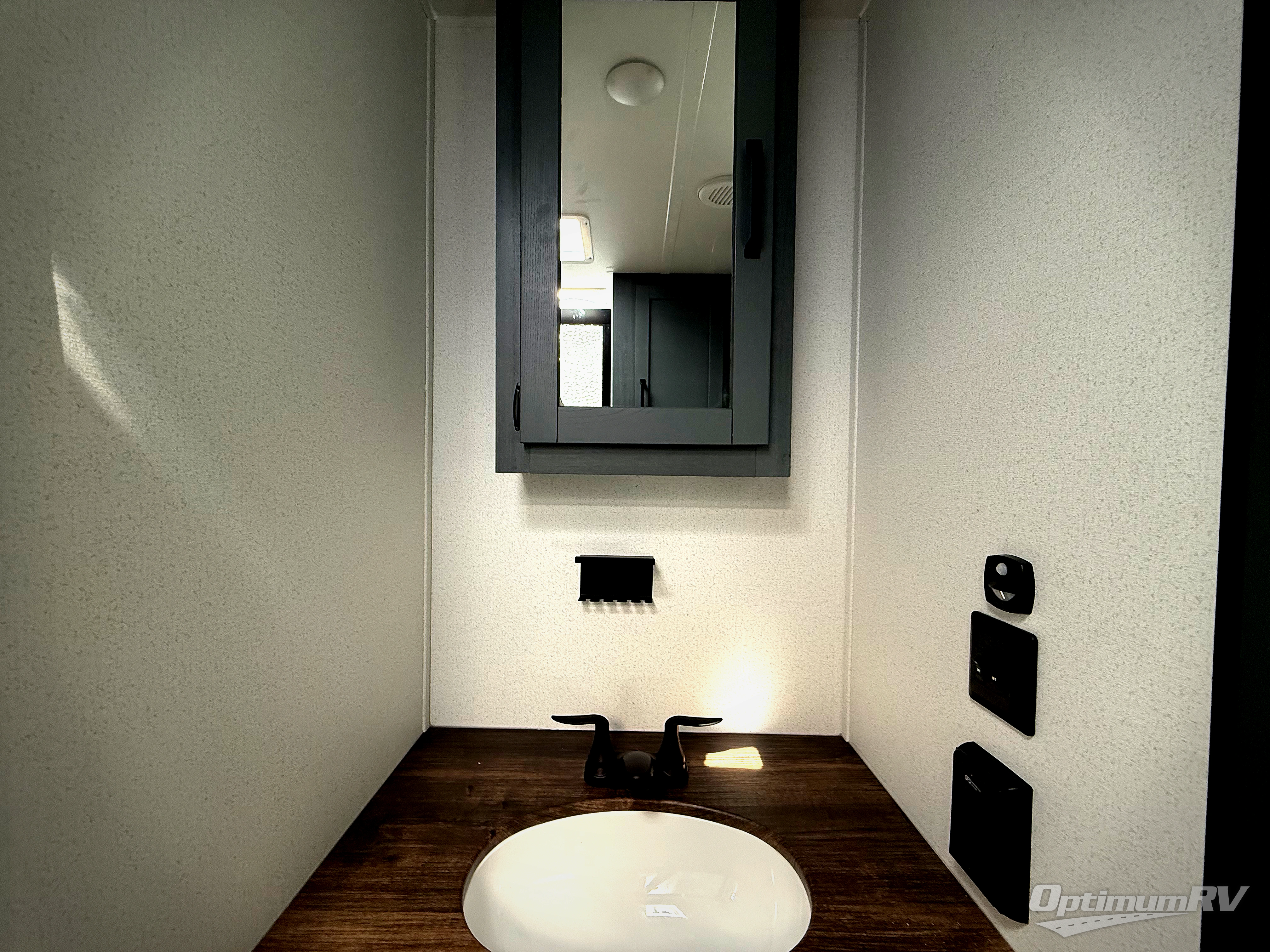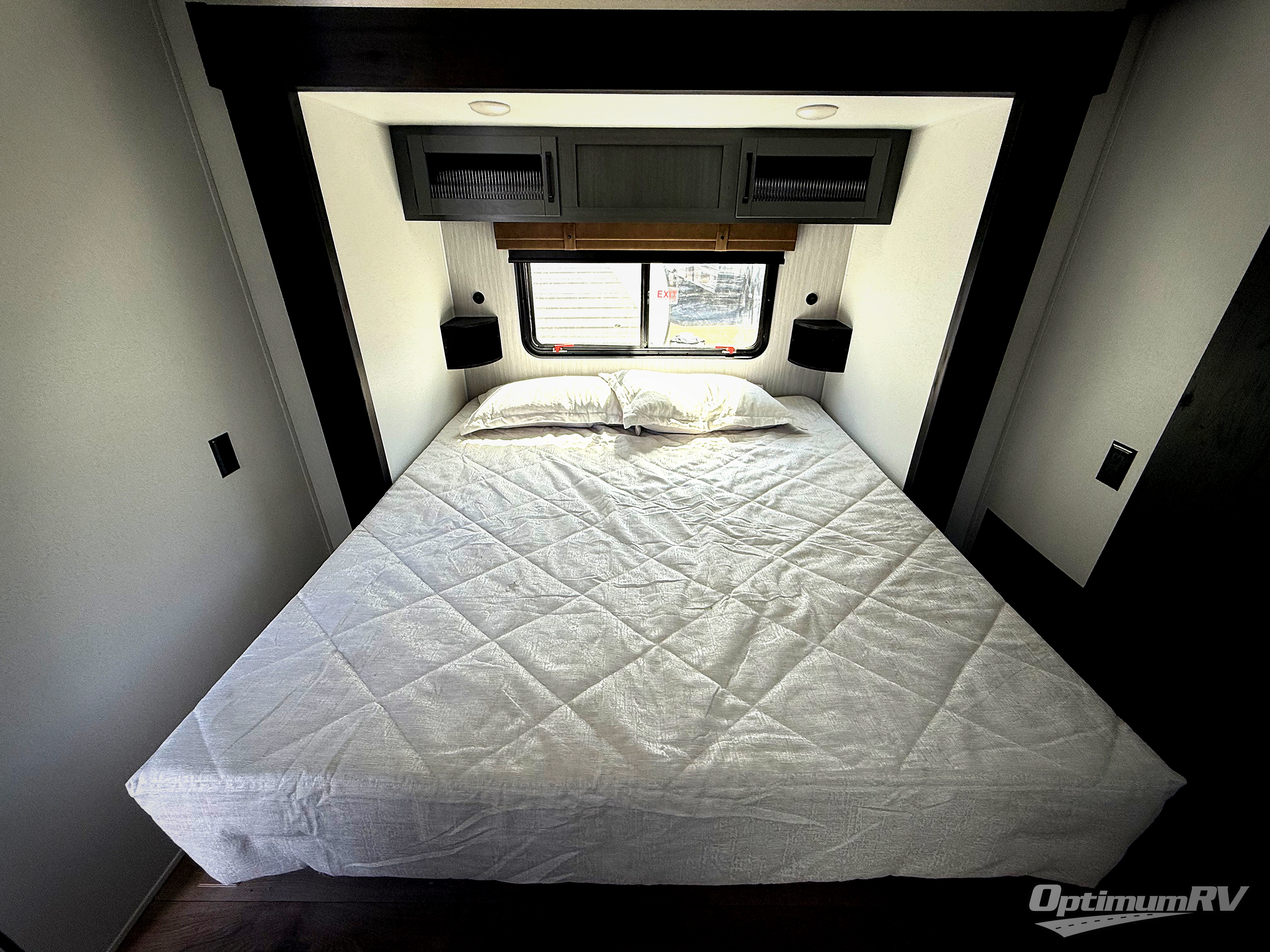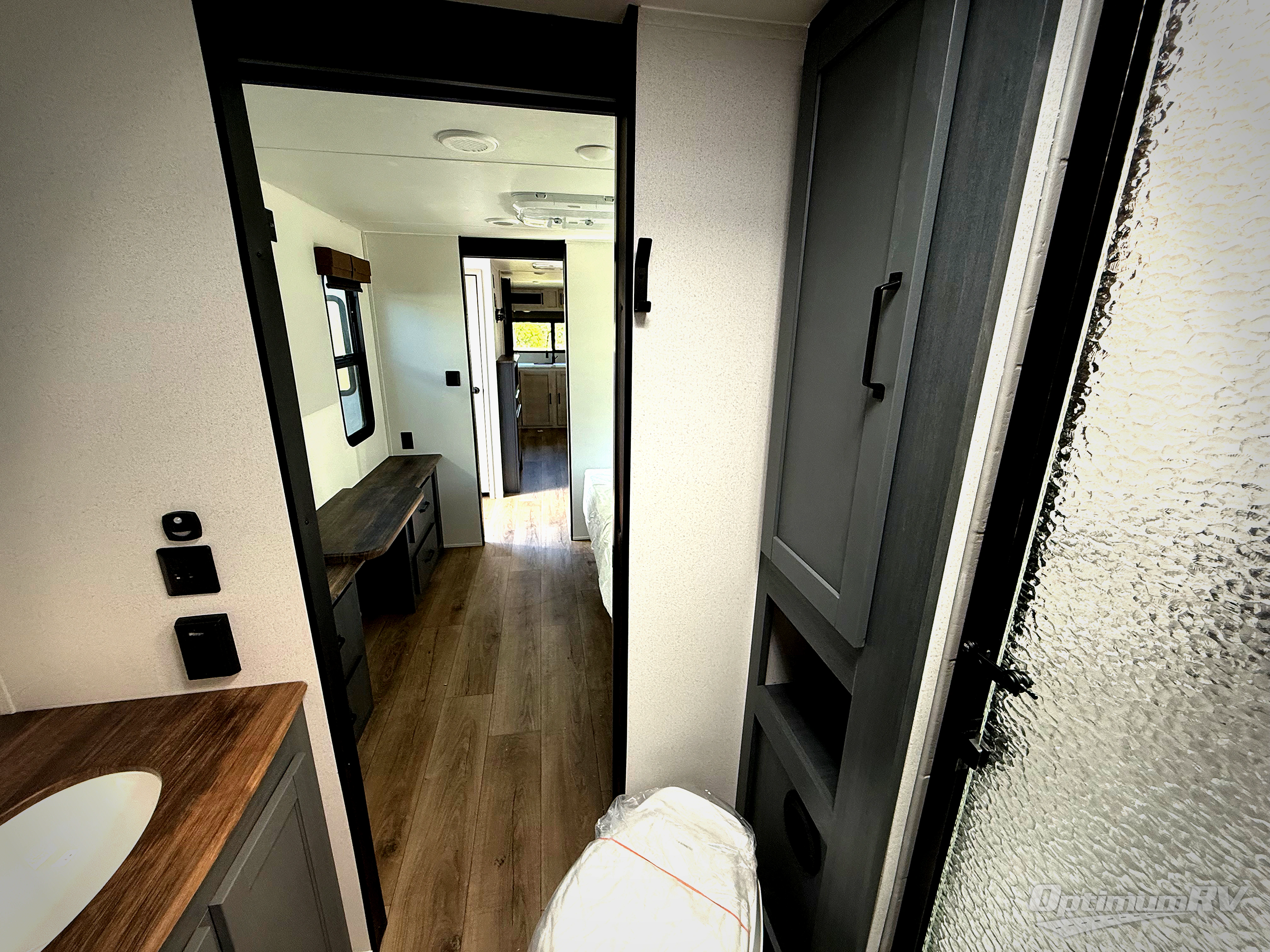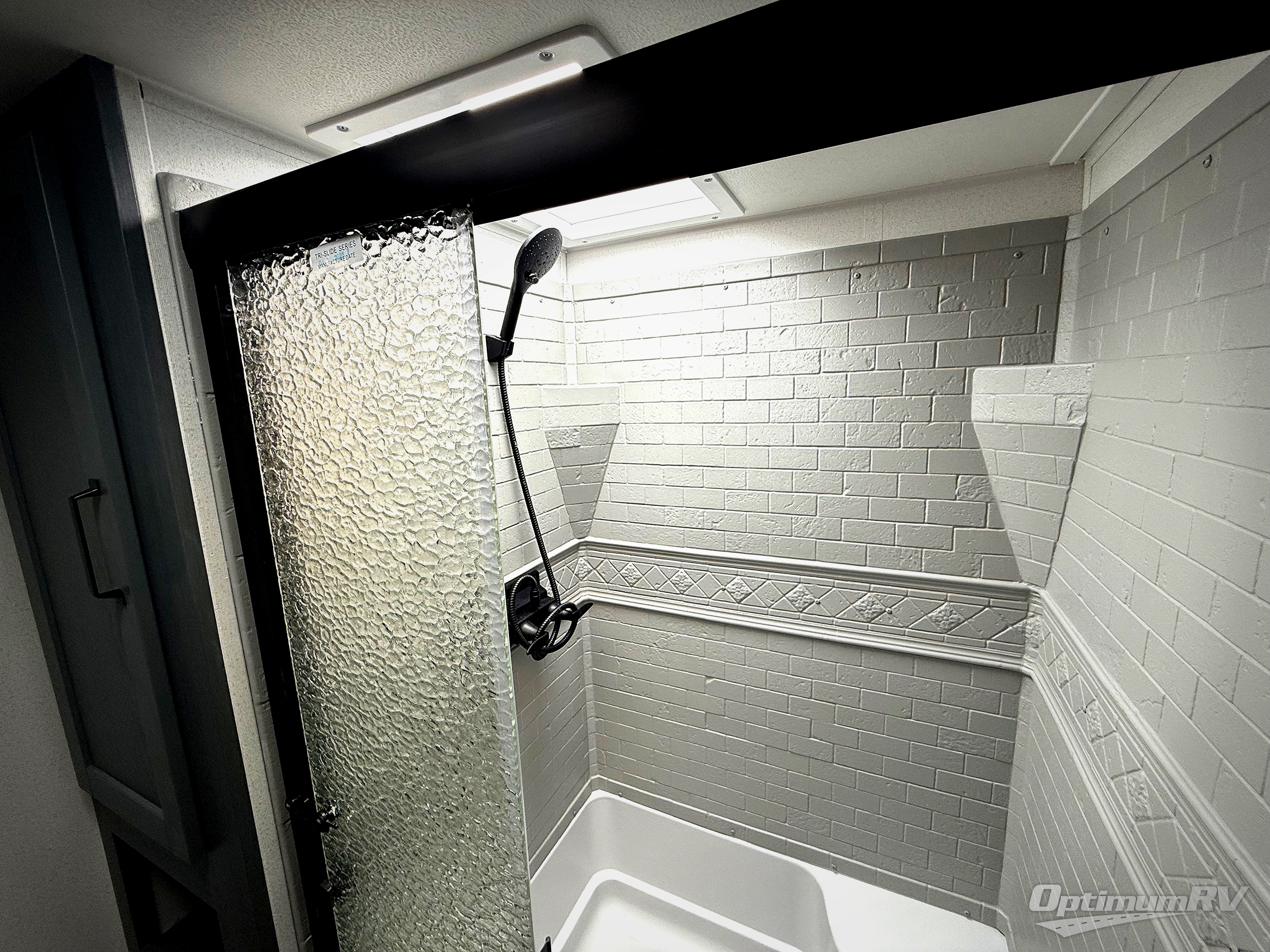 You'll love camping in this double slide out travel trailer with a rear kitchen and a spacious front bath! There is a 40" shower here, along with a linen closet, shirt closet, plus a closet with washer/dryer prep. The master bedroom includes a king bed slide out, dual bedroom dressers, a desk and a TV hookup if you want the option to watch movies in bed. The combined kitchen and living area is made open by the large slide out, which houses the sofa and booth dinette. These pieces of furniture area conveniently across from the entertainment center and fireplace to make it feel more like home. The chef of your group will appreciate generous counter space in the rear kitchen, and if they like to cook outdoors, and optional mini kitchen with a griddle can be added!