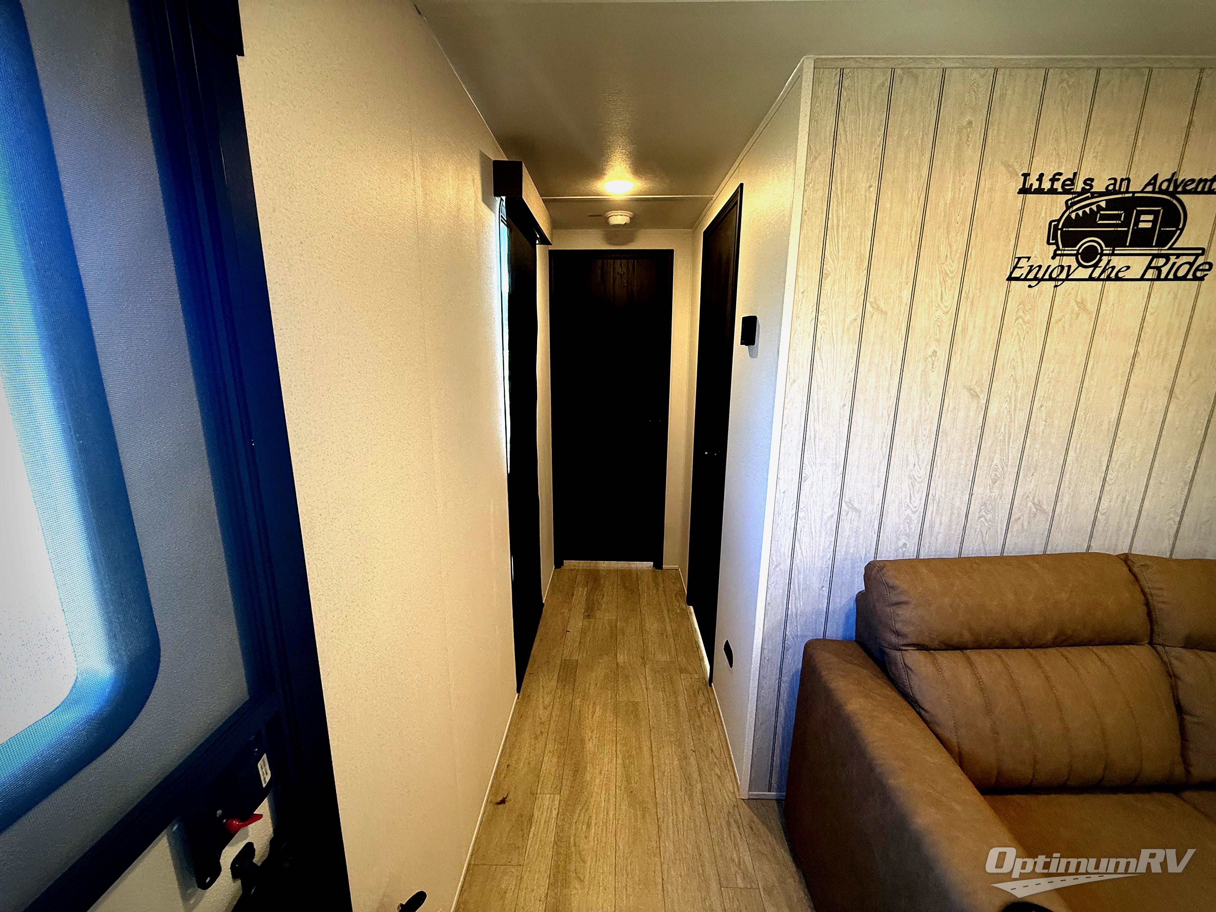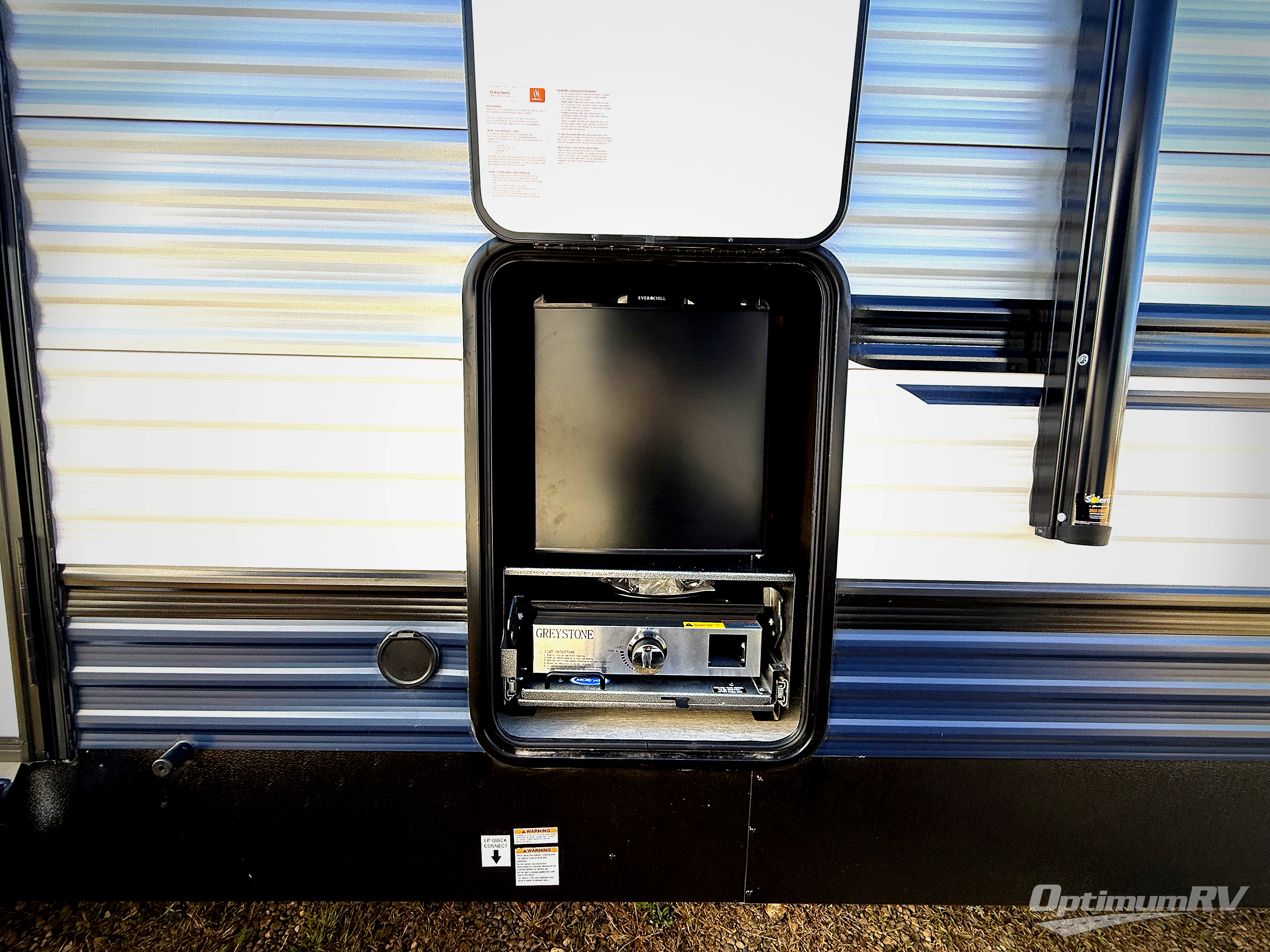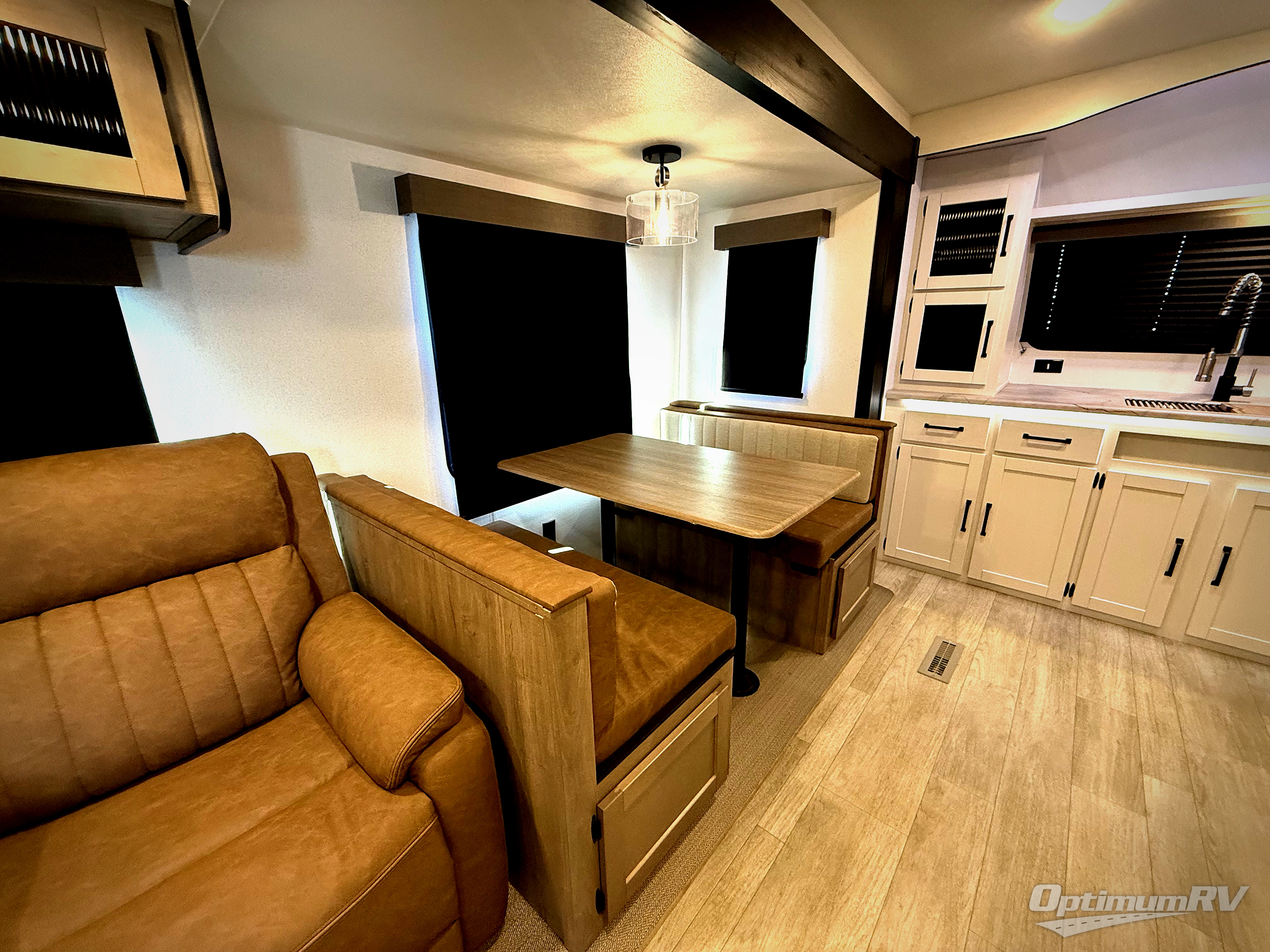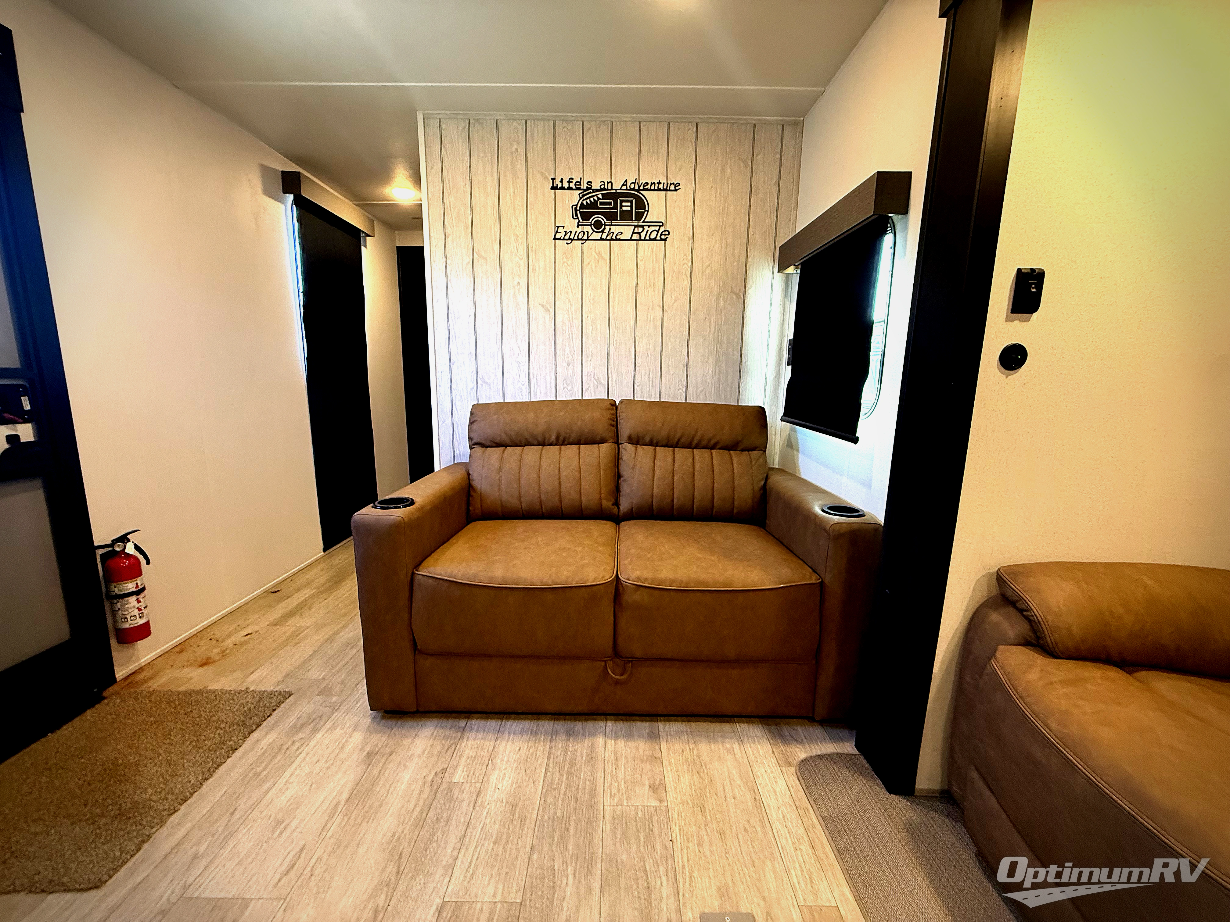 Experience a home away from home with this travel trailer! The front kitchen has everything you will need to prepare your best meals and you can enjoy them at the booth dinette. The rear private bedroom has a 72" x 80" king bed slide across from a dresser, a wardrobe, and a closet with washer and dryer prep. Freshen up in the full bathroom with the 32" x 40" shower and then enjoy a cup of coffee relaxing in one of the two recliners or on the sofa! Choose the optional outside micro kitchen with a griddle for even more convenience!