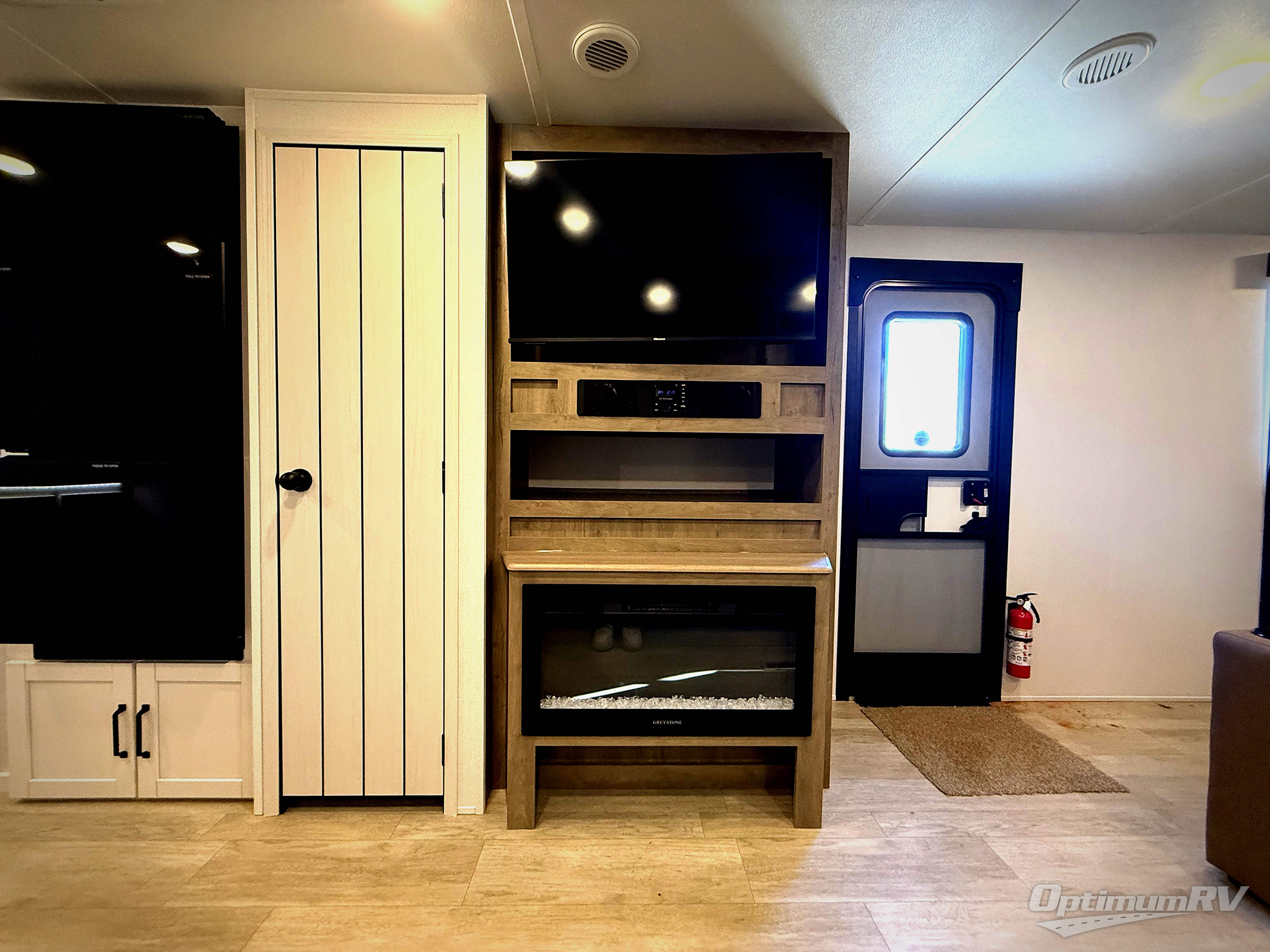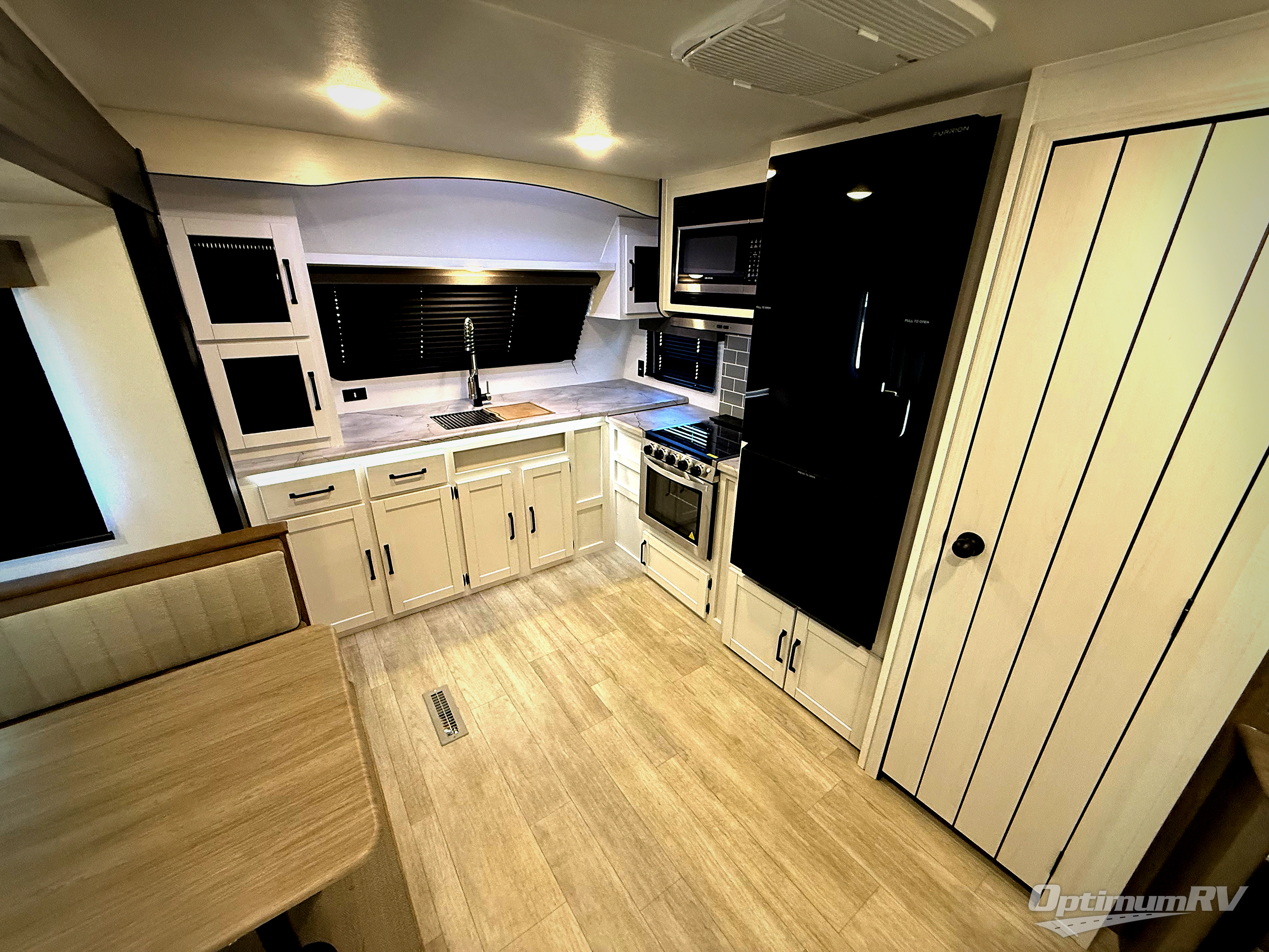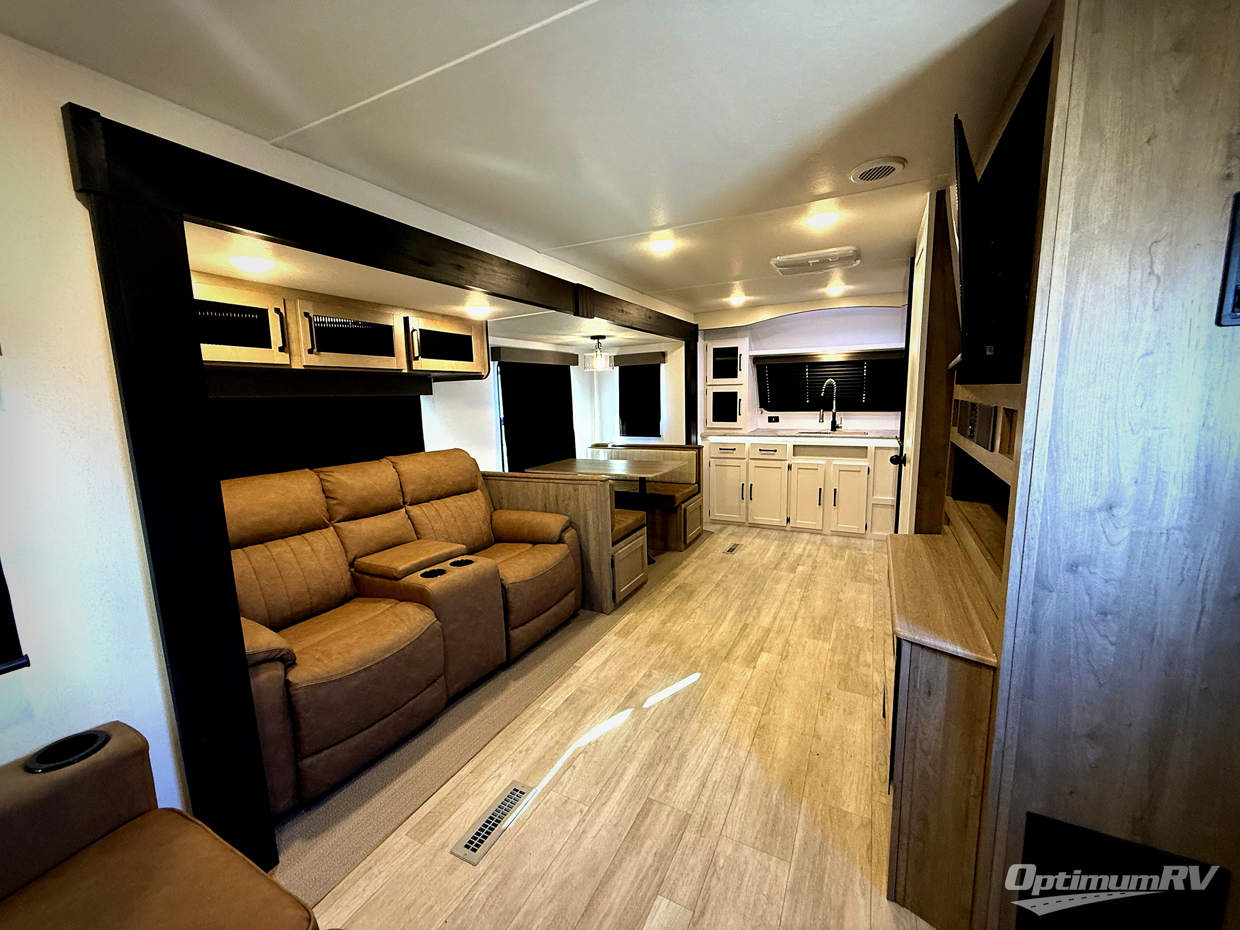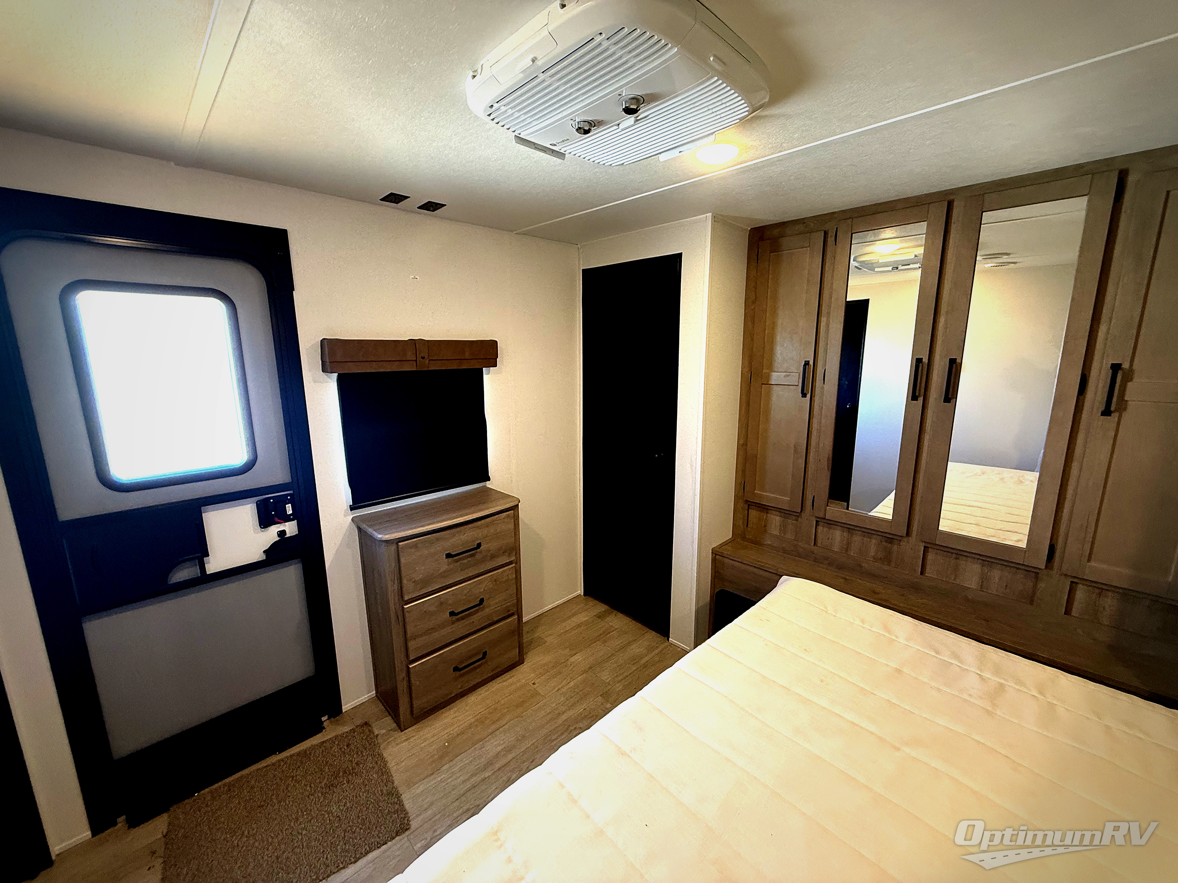 Experience a home away from home with this travel trailer! The front kitchen has everything you will need to prepare your best meals and you can enjoy them at the booth dinette. The rear private bedroom has a 72" x 80" king bed slide across from a dresser, a wardrobe, and a closet with washer and dryer prep. Freshen up in the full bathroom with the 32" x 40" shower and then enjoy a cup of coffee relaxing in one of the two recliners or on the sofa! Choose the optional outside micro kitchen with a griddle for even more convenience!