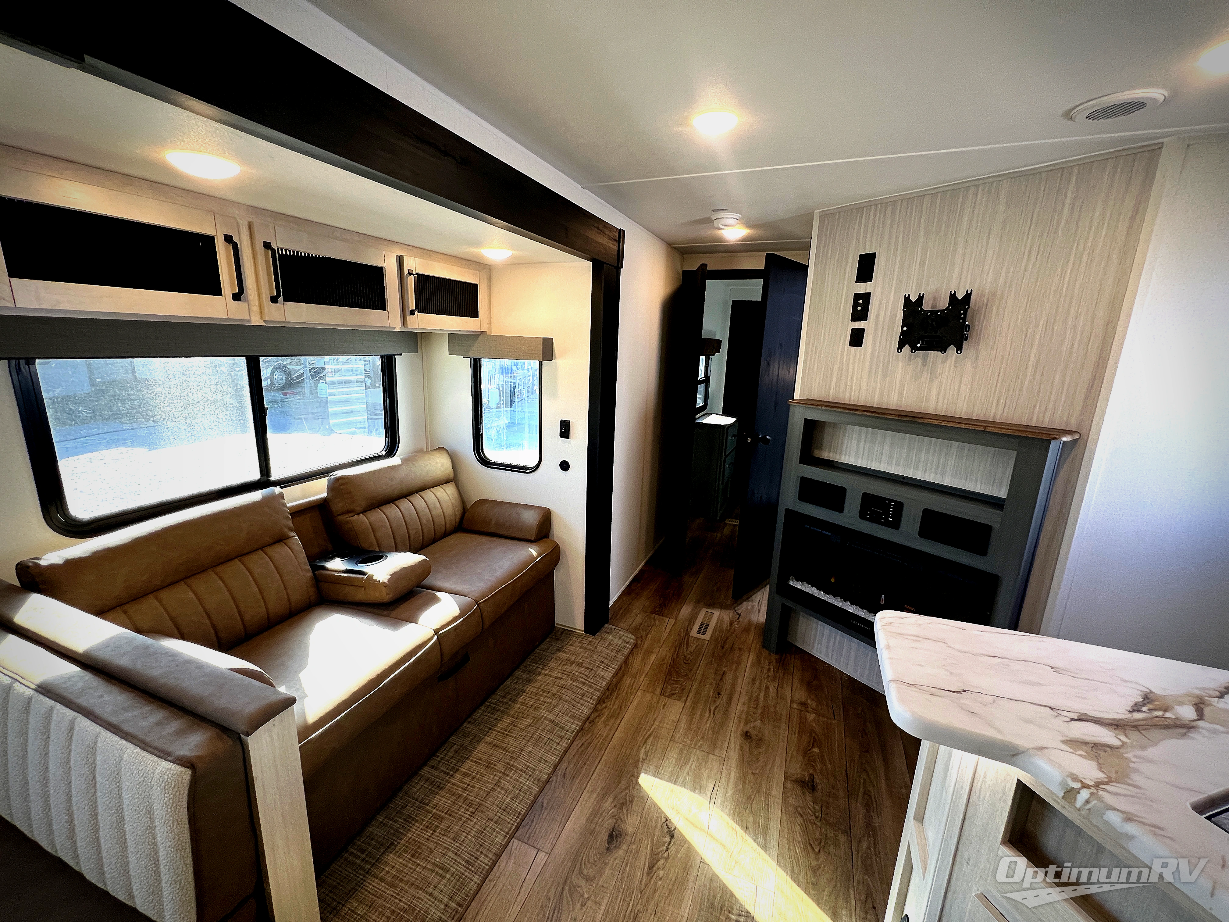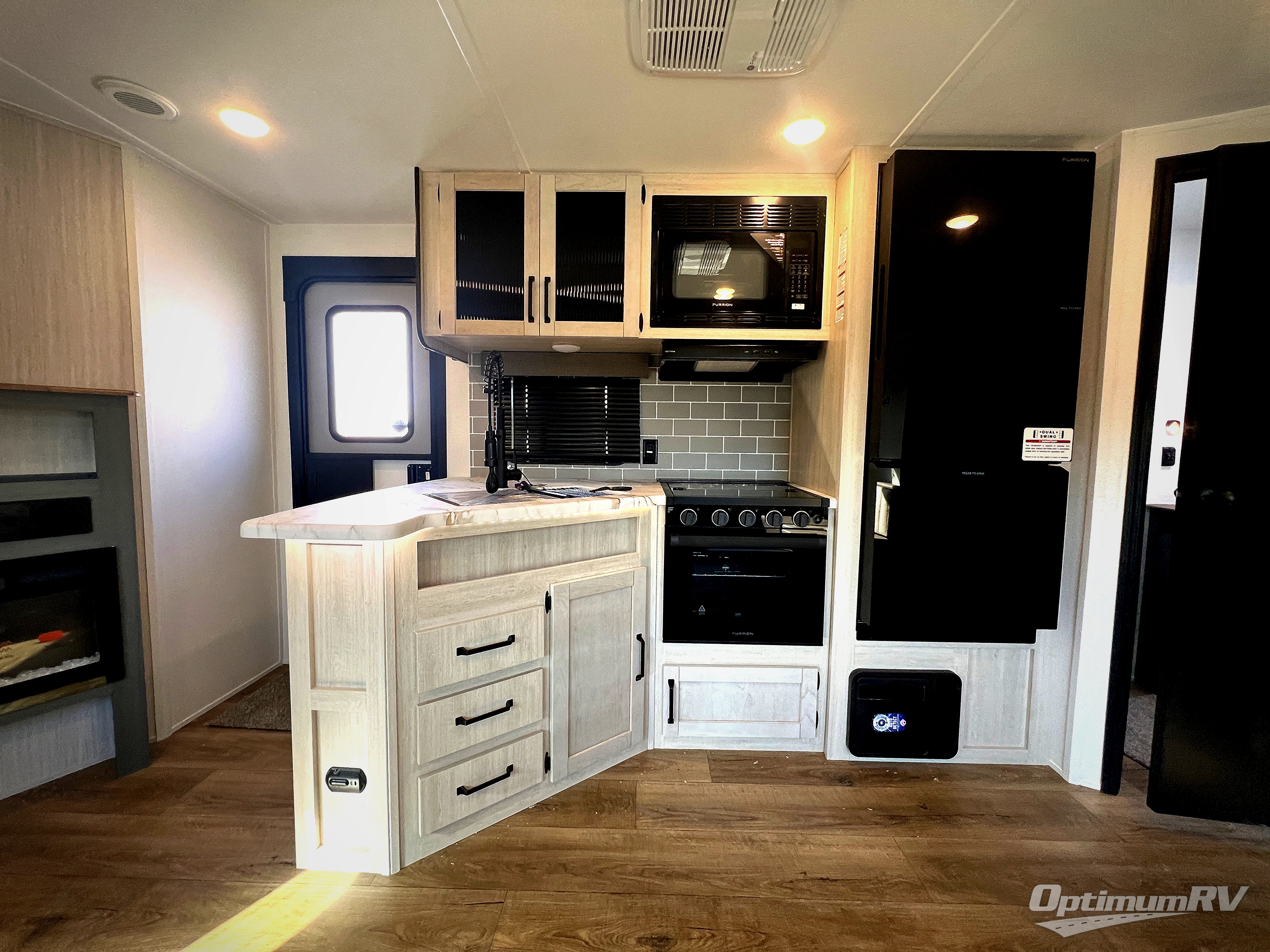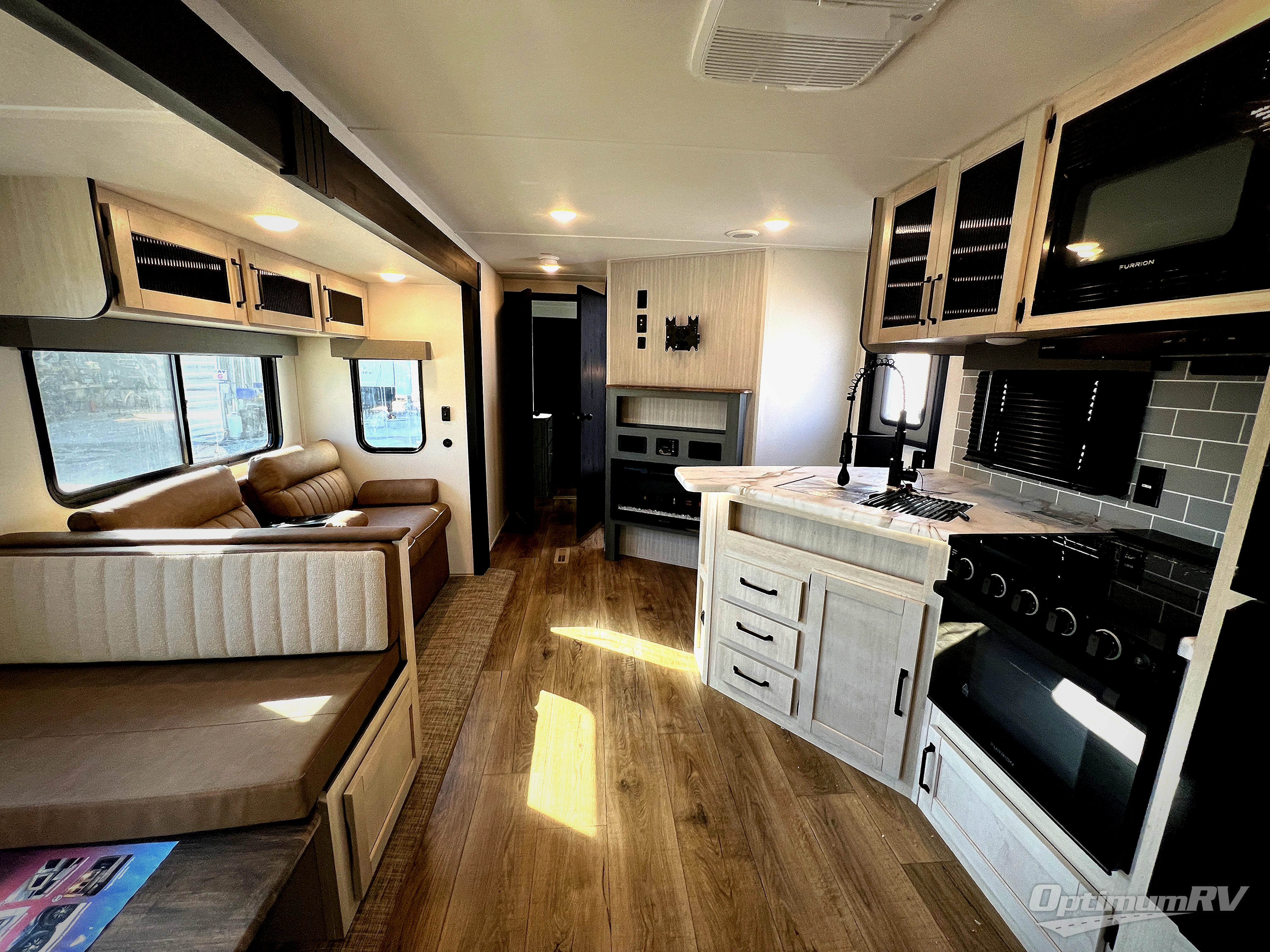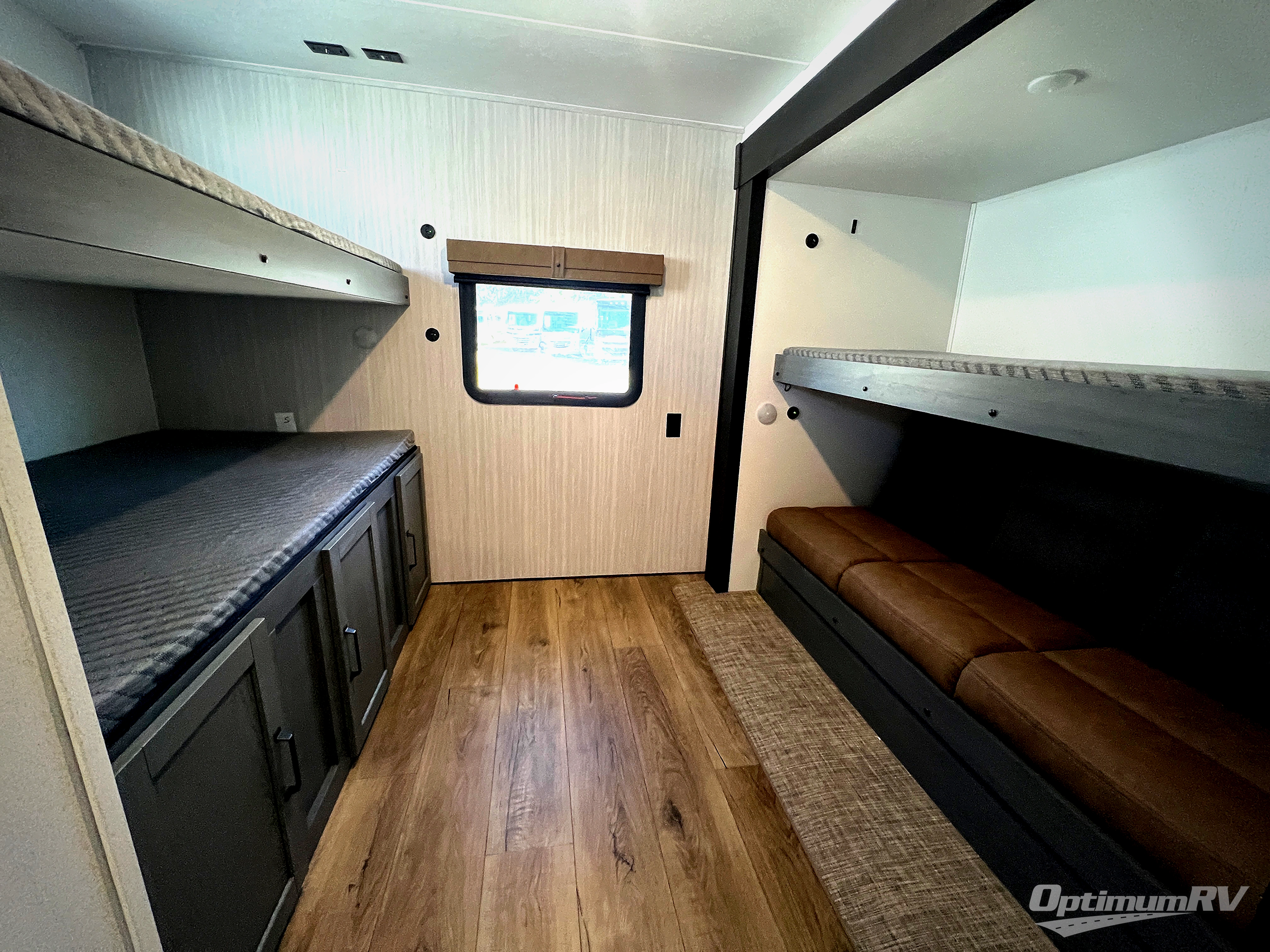 With dual entry doors and a bath and a half, you will have the ultimate in convenience with this travel trailer! The bedroom also has a front closet to keep your clothes looking their best and a queen bed slide for you to sleep your best. Everyone can freshen up in the full bathroom with the 34" x 34" radius shower and fill their bellies with scrambled eggs cooked with the stainless steel oven and range. Enjoy your meals, play games, and even sleep at the booth dinette or relax on the sofa while watching a movie with the entertainment center and fireplace. And your guests will love the rear private bunkhouse with three bunks, a jiffy sofa, and a slide out for more space! This model also includes an optional outside mini kitchen with a griddle!
