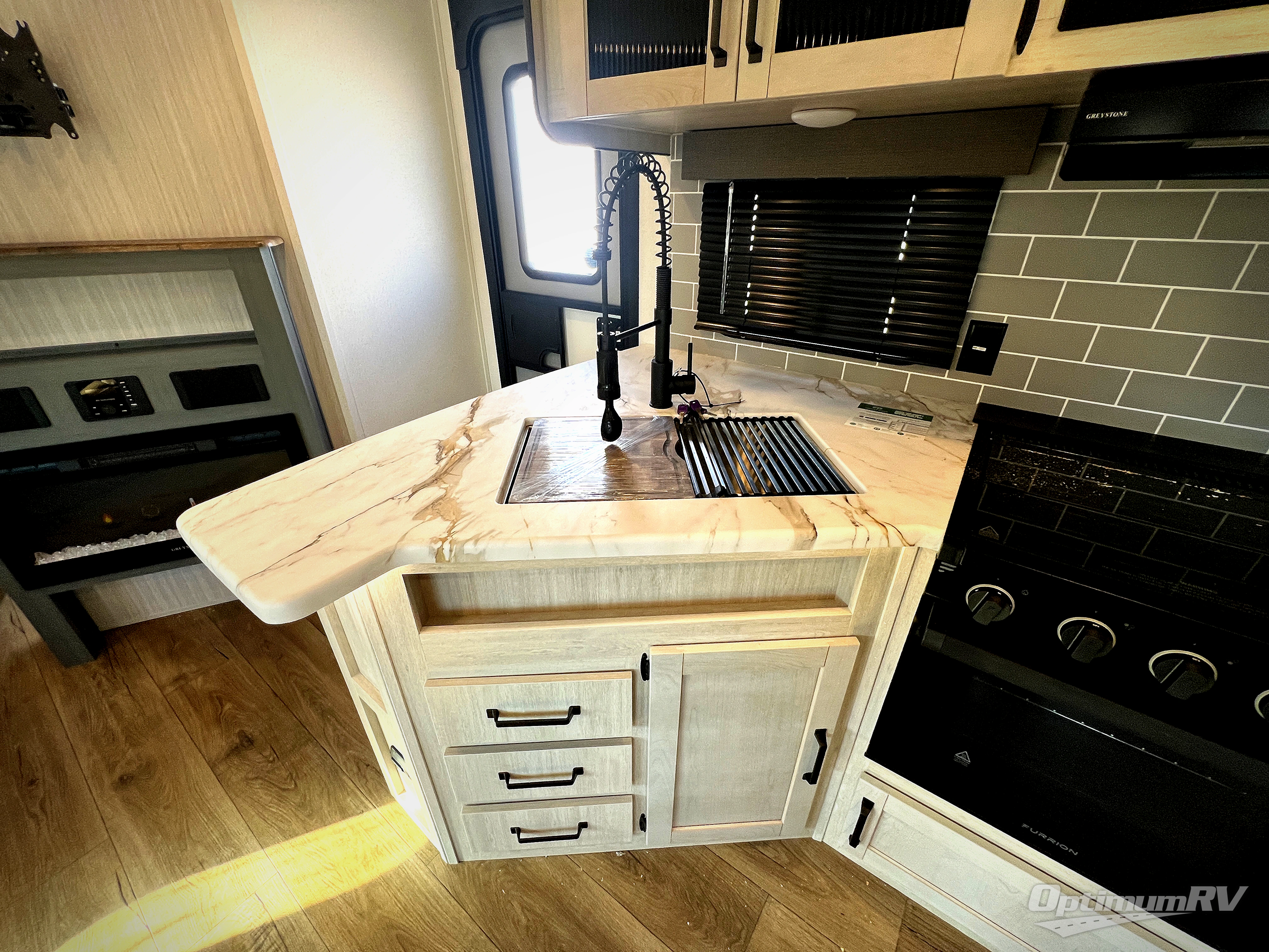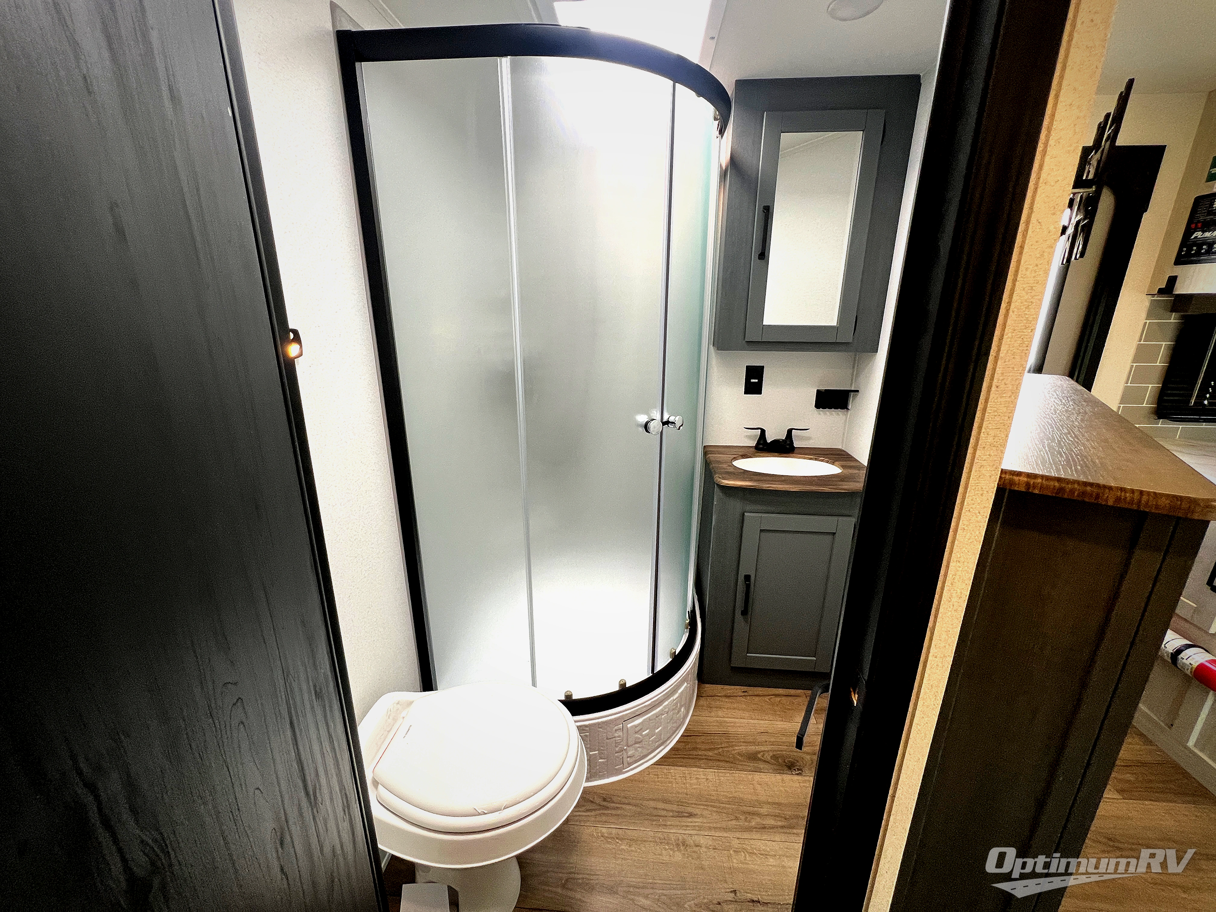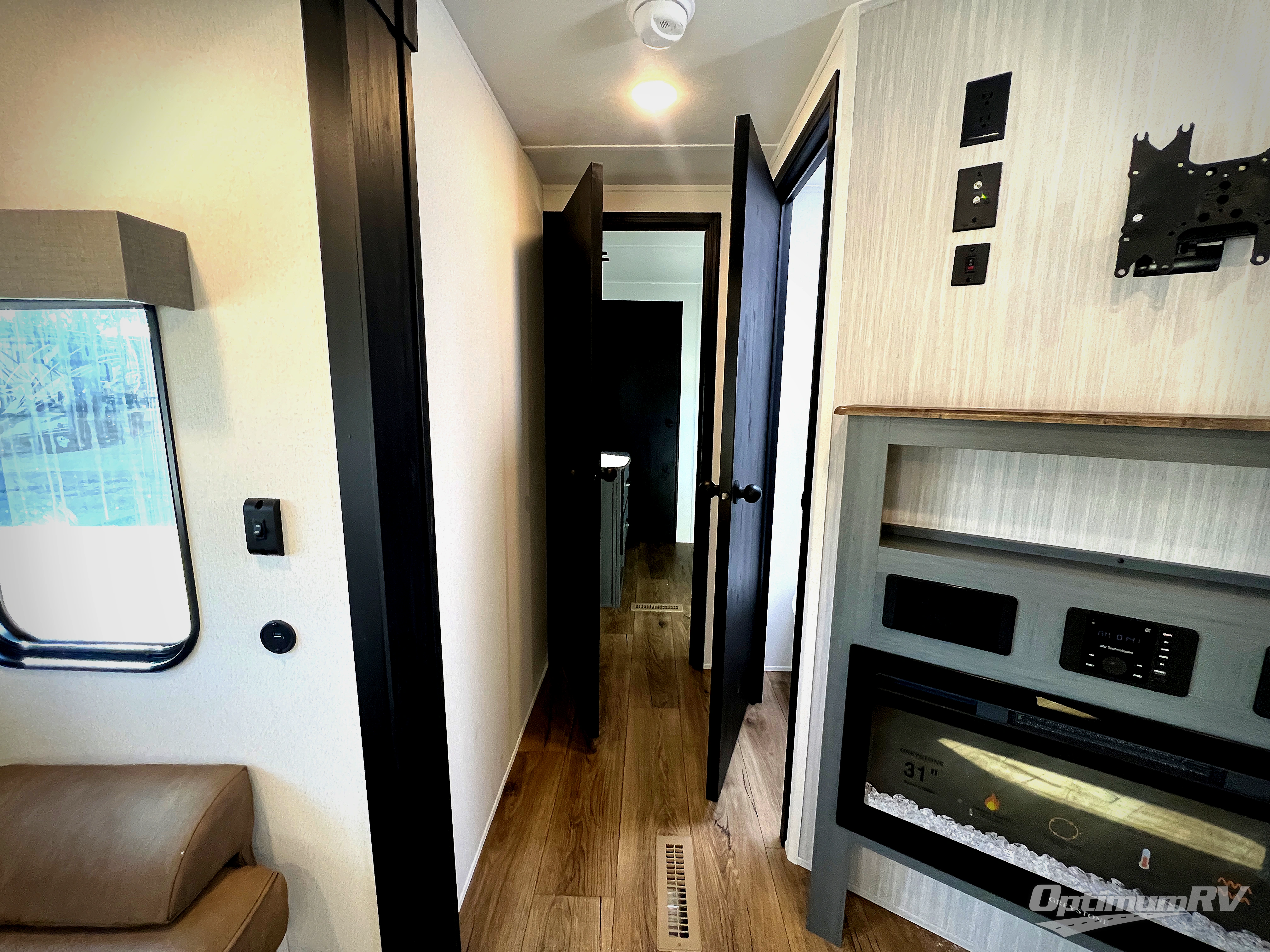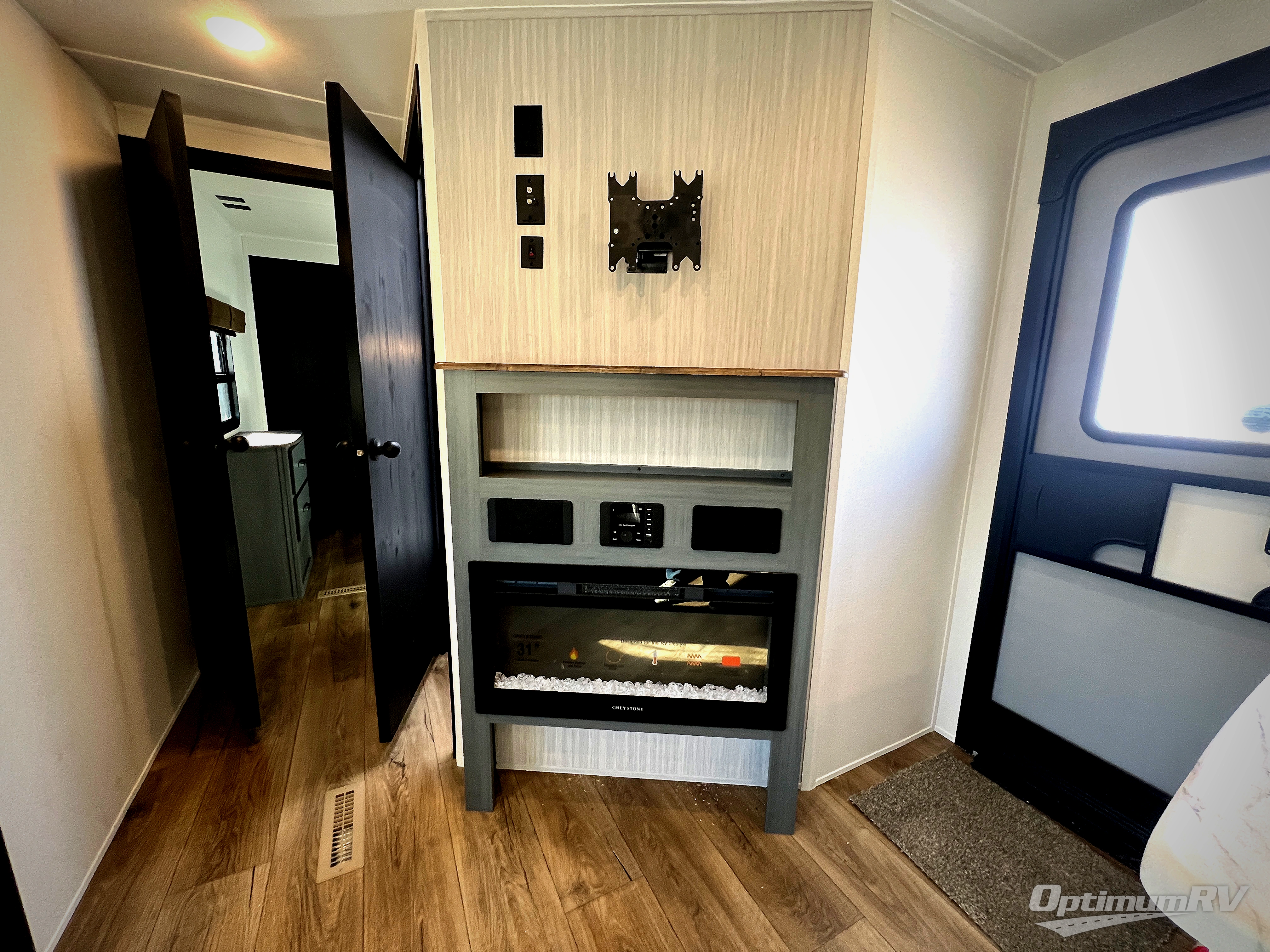 With dual entry doors and a bath and a half, you will have the ultimate in convenience with this travel trailer! The bedroom also has a front closet to keep your clothes looking their best and a queen bed slide for you to sleep your best. Everyone can freshen up in the full bathroom with the 34" x 34" radius shower and fill their bellies with scrambled eggs cooked with the stainless steel oven and range. Enjoy your meals, play games, and even sleep at the booth dinette or relax on the sofa while watching a movie with the entertainment center and fireplace. And your guests will love the rear private bunkhouse with three bunks, a jiffy sofa, and a slide out for more space! This model also includes an optional outside mini kitchen with a griddle!