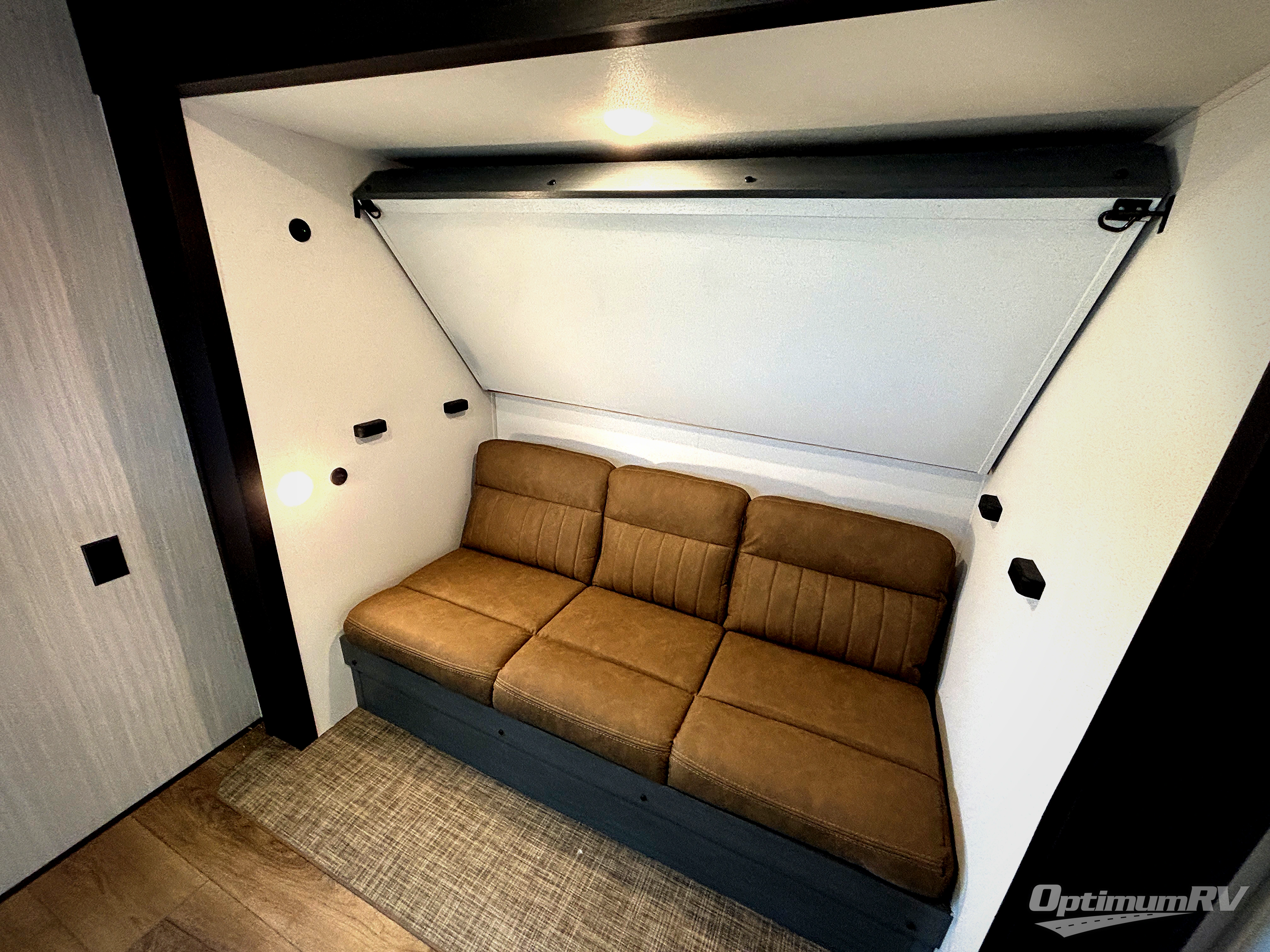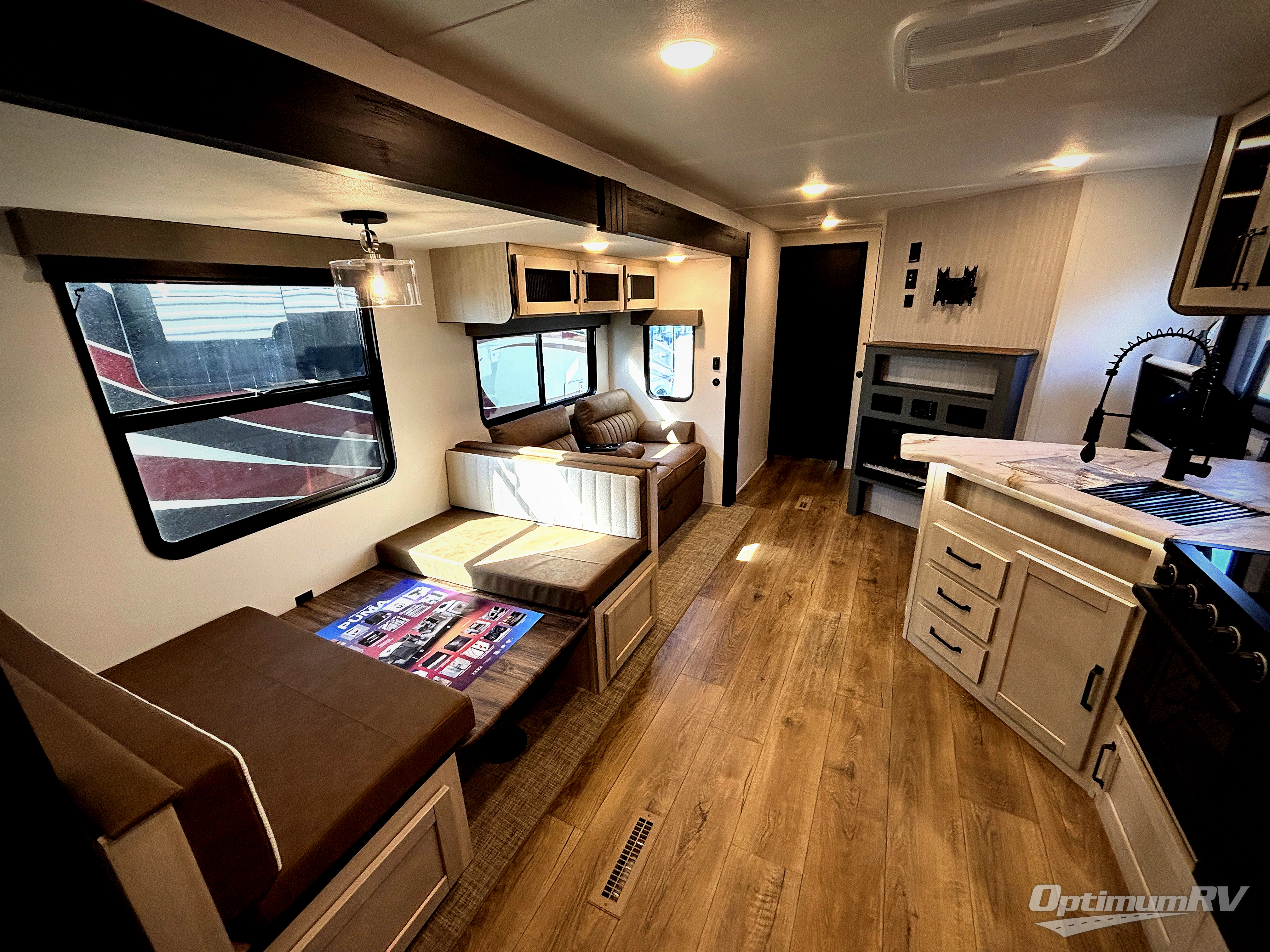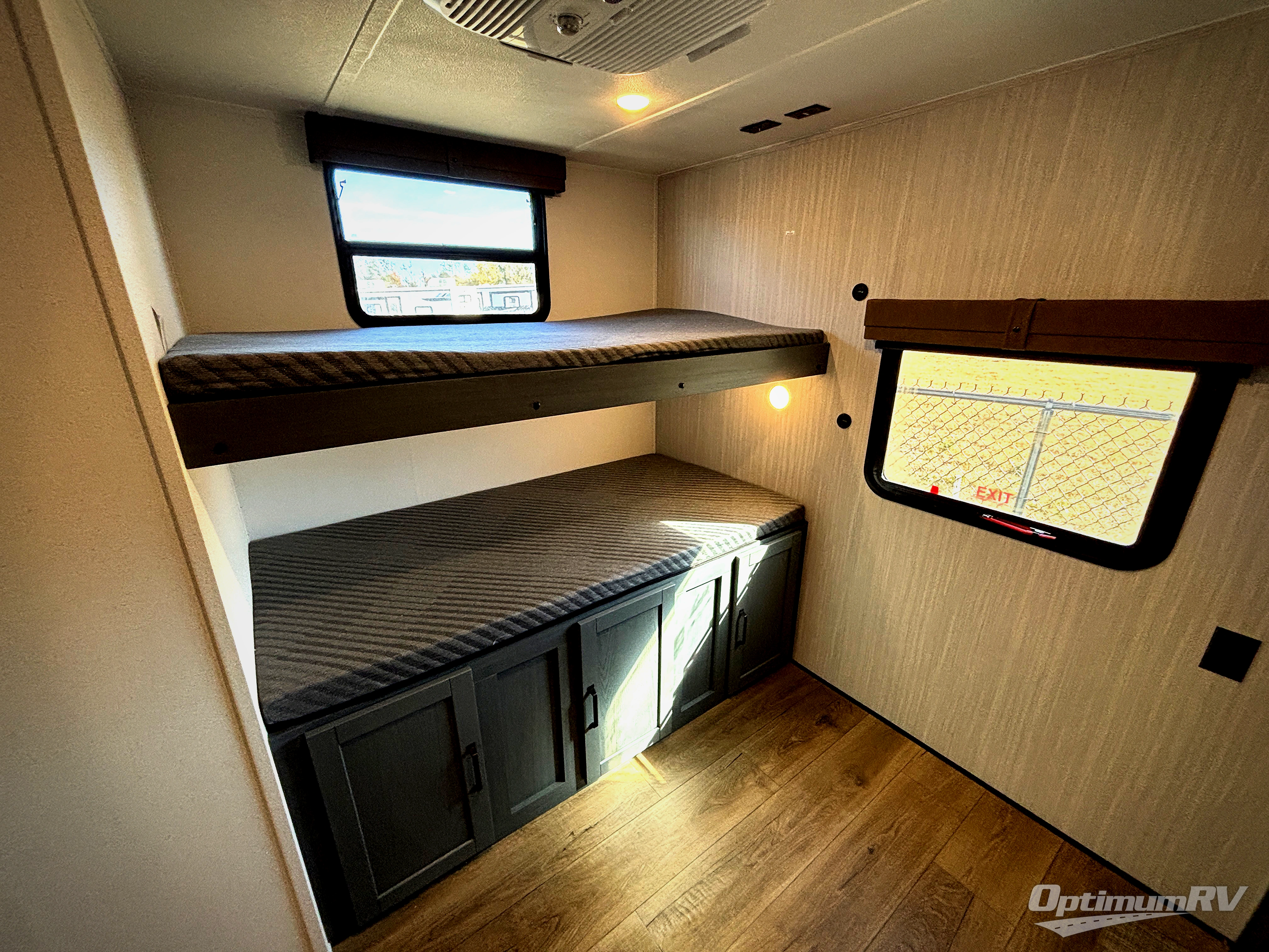 With dual entry doors and a bath and a half, you will have the ultimate in convenience with this travel trailer! The bedroom also has a front closet to keep your clothes looking their best and a queen bed slide for you to sleep your best. Everyone can freshen up in the full bathroom with the 34" x 34" radius shower and fill their bellies with scrambled eggs cooked with the stainless steel oven and range. Enjoy your meals, play games, and even sleep at the booth dinette or relax on the sofa while watching a movie with the entertainment center and fireplace. And your guests will love the rear private bunkhouse with three bunks, a jiffy sofa, and a slide out for more space! This model also includes an optional outside mini kitchen with a griddle!