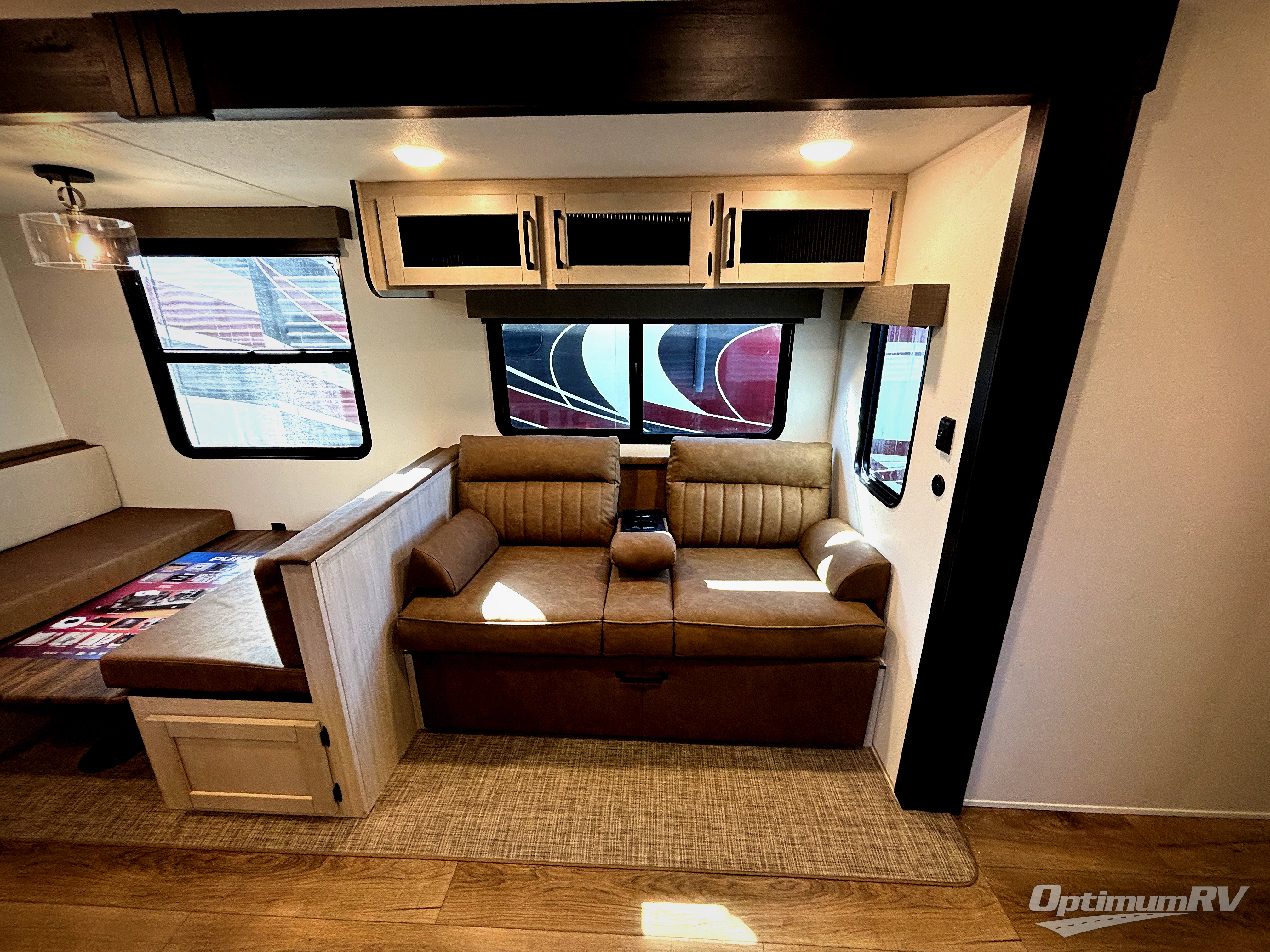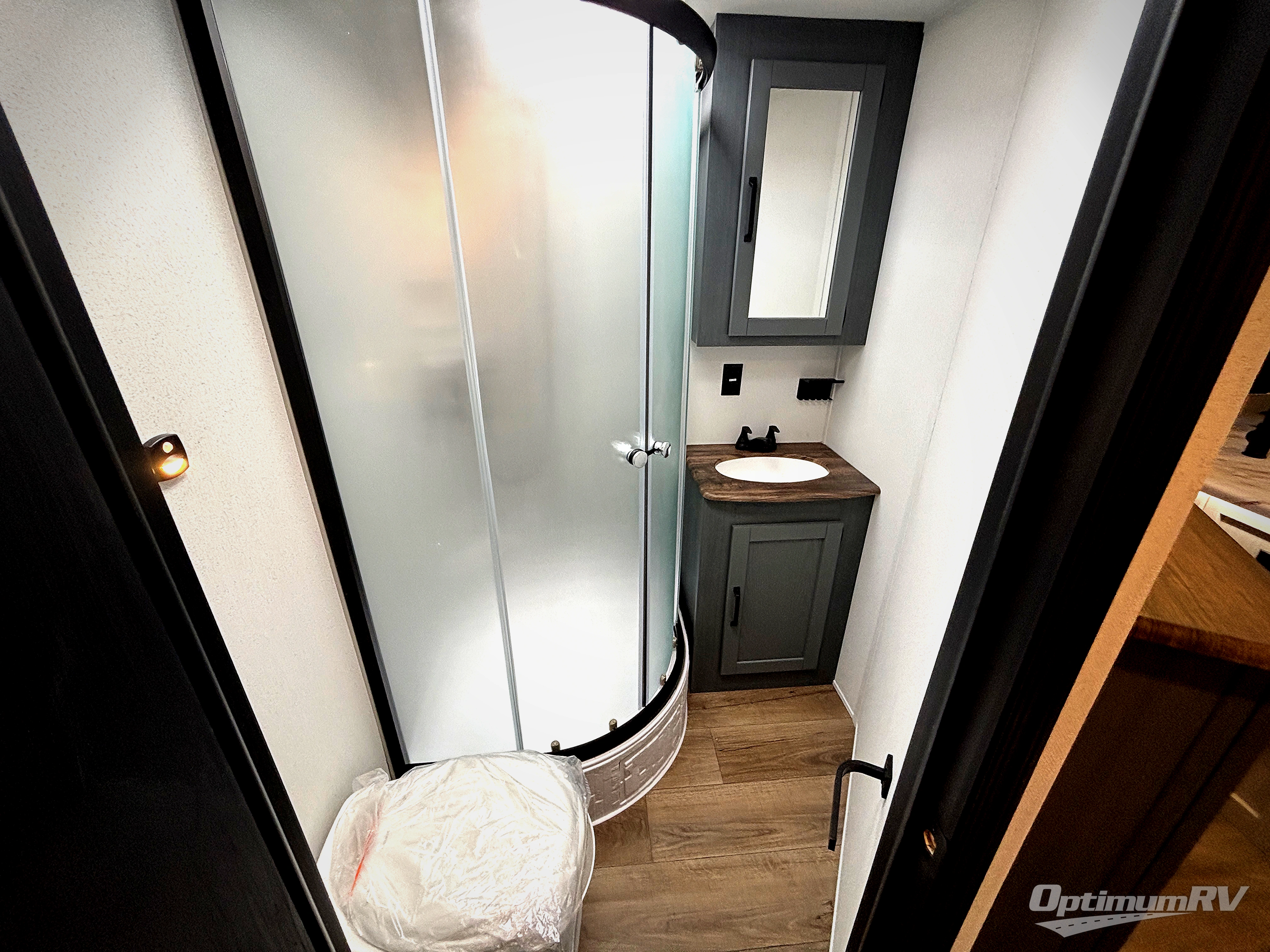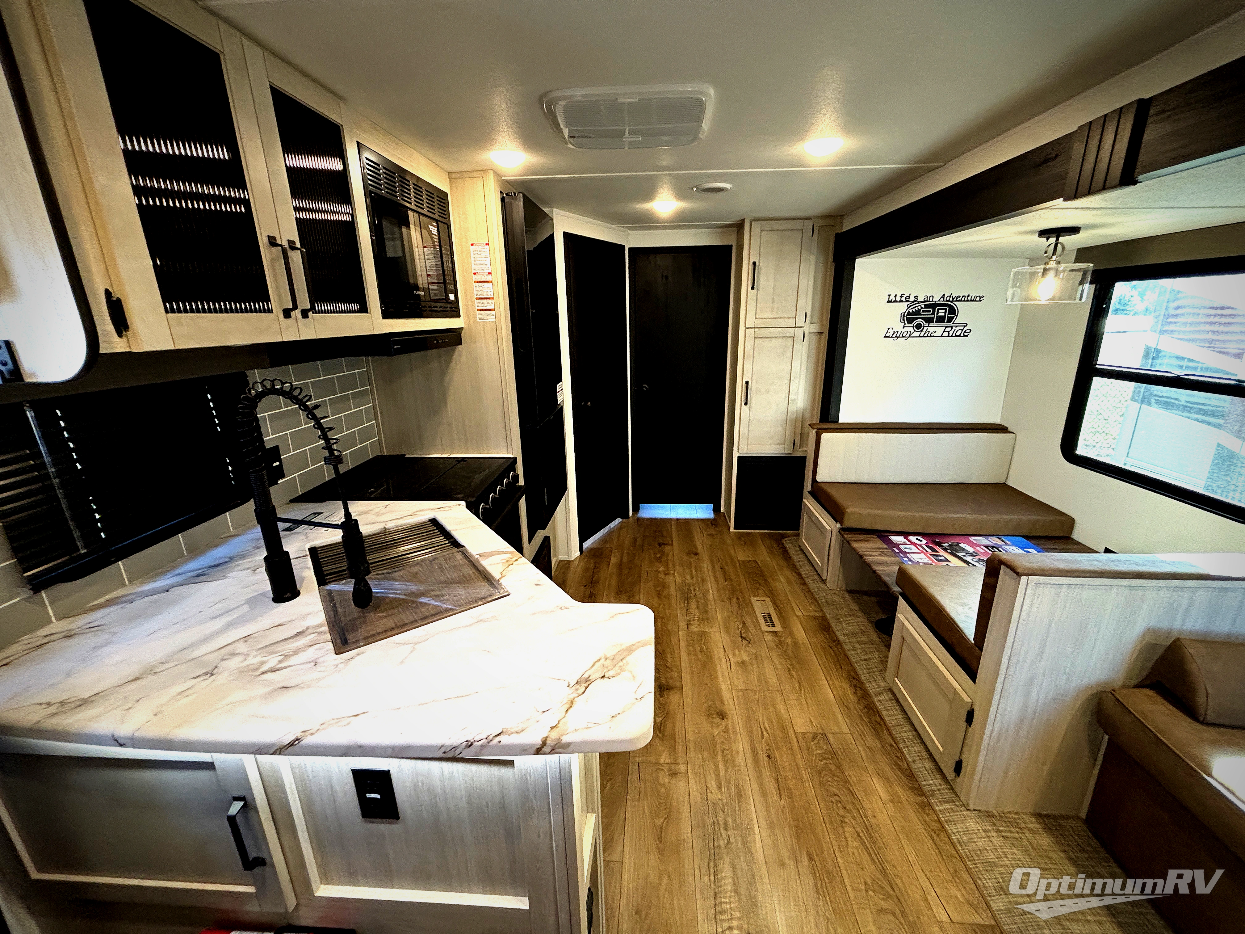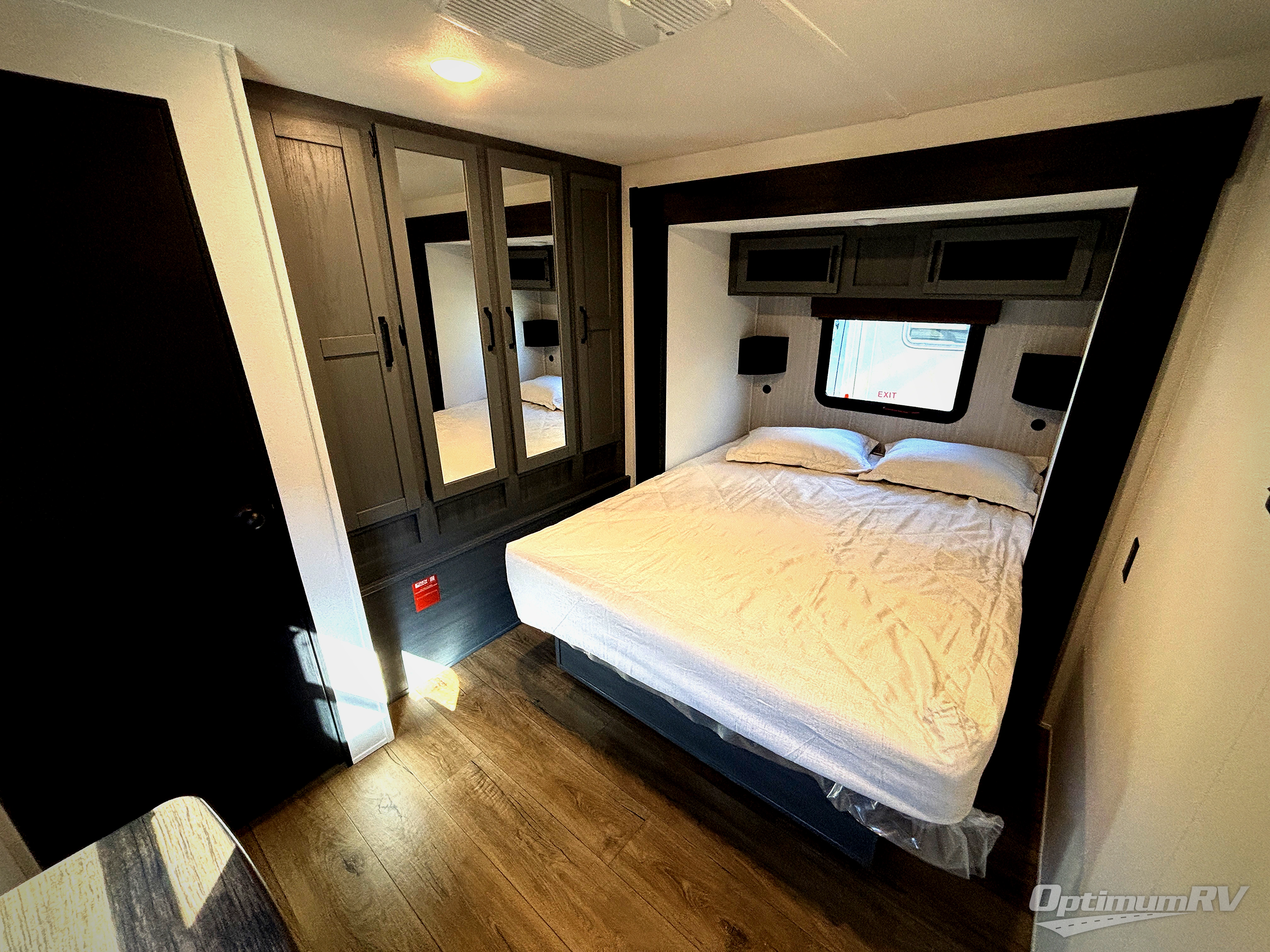 With dual entry doors and a bath and a half, you will have the ultimate in convenience with this travel trailer! The bedroom also has a front closet to keep your clothes looking their best and a queen bed slide for you to sleep your best. Everyone can freshen up in the full bathroom with the 34" x 34" radius shower and fill their bellies with scrambled eggs cooked with the stainless steel oven and range. Enjoy your meals, play games, and even sleep at the booth dinette or relax on the sofa while watching a movie with the entertainment center and fireplace. And your guests will love the rear private bunkhouse with three bunks, a jiffy sofa, and a slide out for more space! This model also includes an optional outside mini kitchen with a griddle!