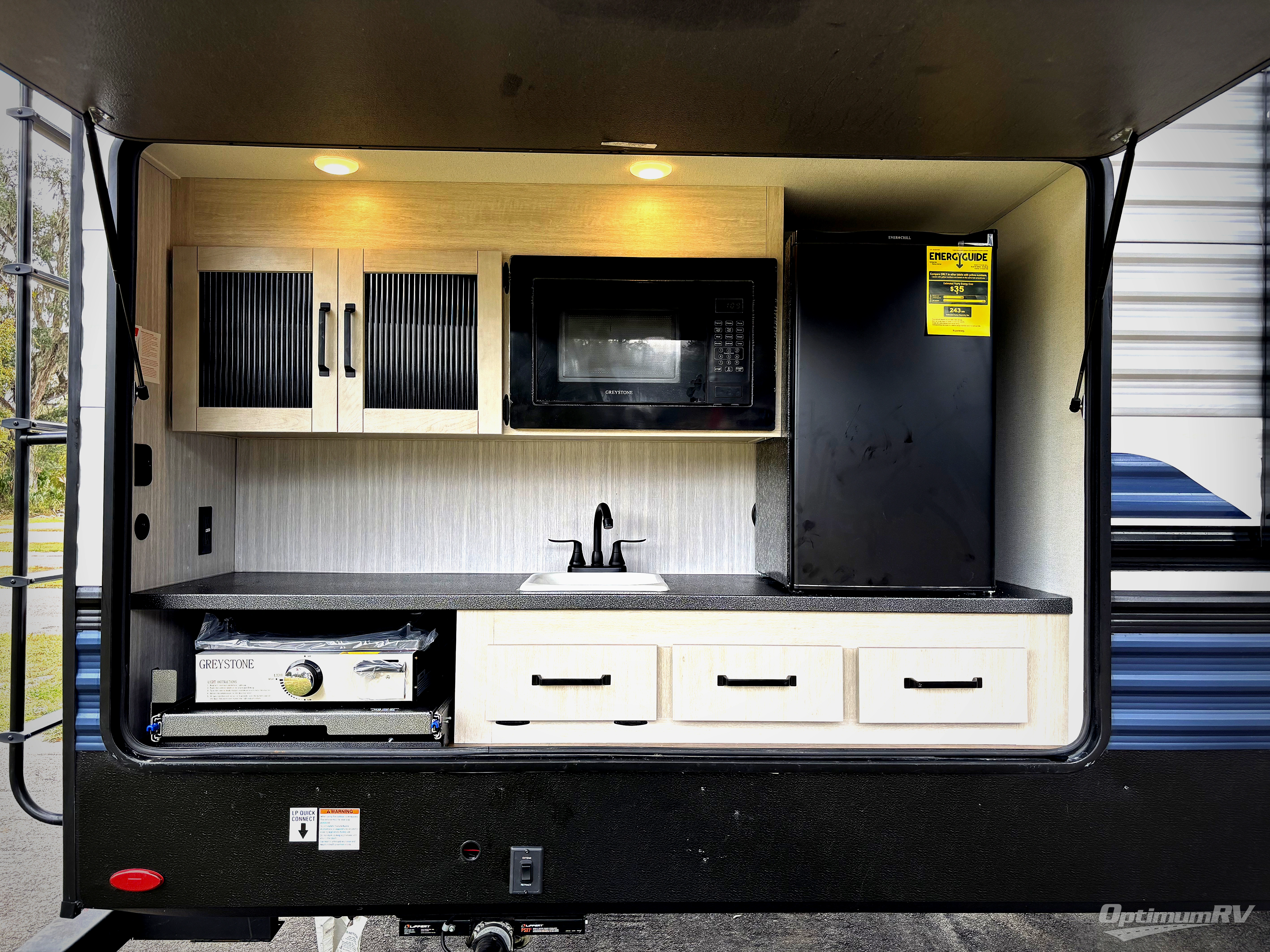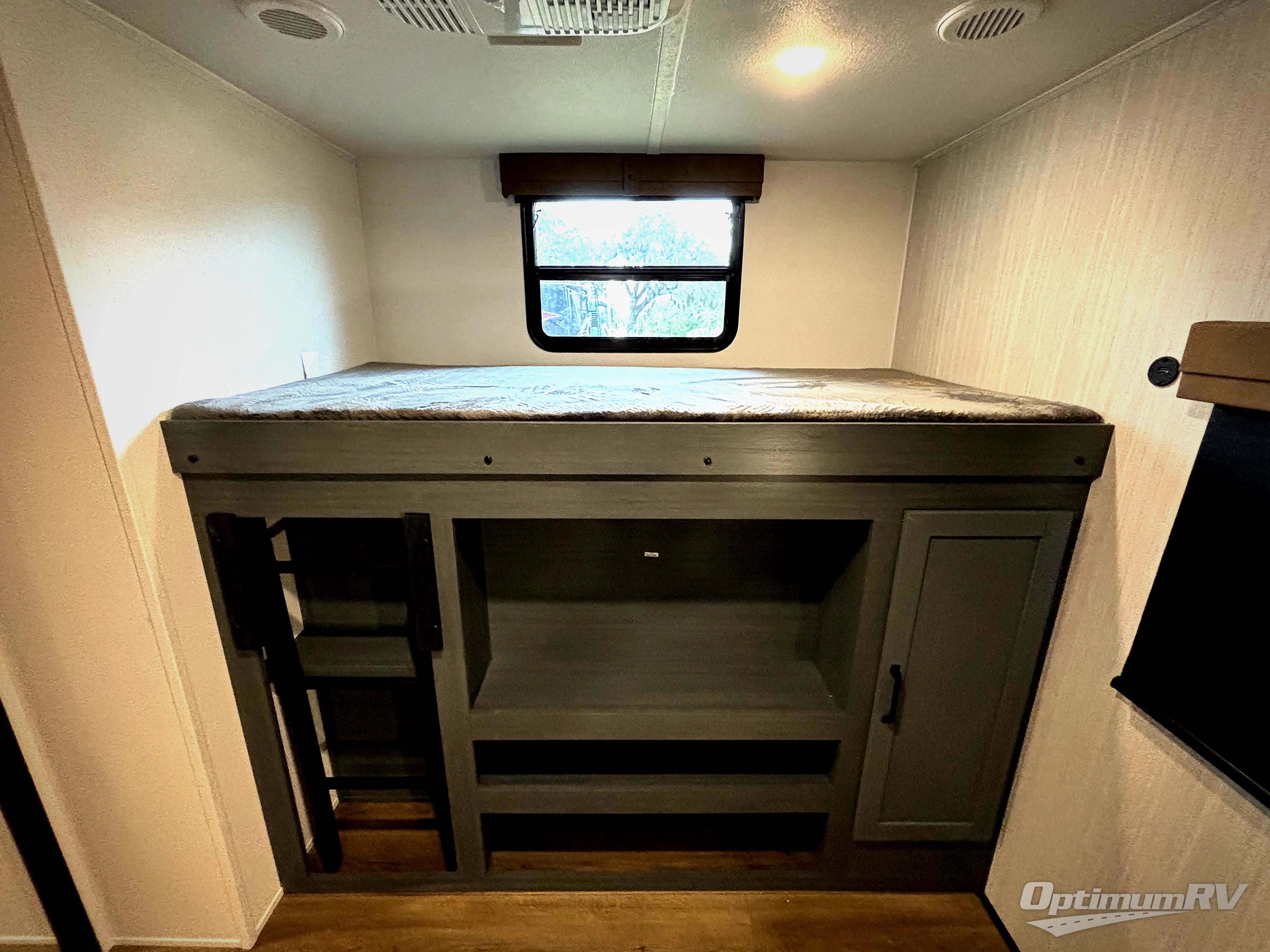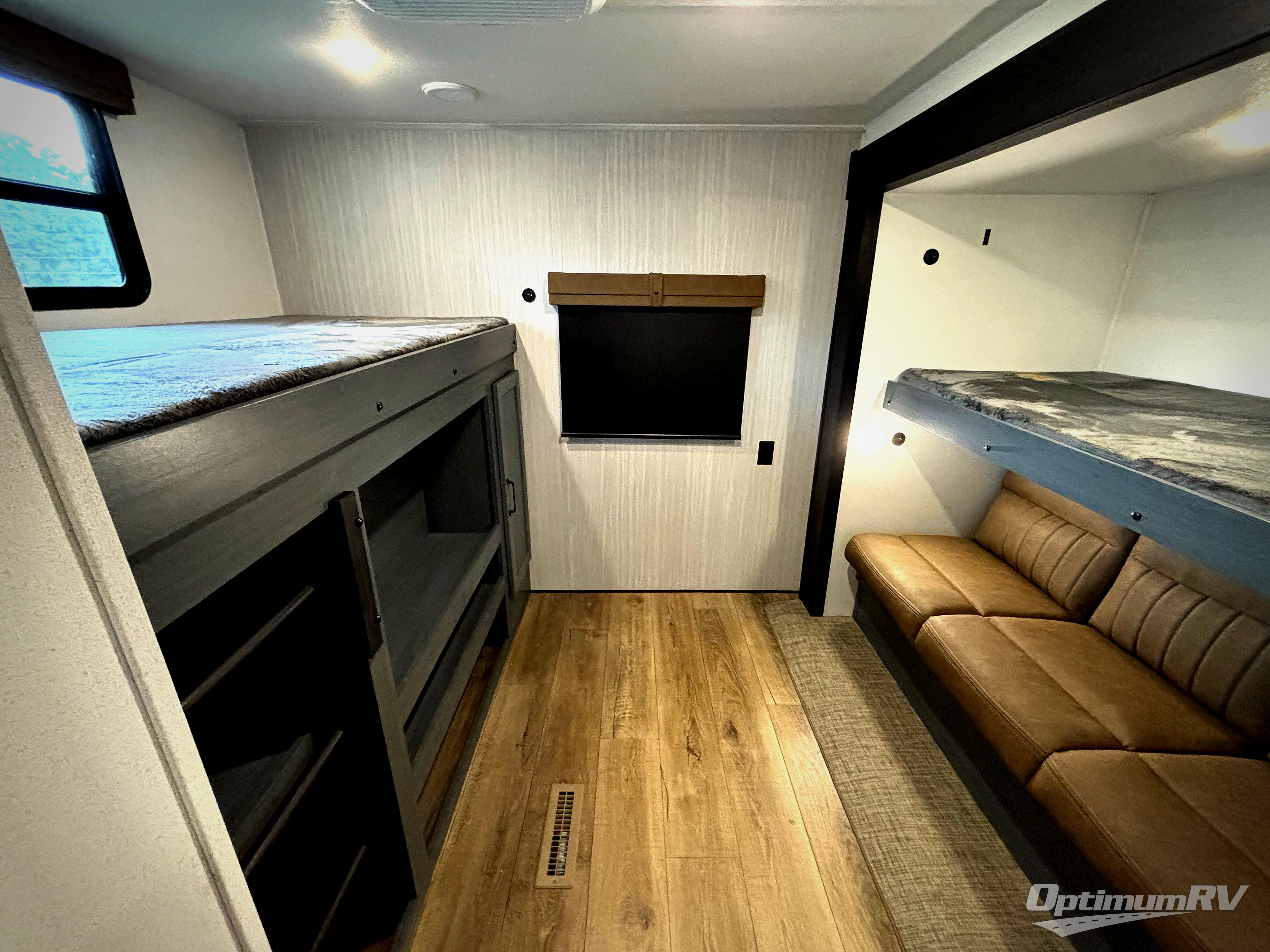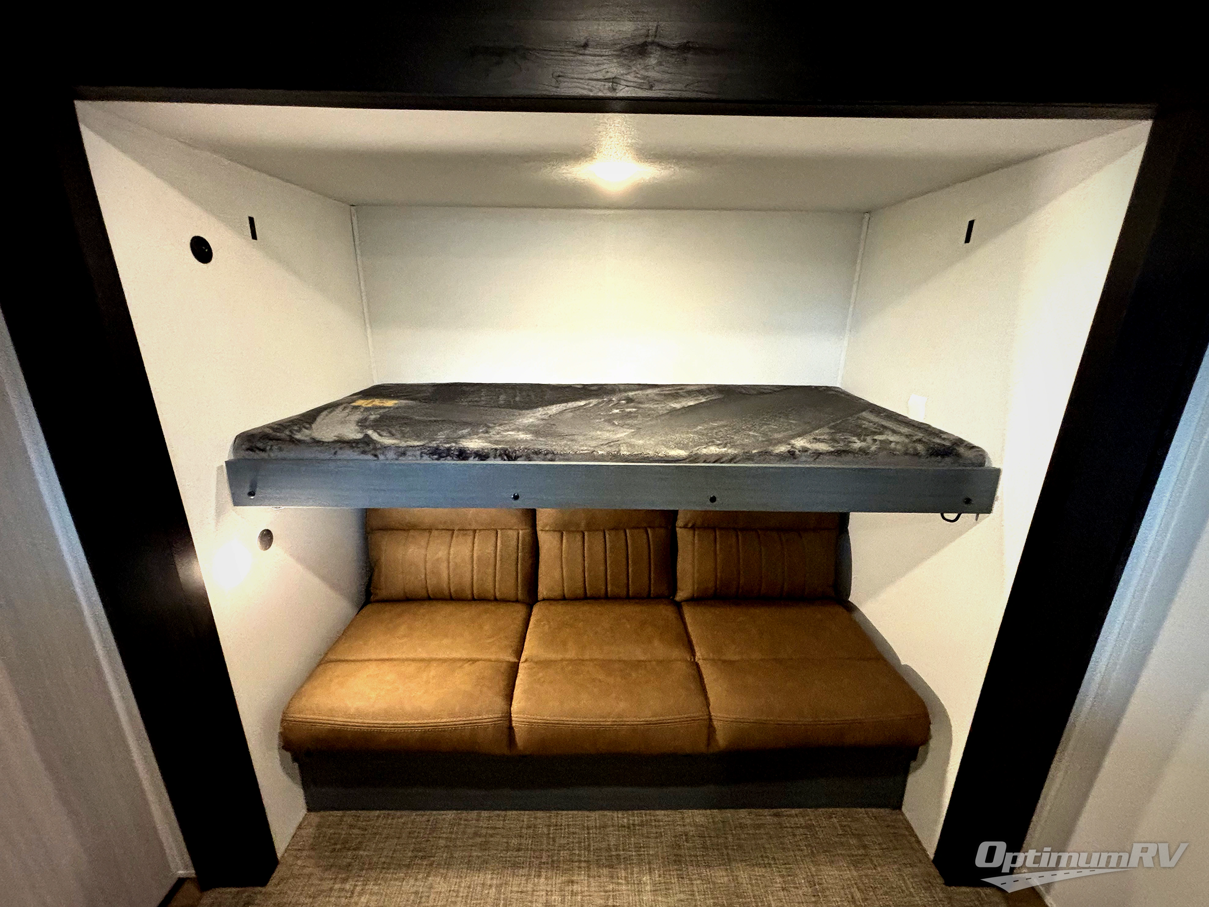 The whole family will love camping in this travel trailer! The kids will have their own privacy with the rear private bunkhouse which has a 32" x 69" bunk above a jiffy sofa slide and a 38" x 76" bunk above an entertainment center to keep them occupied on those rainy days. And you will have your own privacy with the front private bedroom that has a queen bed slide across from a dresser and a front closet. There is even a second closet with washer and dryer prep if you choose to add those appliances. Everyone can stay clean in the full bathroom with the 34" x 34" radius shower and their bellies full with the full kitchen. And you can choose between two outside kitchen options for even more convenience!