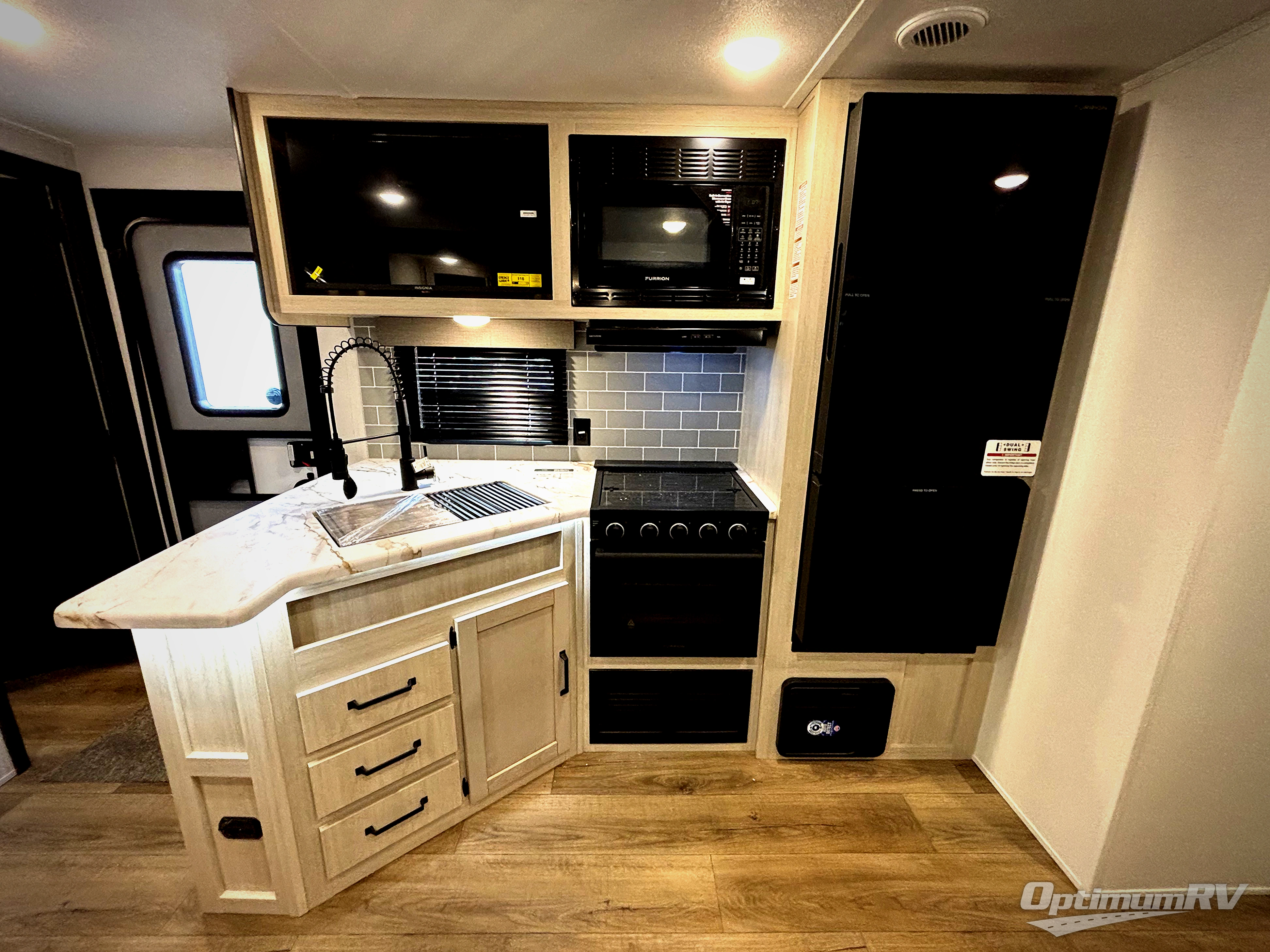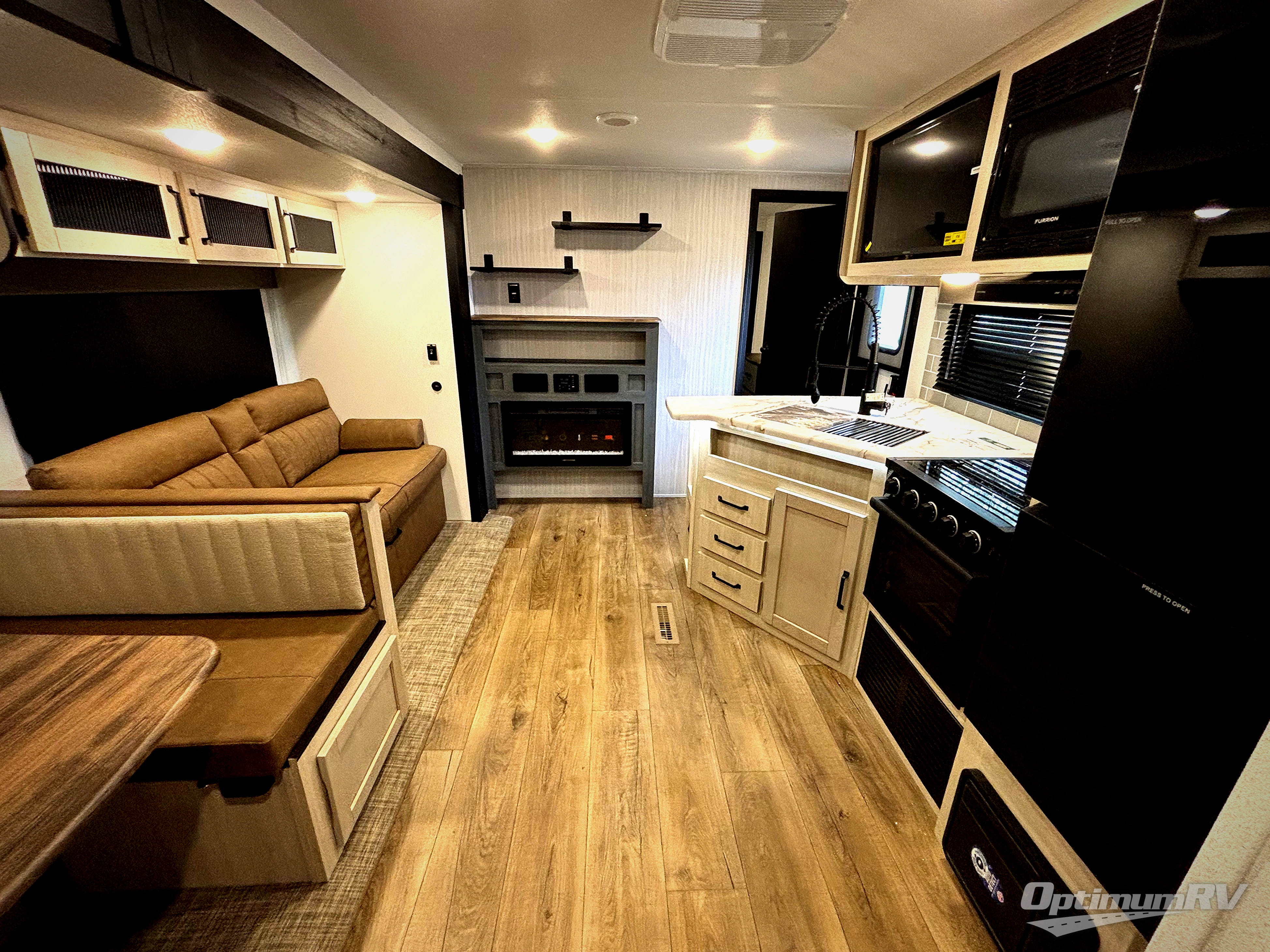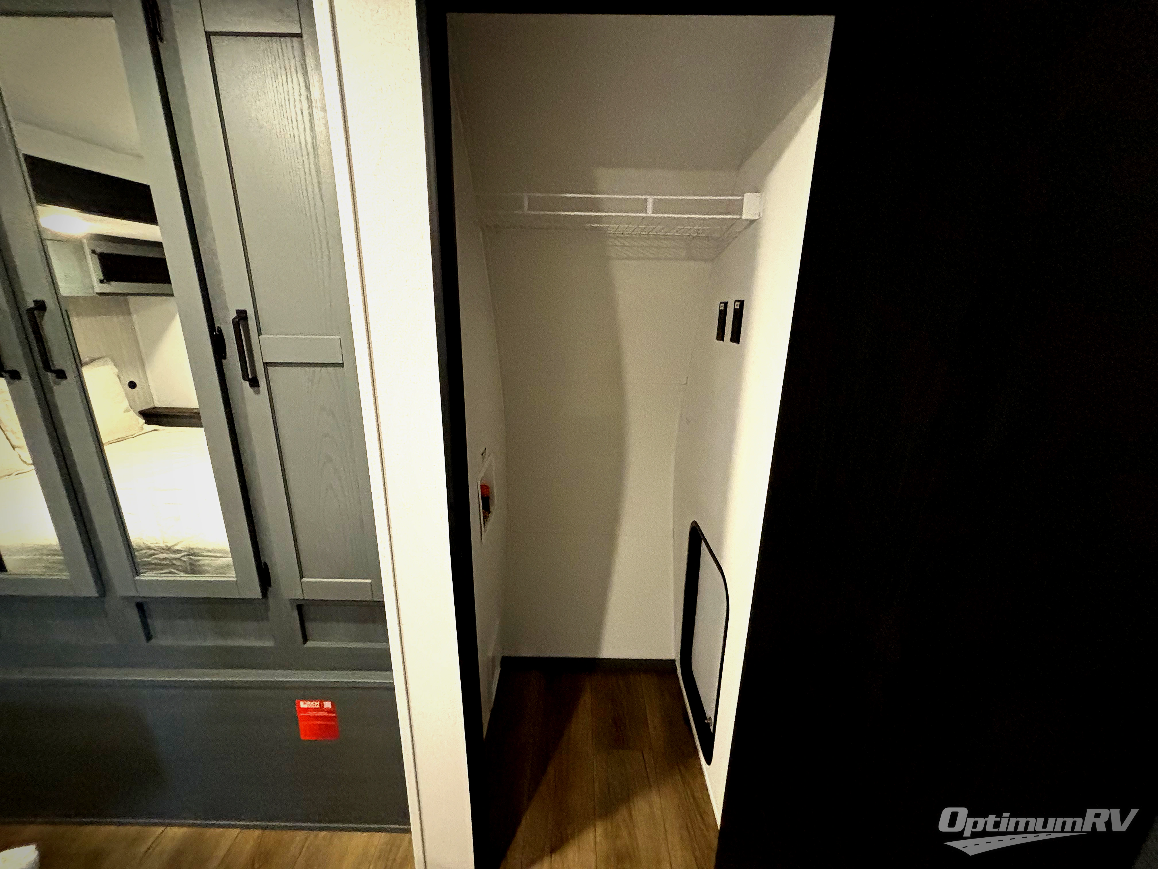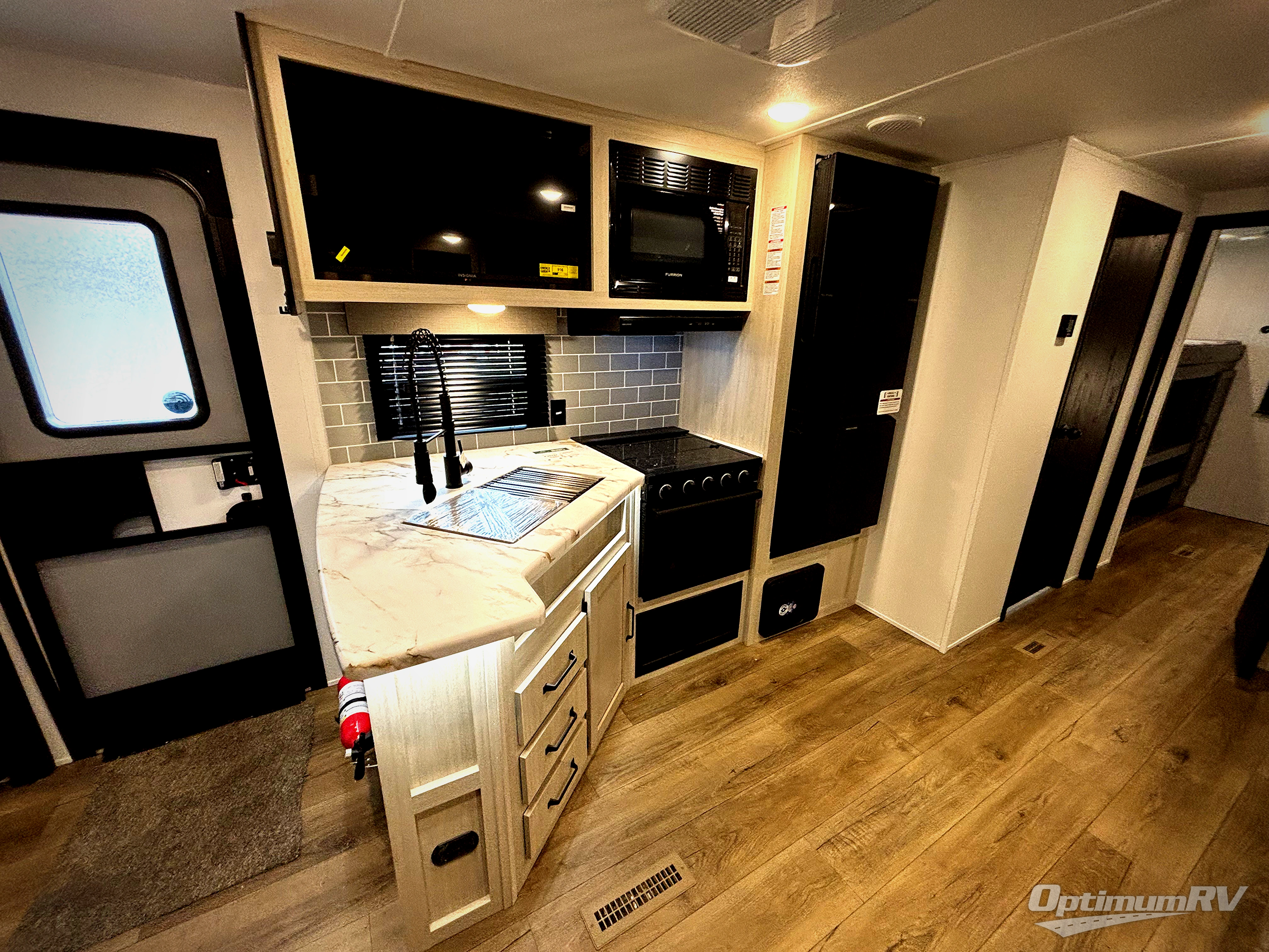 The whole family will love camping in this travel trailer! The kids will have their own privacy with the rear private bunkhouse which has a 32" x 69" bunk above a jiffy sofa slide and a 38" x 76" bunk above an entertainment center to keep them occupied on those rainy days. And you will have your own privacy with the front private bedroom that has a queen bed slide across from a dresser and a front closet. There is even a second closet with washer and dryer prep if you choose to add those appliances. Everyone can stay clean in the full bathroom with the 34" x 34" radius shower and their bellies full with the full kitchen. And you can choose between two outside kitchen options for even more convenience!