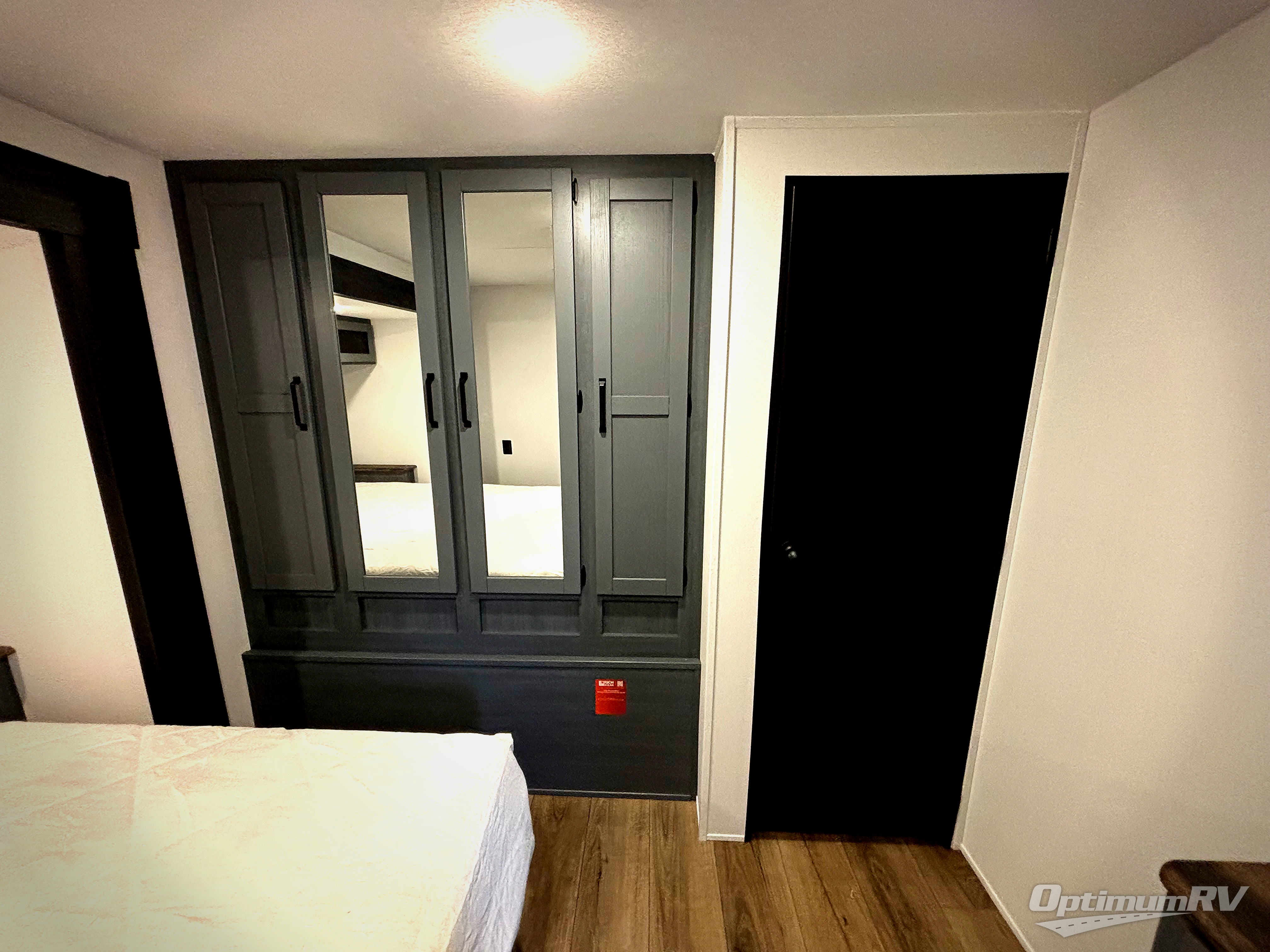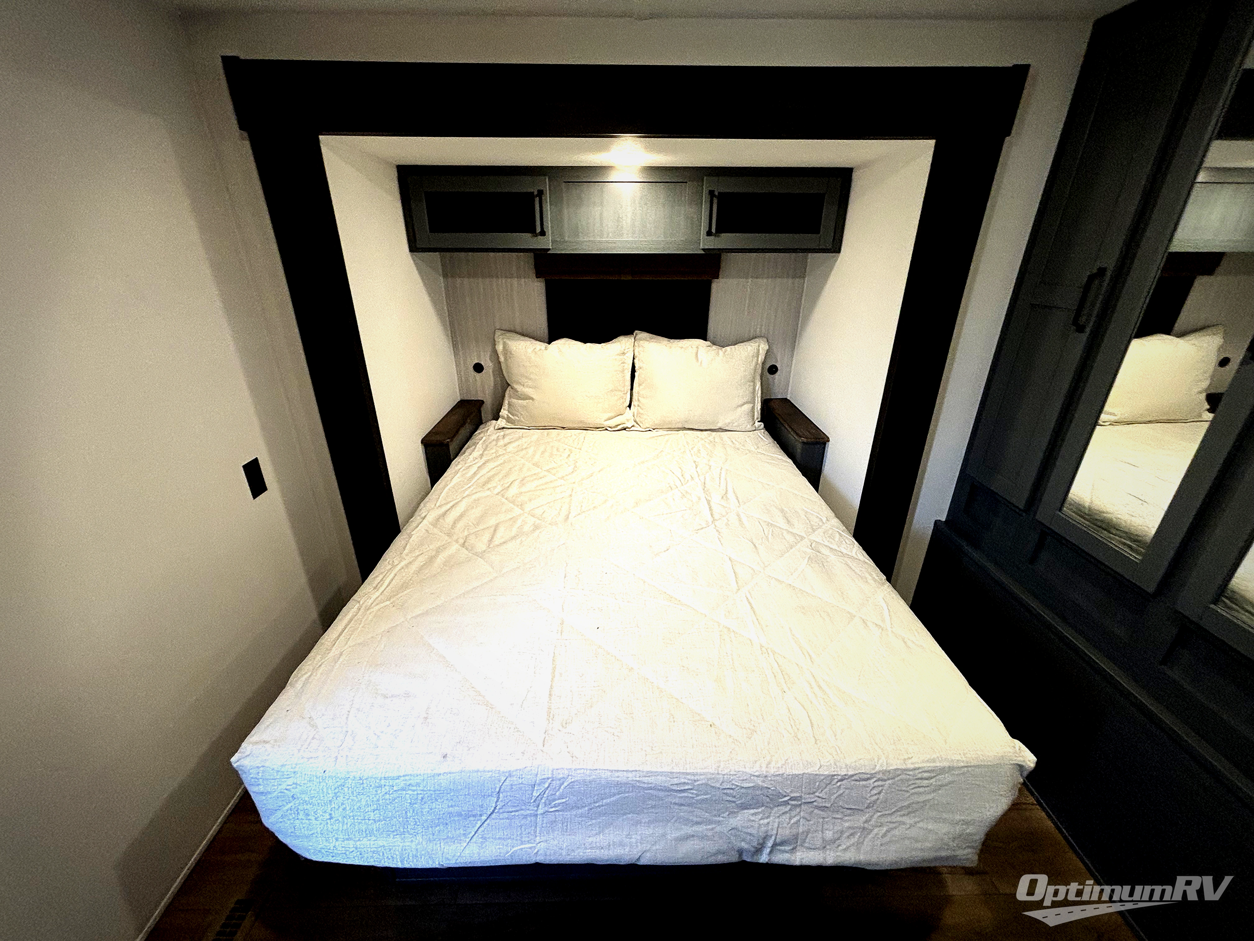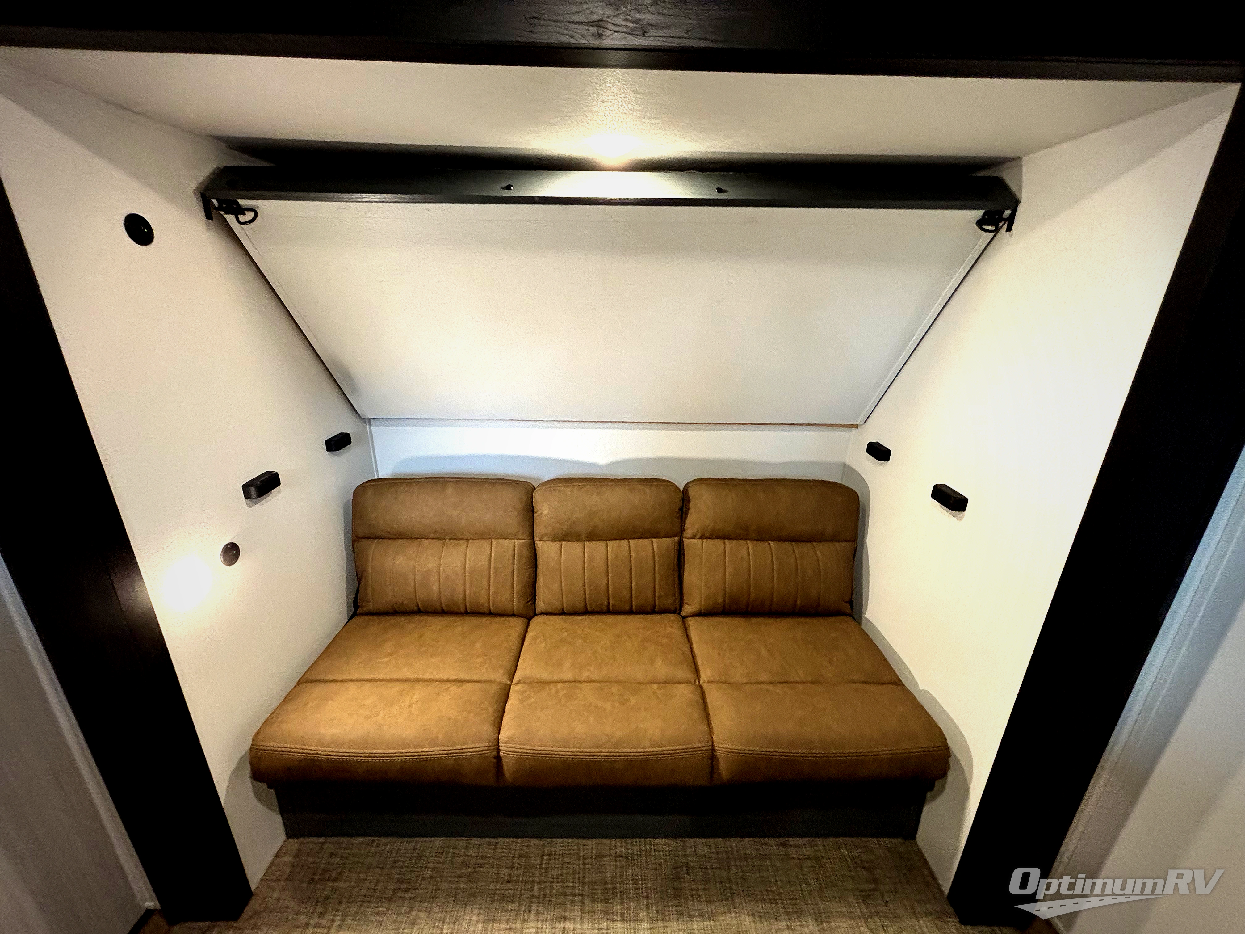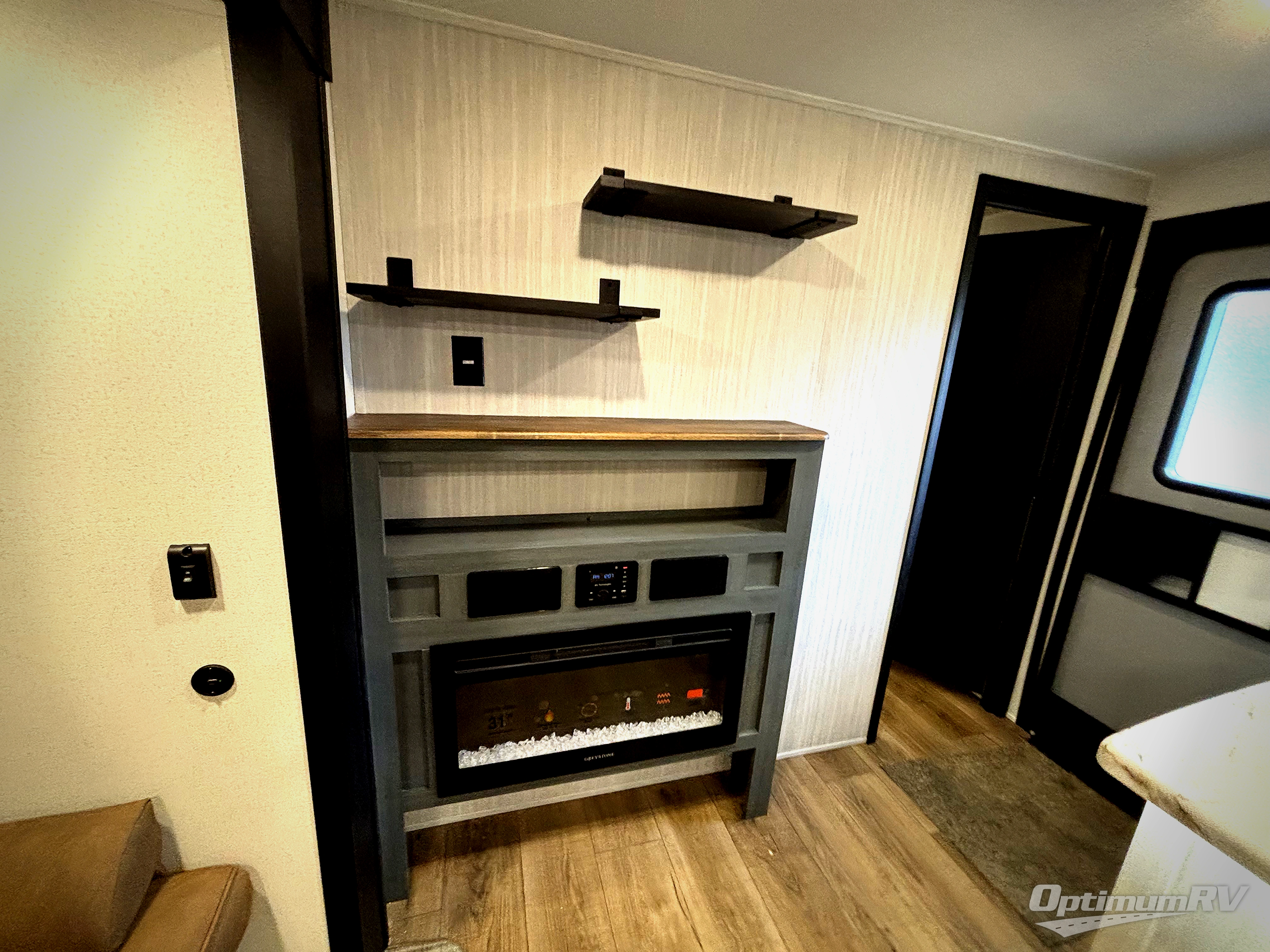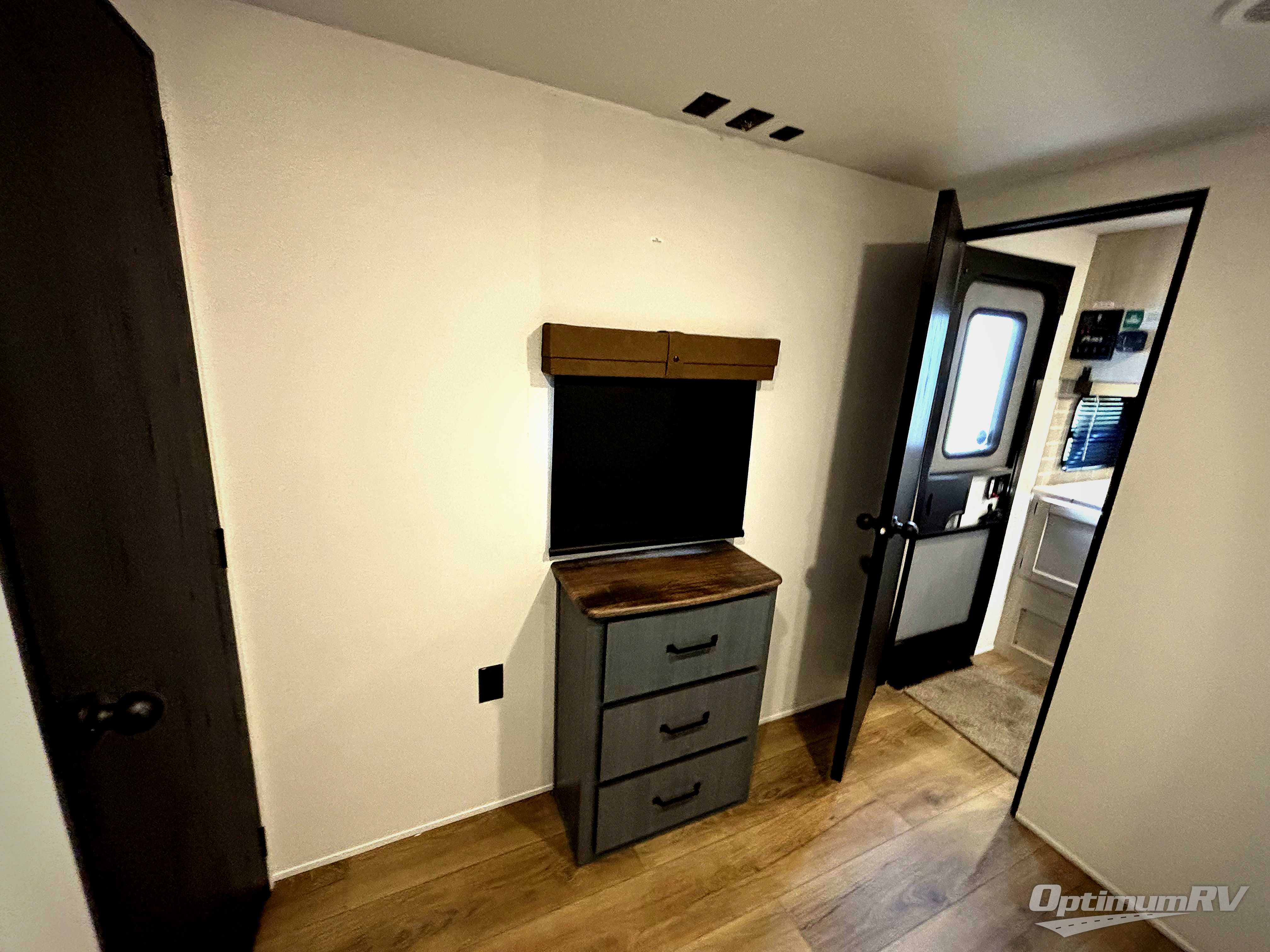 The whole family will love camping in this travel trailer! The kids will have their own privacy with the rear private bunkhouse which has a 32" x 69" bunk above a jiffy sofa slide and a 38" x 76" bunk above an entertainment center to keep them occupied on those rainy days. And you will have your own privacy with the front private bedroom that has a queen bed slide across from a dresser and a front closet. There is even a second closet with washer and dryer prep if you choose to add those appliances. Everyone can stay clean in the full bathroom with the 34" x 34" radius shower and their bellies full with the full kitchen. And you can choose between two outside kitchen options for even more convenience!