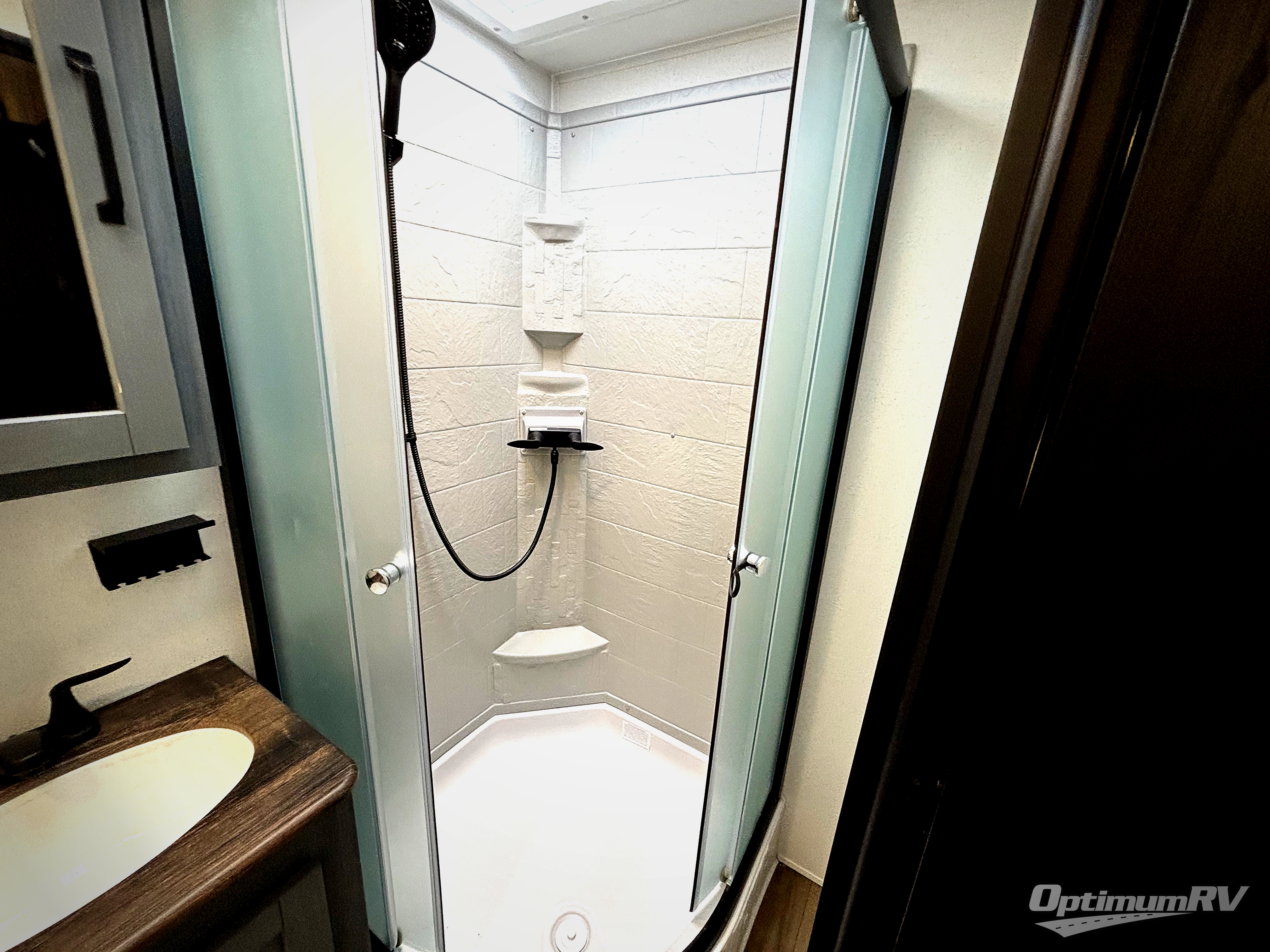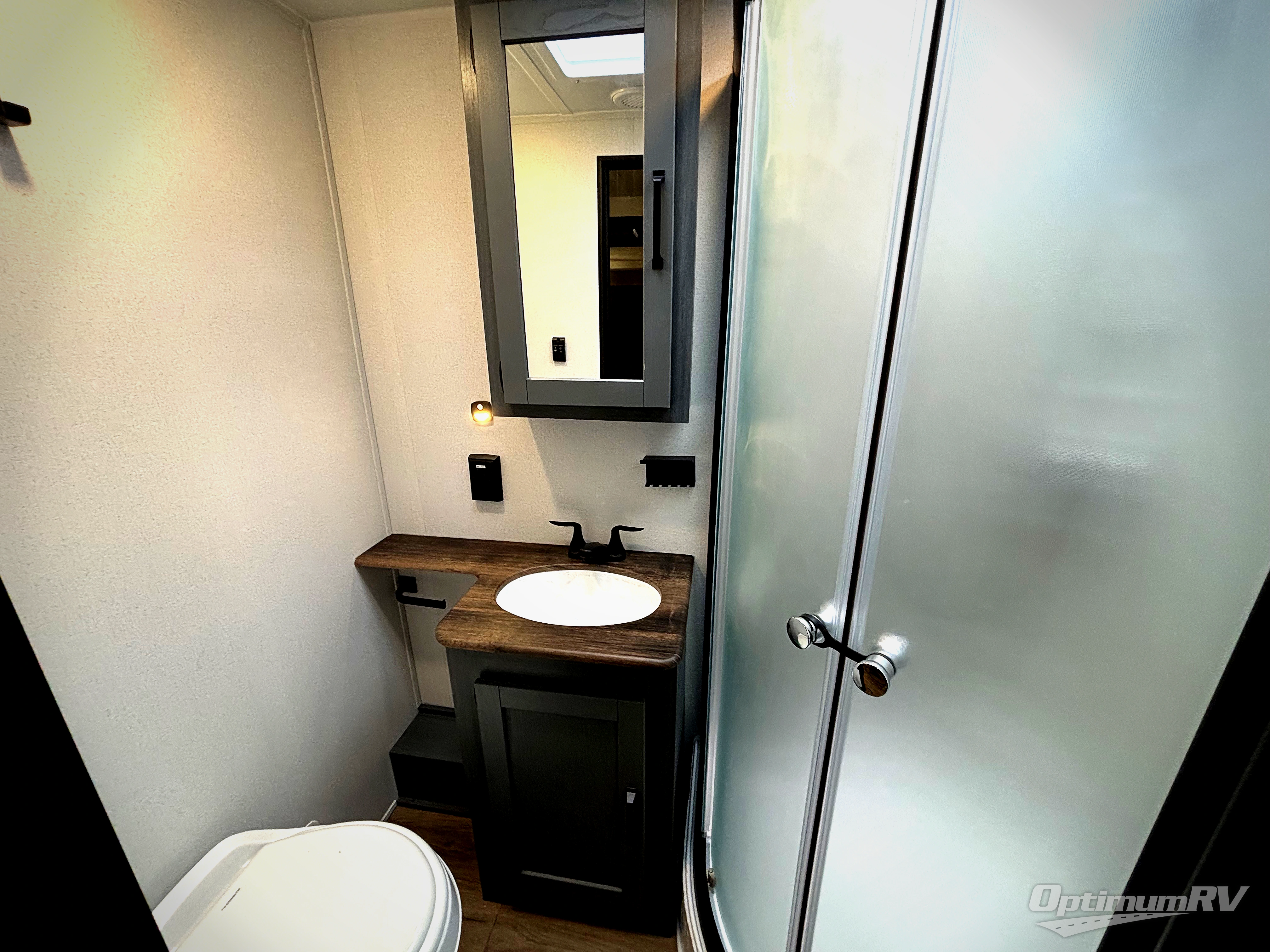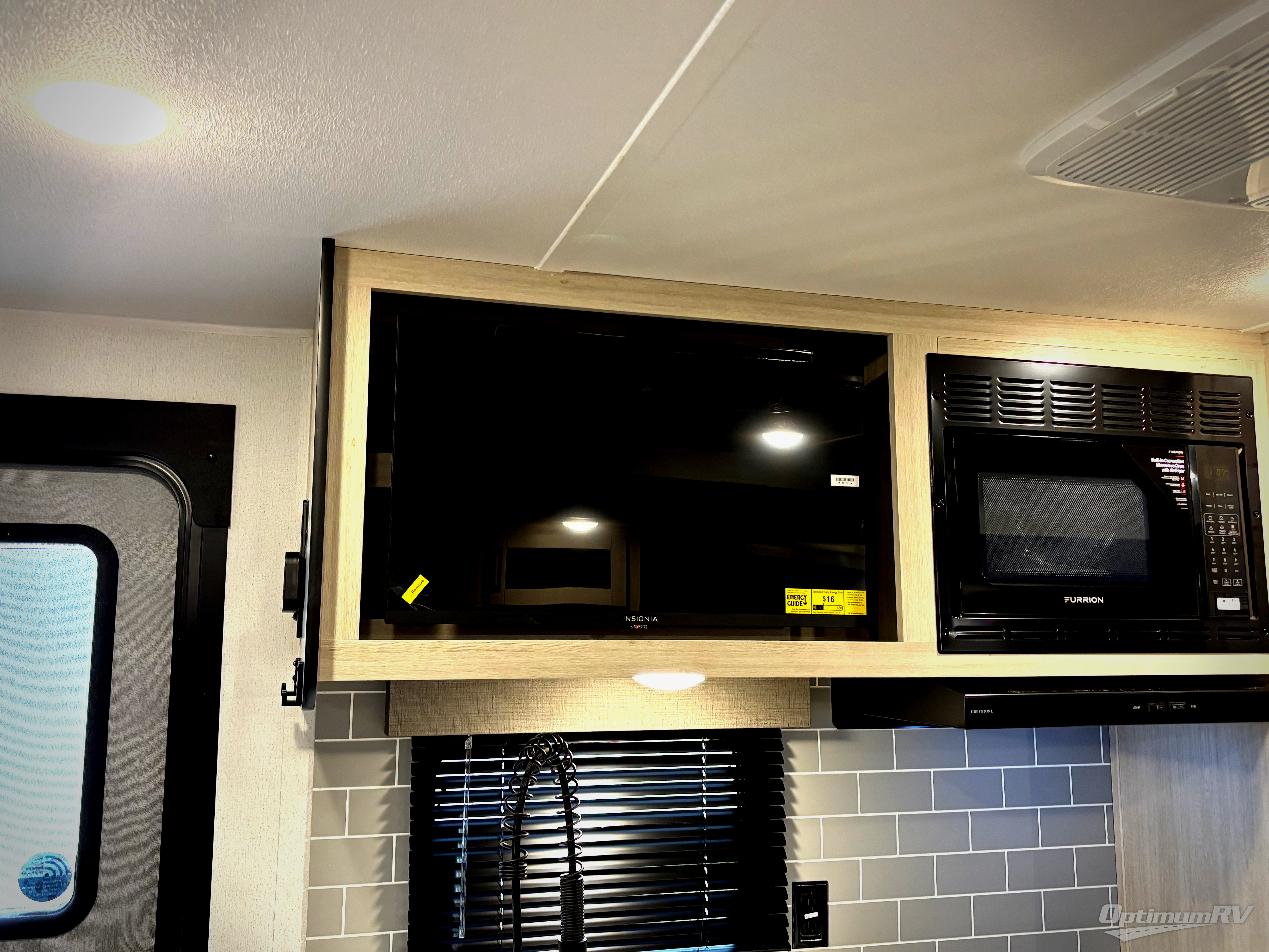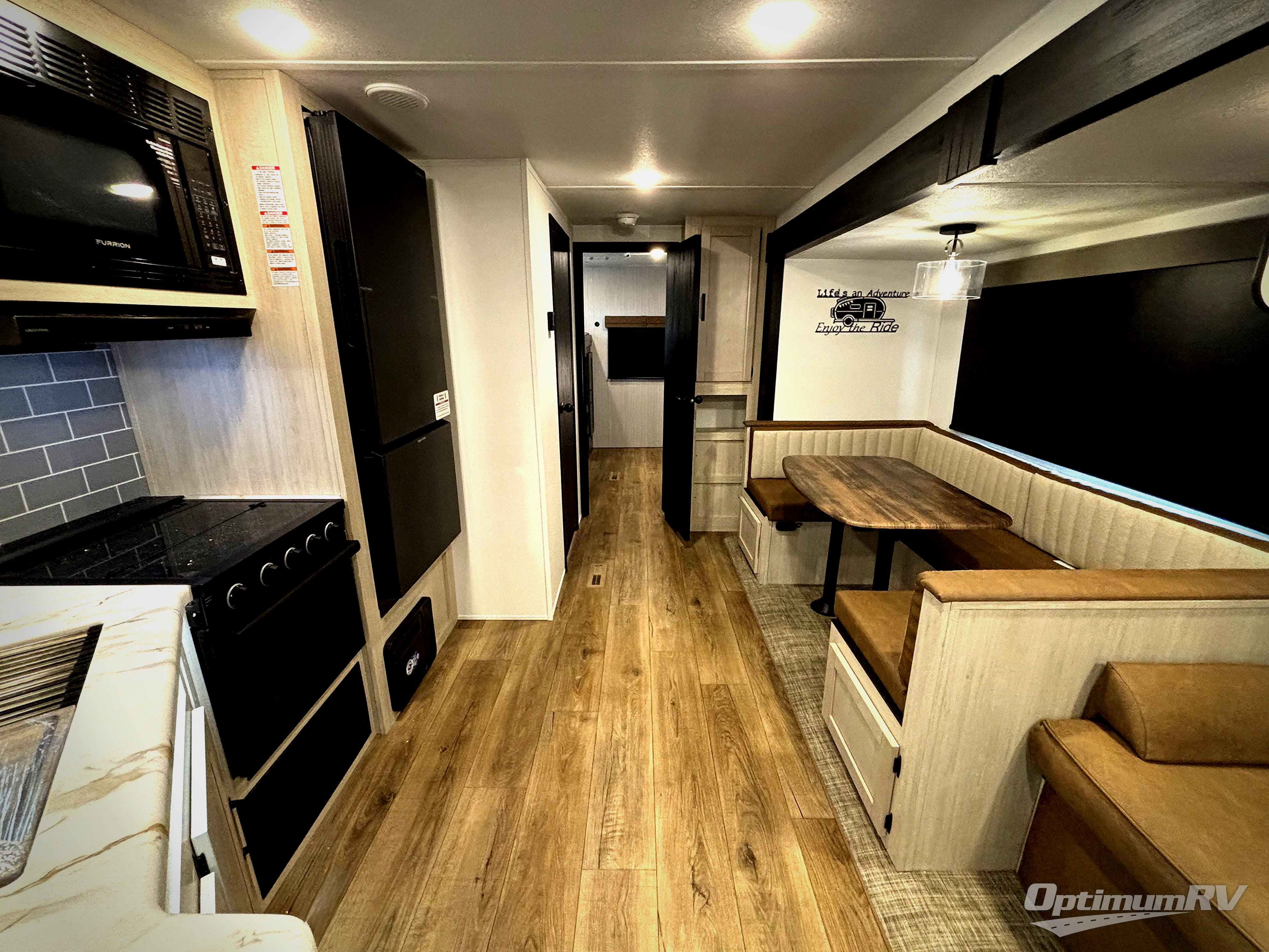 The whole family will love camping in this travel trailer! The kids will have their own privacy with the rear private bunkhouse which has a 32" x 69" bunk above a jiffy sofa slide and a 38" x 76" bunk above an entertainment center to keep them occupied on those rainy days. And you will have your own privacy with the front private bedroom that has a queen bed slide across from a dresser and a front closet. There is even a second closet with washer and dryer prep if you choose to add those appliances. Everyone can stay clean in the full bathroom with the 34" x 34" radius shower and their bellies full with the full kitchen. And you can choose between two outside kitchen options for even more convenience!