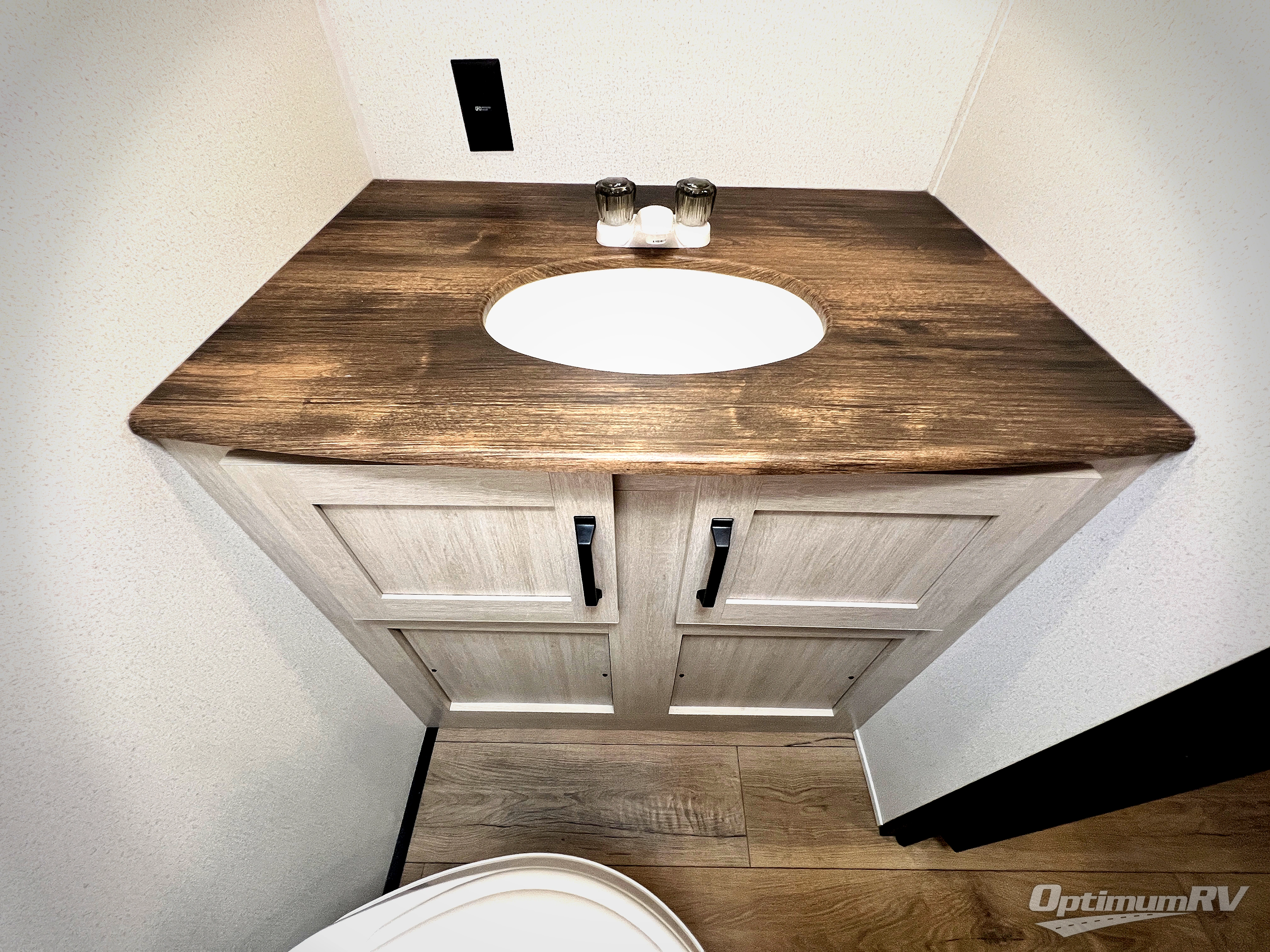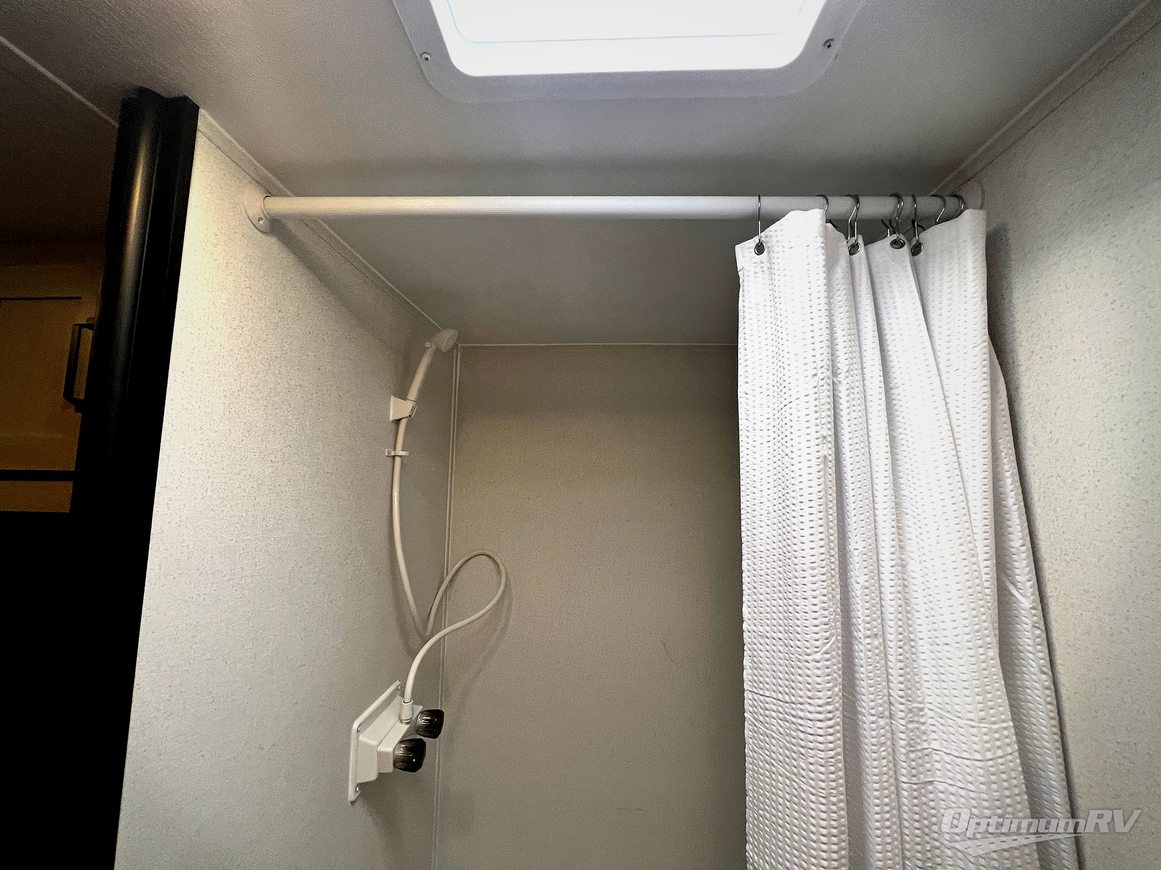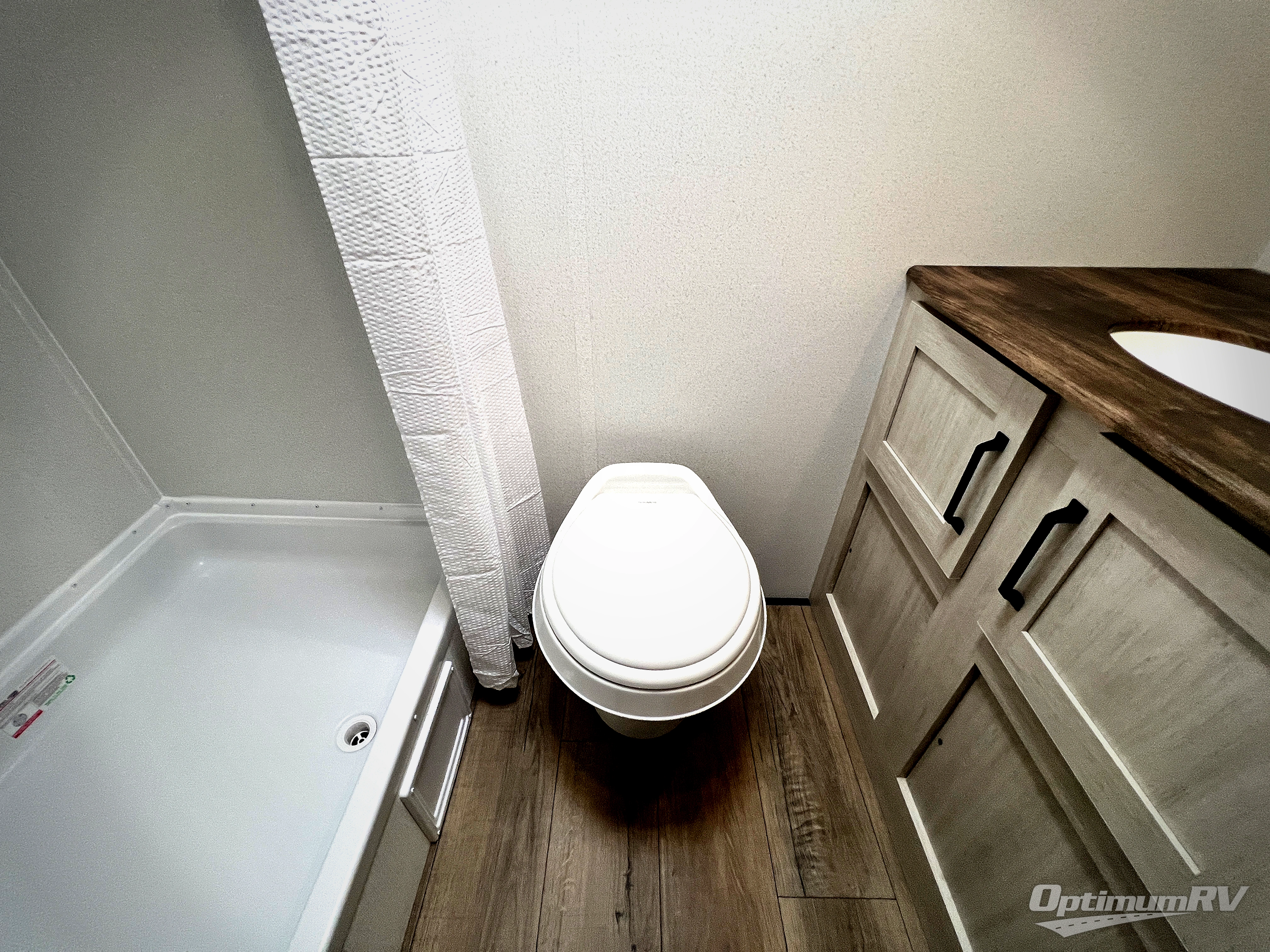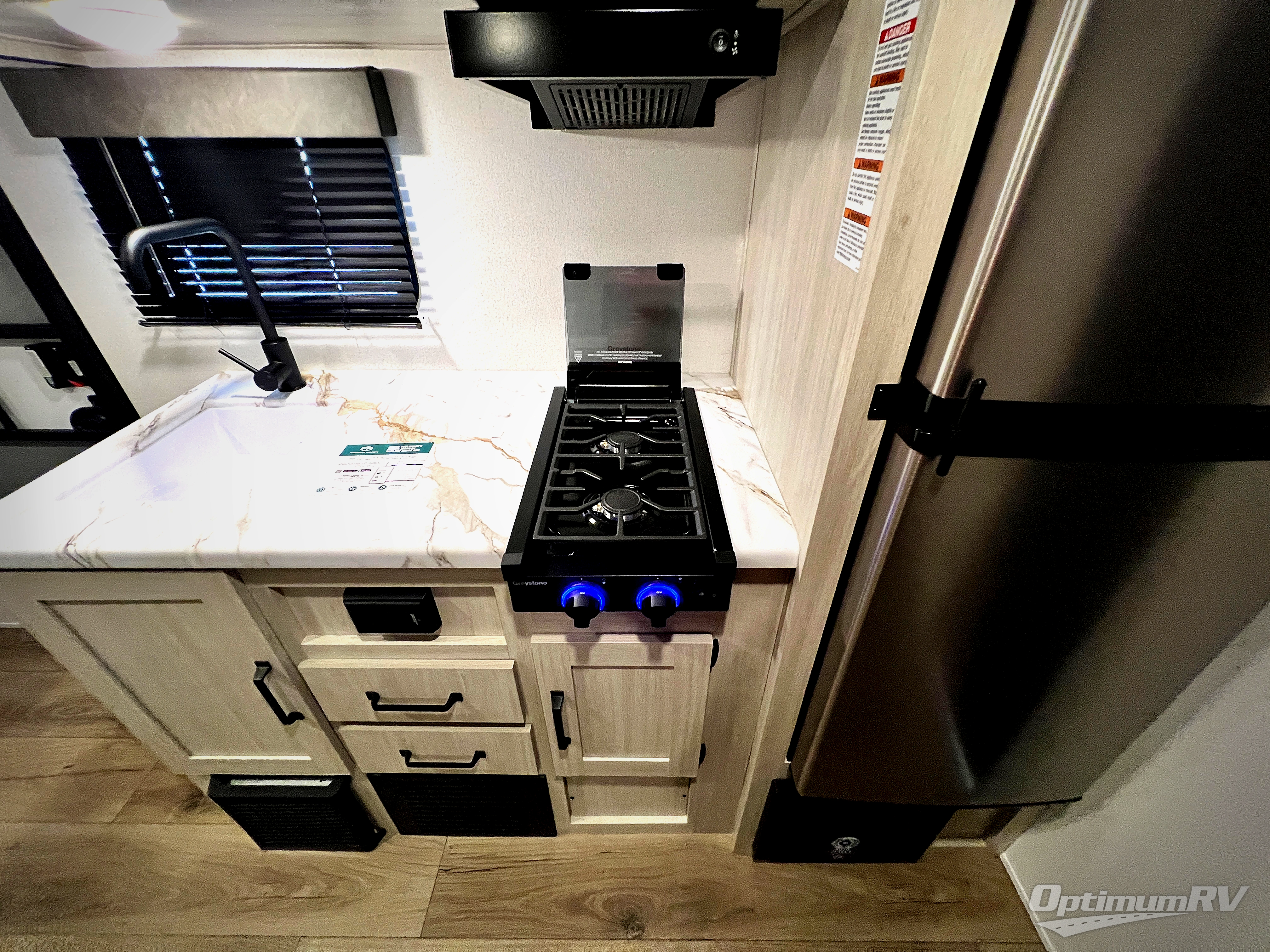 This travel trailer includes everything you need for camping trips at the lake. You'll sleep great each night on the front RV queen bed, or you can choose the optional Murphy bed with a sofa if you need more seating space during the day. The chef of your group can make meals on the two burner cooktop or in the microwave oven, then you can dine around the U-shaped dinette slide. A full rear bath includes a 36" x 30" shower, a toilet, vanity, plus a medicine cabinet to keep your things organized.