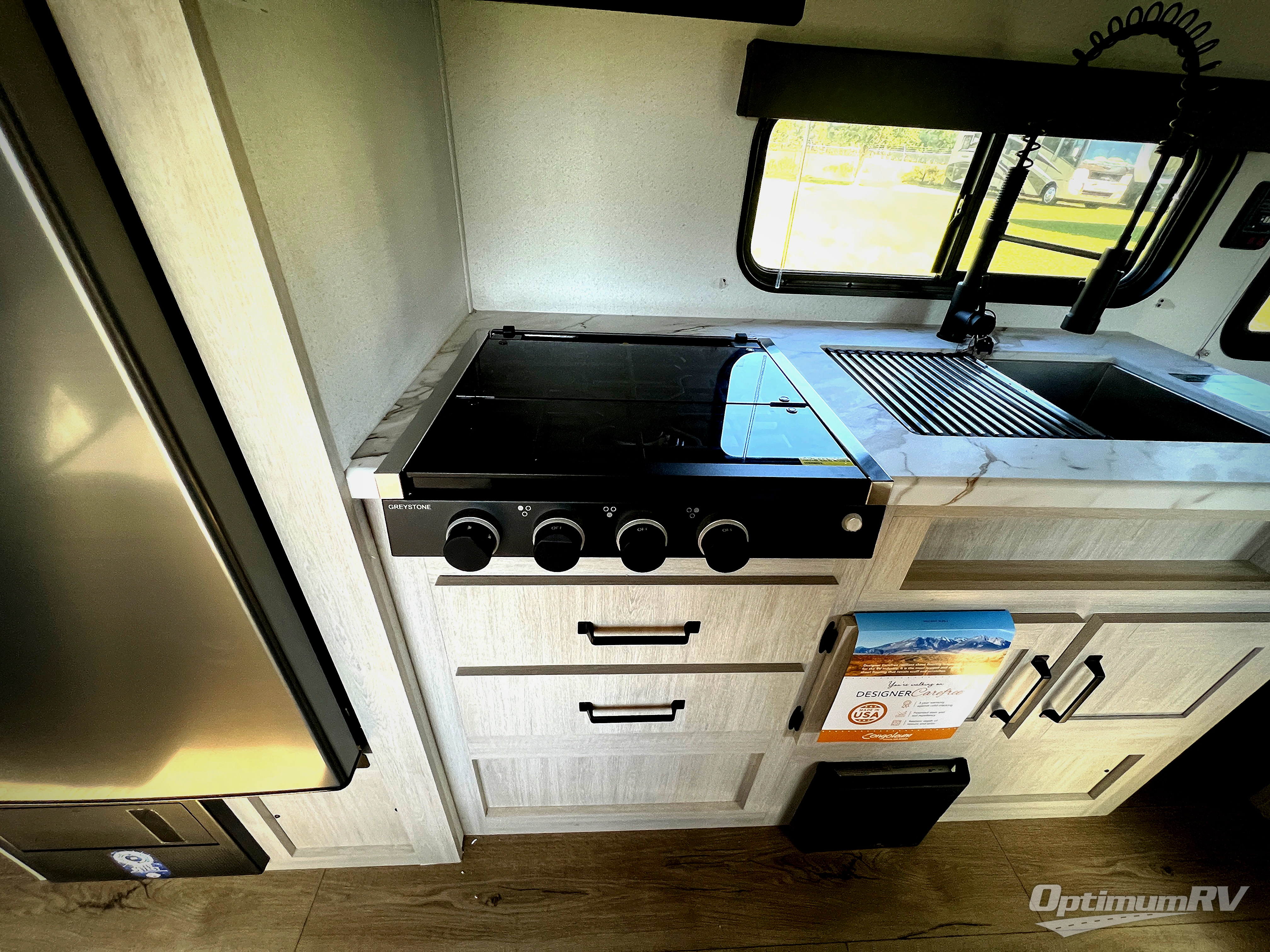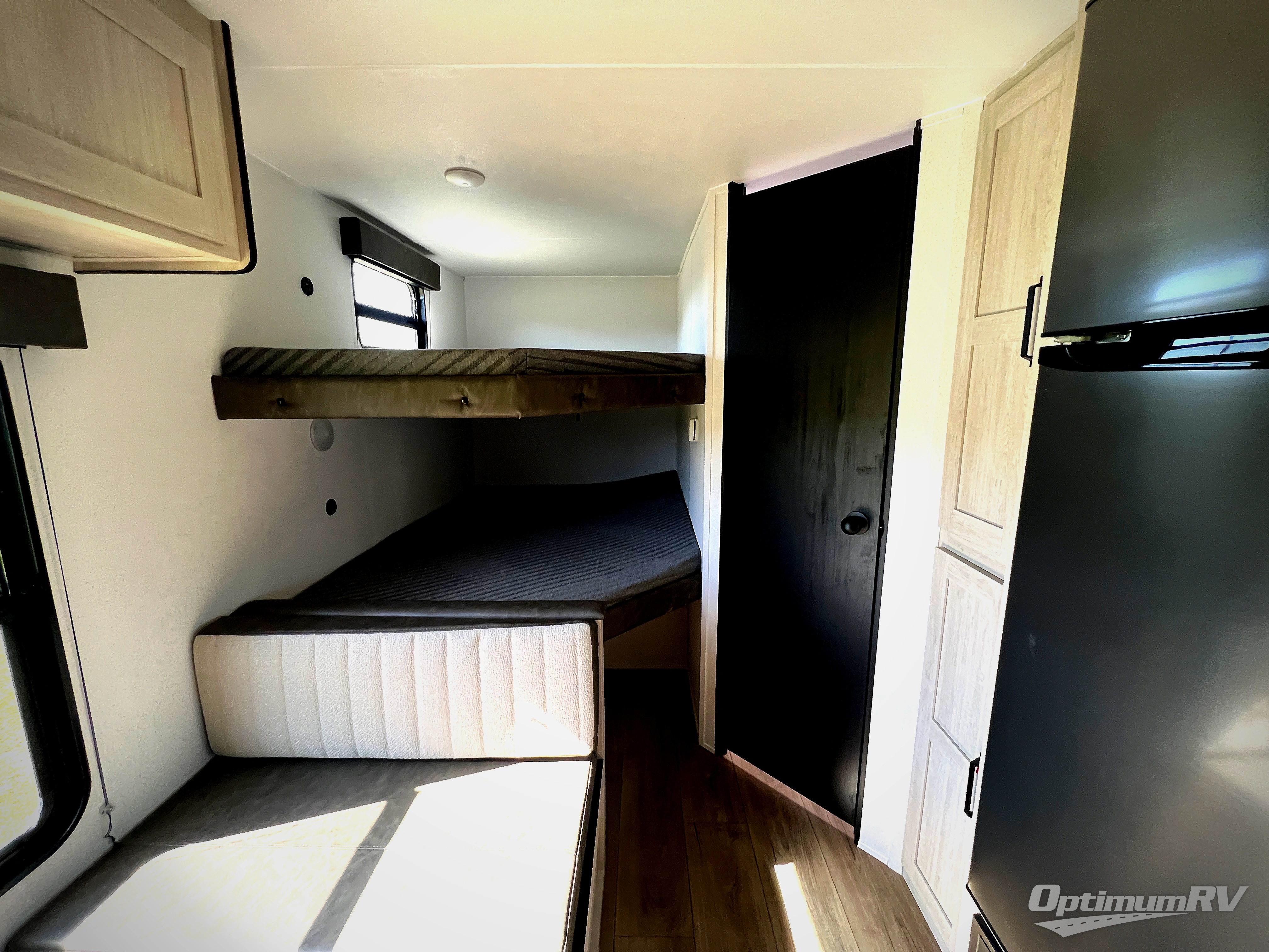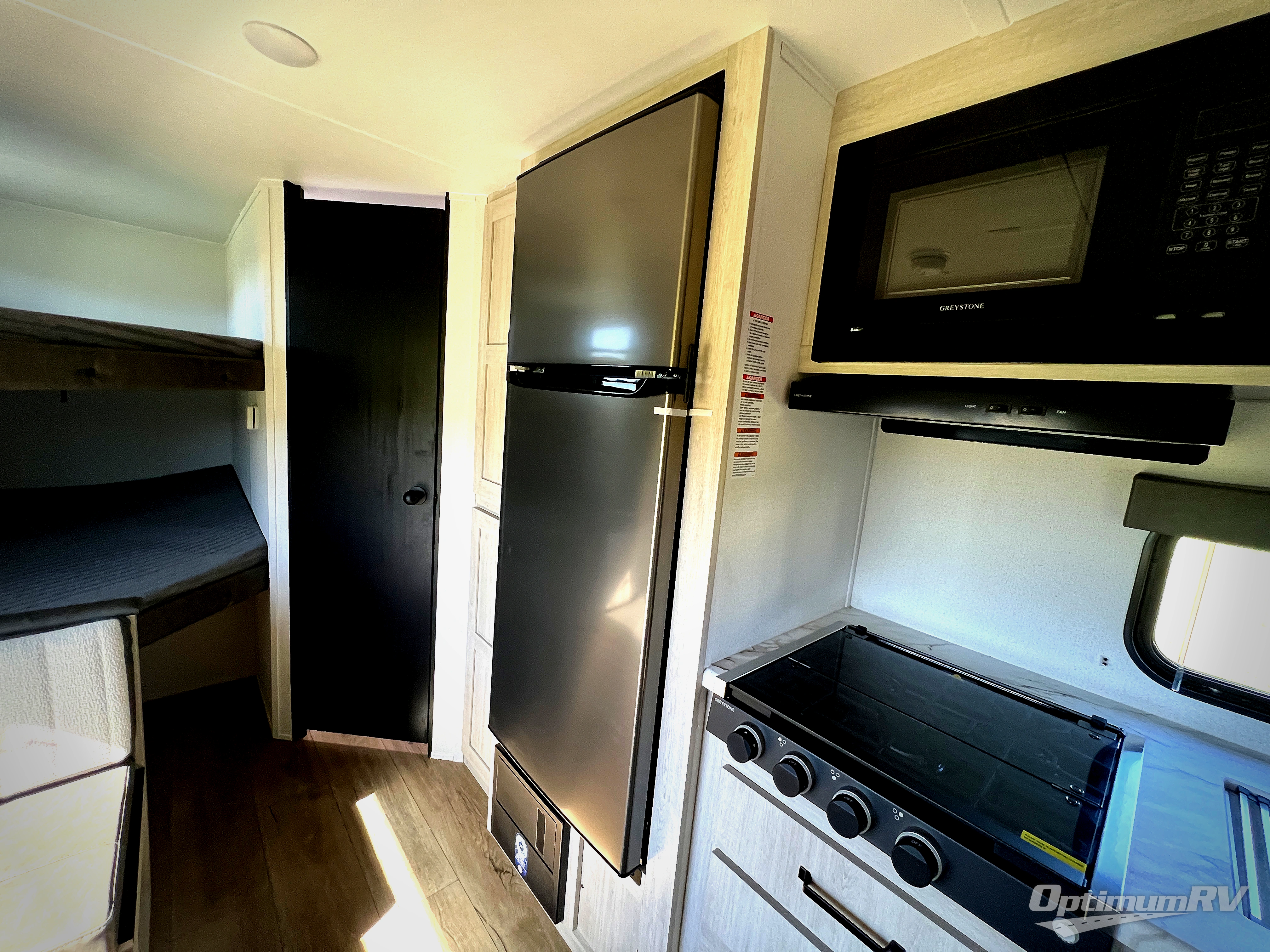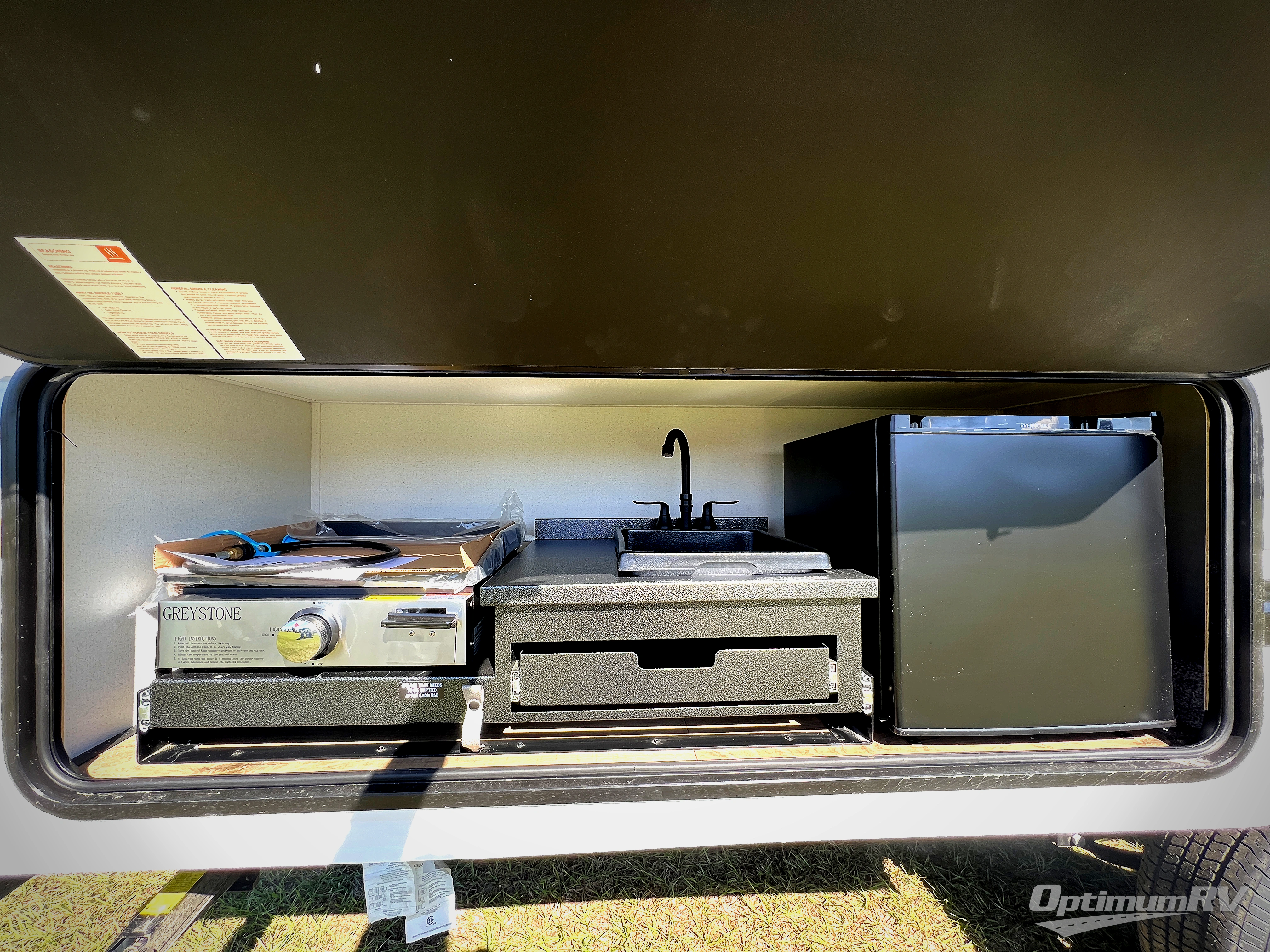 If you're looking for more sleeping space, this double axle unit features double-size bunks with storage under the bunks for your bags. The full kitchen includes a stainless microwave and three burner cooktop to make meals, plus a pantry and 12V refrigerator for food storage. And an optional outside mini kitchen with a griddle can be added if you enjoy cooking outdoors! Up front, you'll find a 60" x 74" queen bed with an optional Murphy bed if you're needing more seating space during the day!