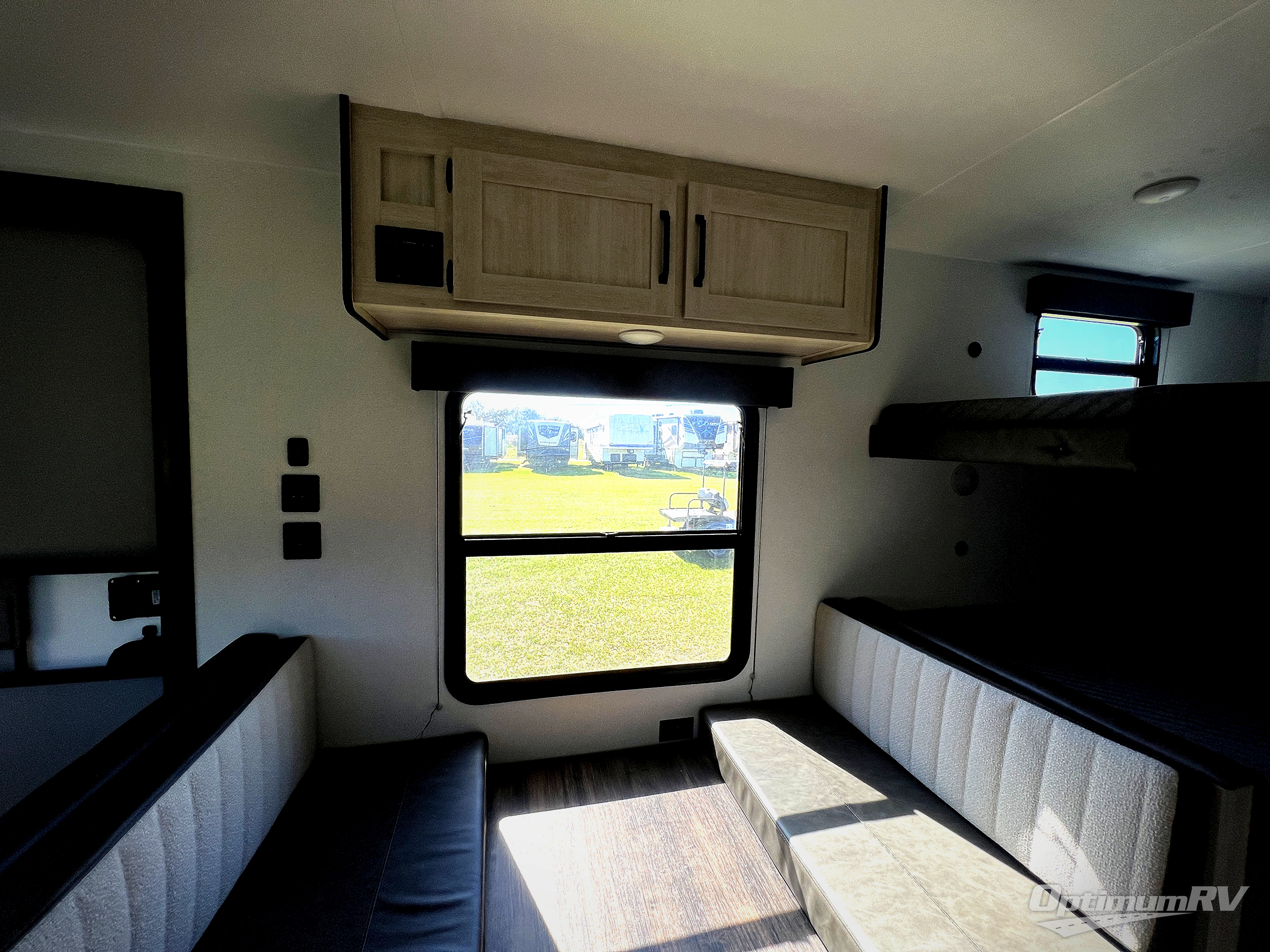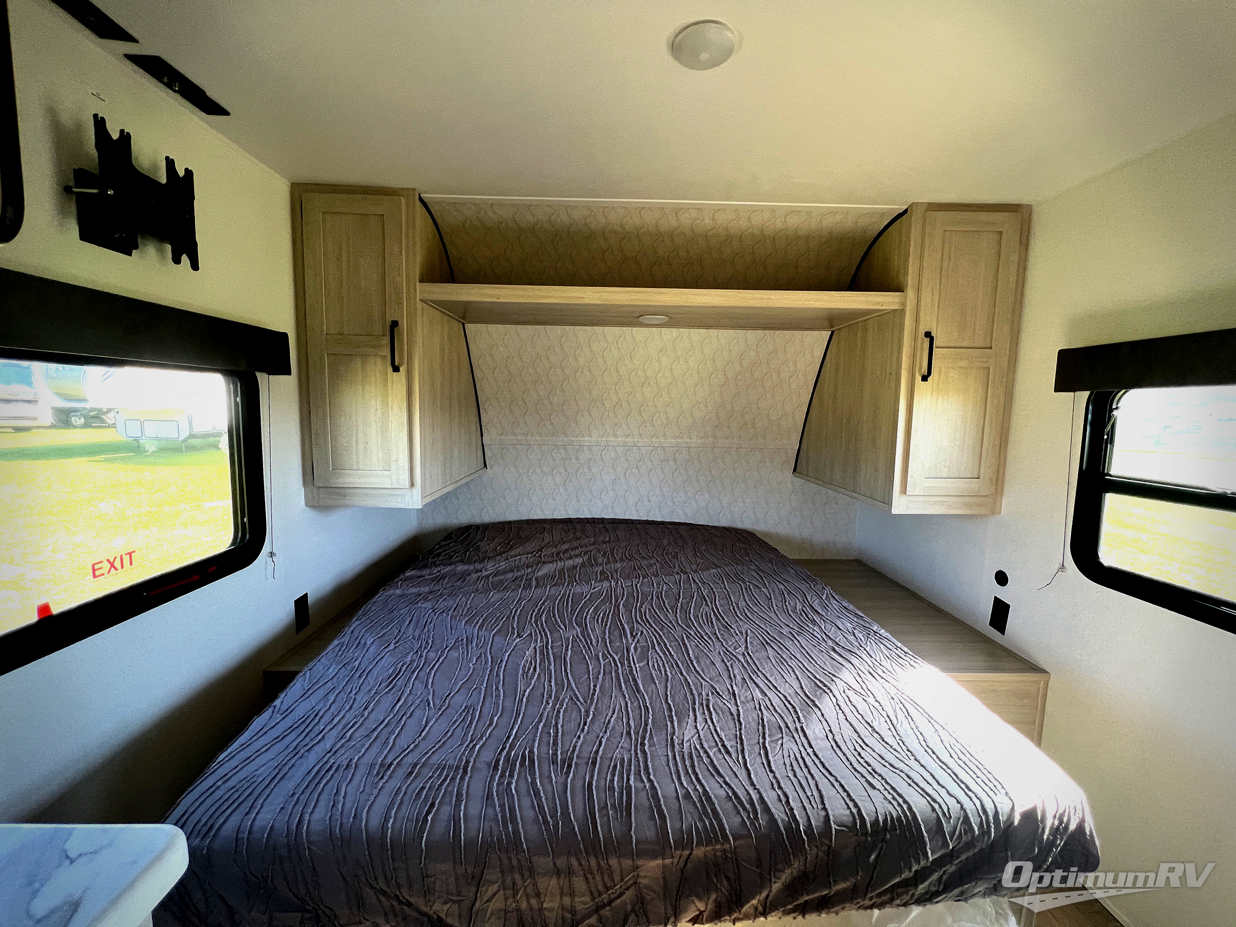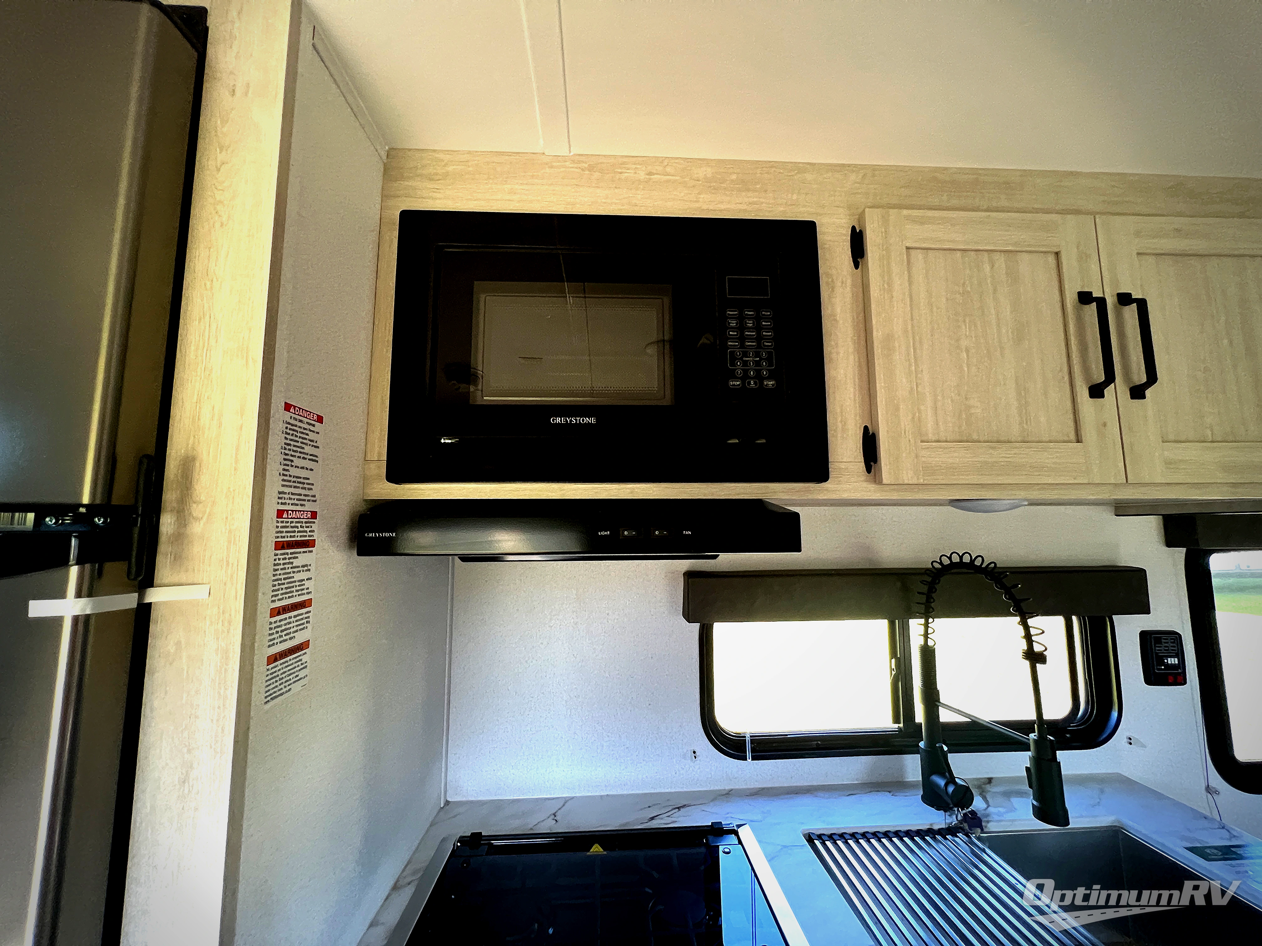 If you're looking for more sleeping space, this double axle unit features double-size bunks with storage under the bunks for your bags. The full kitchen includes a stainless microwave and three burner cooktop to make meals, plus a pantry and 12V refrigerator for food storage. And an optional outside mini kitchen with a griddle can be added if you enjoy cooking outdoors! Up front, you'll find a 60" x 74" queen bed with an optional Murphy bed if you're needing more seating space during the day!