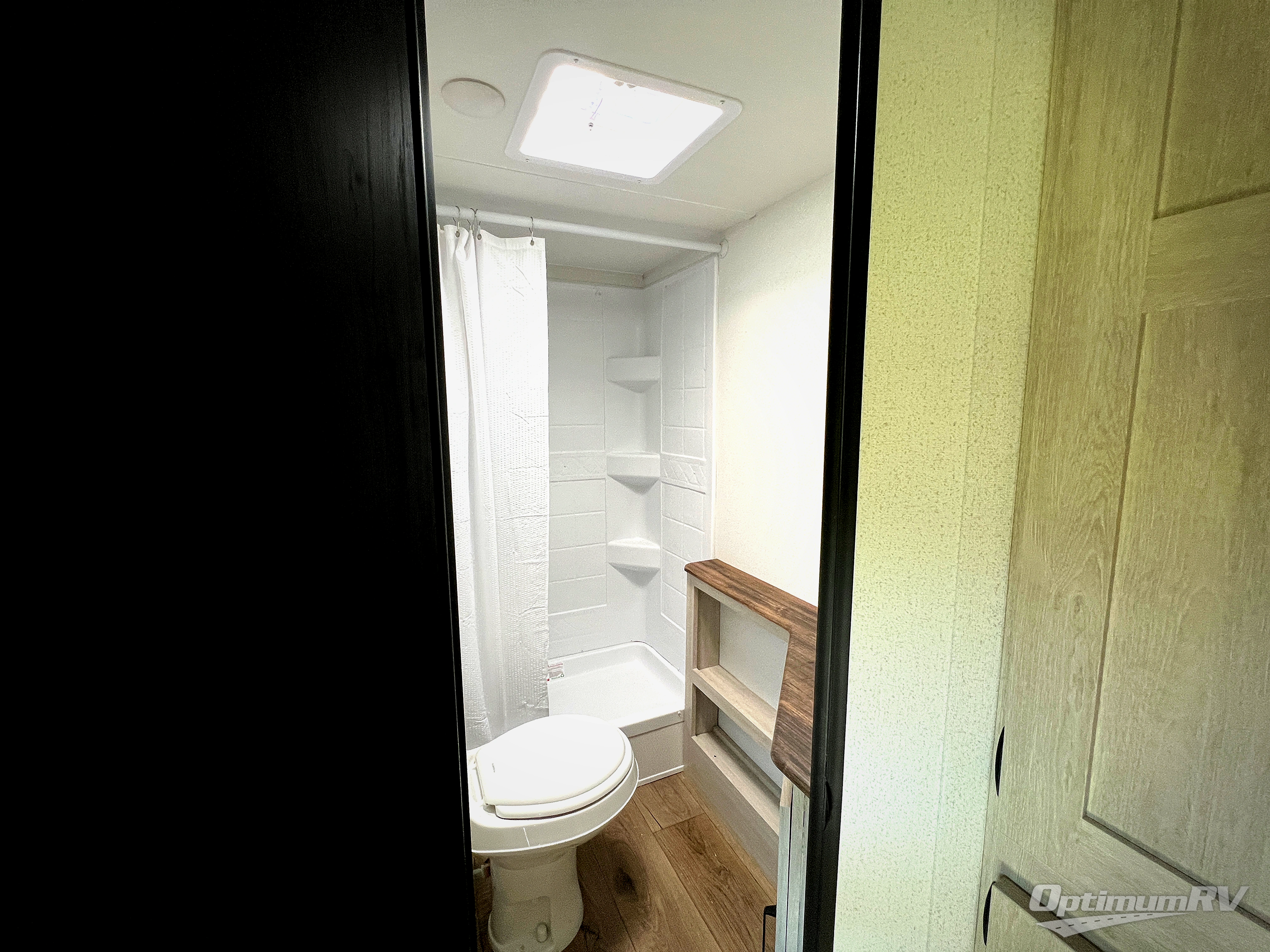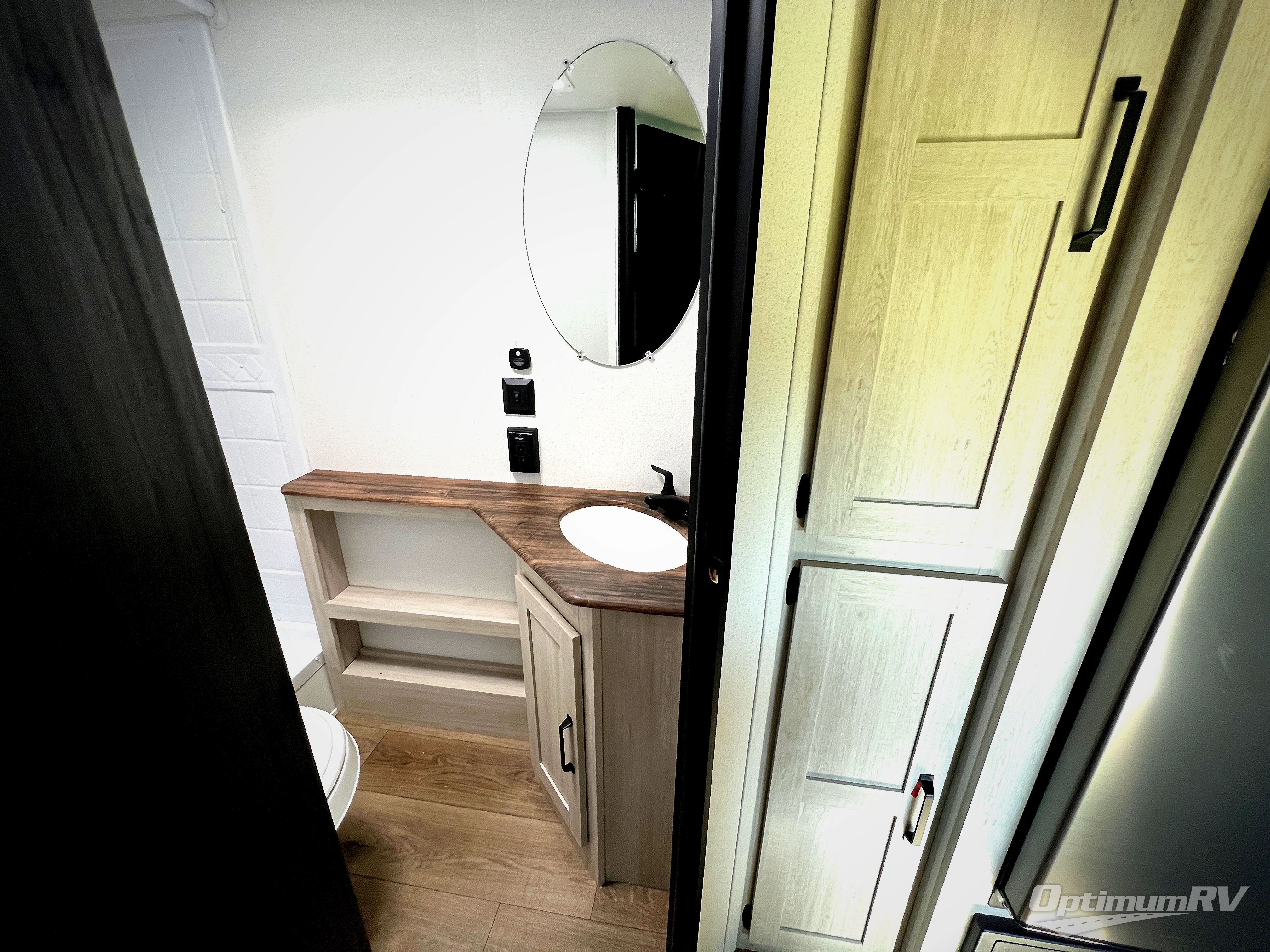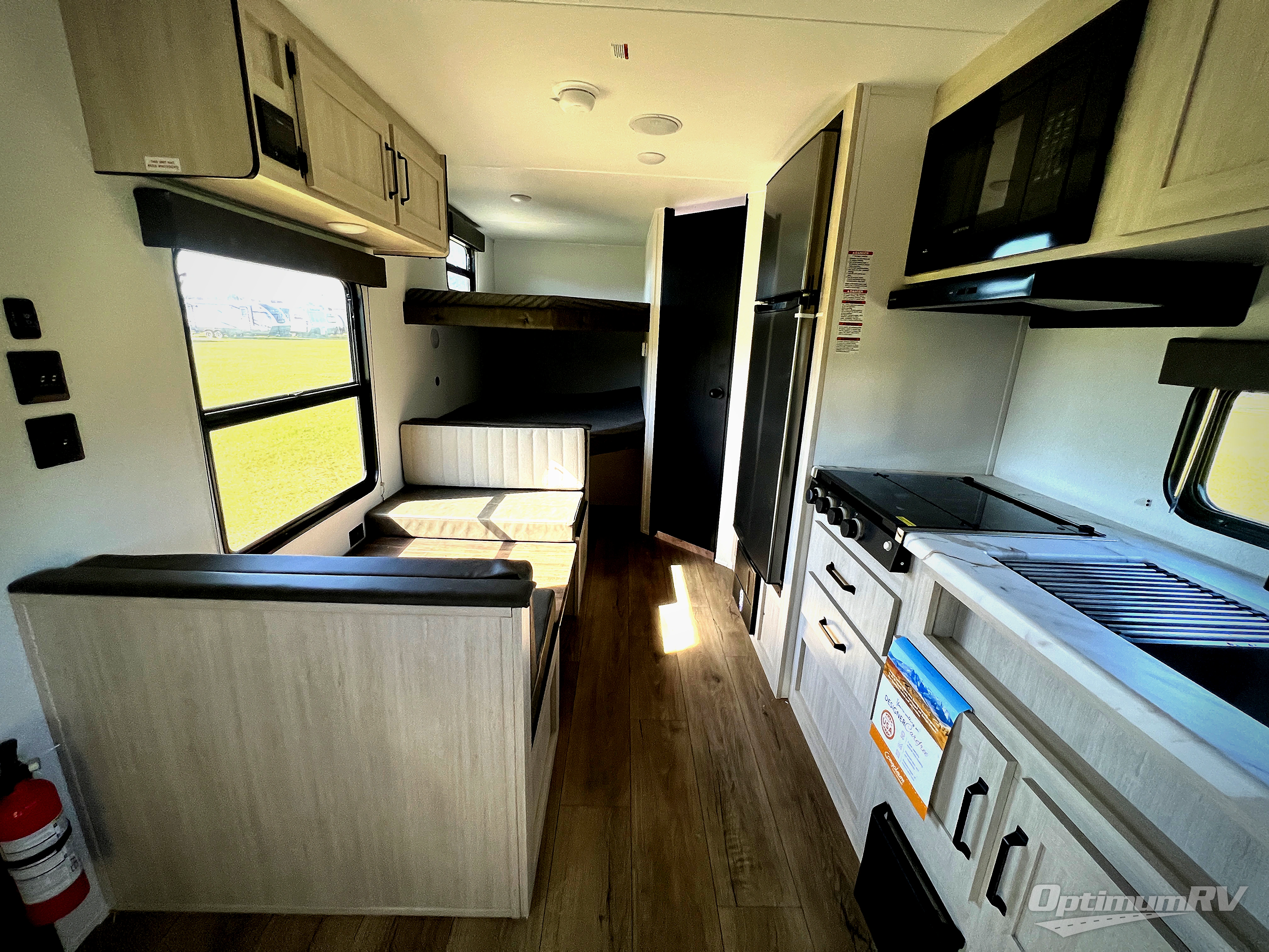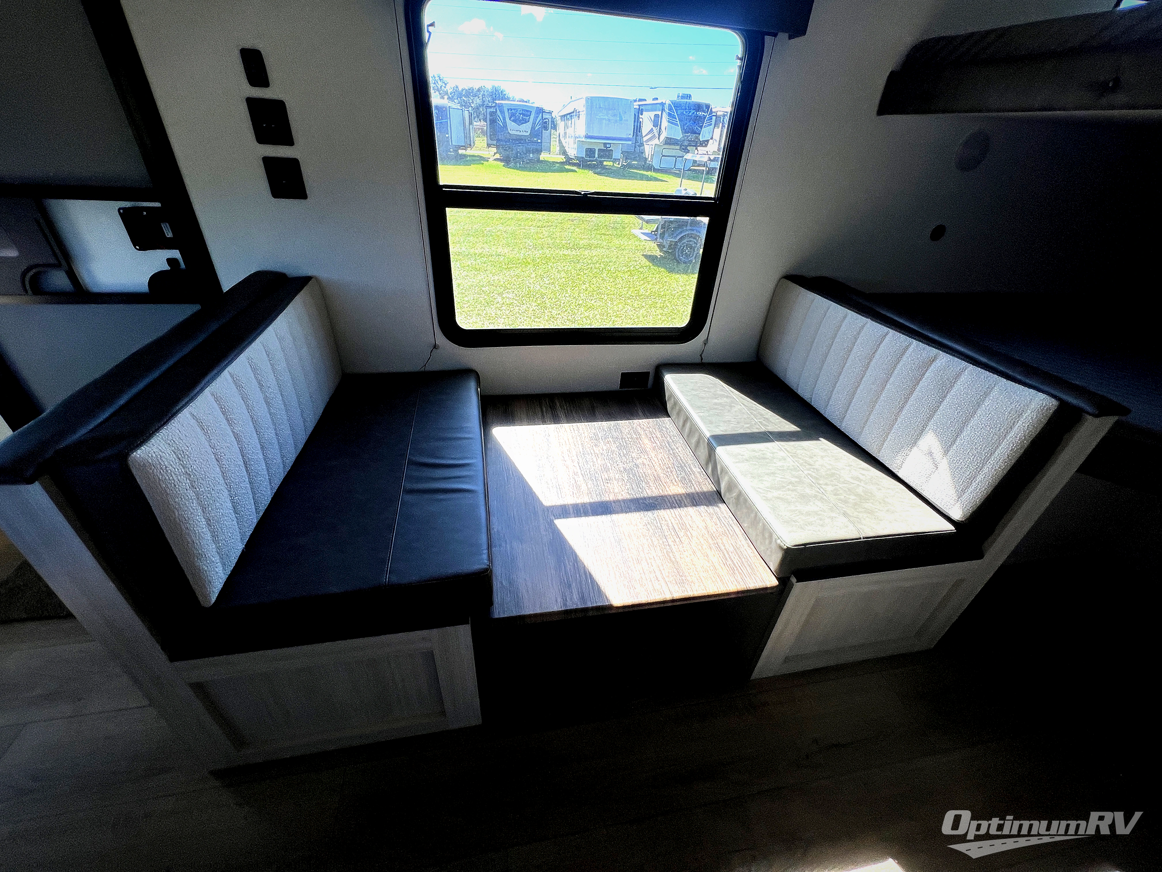 If you're looking for more sleeping space, this double axle unit features double-size bunks with storage under the bunks for your bags. The full kitchen includes a stainless microwave and three burner cooktop to make meals, plus a pantry and 12V refrigerator for food storage. And an optional outside mini kitchen with a griddle can be added if you enjoy cooking outdoors! Up front, you'll find a 60" x 74" queen bed with an optional Murphy bed if you're needing more seating space during the day!