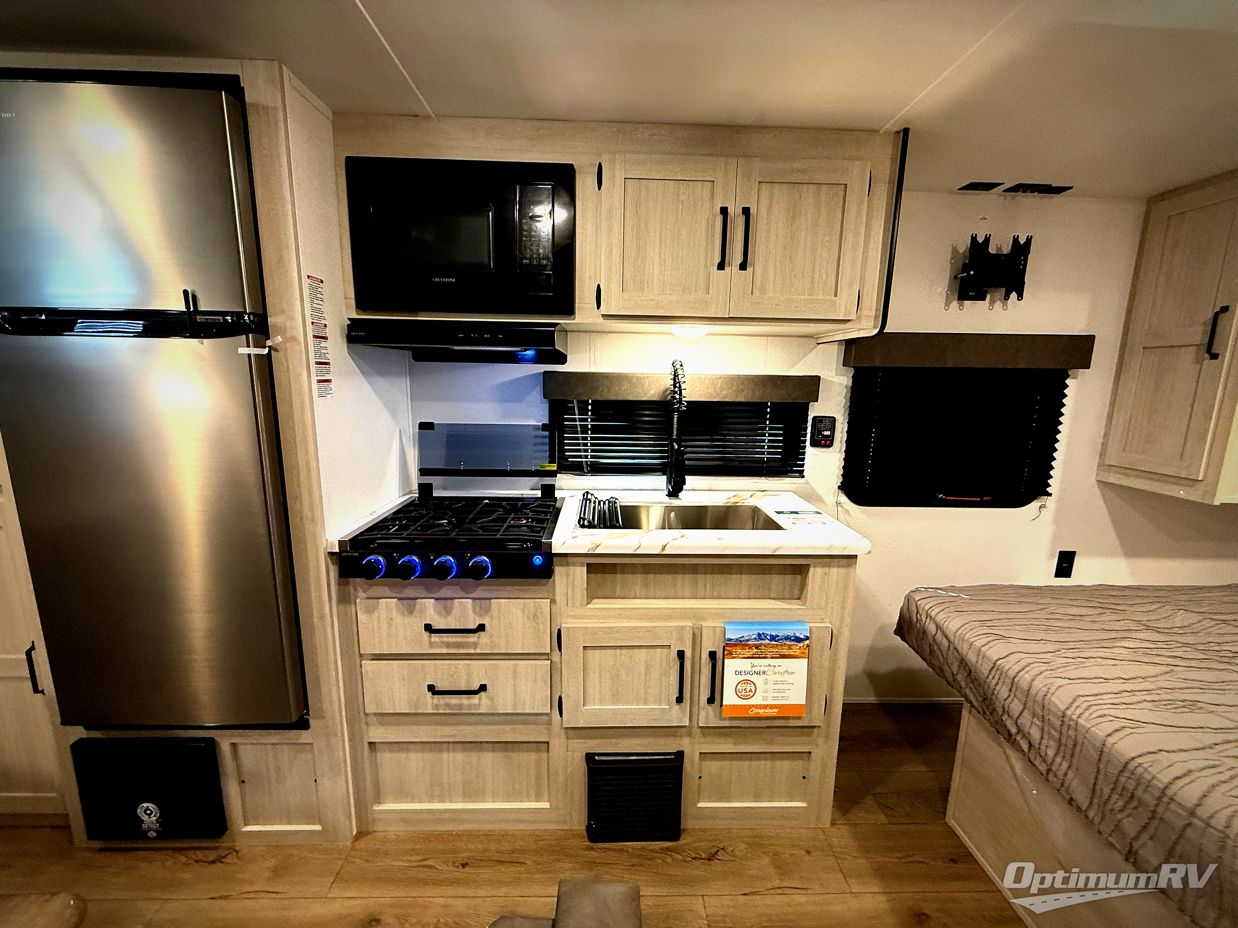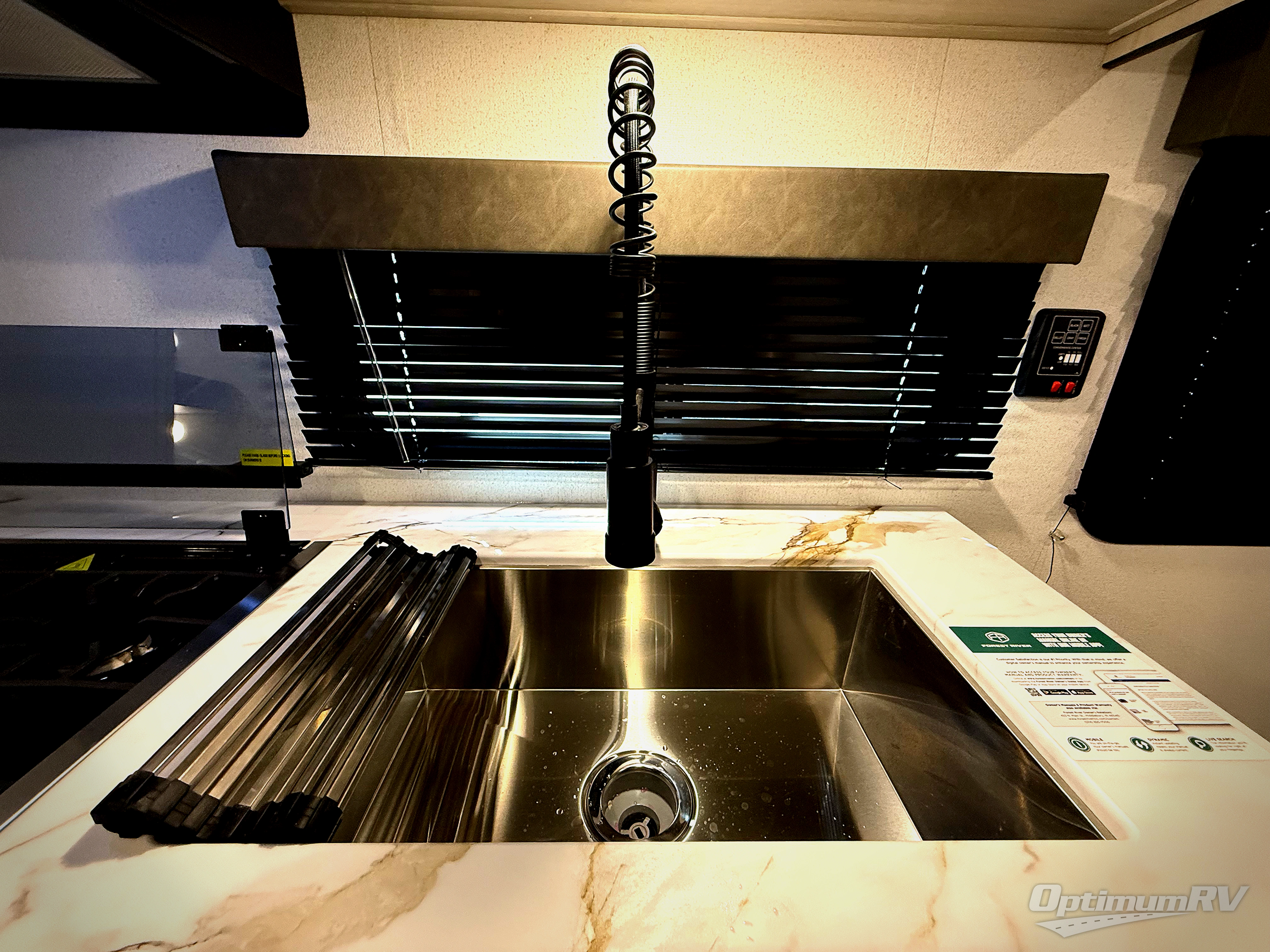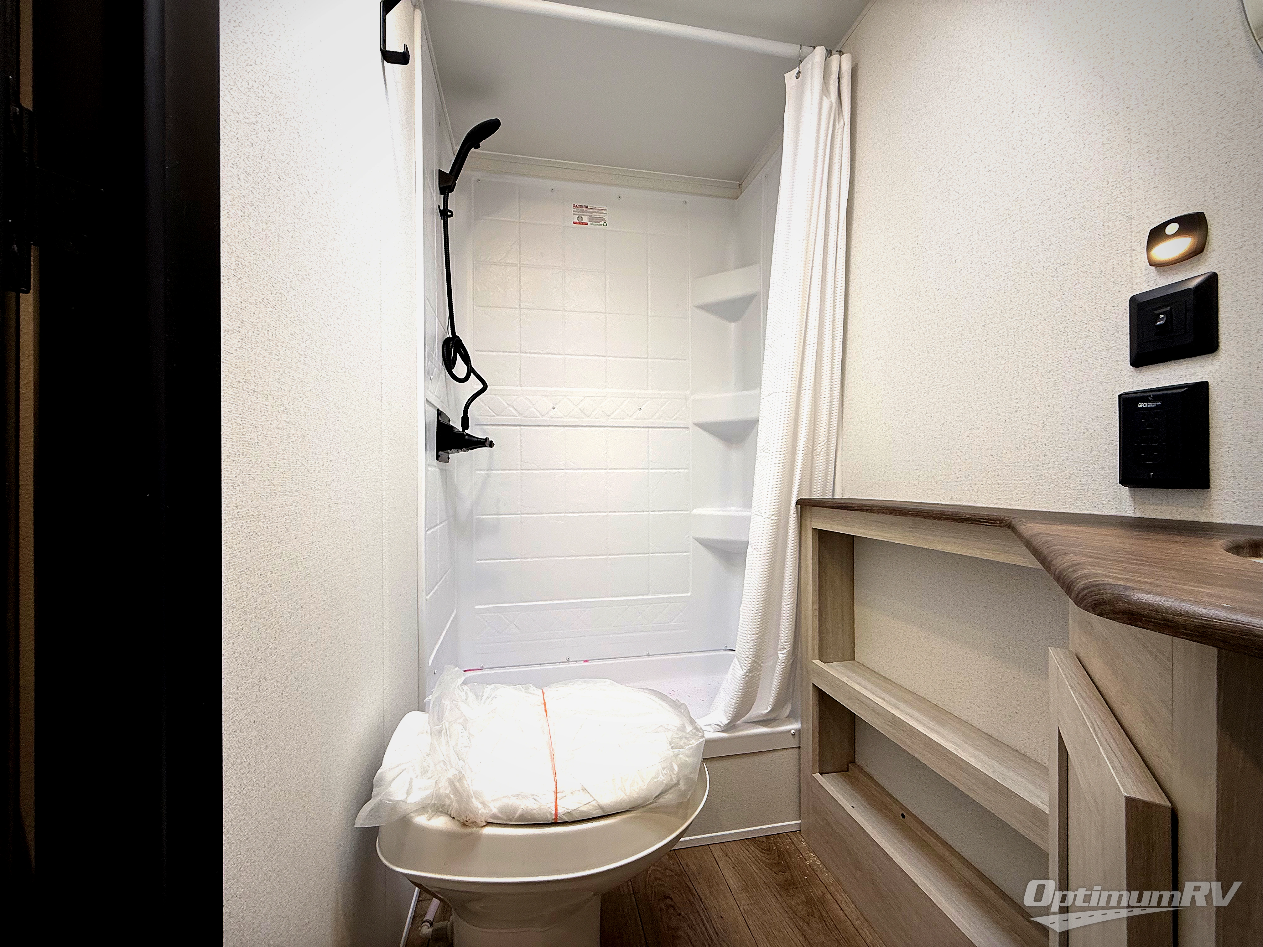 If you're looking for more sleeping space, this double axle unit features double-size bunks with storage under the bunks for your bags. The full kitchen includes a stainless microwave and three burner cooktop to make meals, plus a pantry and 12V refrigerator for food storage. And an optional outside mini kitchen with a griddle can be added if you enjoy cooking outdoors! Up front, you'll find a 60" x 74" queen bed with an optional Murphy bed if you're needing more seating space during the day!
