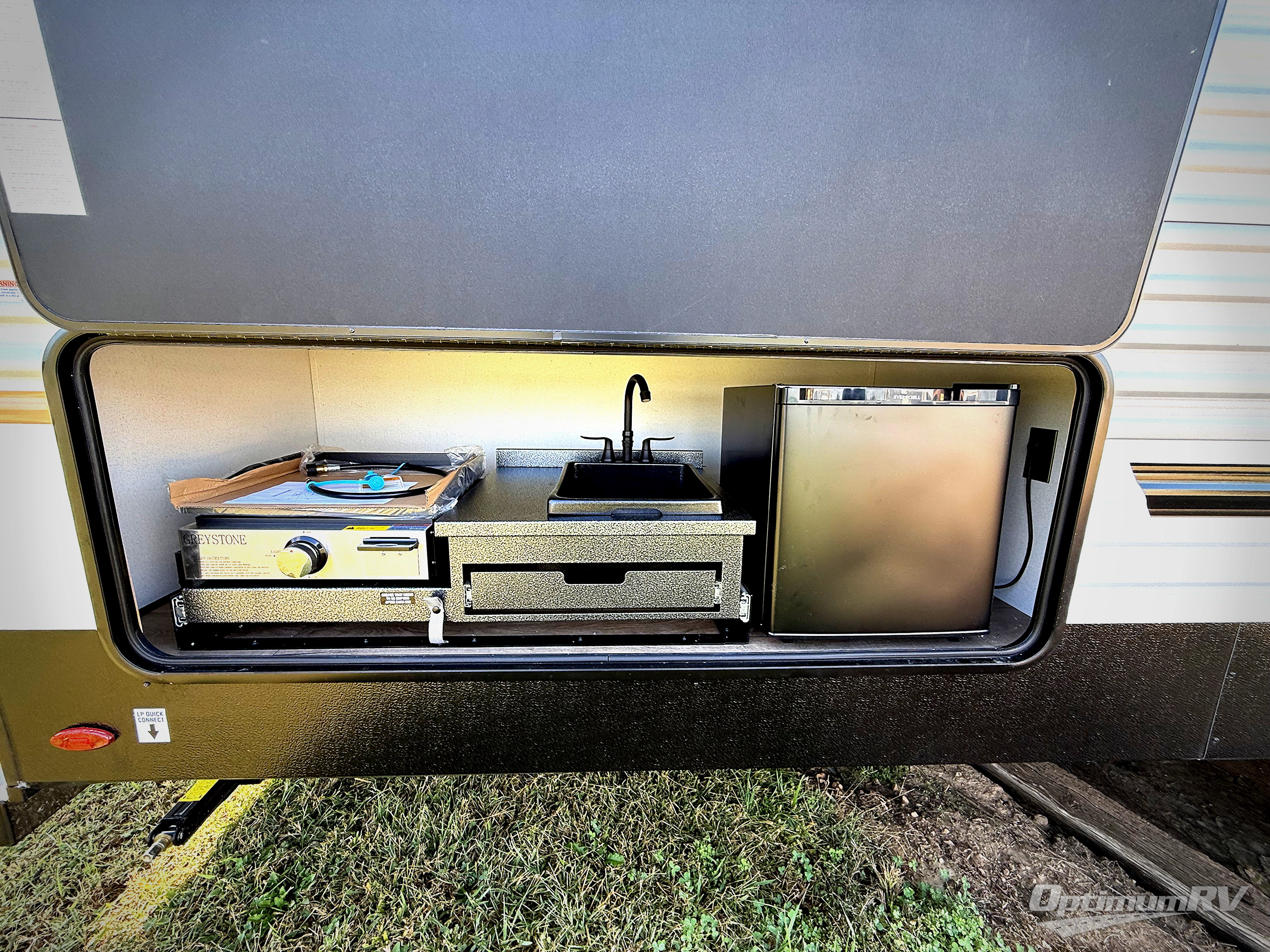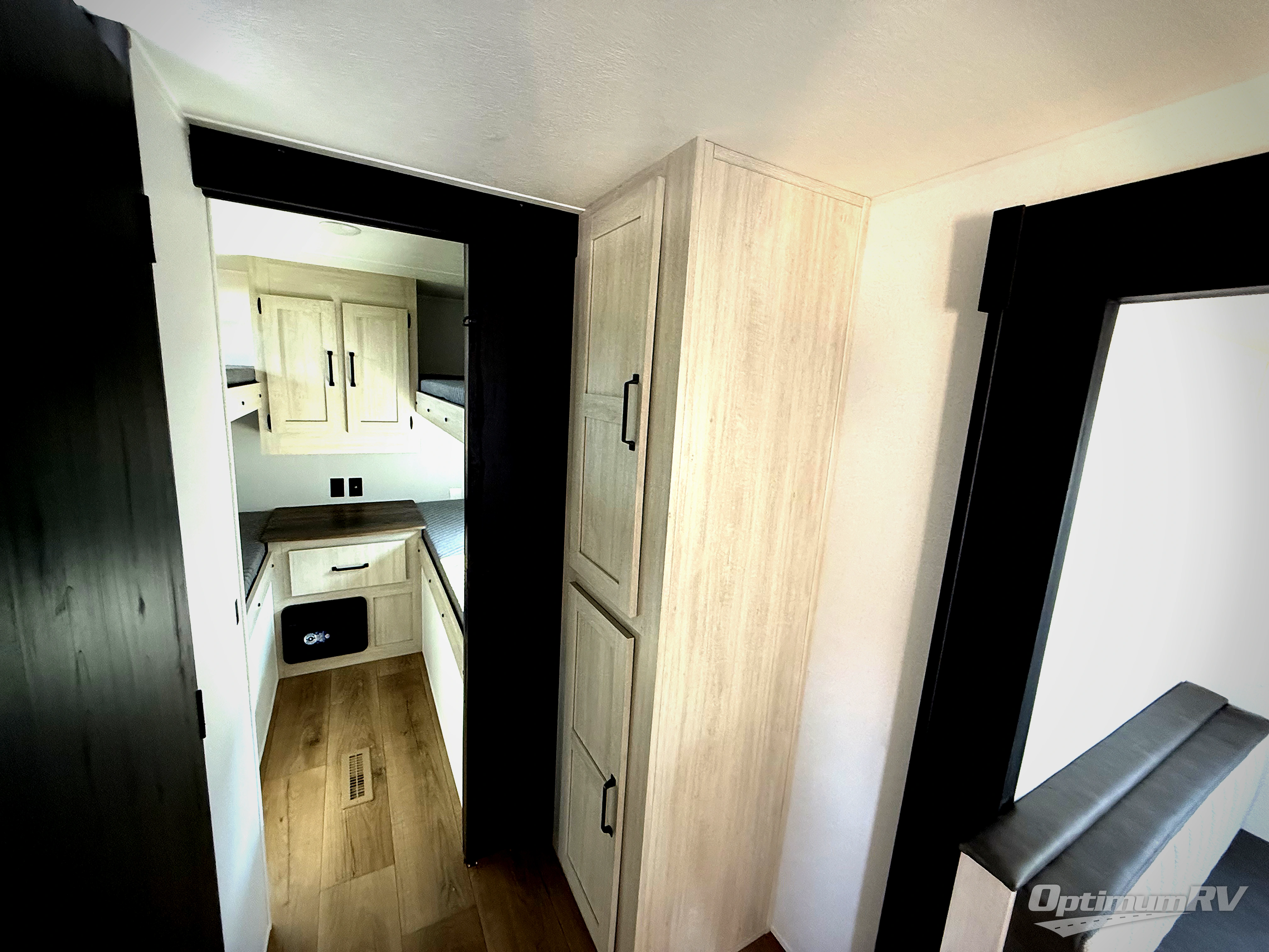 If you're looking for more space, this double axle unit features a large slide so you can walk about freely. Here, you'll find the booth dinette and sofa, which sit across from the optional TV if you want to enjoy movie nights. The full kitchen includes a stainless microwave and three burner cooktop to make meals, plus a pantry and 12V refrigerator for food storage. And an optional outside kitchen with a griddle can be added if you enjoy cooking outdoors! Your guests or littles are sure to enjoy the rear private bunkhouse with four bunk beds and a wardrobe for their things!