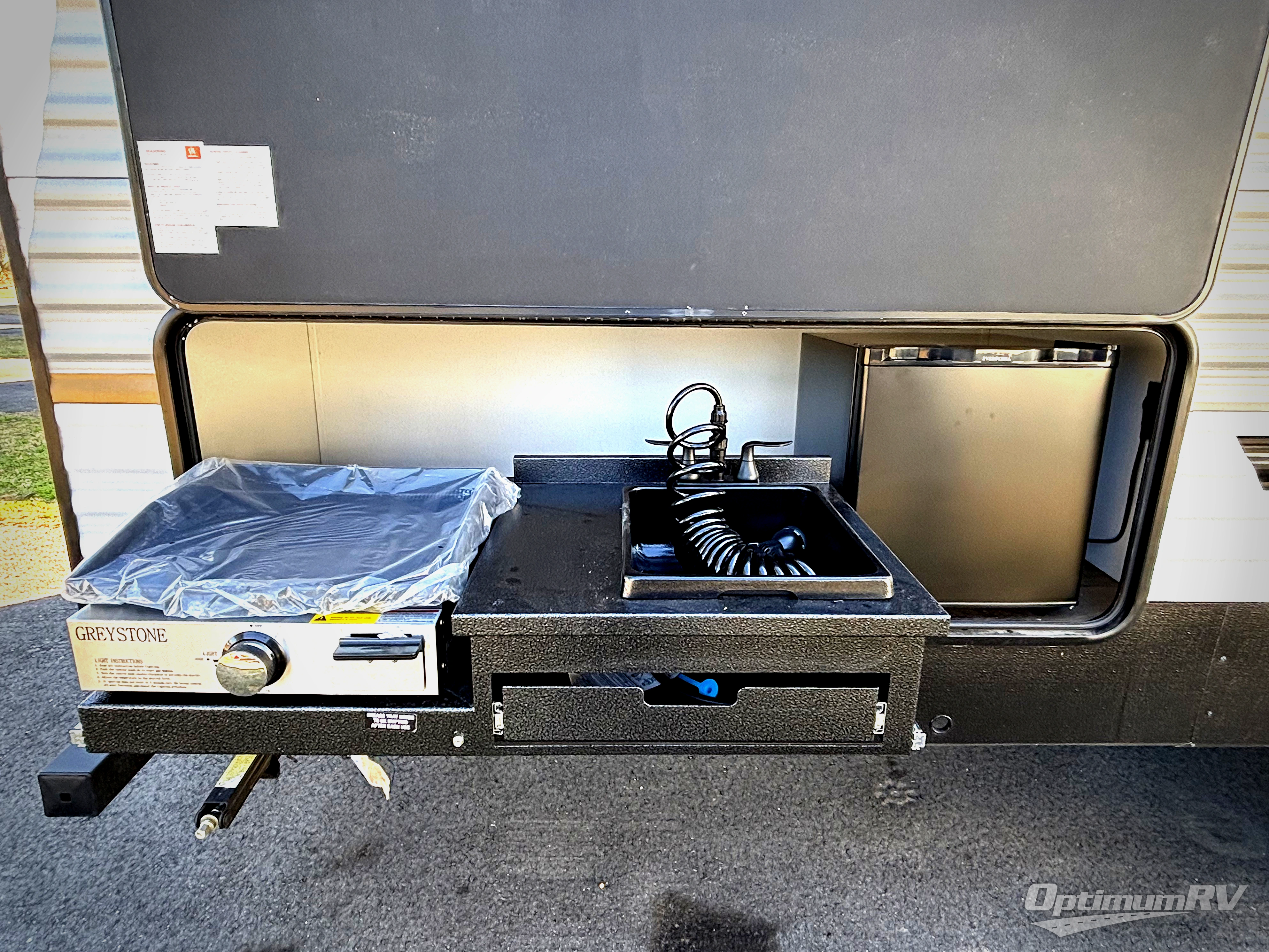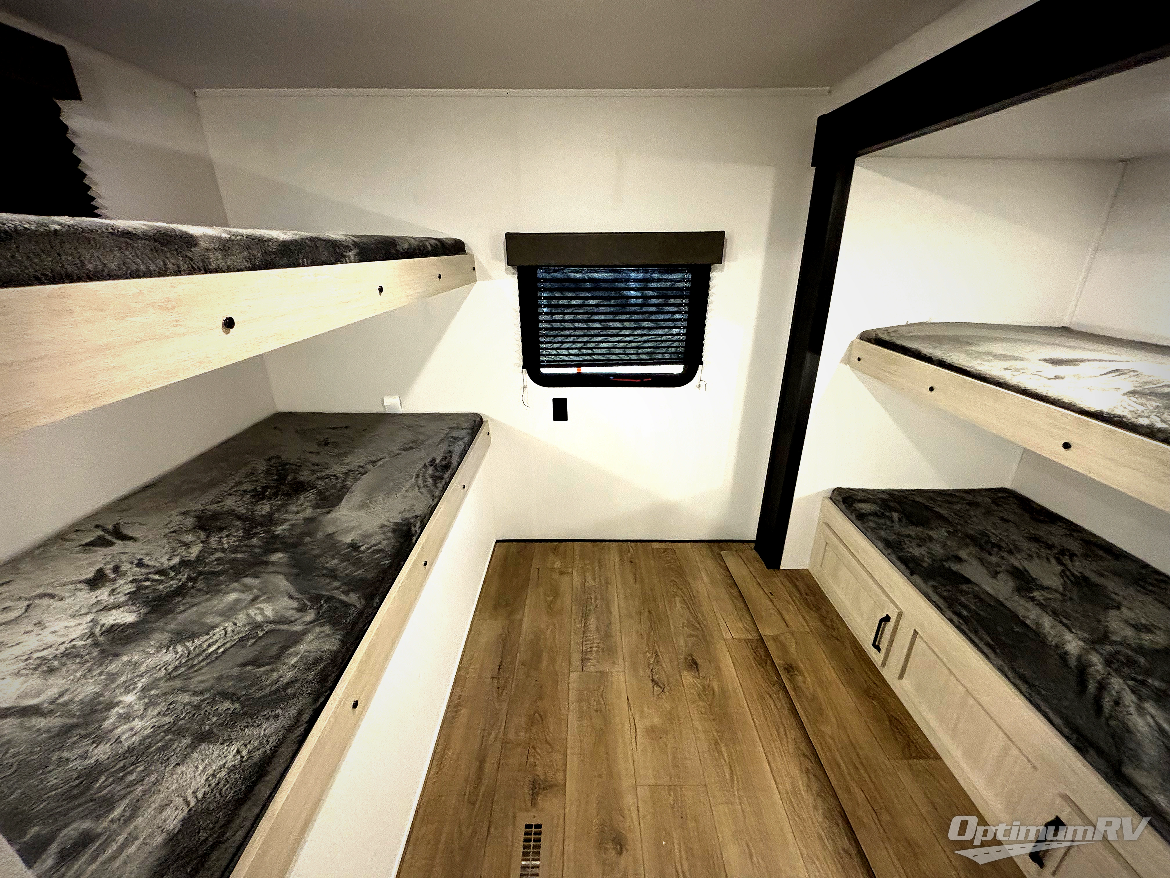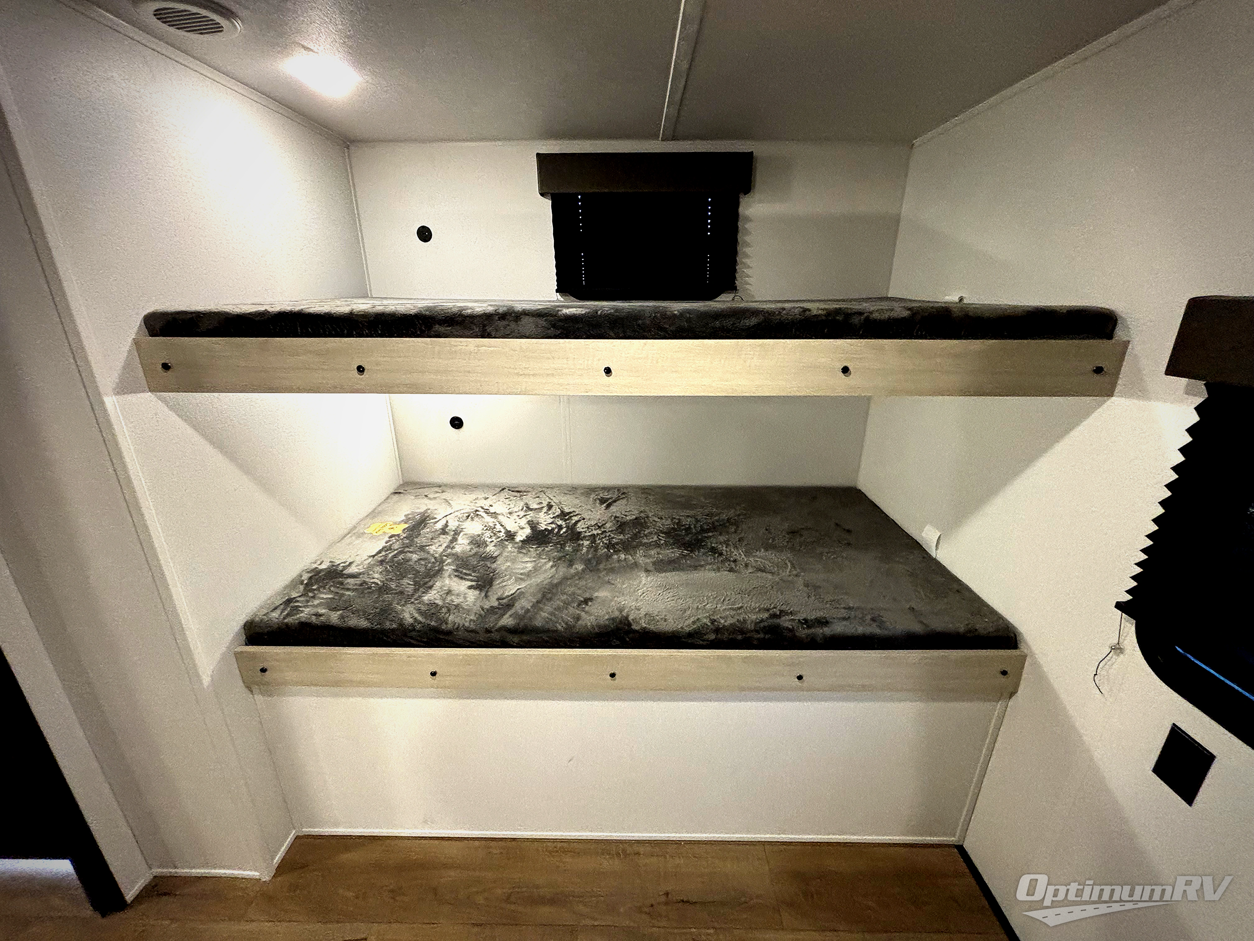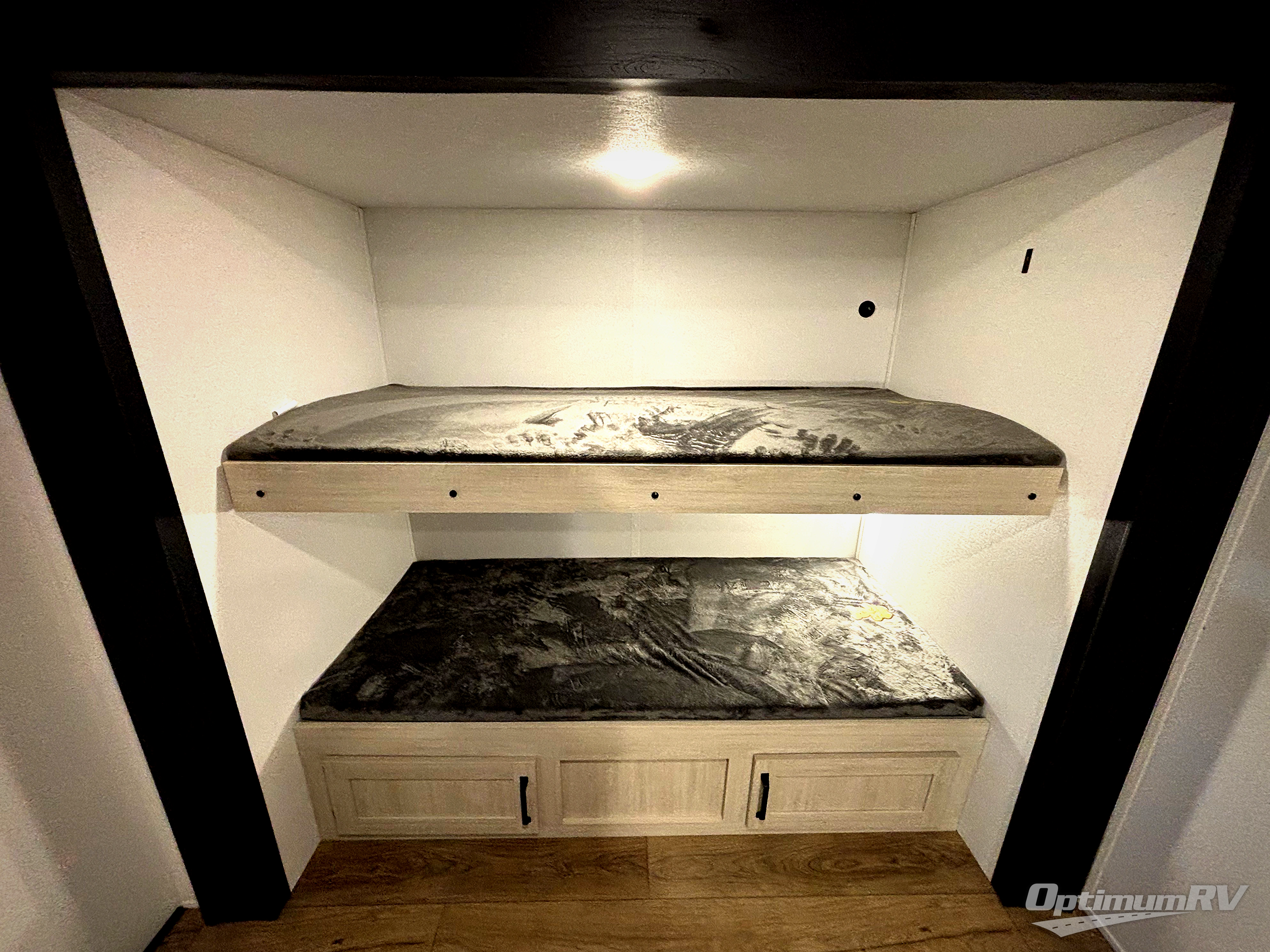 If you're looking for more space, this double axle, double slide out unit is perfect for your group of eight. Within the large slide in the living room, you'll find the booth dinette and sofa, which sit across from the optional TV if you want to enjoy movie nights. The full kitchen includes a stainless microwave and three burner cooktop to make meals, plus a pantry and 12V refrigerator for food storage. And an optional outside kitchen with a griddle can be added if you enjoy cooking outdoors! Your guests or littles are sure to enjoy the rear private bunkhouse that features a set of 38" x 76" bunks across from the third bunk and jiffy sofa within a slide out!