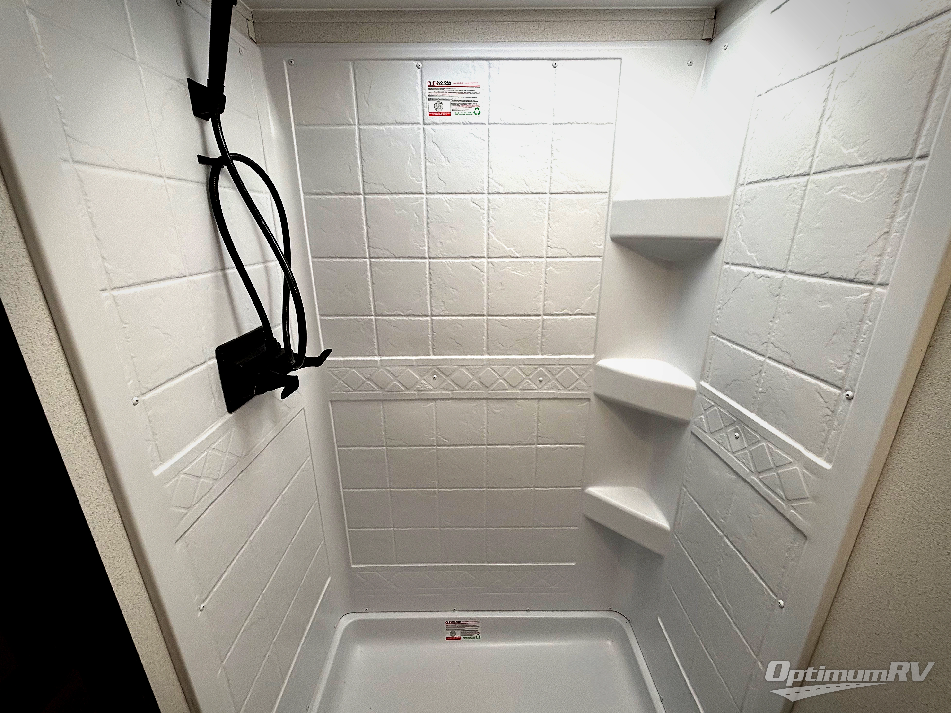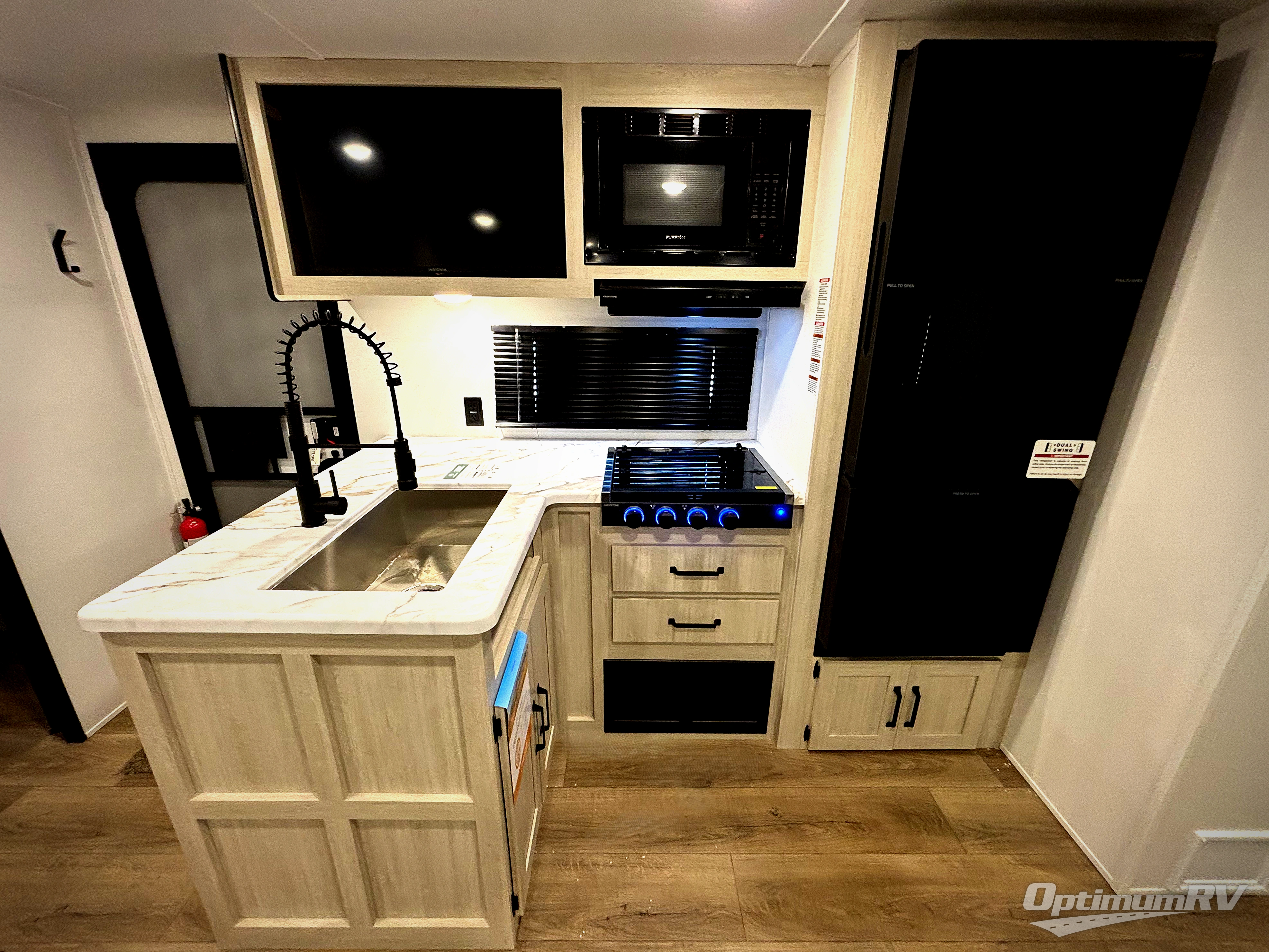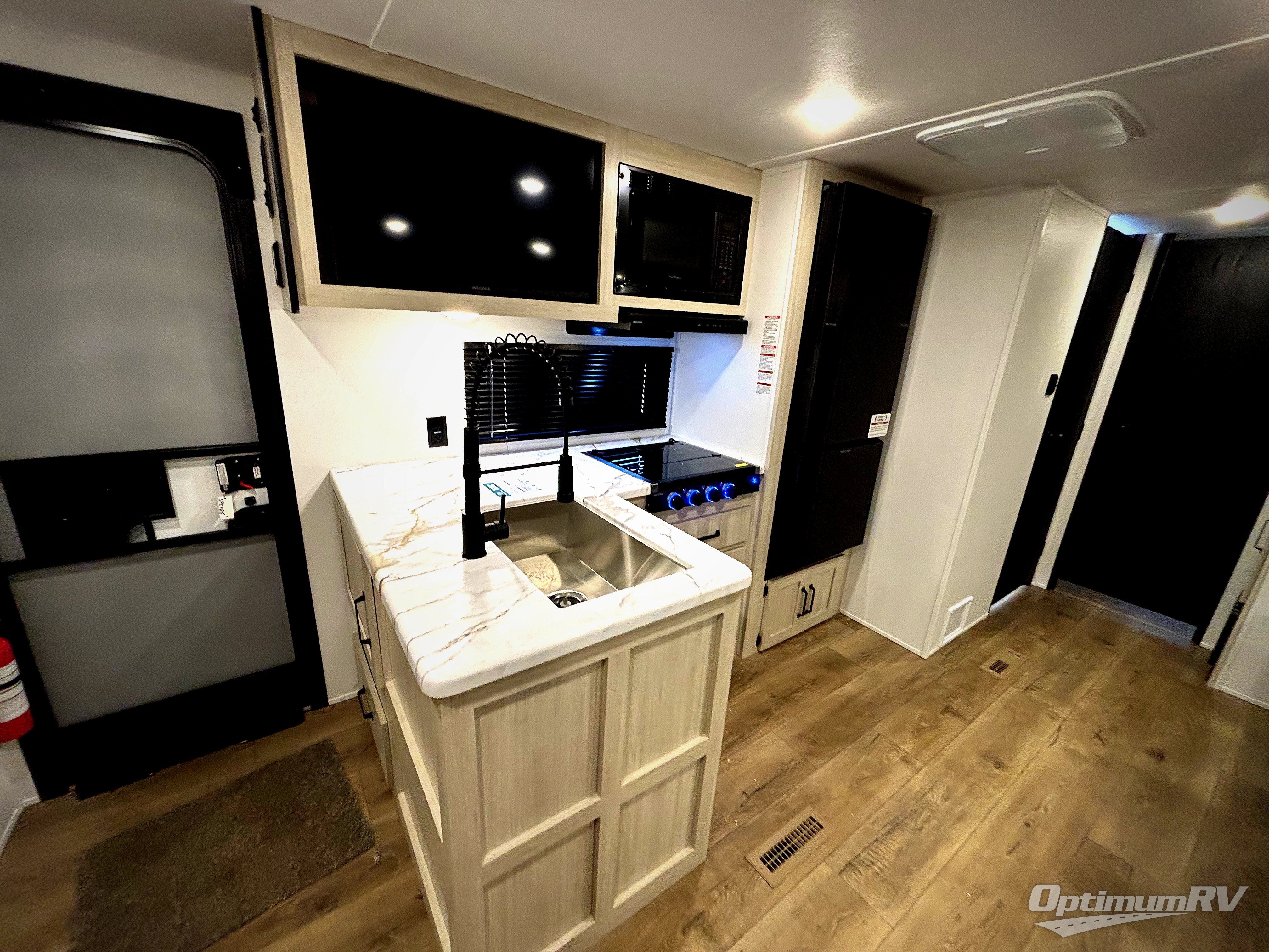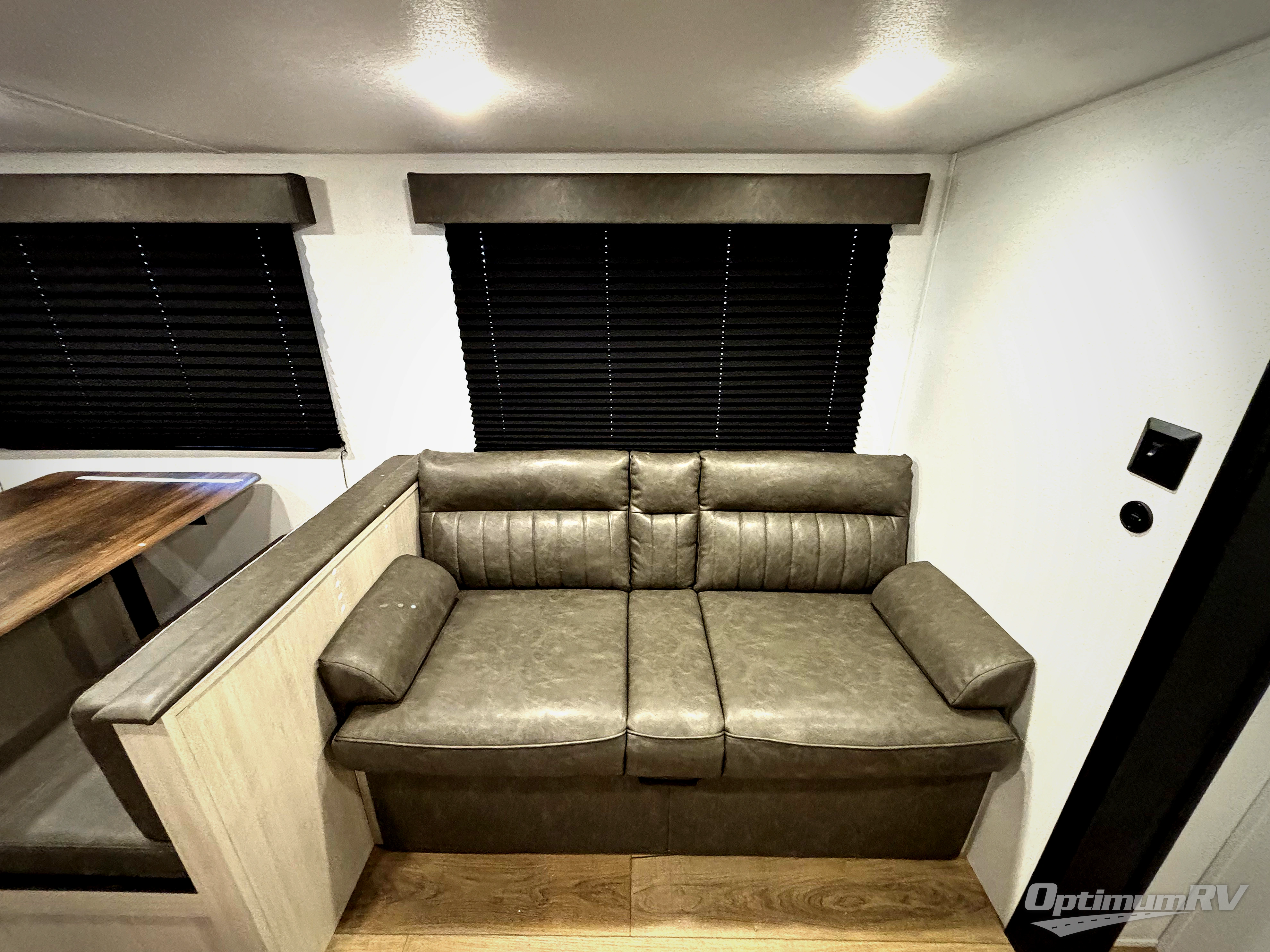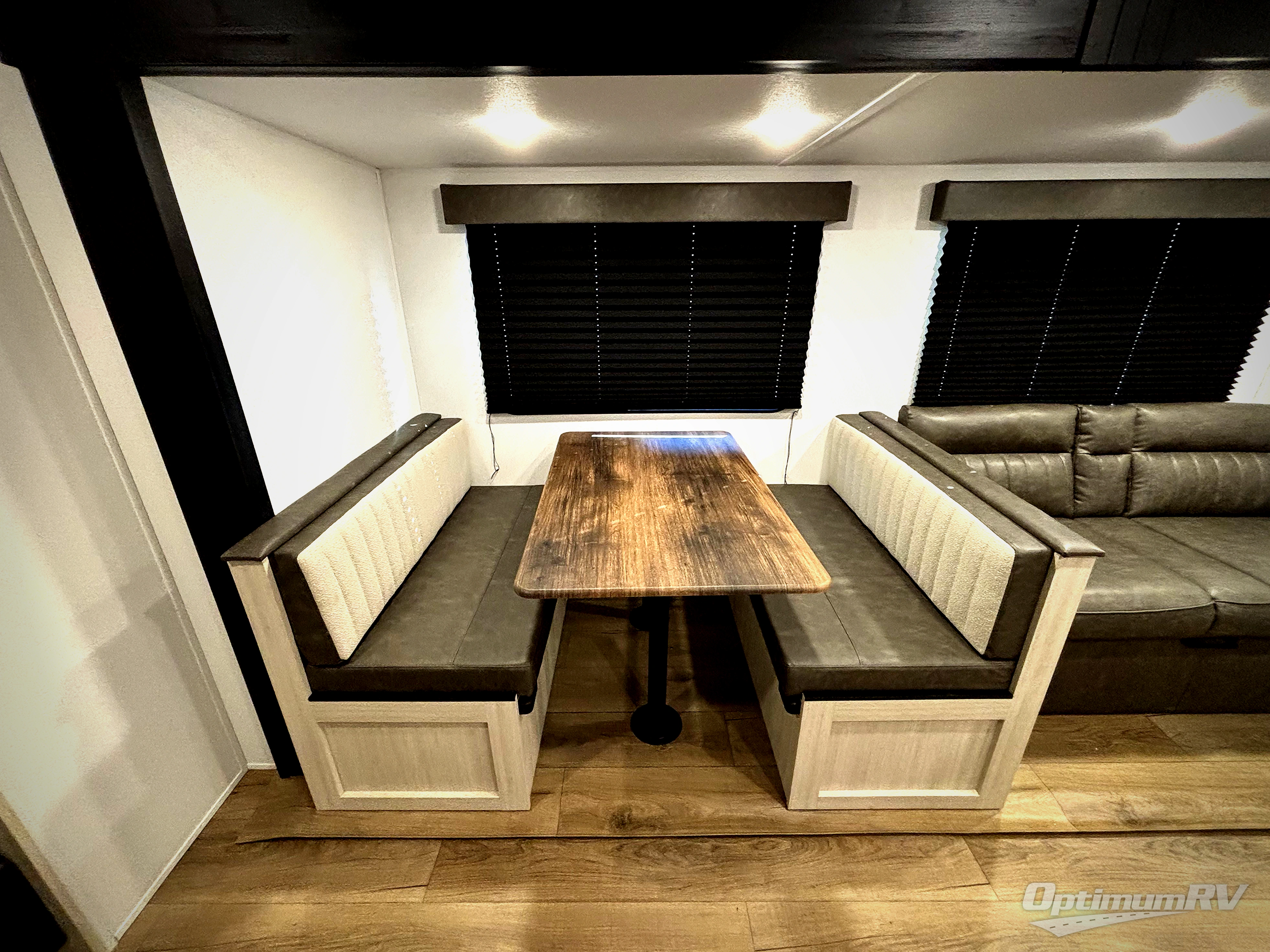 If you're looking for more space, this double axle, double slide out unit is perfect for your group of eight. Within the large slide in the living room, you'll find the booth dinette and sofa, which sit across from the optional TV if you want to enjoy movie nights. The full kitchen includes a stainless microwave and three burner cooktop to make meals, plus a pantry and 12V refrigerator for food storage. And an optional outside kitchen with a griddle can be added if you enjoy cooking outdoors! Your guests or littles are sure to enjoy the rear private bunkhouse that features a set of 38" x 76" bunks across from the third bunk and jiffy sofa within a slide out!