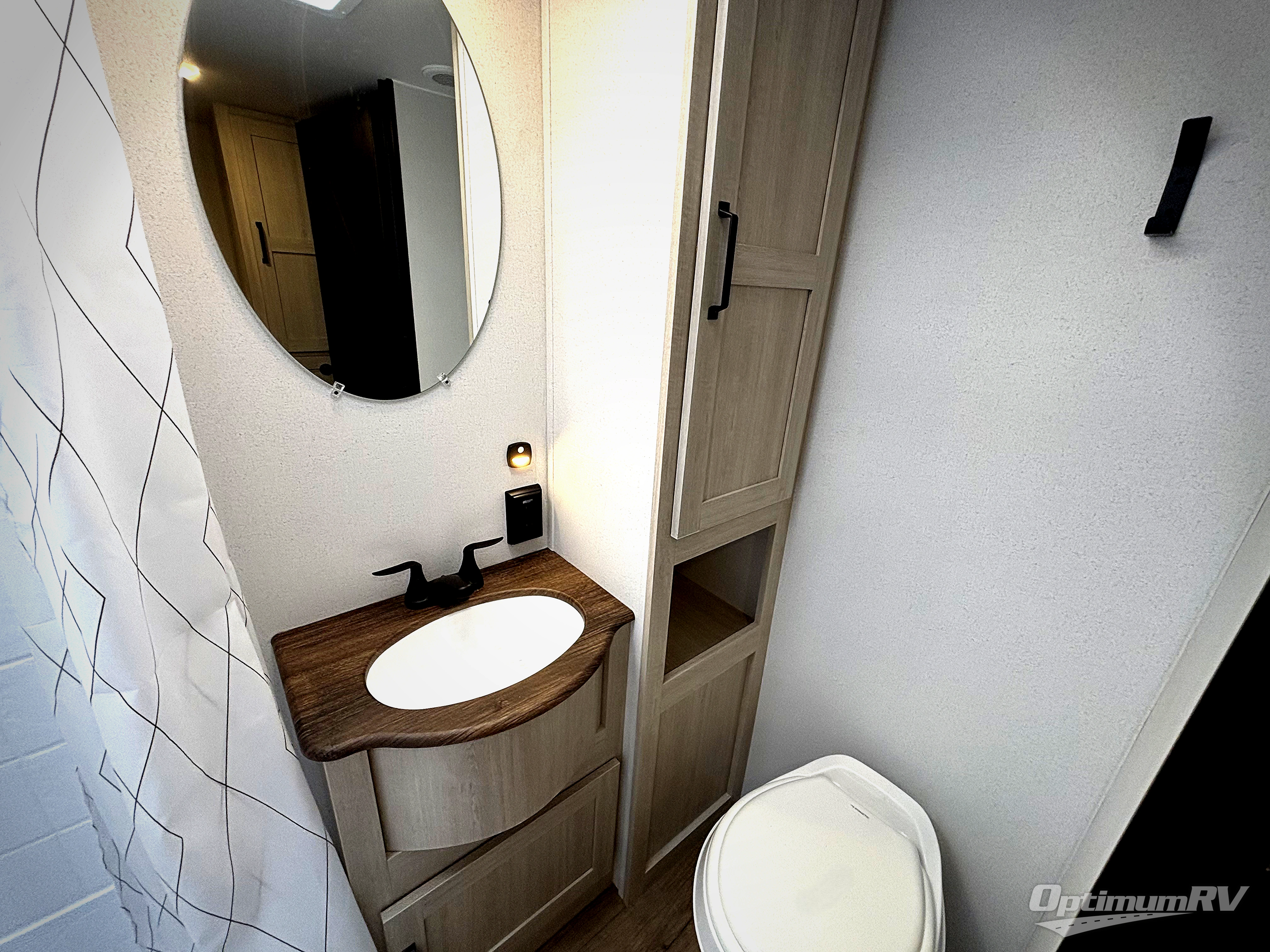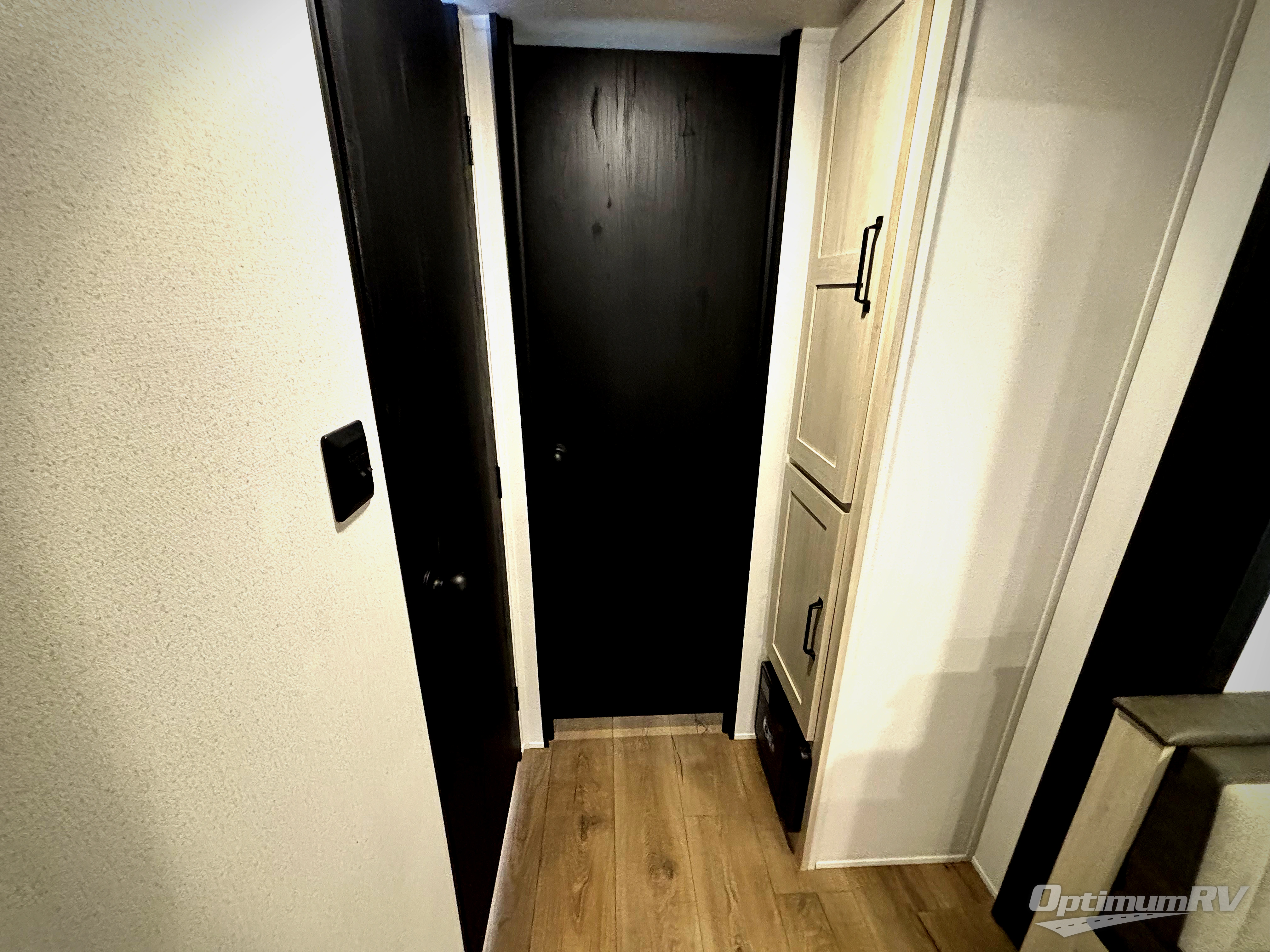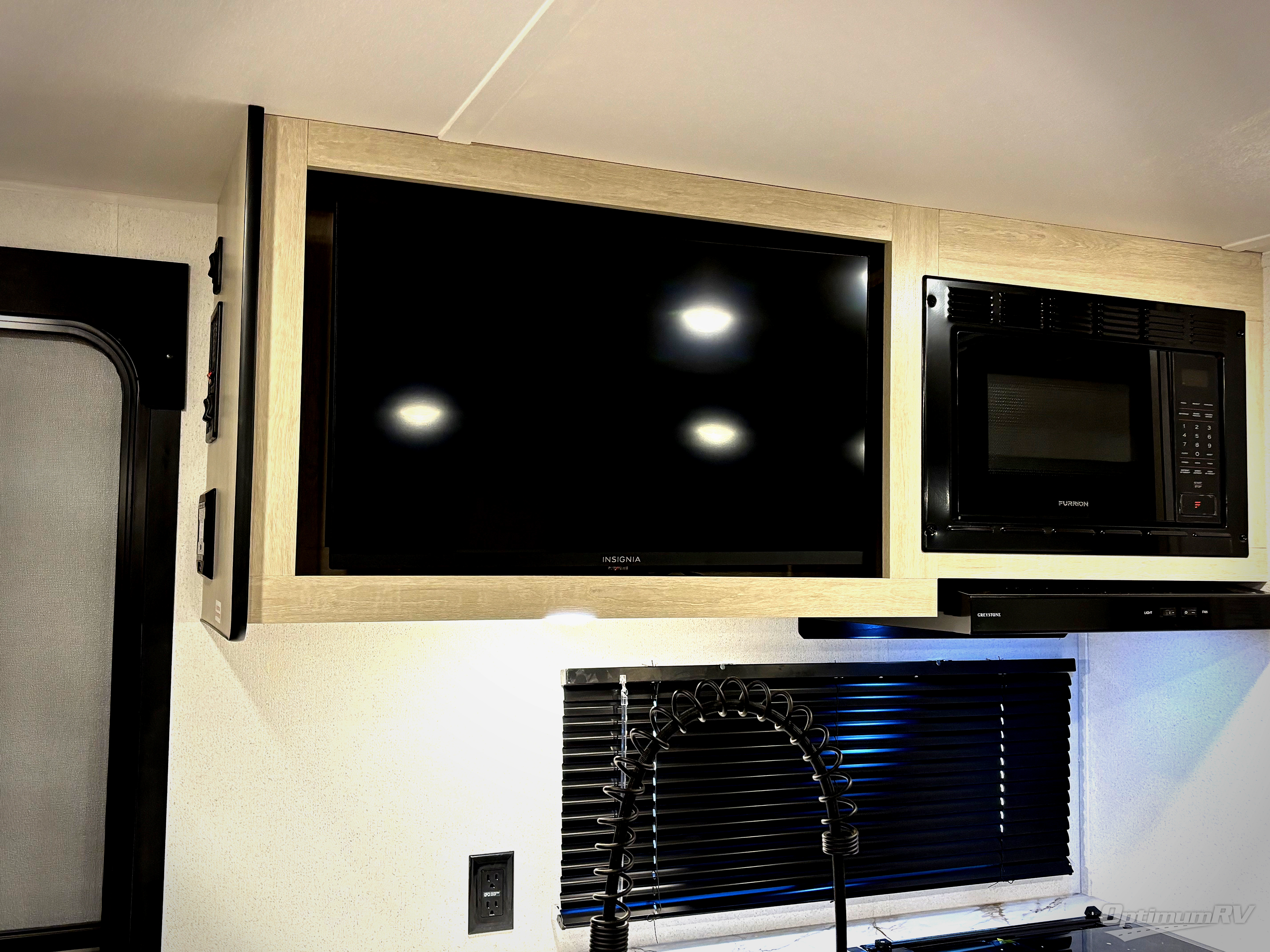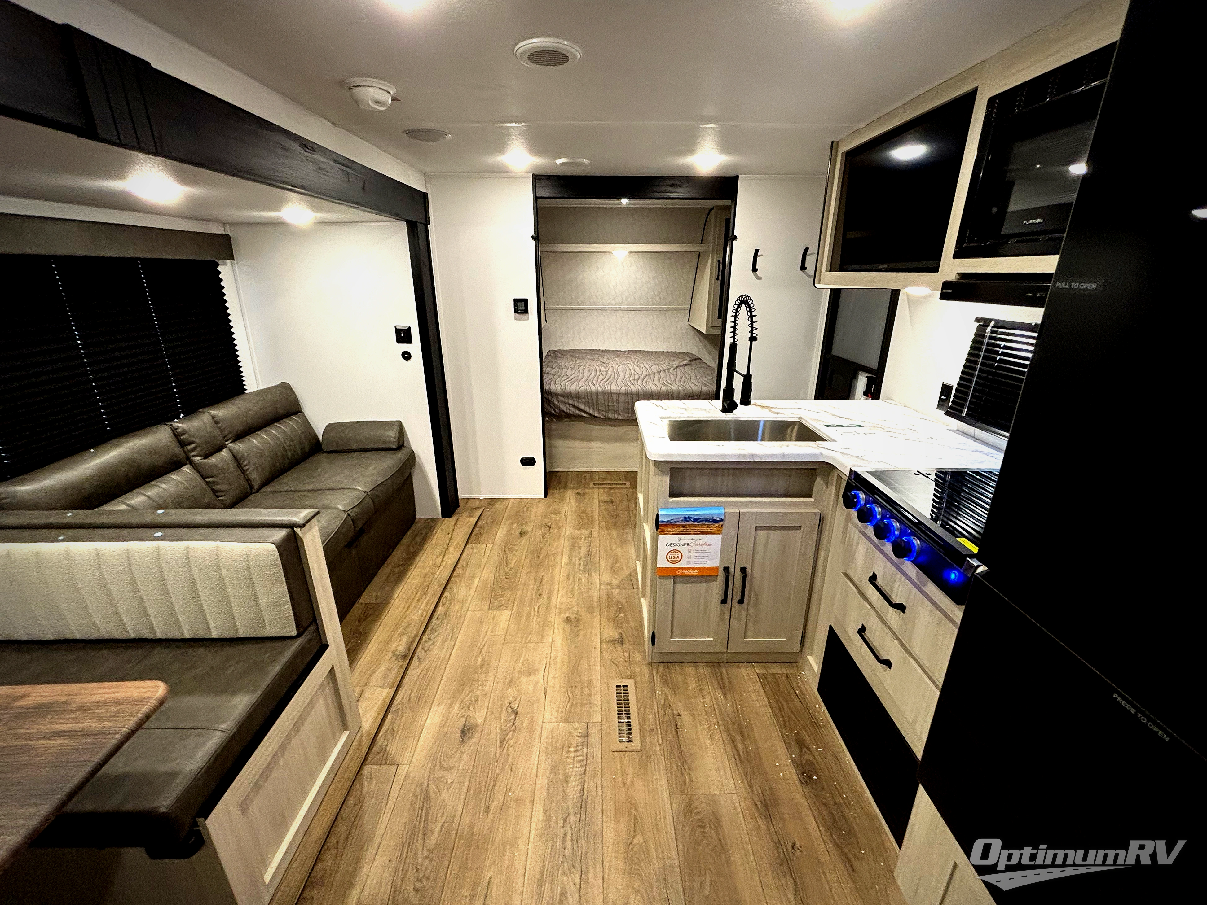 If you're looking for more space, this double axle, double slide out unit is perfect for your group of eight. Within the large slide in the living room, you'll find the booth dinette and sofa, which sit across from the optional TV if you want to enjoy movie nights. The full kitchen includes a stainless microwave and three burner cooktop to make meals, plus a pantry and 12V refrigerator for food storage. And an optional outside kitchen with a griddle can be added if you enjoy cooking outdoors! Your guests or littles are sure to enjoy the rear private bunkhouse that features a set of 38" x 76" bunks across from the third bunk and jiffy sofa within a slide out!