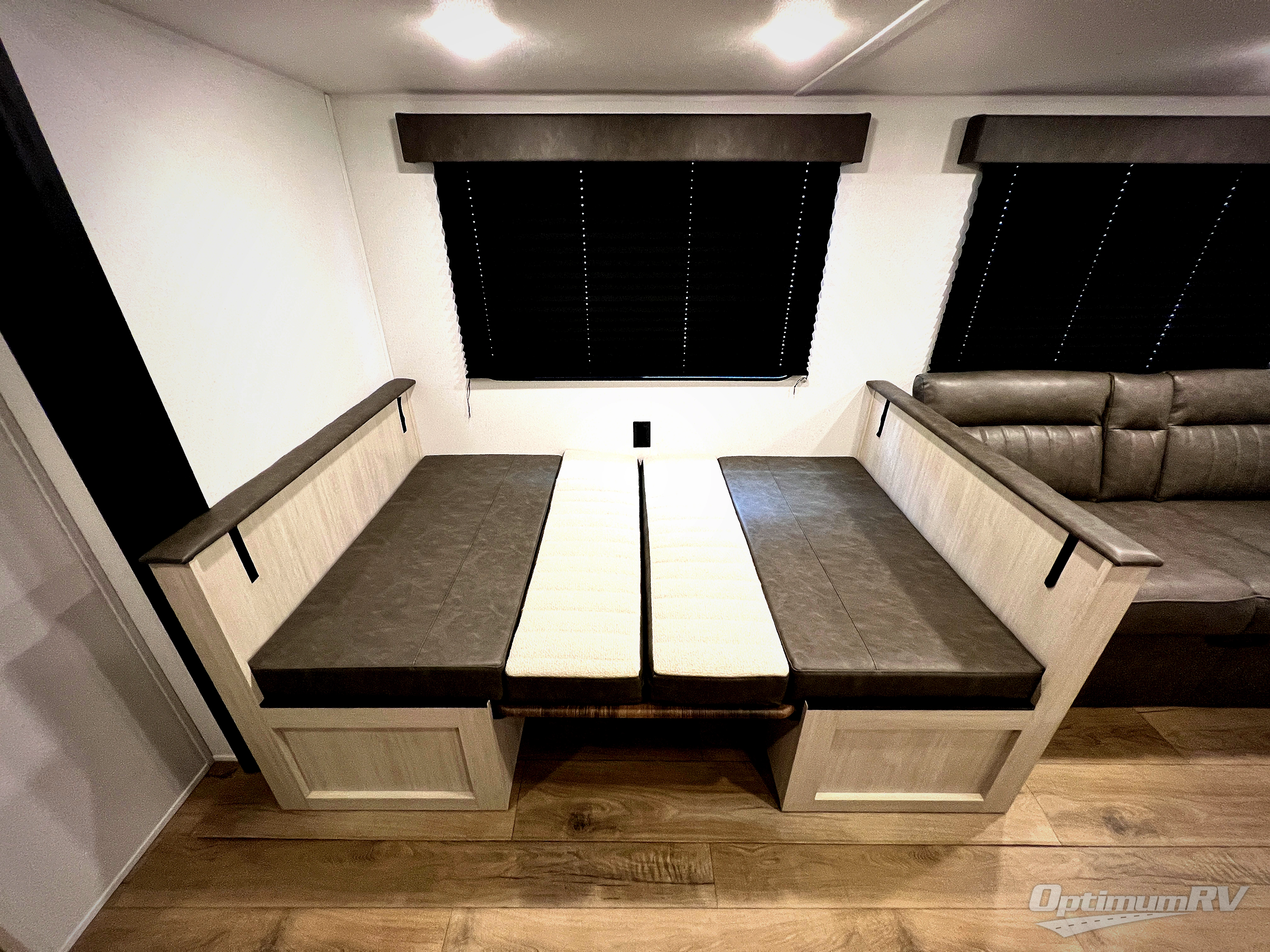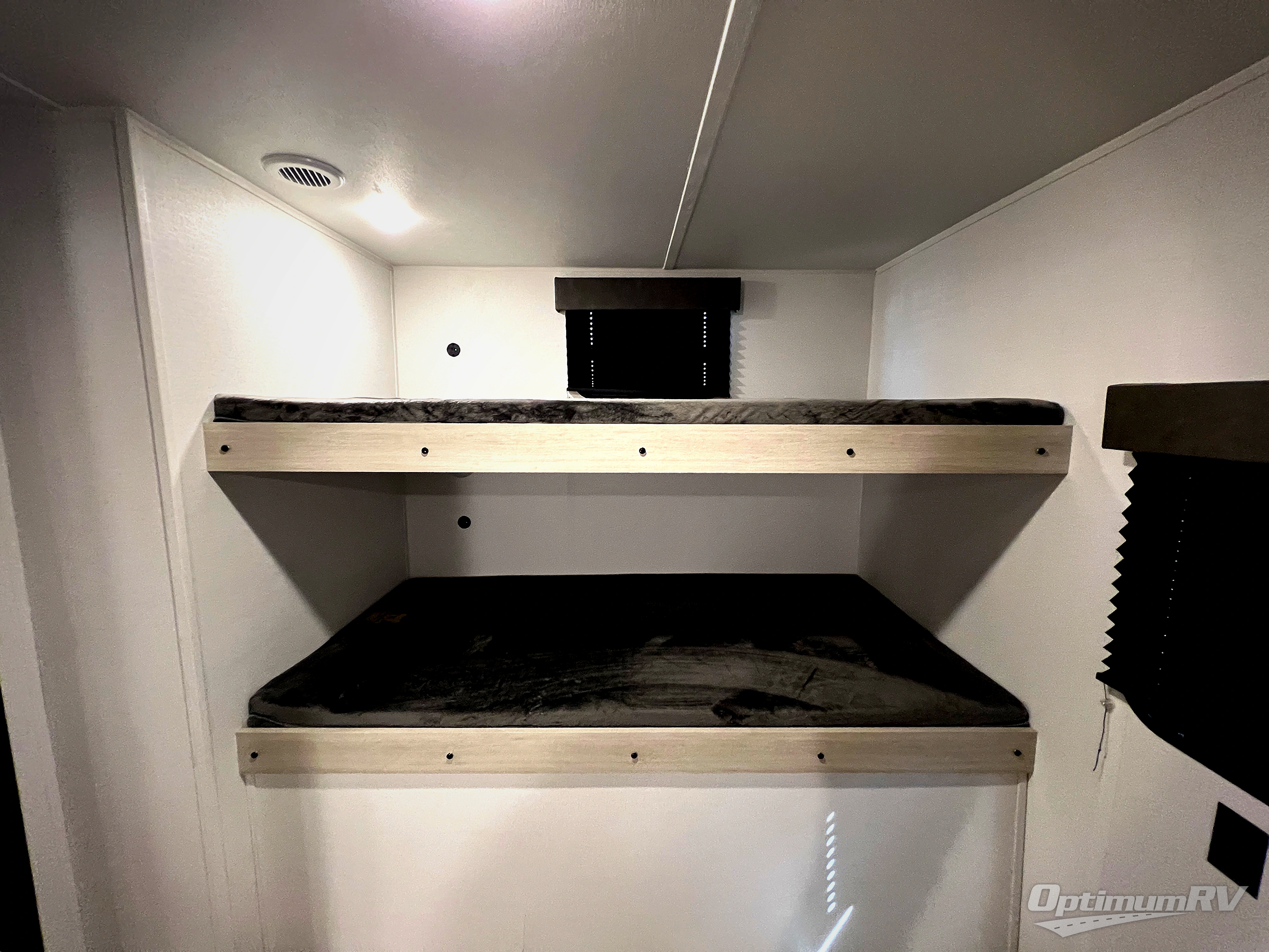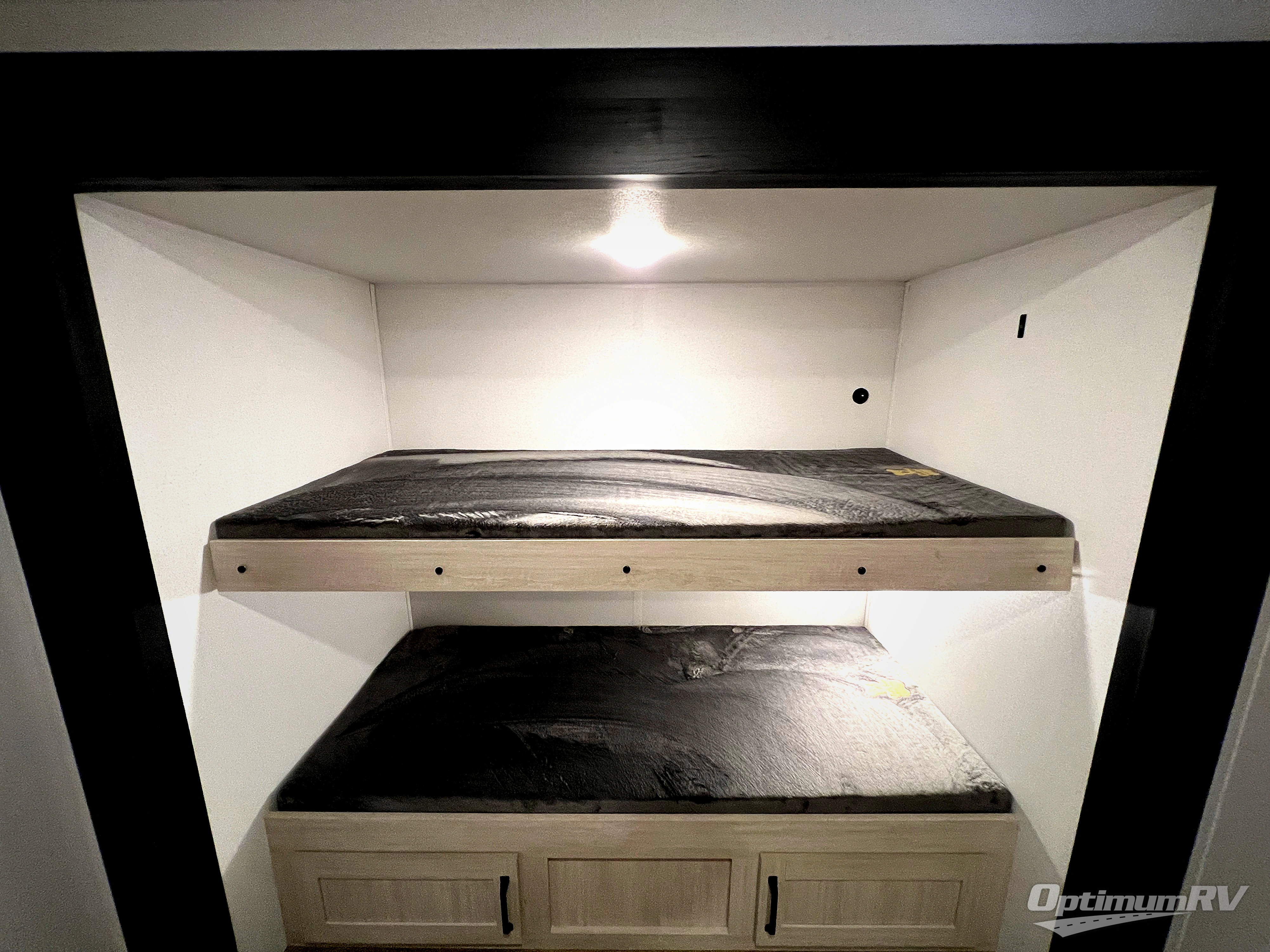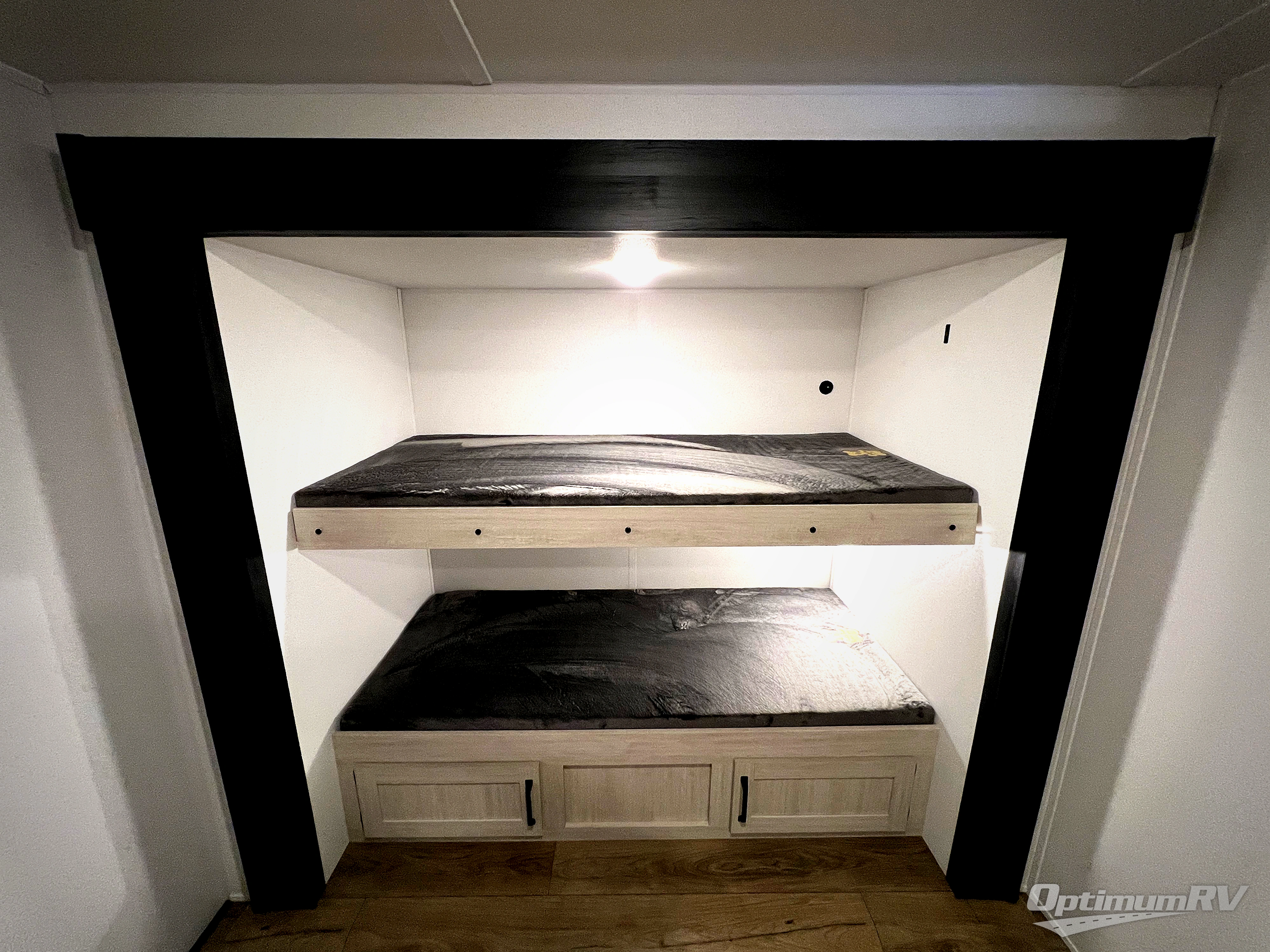 If you're looking for more space, this double axle, double slide out unit is perfect for your group of eight. Within the large slide in the living room, you'll find the booth dinette and sofa, which sit across from the optional TV if you want to enjoy movie nights. The full kitchen includes a stainless microwave and three burner cooktop to make meals, plus a pantry and 12V refrigerator for food storage. And an optional outside kitchen with a griddle can be added if you enjoy cooking outdoors! Your guests or littles are sure to enjoy the rear private bunkhouse that features a set of 38" x 76" bunks across from the third bunk and jiffy sofa within a slide out!