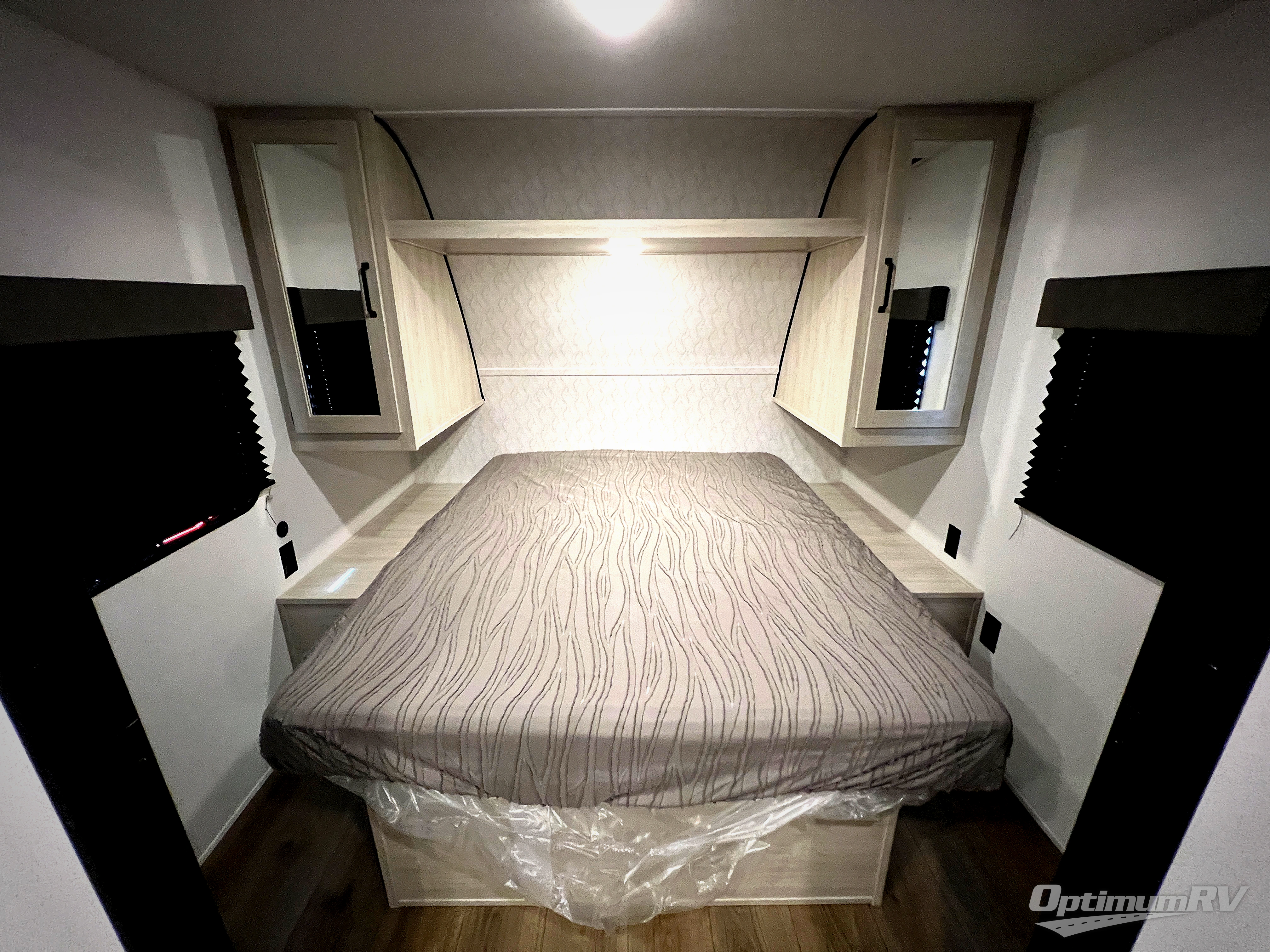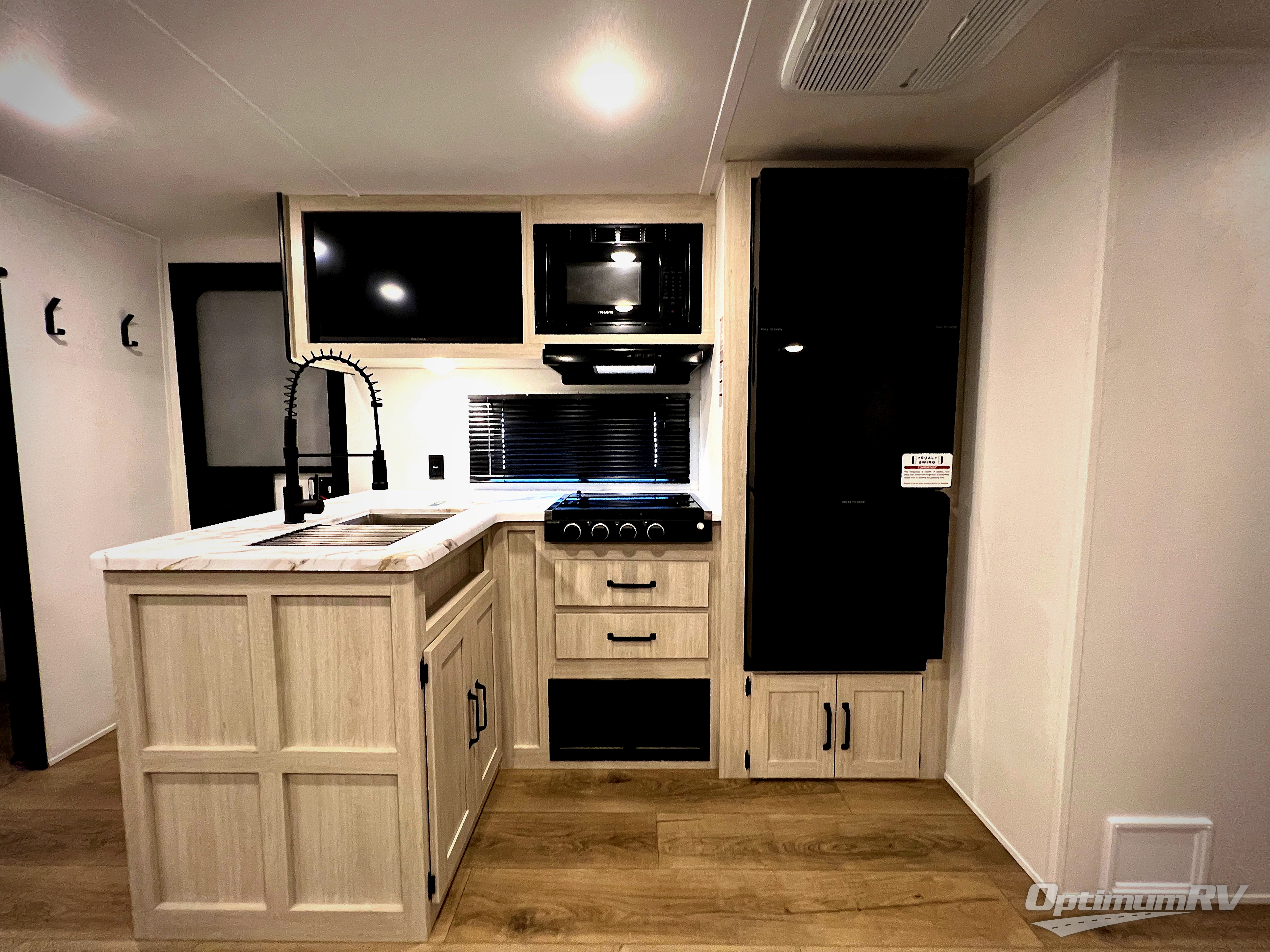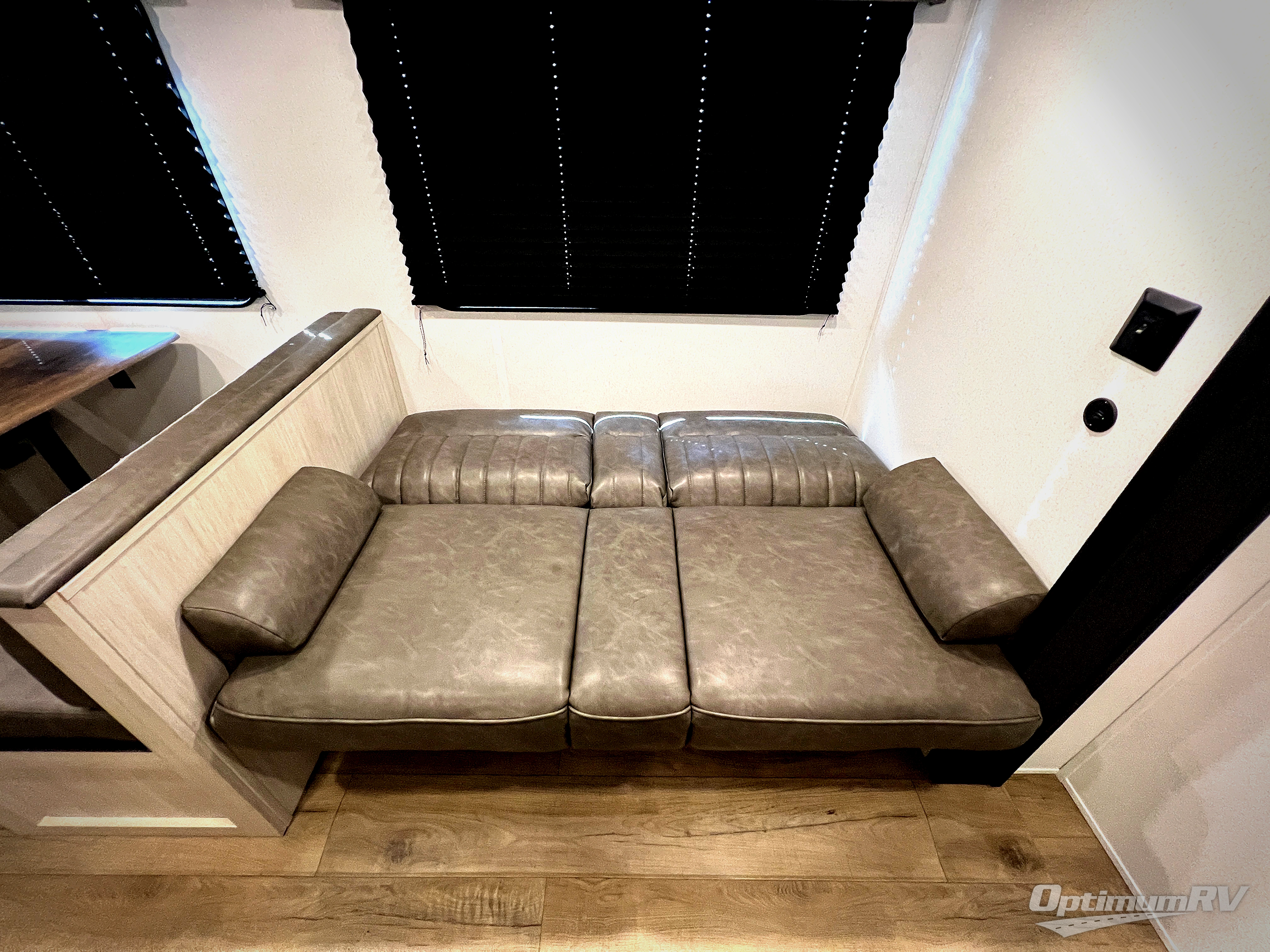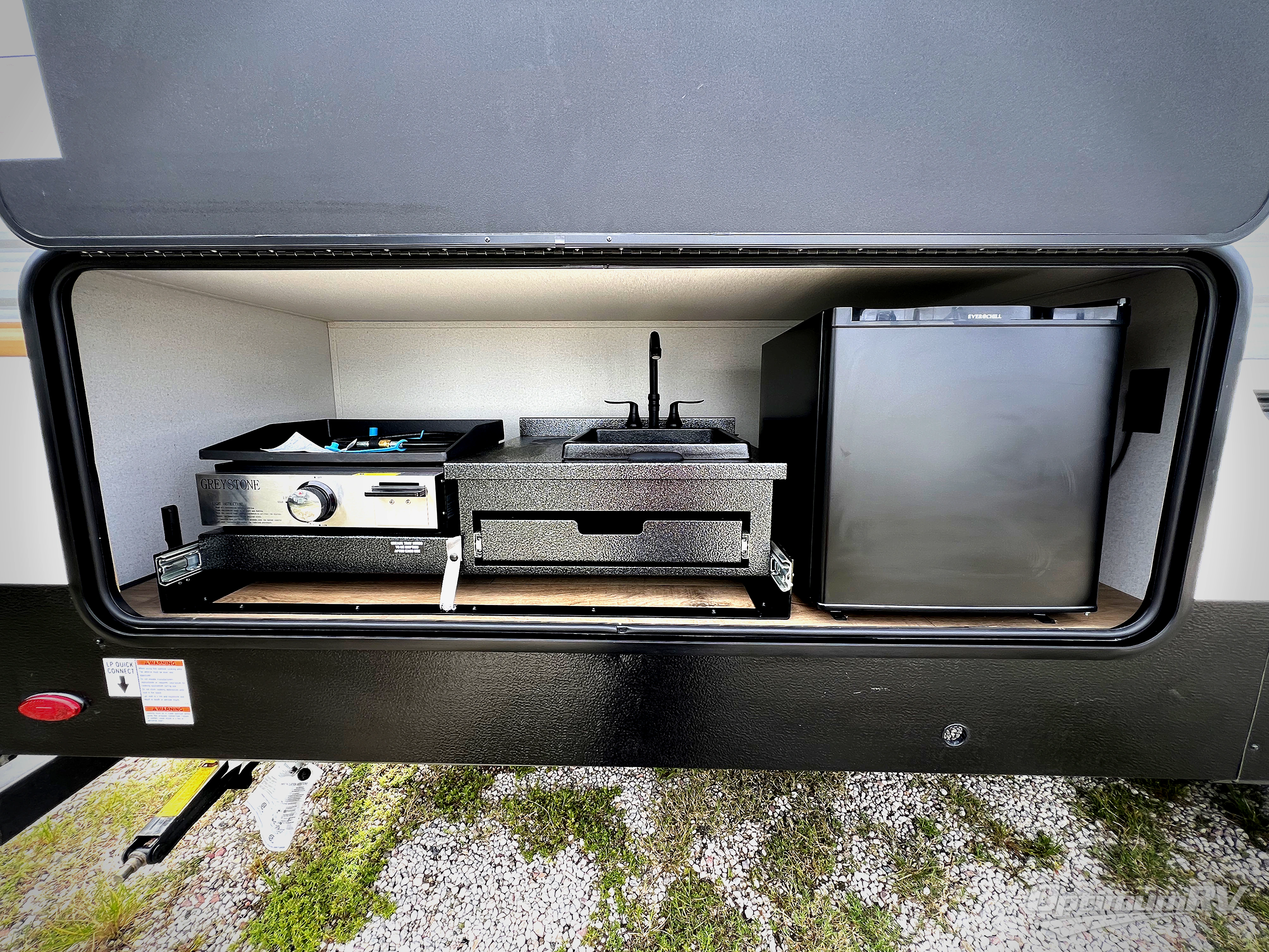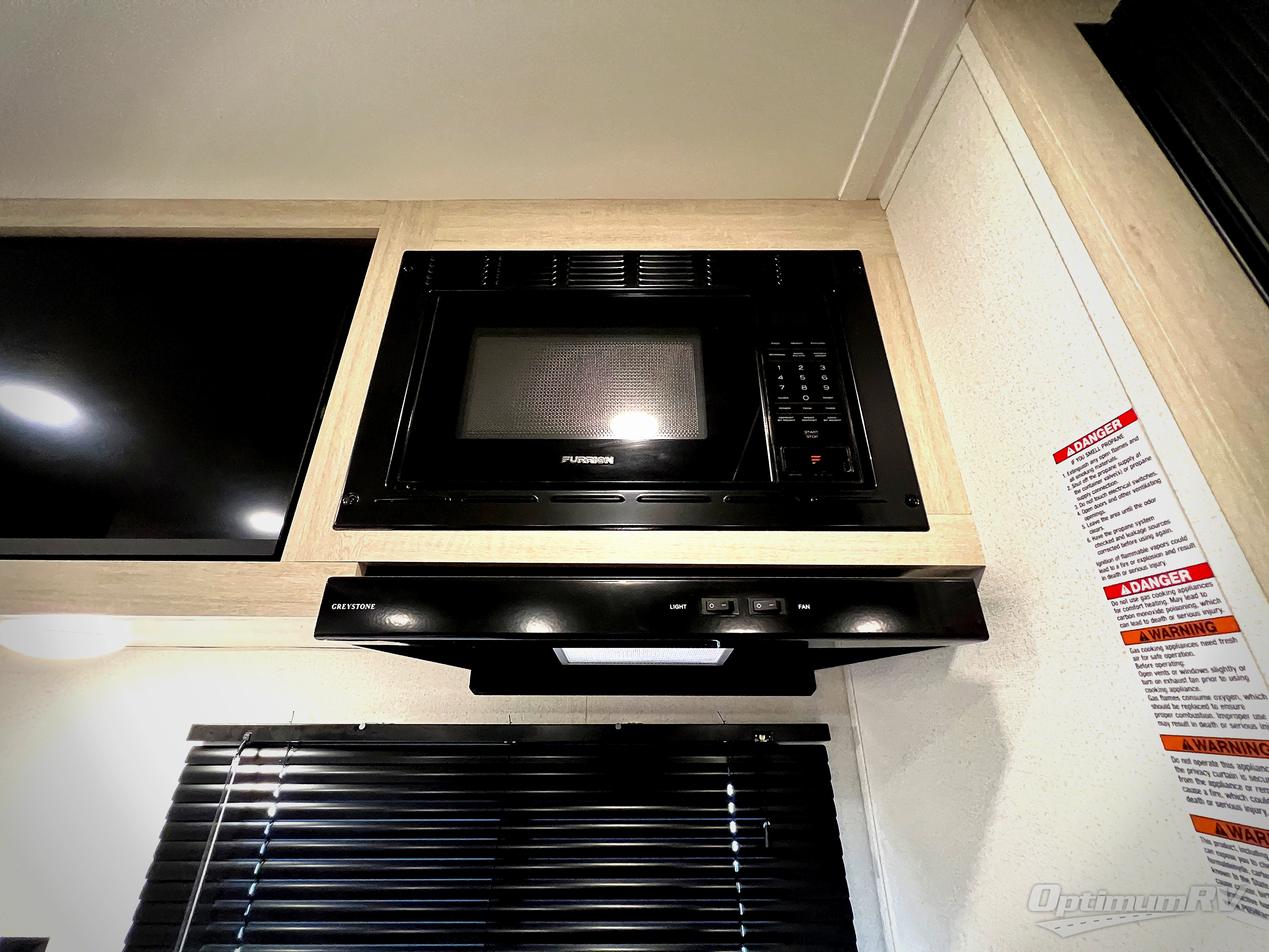 If you're looking for more space, this double axle, double slide out unit is perfect for your group of eight. Within the large slide in the living room, you'll find the booth dinette and sofa, which sit across from the optional TV if you want to enjoy movie nights. The full kitchen includes a stainless microwave and three burner cooktop to make meals, plus a pantry and 12V refrigerator for food storage. And an optional outside kitchen with a griddle can be added if you enjoy cooking outdoors! Your guests or littles are sure to enjoy the rear private bunkhouse that features a set of 38" x 76" bunks across from the third bunk and jiffy sofa within a slide out!