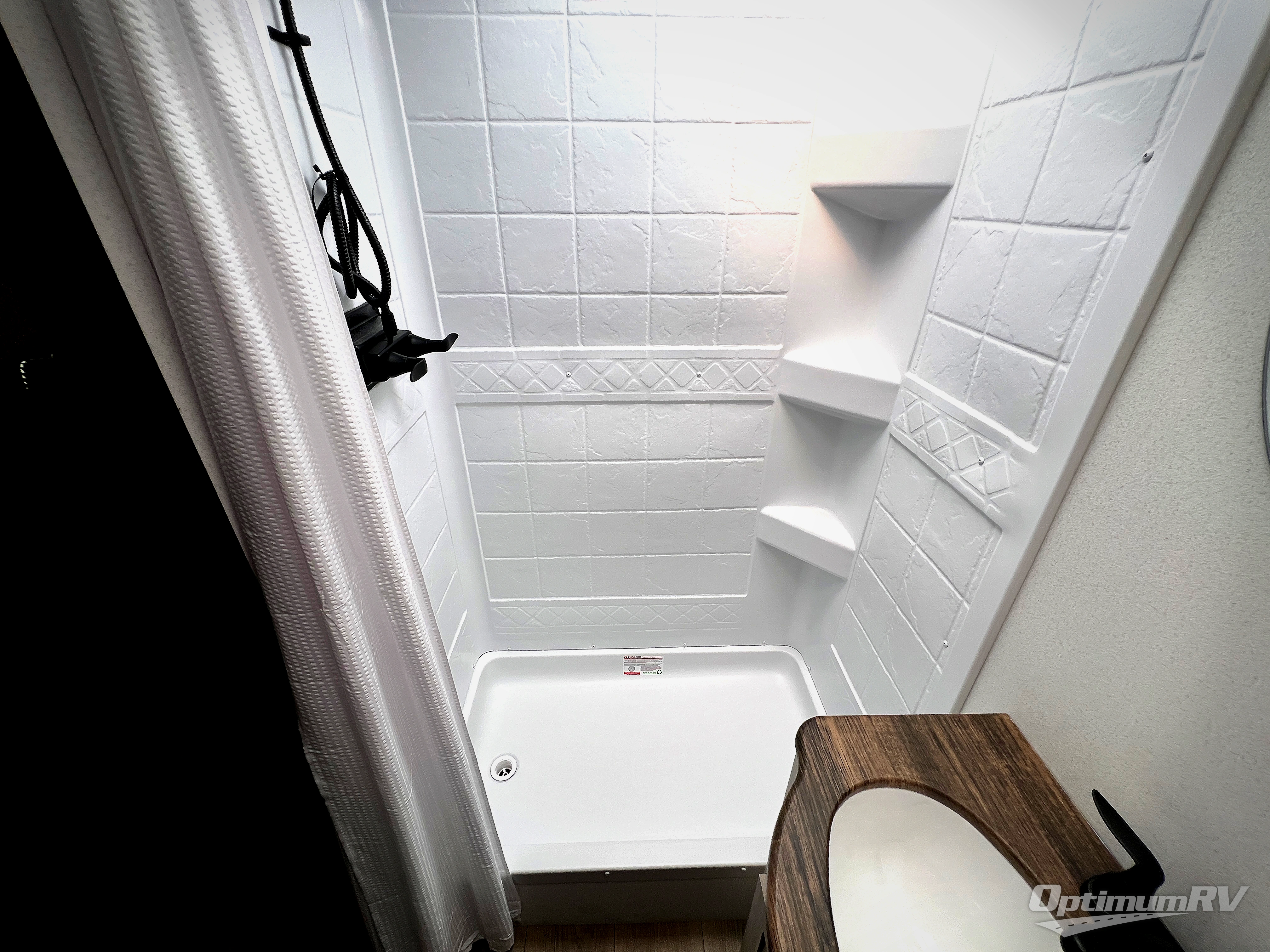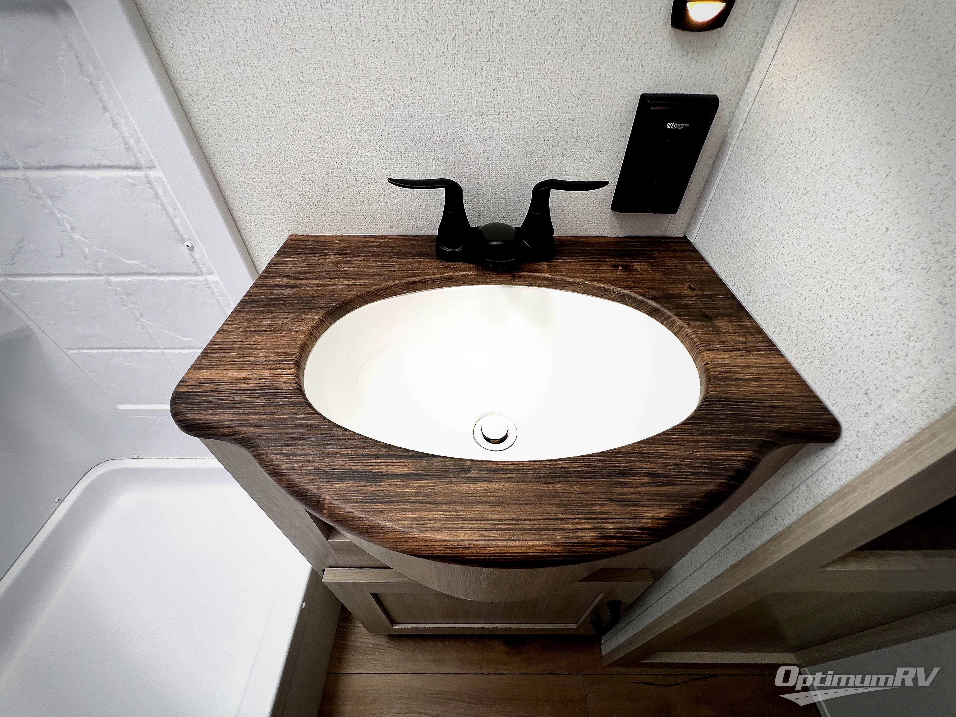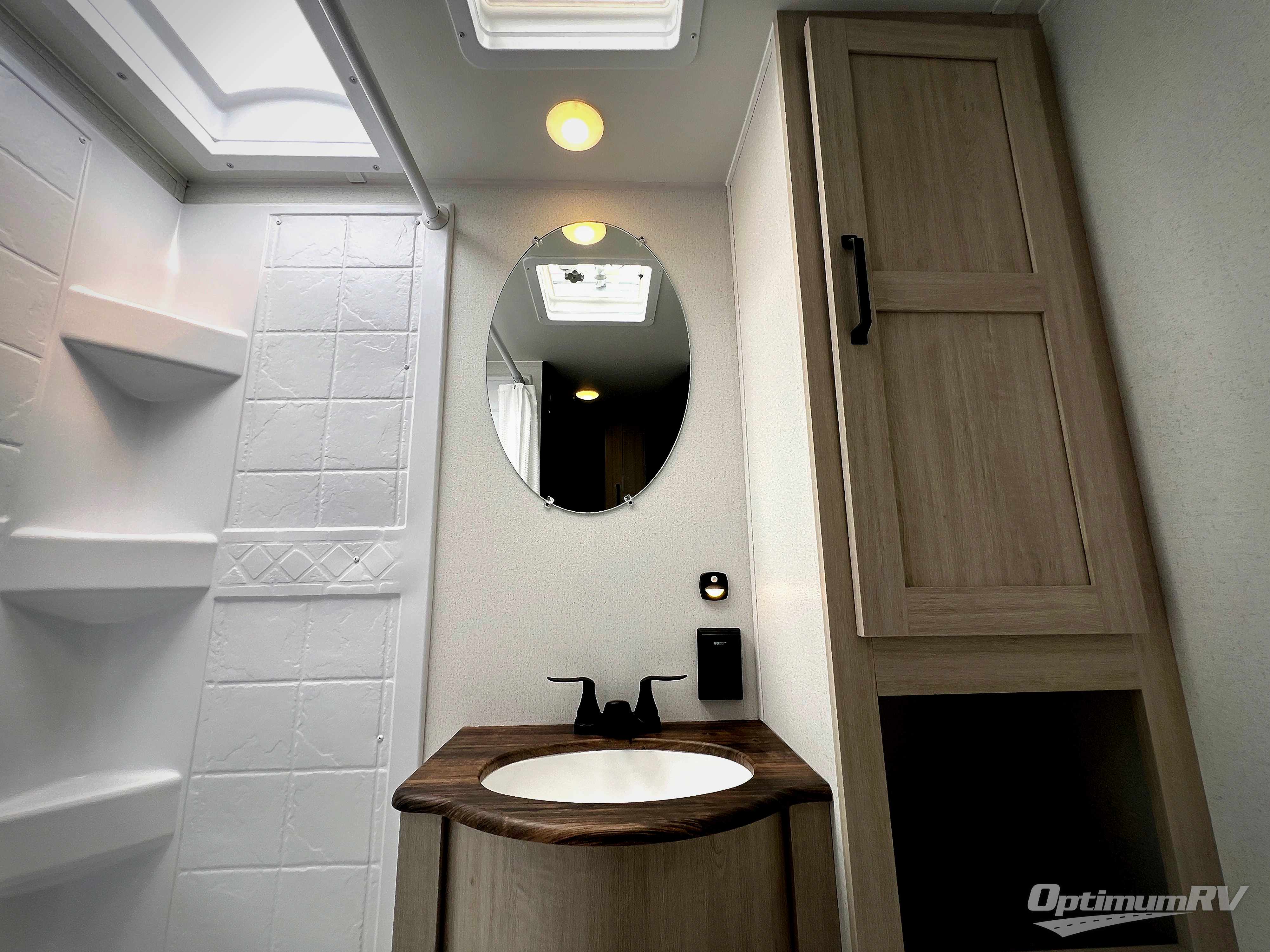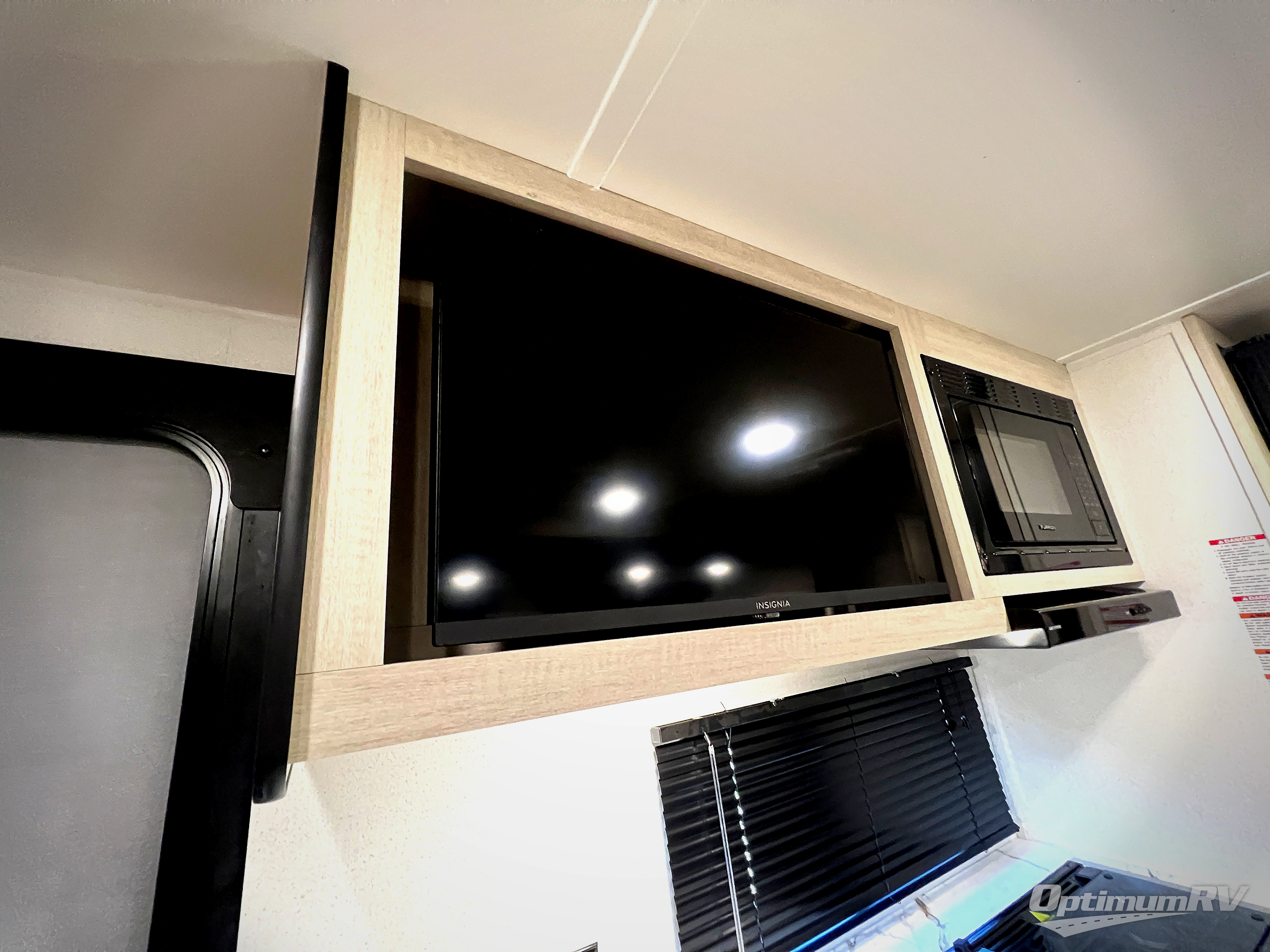 If you're looking for more space, this double axle, double slide out unit is perfect for your group of eight. Within the large slide in the living room, you'll find the booth dinette and sofa, which sit across from the optional TV if you want to enjoy movie nights. The full kitchen includes a stainless microwave and three burner cooktop to make meals, plus a pantry and 12V refrigerator for food storage. And an optional outside kitchen with a griddle can be added if you enjoy cooking outdoors! Your guests or littles are sure to enjoy the rear private bunkhouse that features a set of 38" x 76" bunks across from the third bunk and jiffy sofa within a slide out!