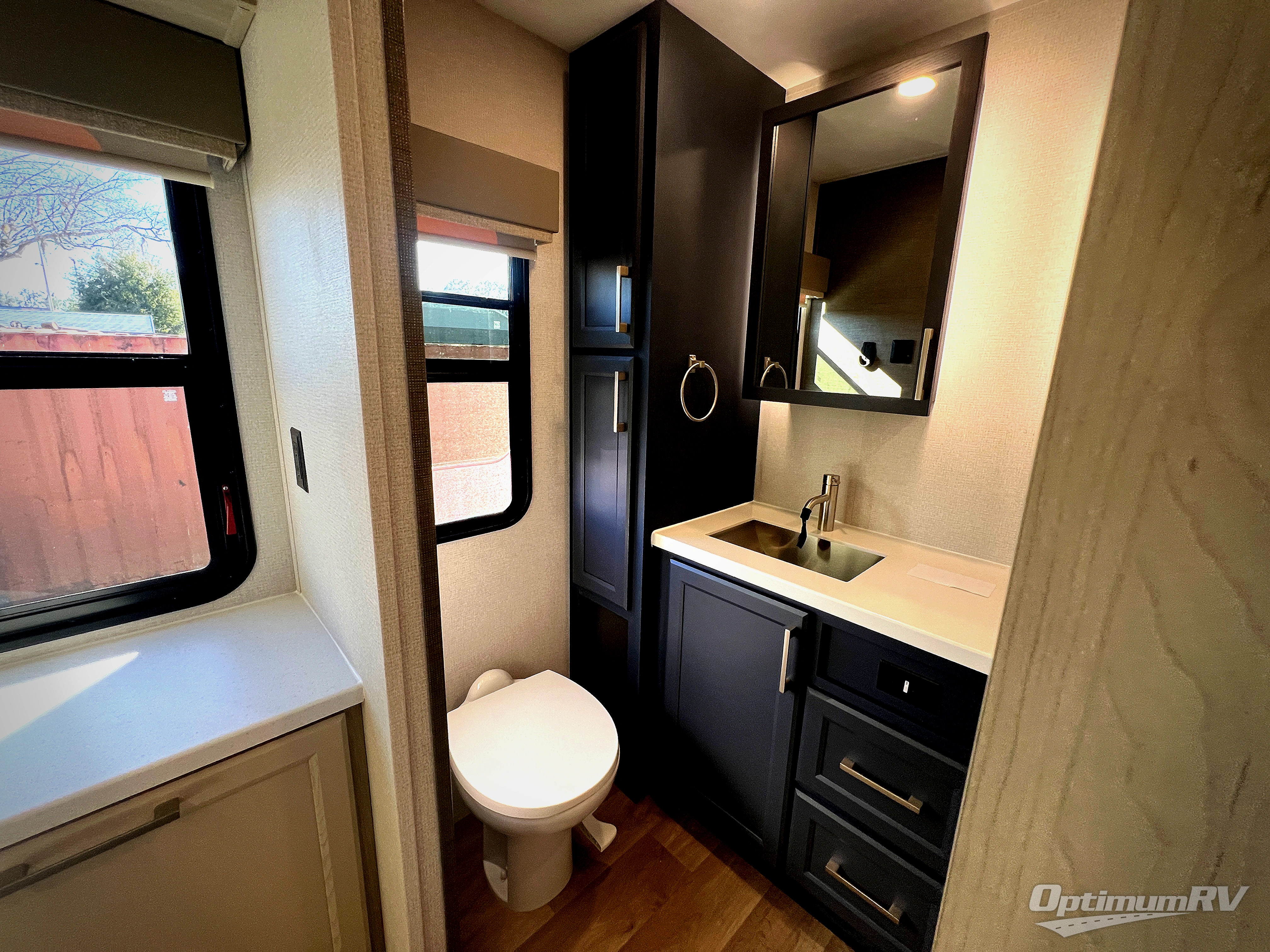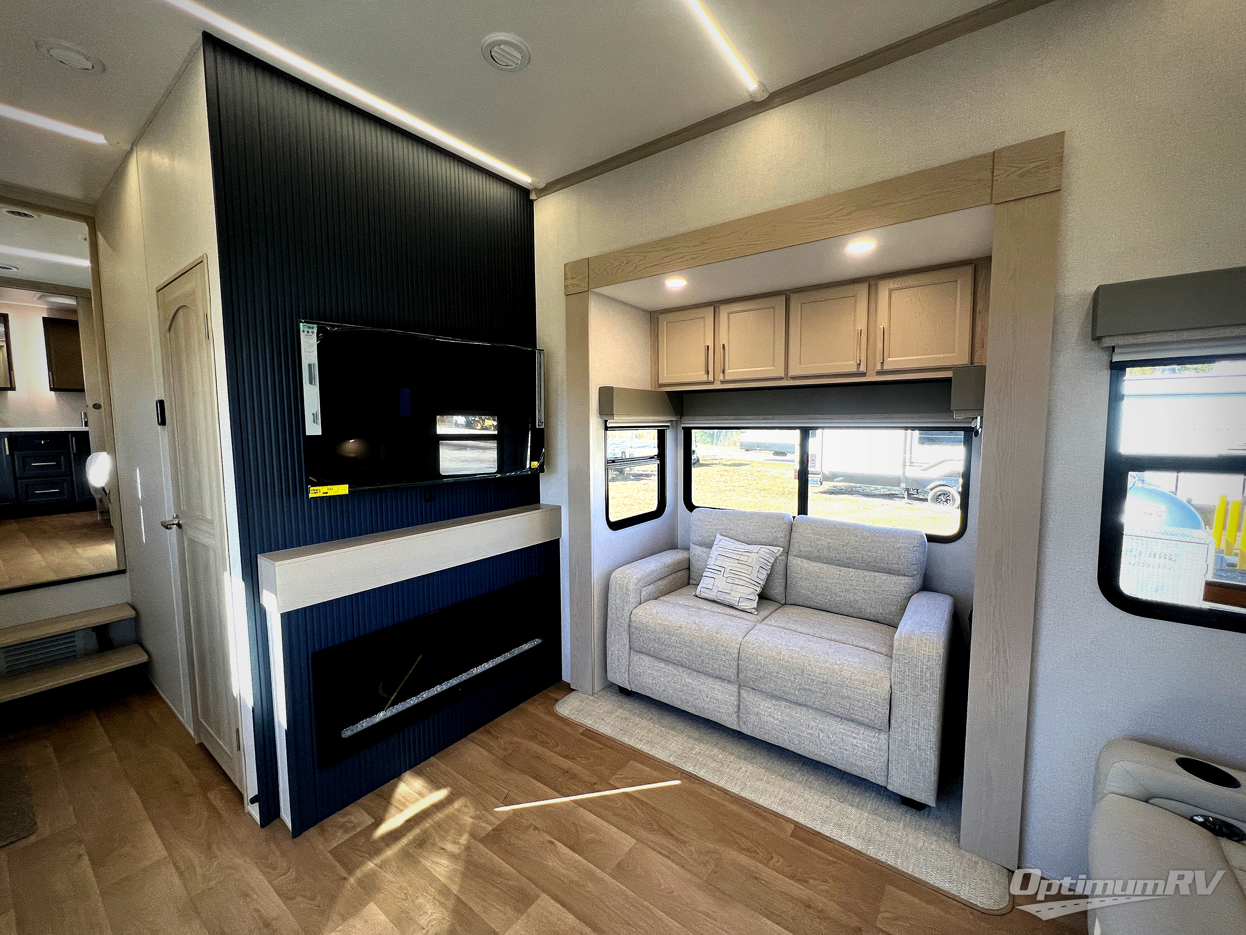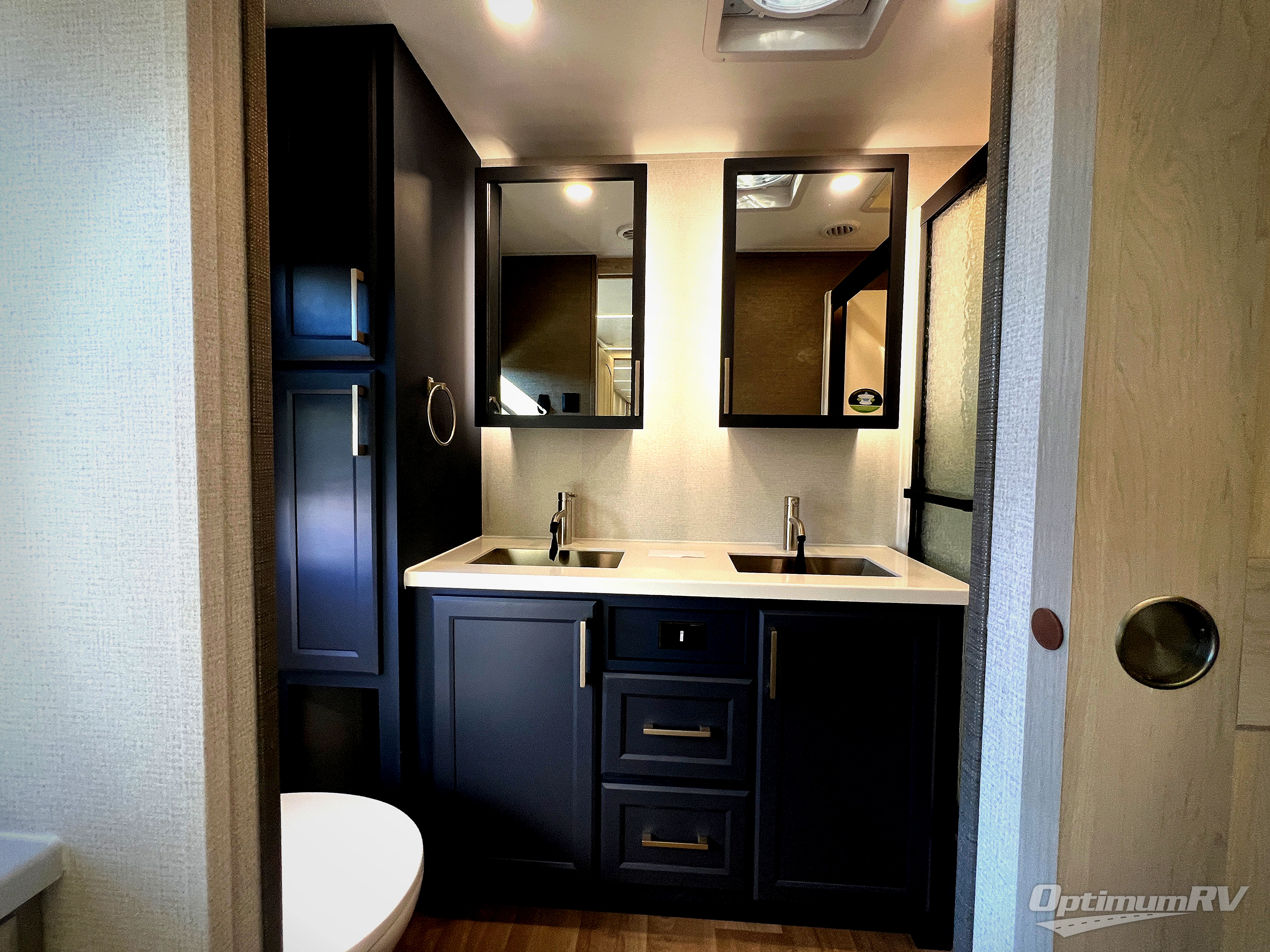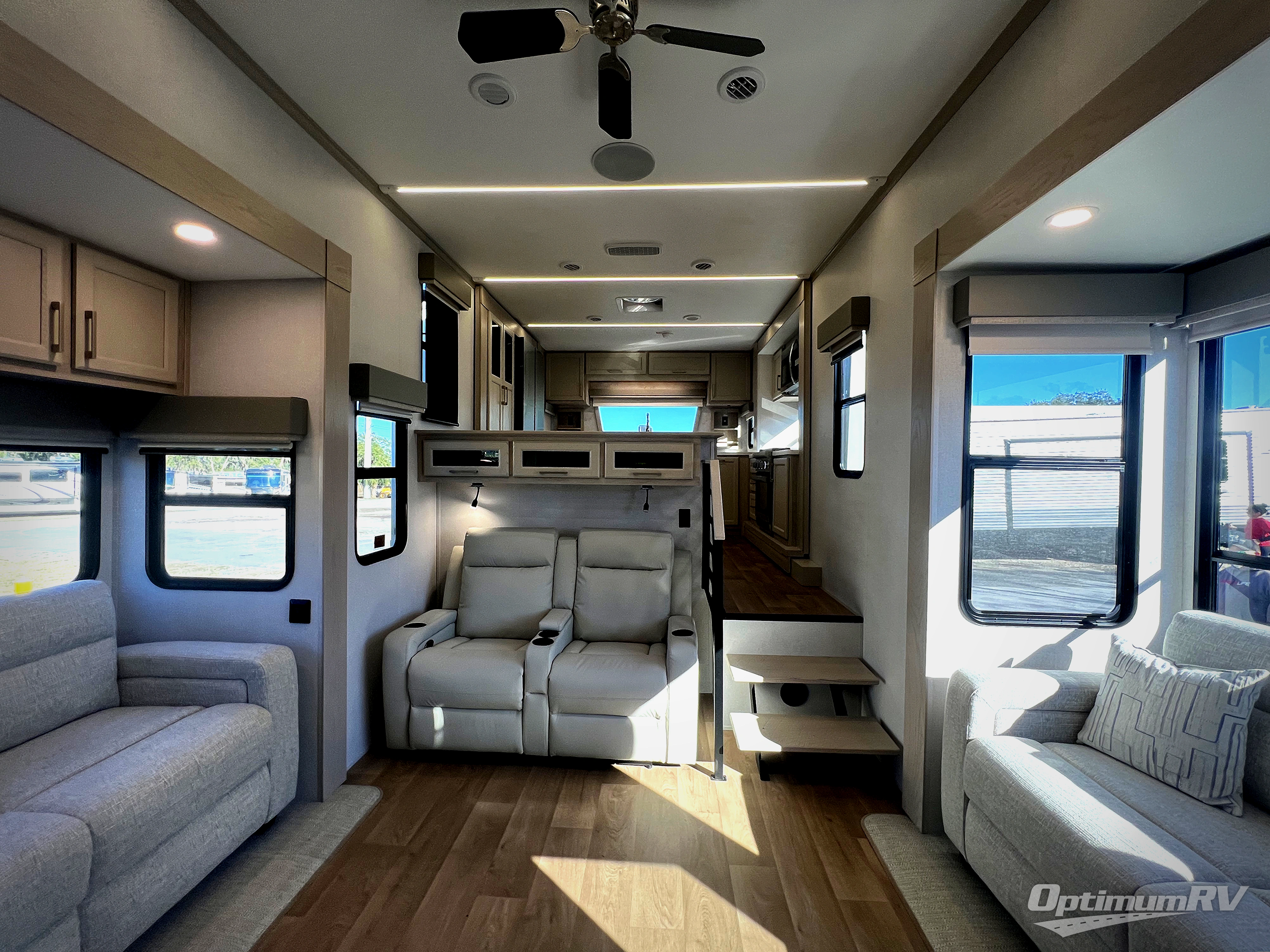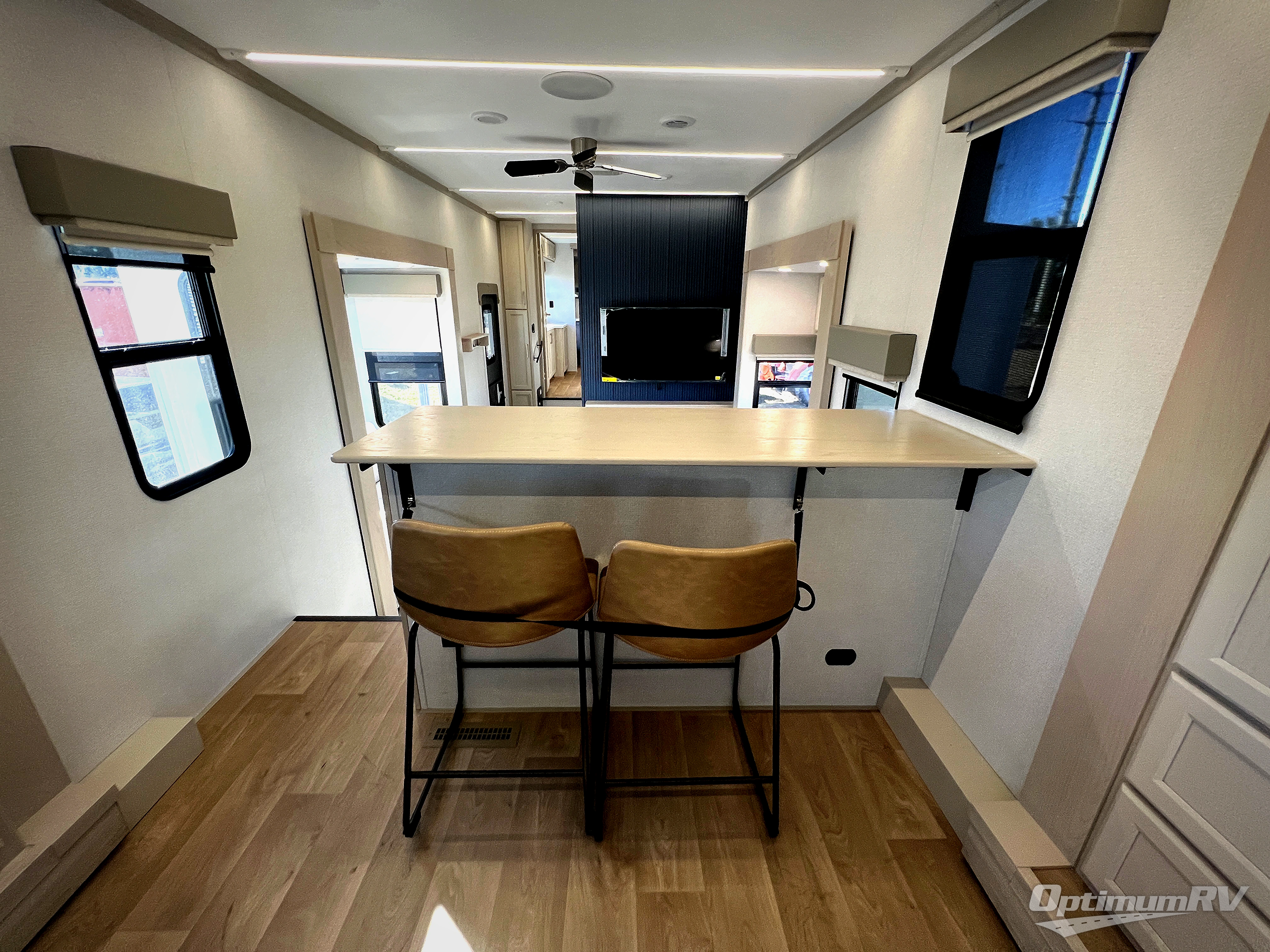 The front kitchen in this fifth wheel is a chef's dream come true while camping! There is generous counter space up front and beside the range, plus a pantry and 12V refrigerator with an ice maker. There is also a hi-top table with two bar stools that overlooks the living area. Inside the living area there are opposing sofa sleeper slides and power theater seating across from an entertainment center with a 50" Smart TV. A mid-coach half bath is easily accessible, and the full rear bath with dual bath sinks will create a master bedroom you are sure to love. There is a king bed slide out, a wardrobe, hamper, and a TV/storage.