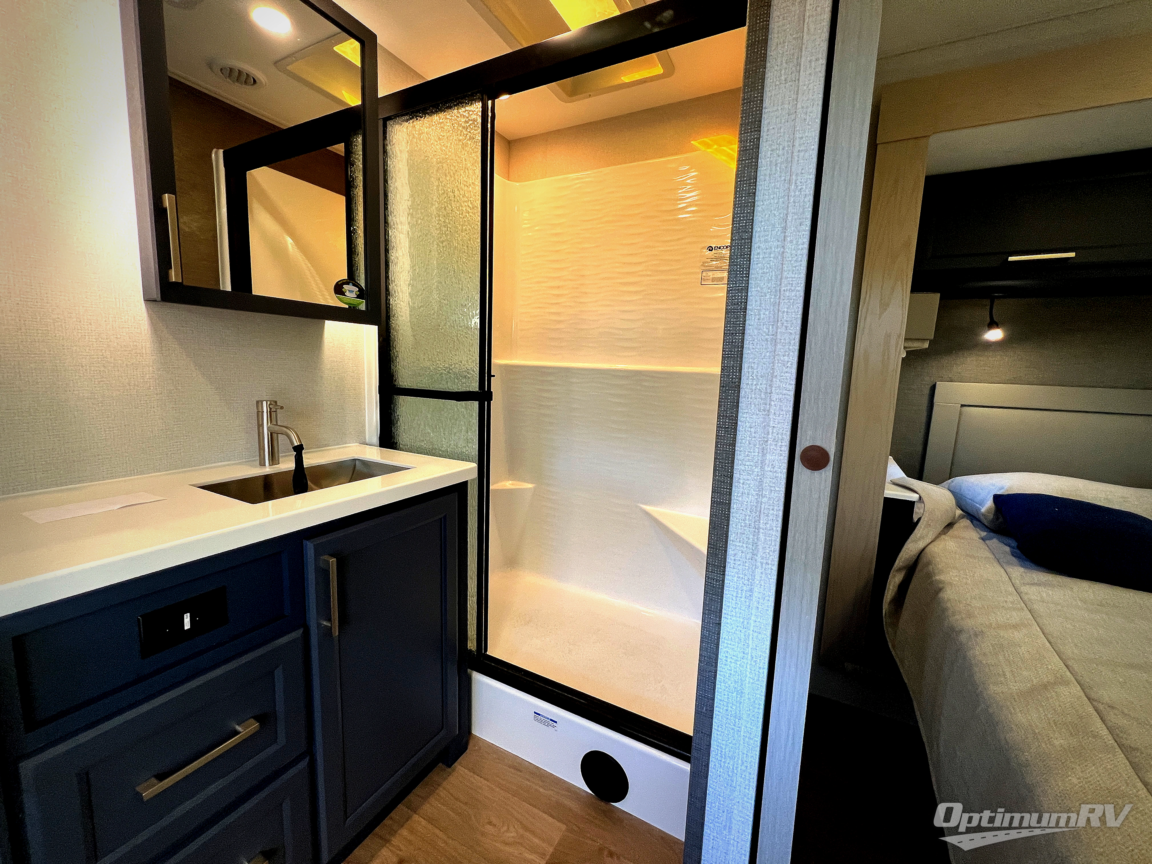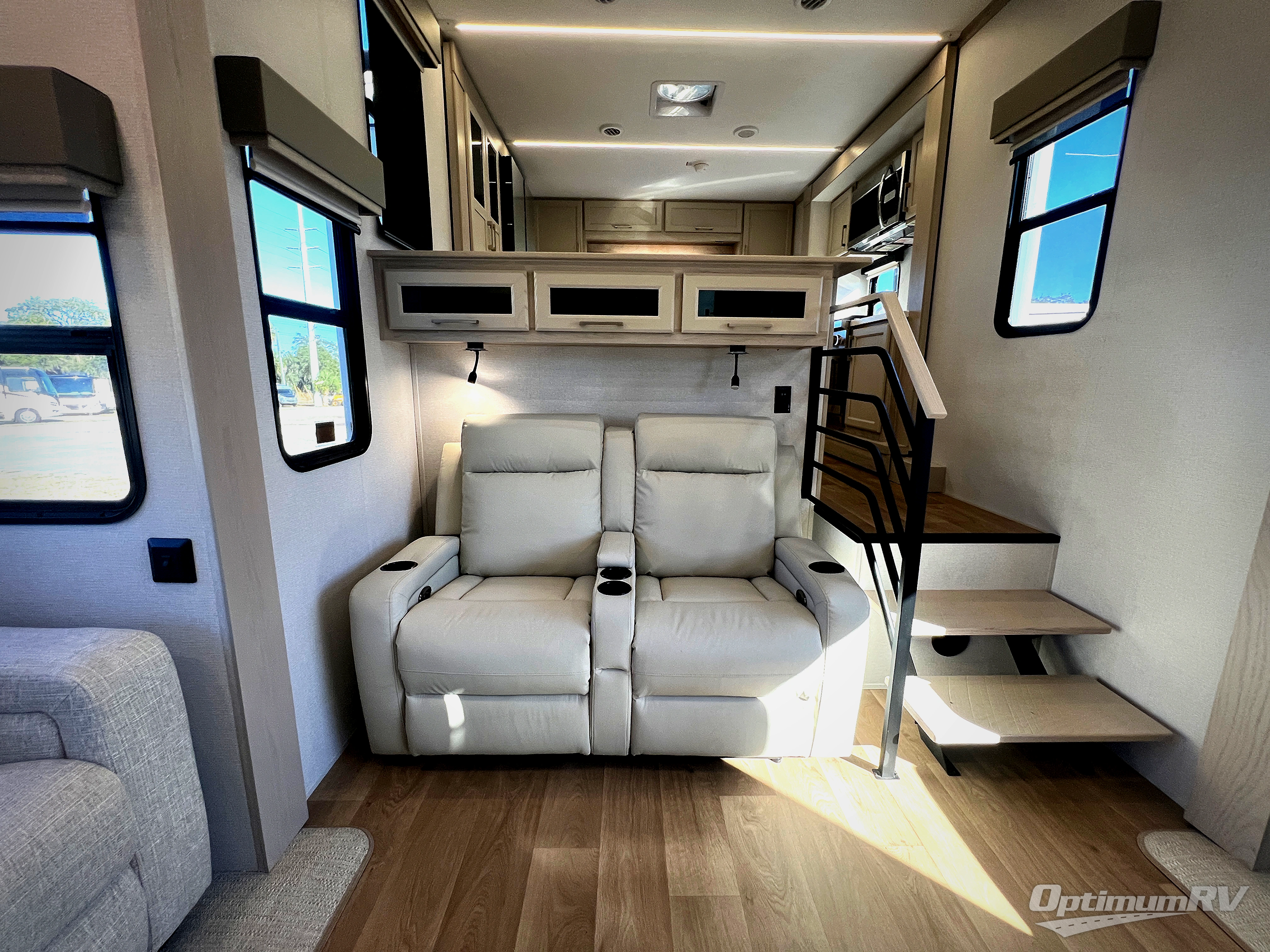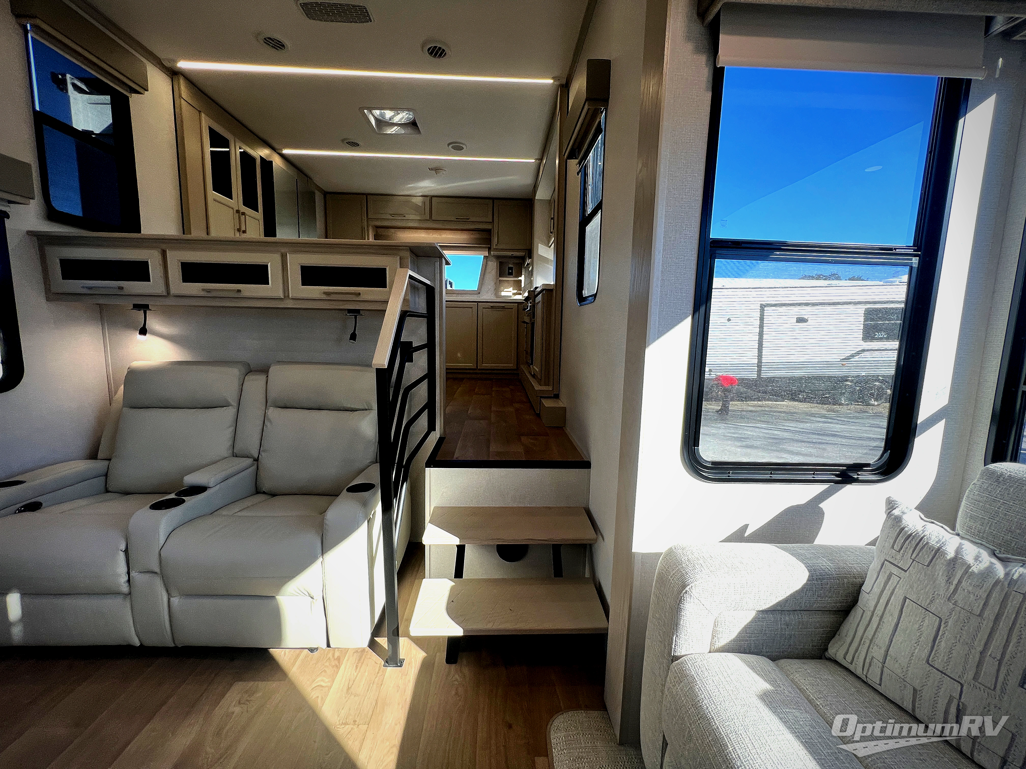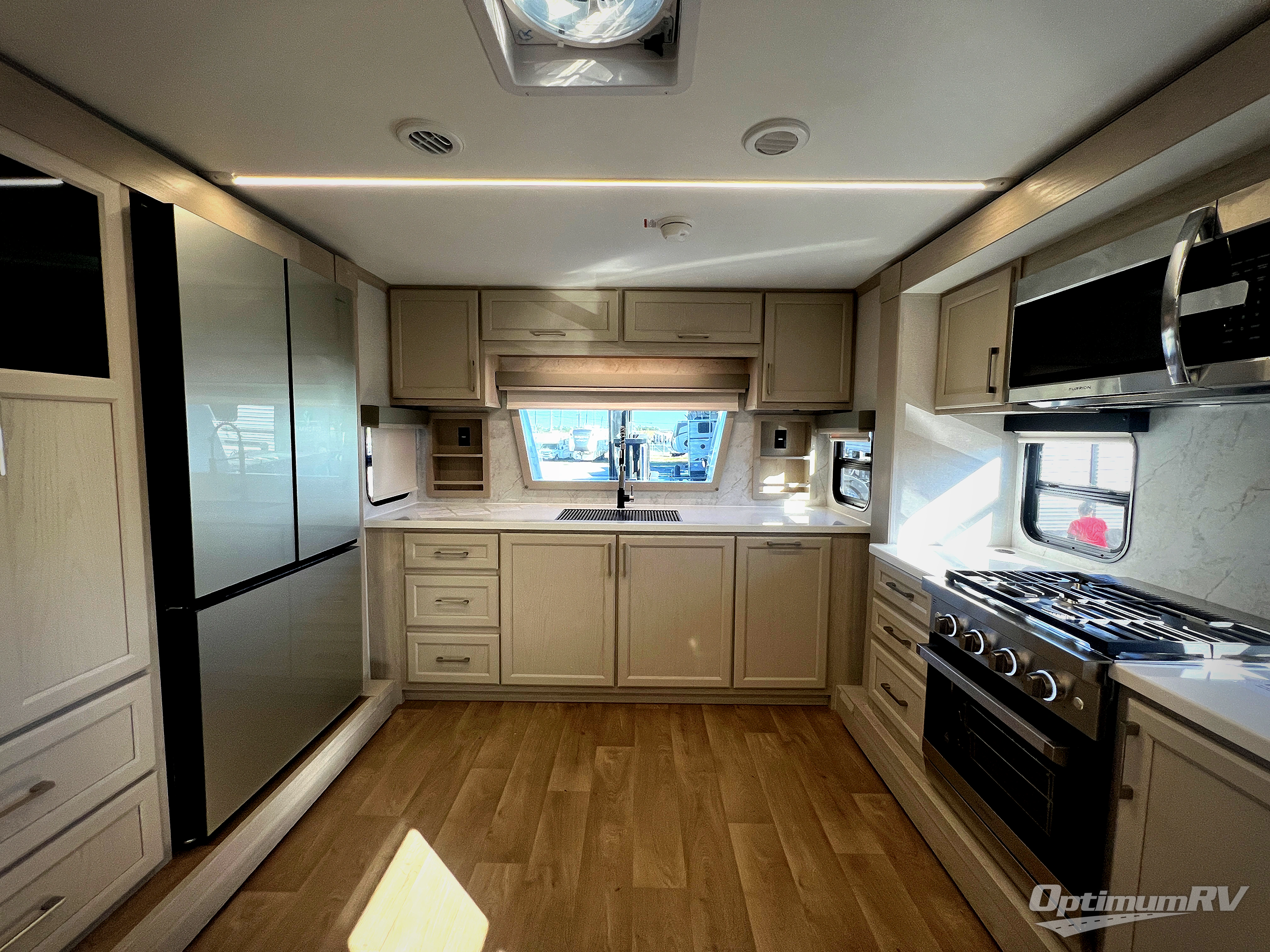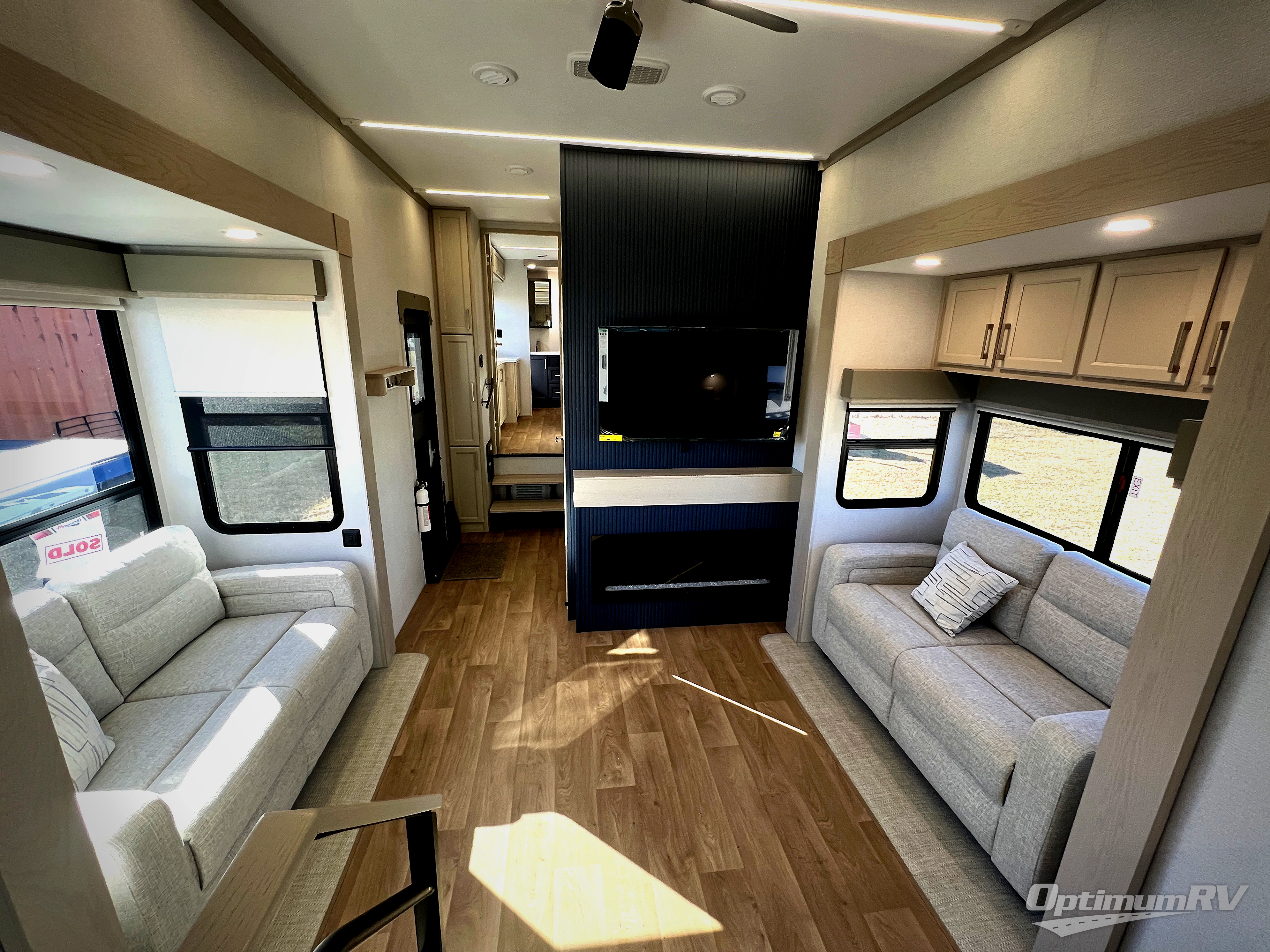 The front kitchen in this fifth wheel is a chef's dream come true while camping! There is generous counter space up front and beside the range, plus a pantry and 12V refrigerator with an ice maker. There is also a hi-top table with two bar stools that overlooks the living area. Inside the living area there are opposing sofa sleeper slides and power theater seating across from an entertainment center with a 50" Smart TV. A mid-coach half bath is easily accessible, and the full rear bath with dual bath sinks will create a master bedroom you are sure to love. There is a king bed slide out, a wardrobe, hamper, and a TV/storage.