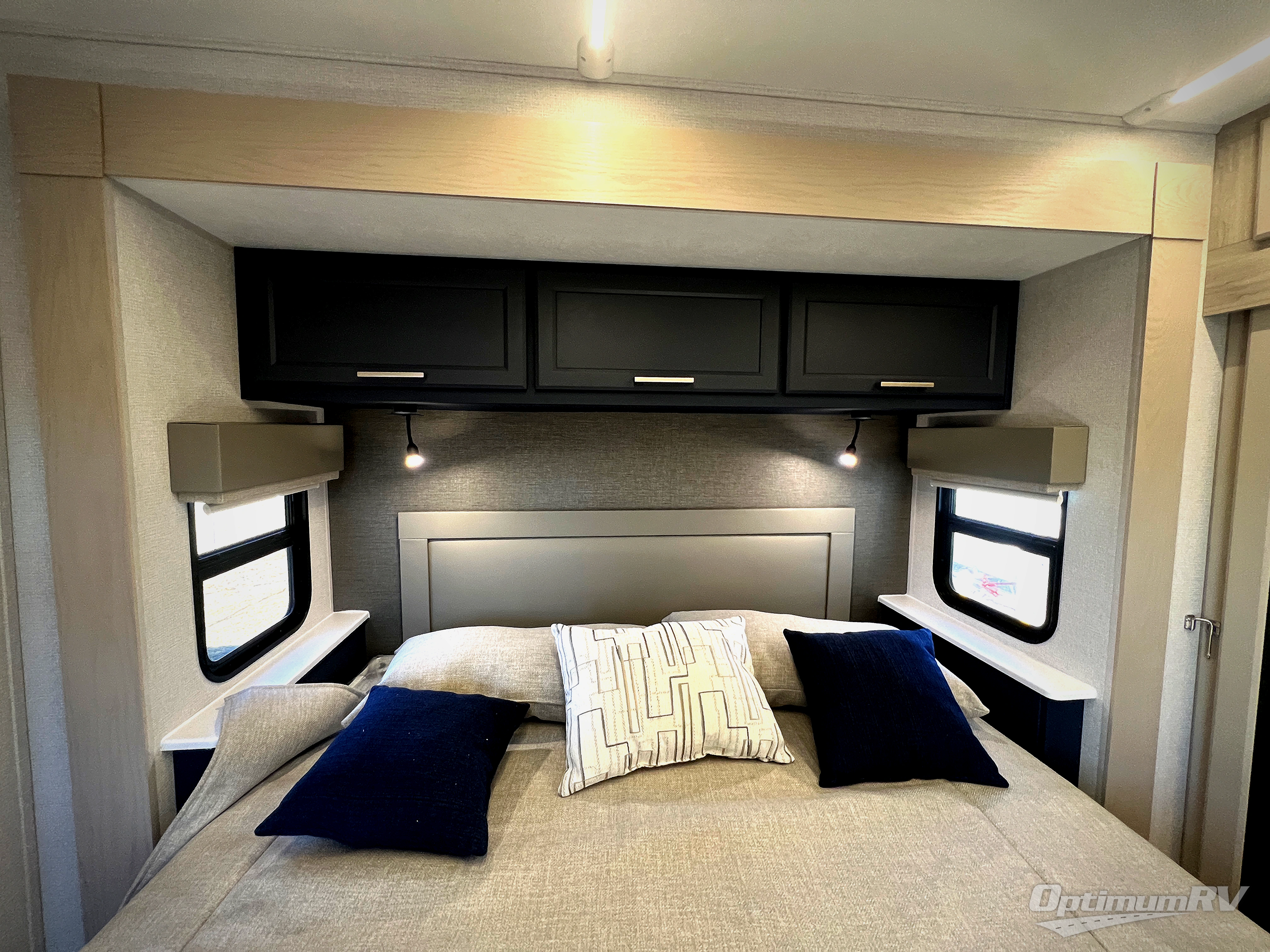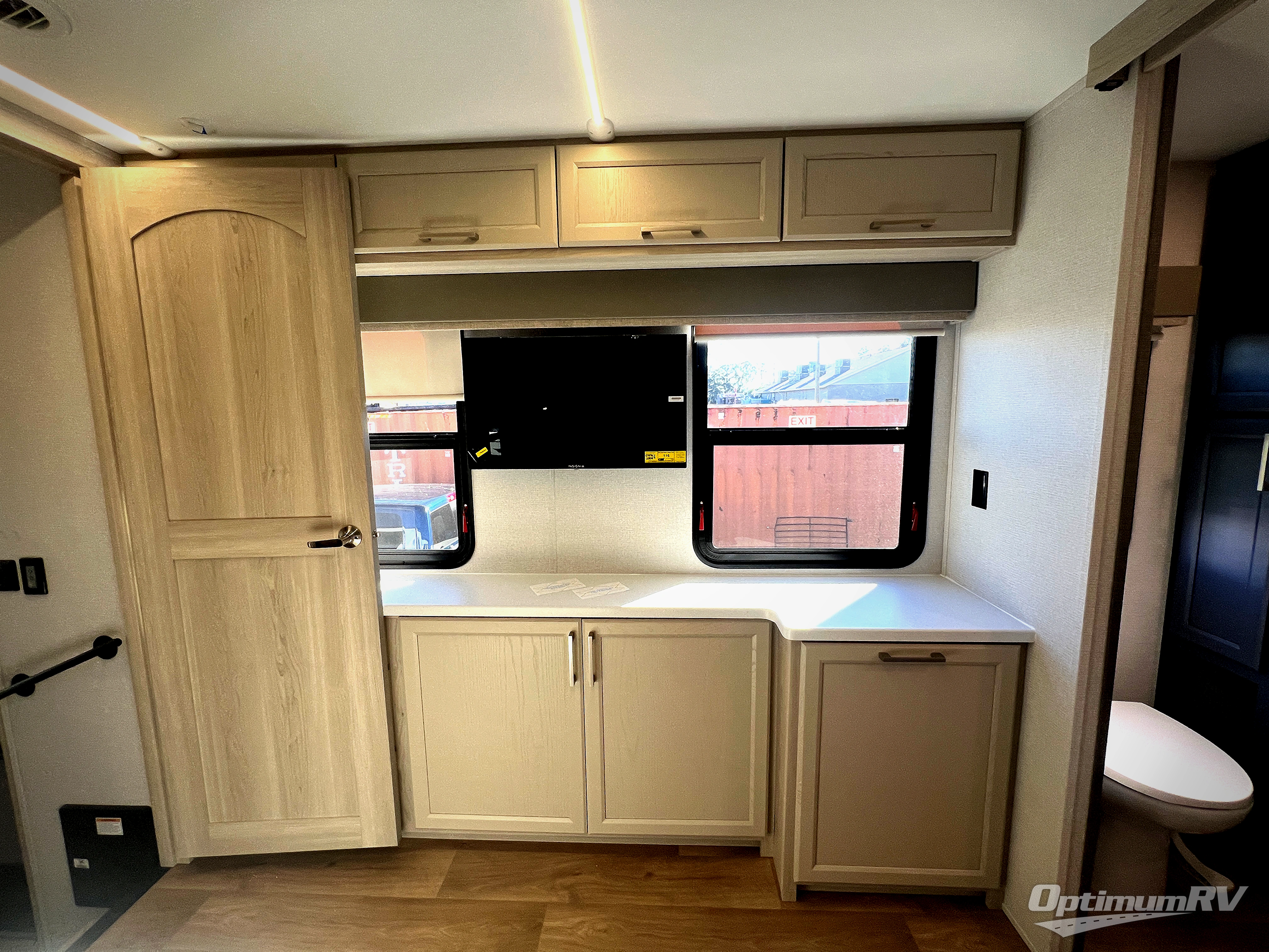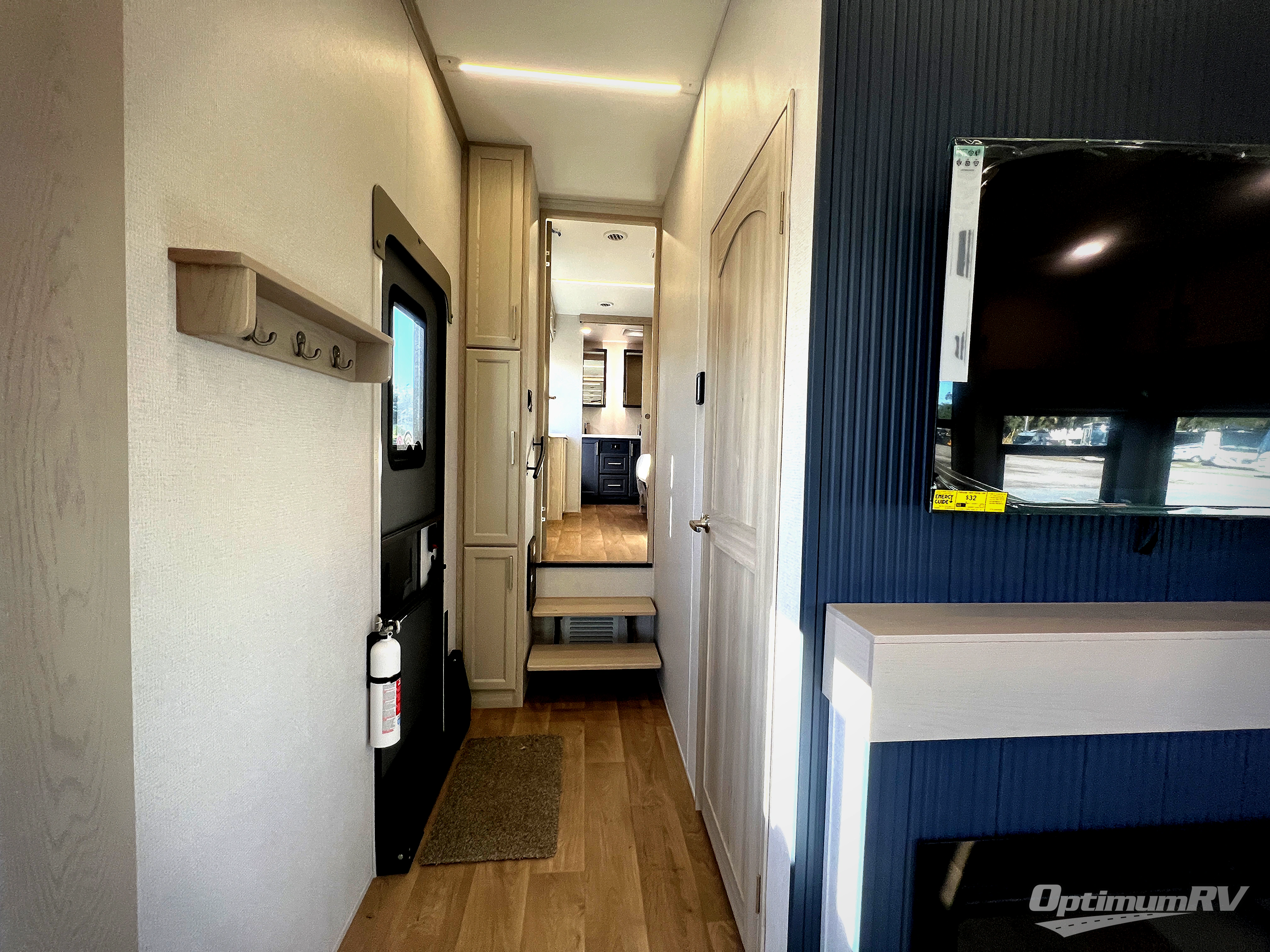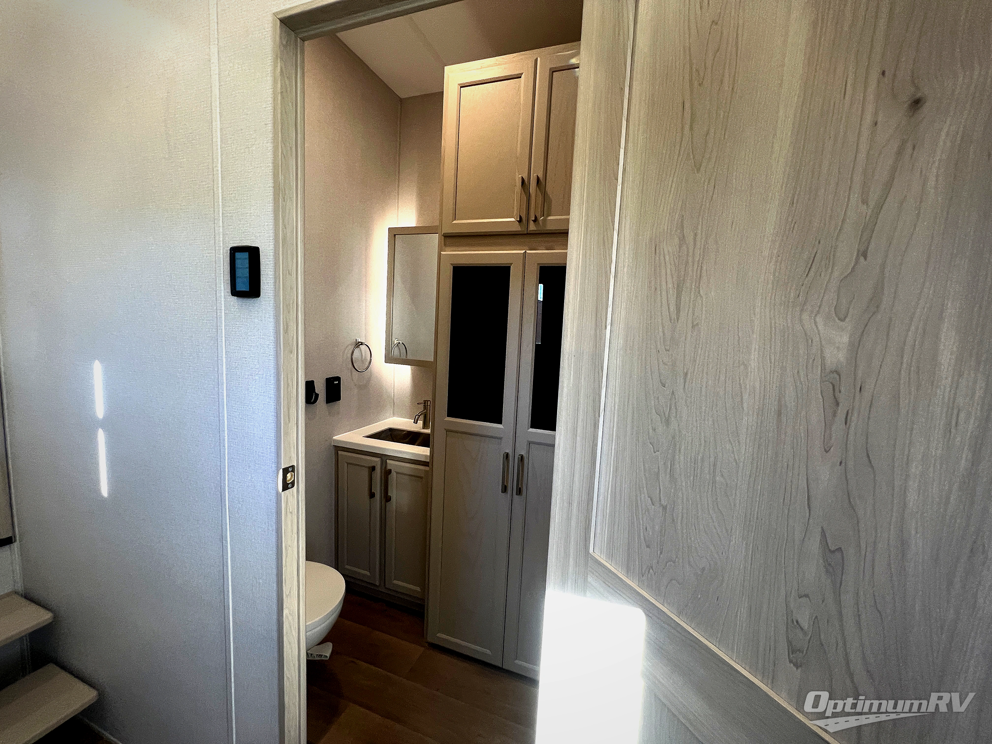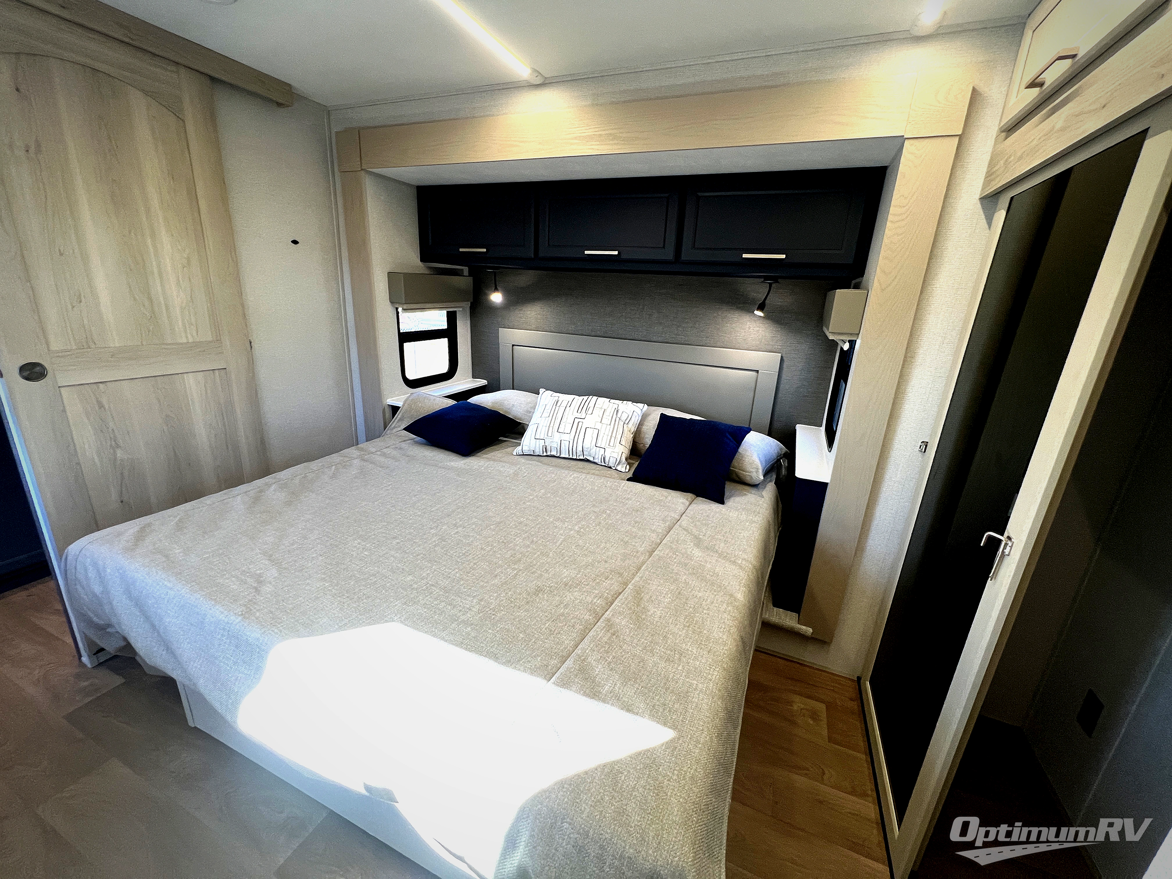The front kitchen in this fifth wheel is a chef's dream come true while camping! There is generous counter space up front and beside the range, plus a pantry and 12V refrigerator with an ice maker. There is also a hi-top table with two bar stools that overlooks the living area. Inside the living area there are opposing sofa sleeper slides and power theater seating across from an entertainment center with a 50" Smart TV. A mid-coach half bath is easily accessible, and the full rear bath with dual bath sinks will create a master bedroom you are sure to love. There is a king bed slide out, a wardrobe, hamper, and a TV/storage.
