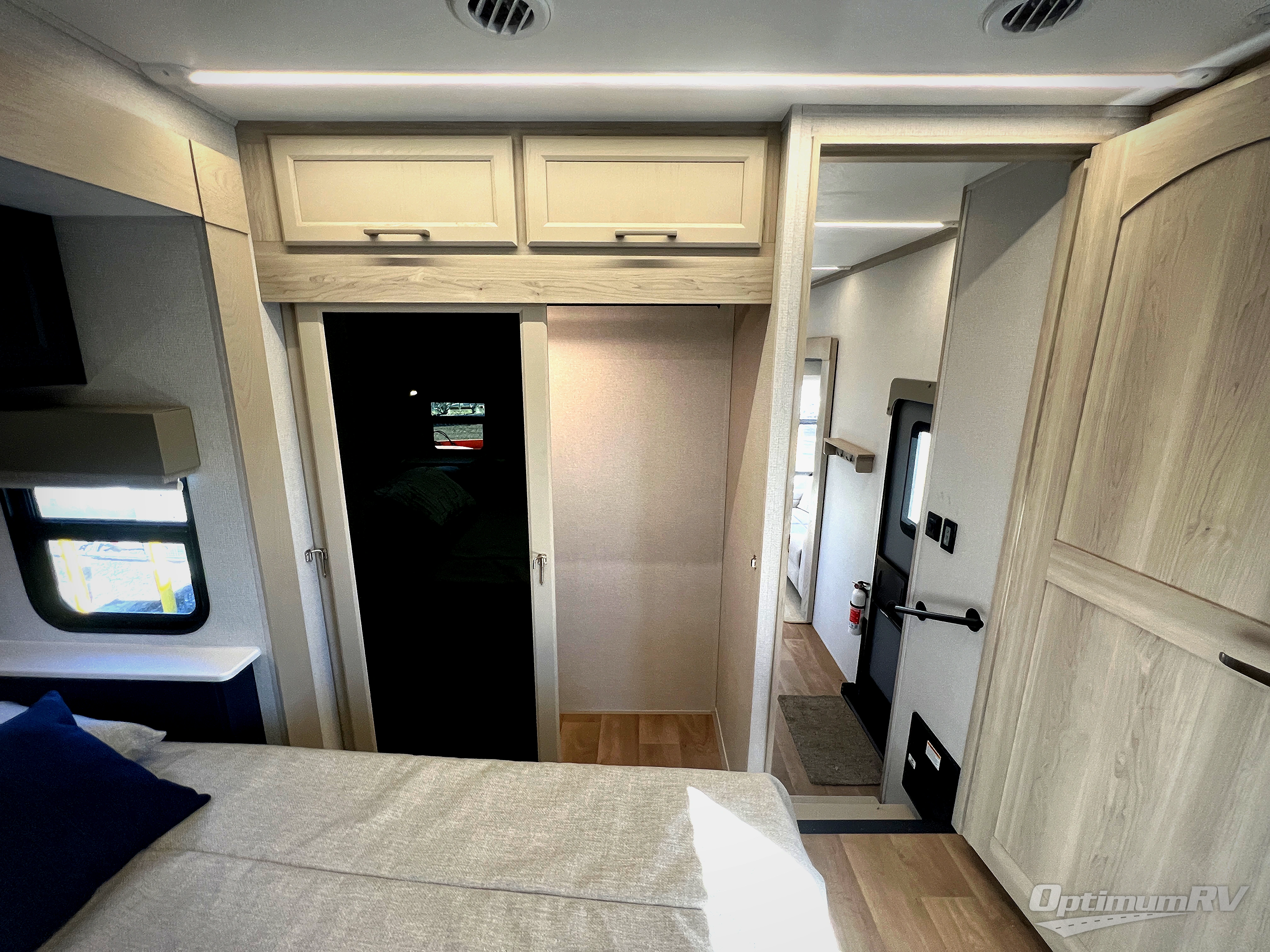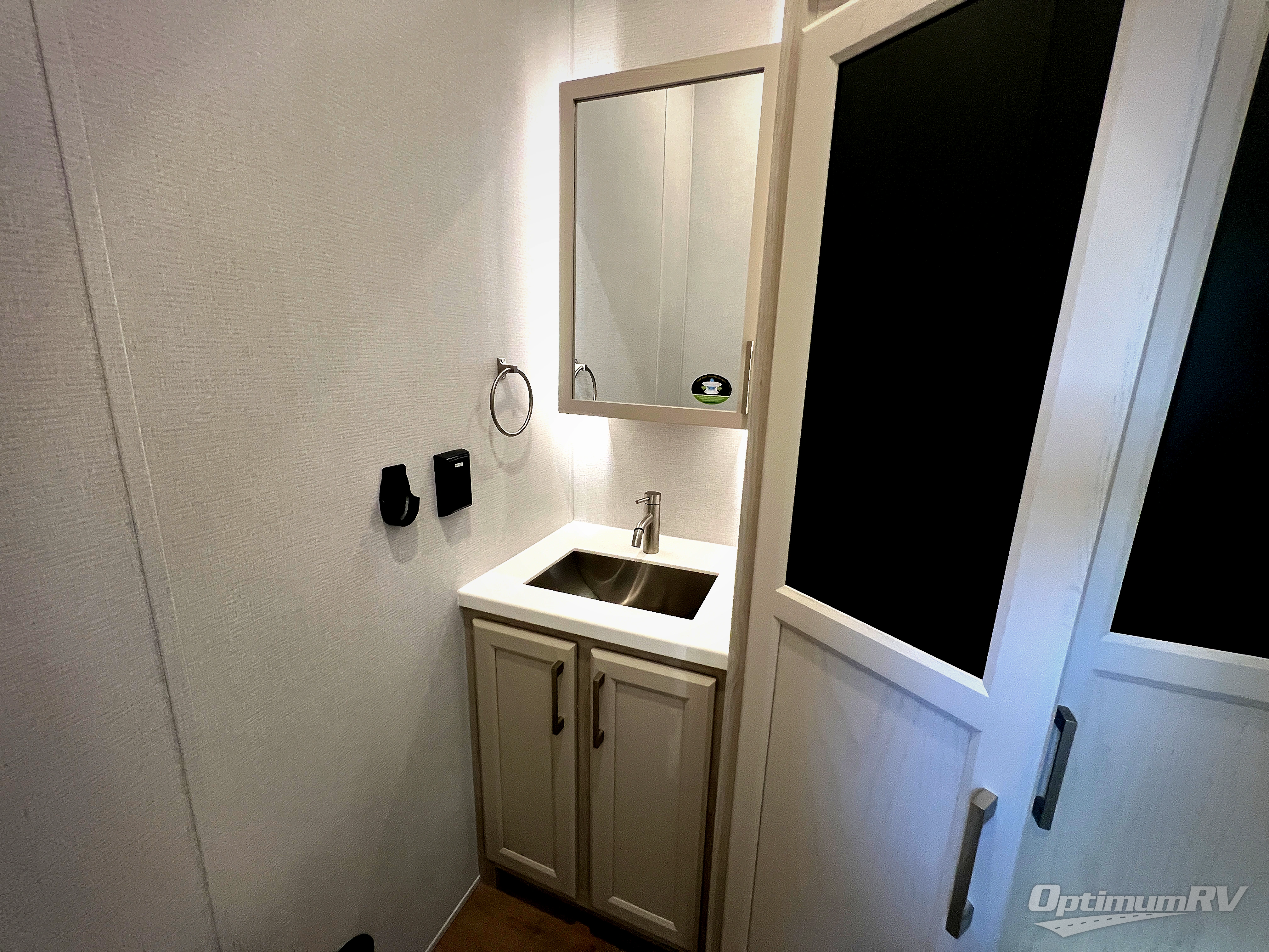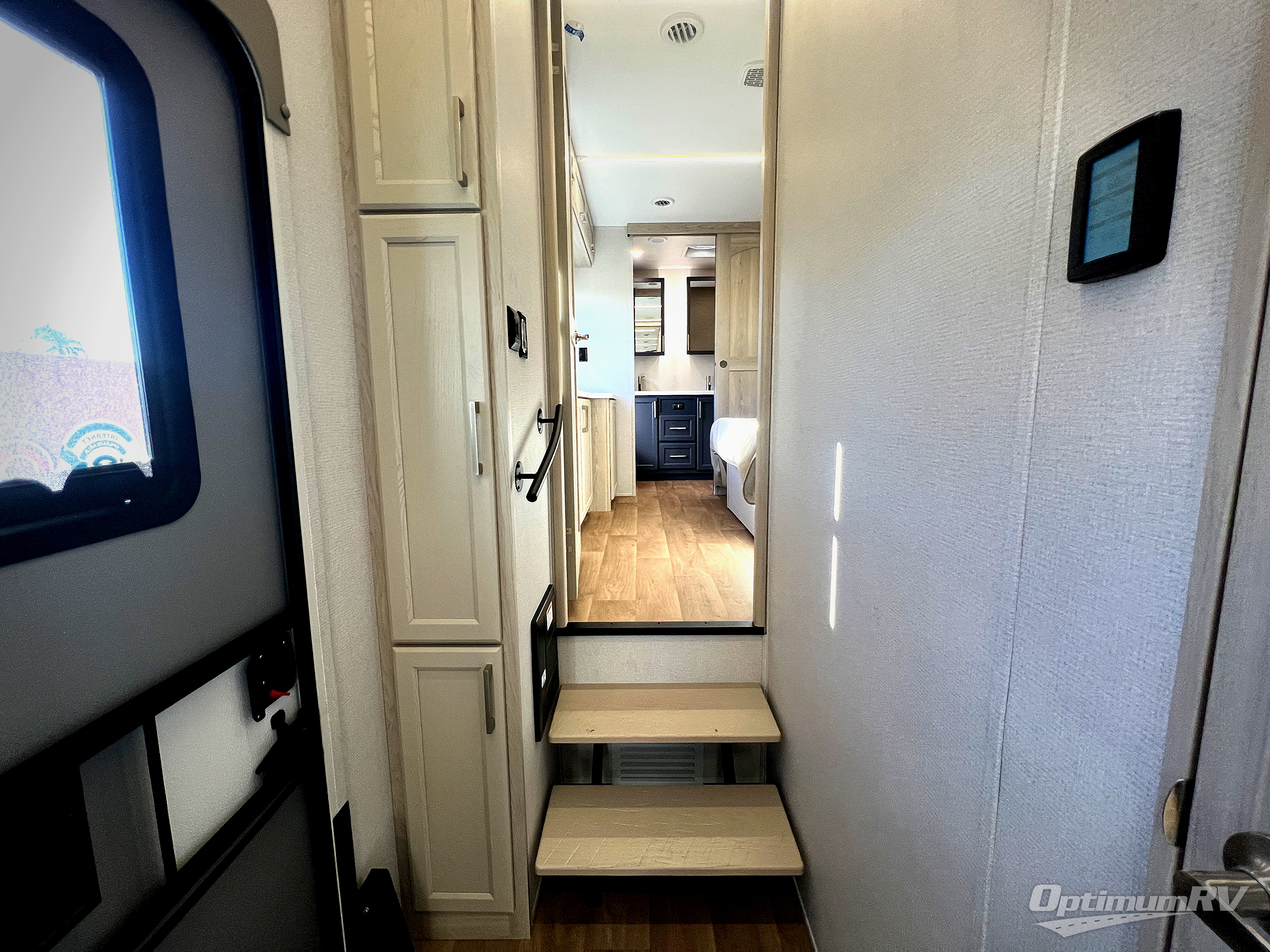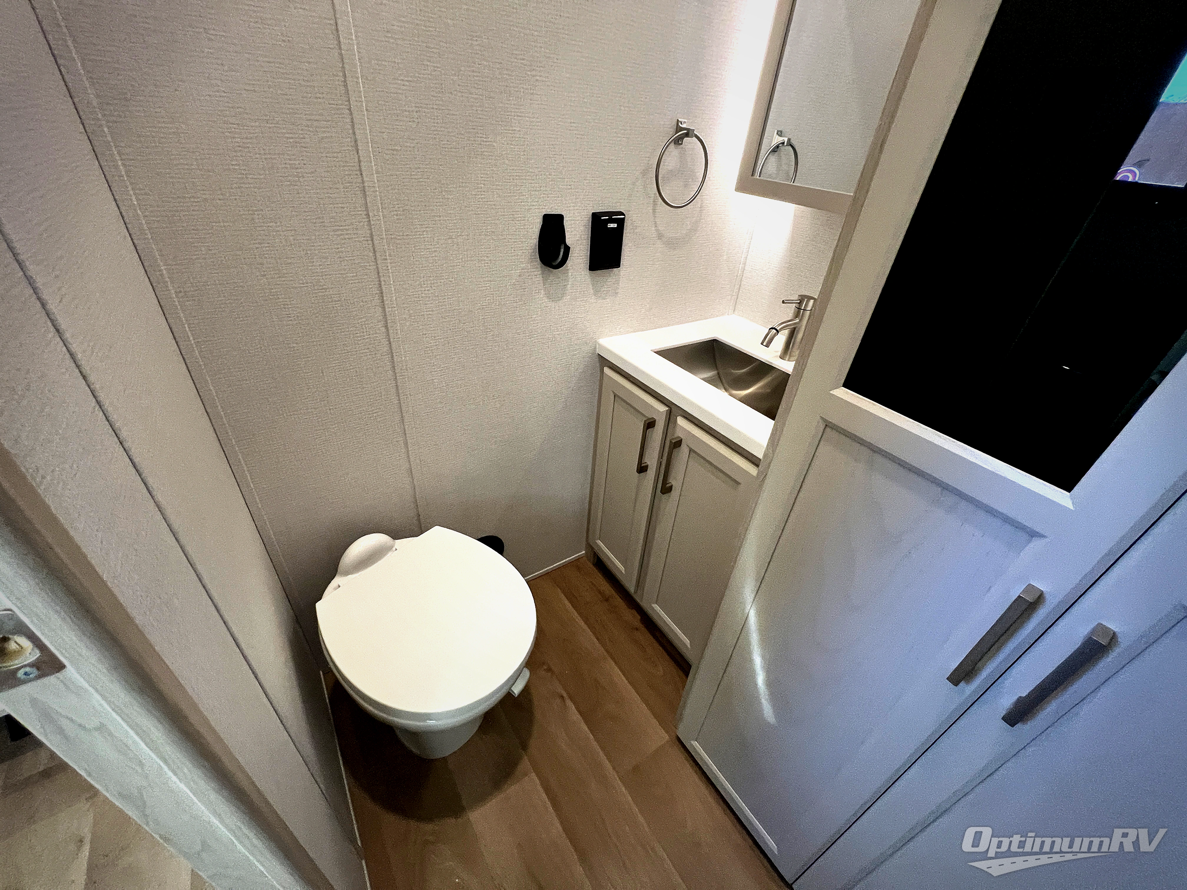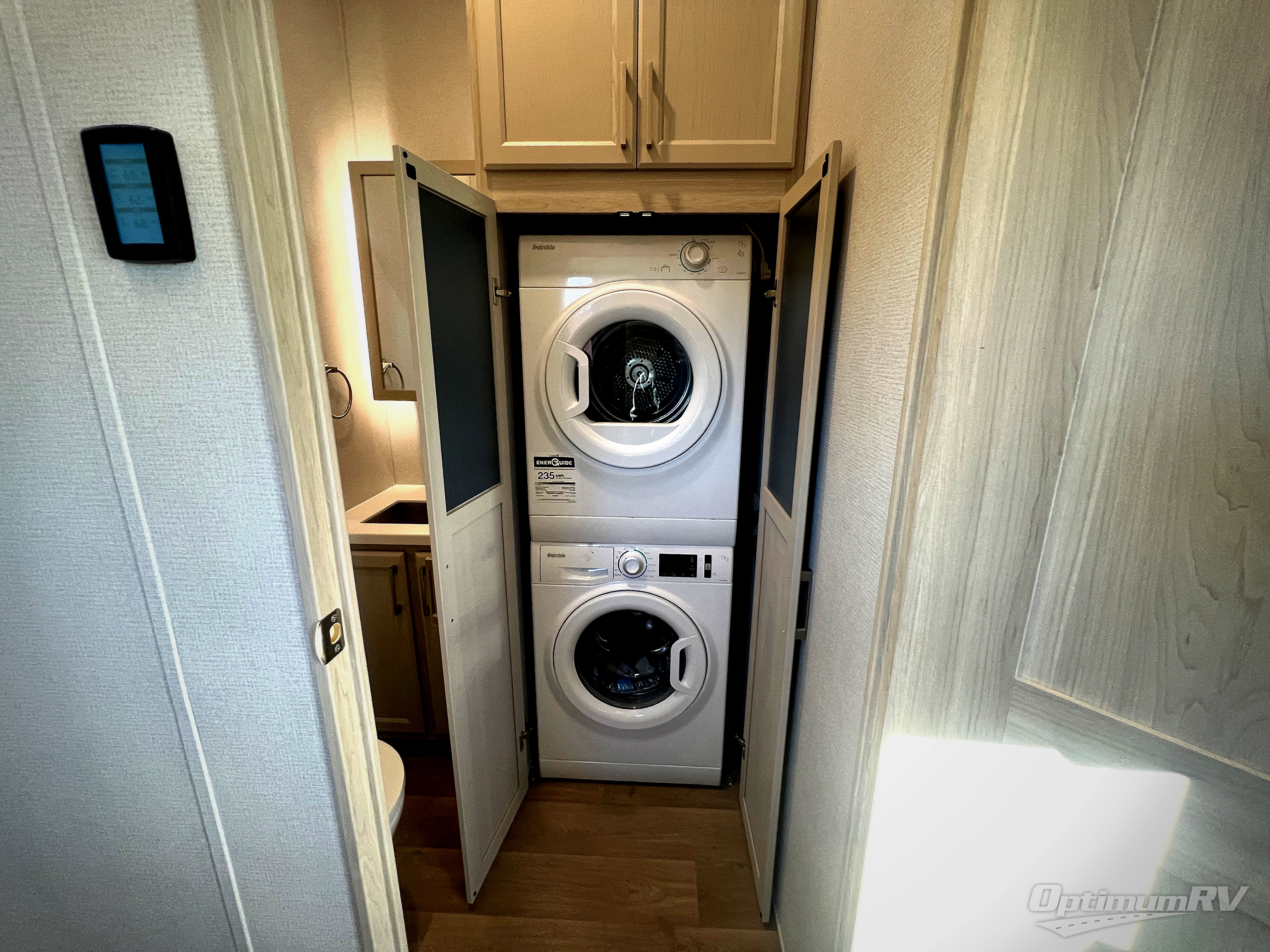 The front kitchen in this fifth wheel is a chef's dream come true while camping! There is generous counter space up front and beside the range, plus a pantry and 12V refrigerator with an ice maker. There is also a hi-top table with two bar stools that overlooks the living area. Inside the living area there are opposing sofa sleeper slides and power theater seating across from an entertainment center with a 50" Smart TV. A mid-coach half bath is easily accessible, and the full rear bath with dual bath sinks will create a master bedroom you are sure to love. There is a king bed slide out, a wardrobe, hamper, and a TV/storage.