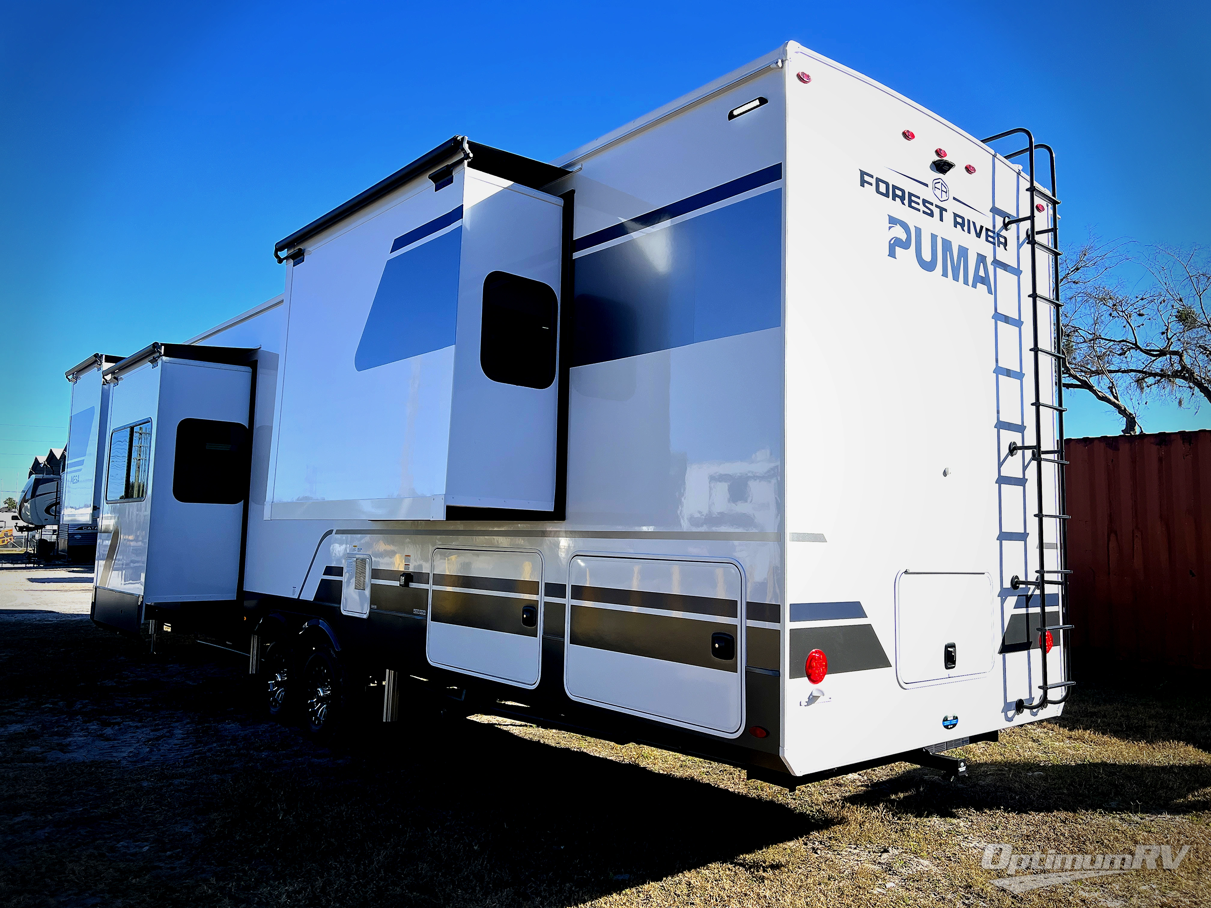 With the Puma Mesa fifth wheel by Forest River redefine your camping experience with a perfect blend of practical living, durable construction, and high-end style! These models are built on a rock-solid foundation featuring an all-welded aluminum frame superstructure and high gloss fiberglass vacuum bonded walls with Dual Azdel for long-lasting quality. The expansive 101" wide-body design maximizes interior space, and the worry-free composite slide floors provide excellent stability. Outside, the Puma Mesa ensures effortless travel and setup with a standard 6-point hydraulic leveling system and reliable 7,000 lb. axles with ABS and a Tire Pressure Monitoring System (TPMS). These fifth wheels also include practical features like a heated utility convenience center, 12V heat pads on all holding tanks for extended season use, and convenient slam latches on all storage doors. You will also love the outdoor living space created by the power awnings with LED lights and the accessibility provided by the standard ladder!