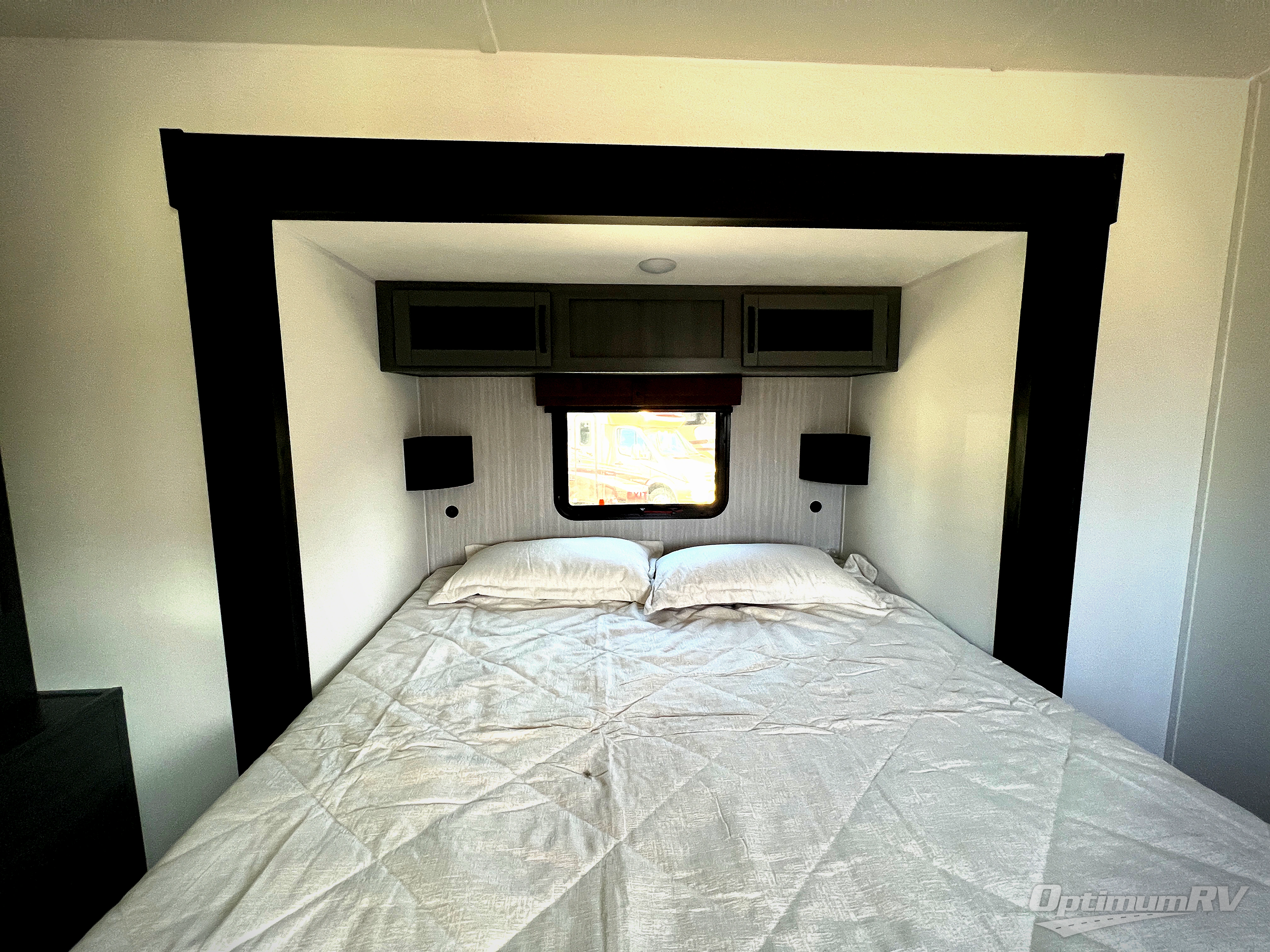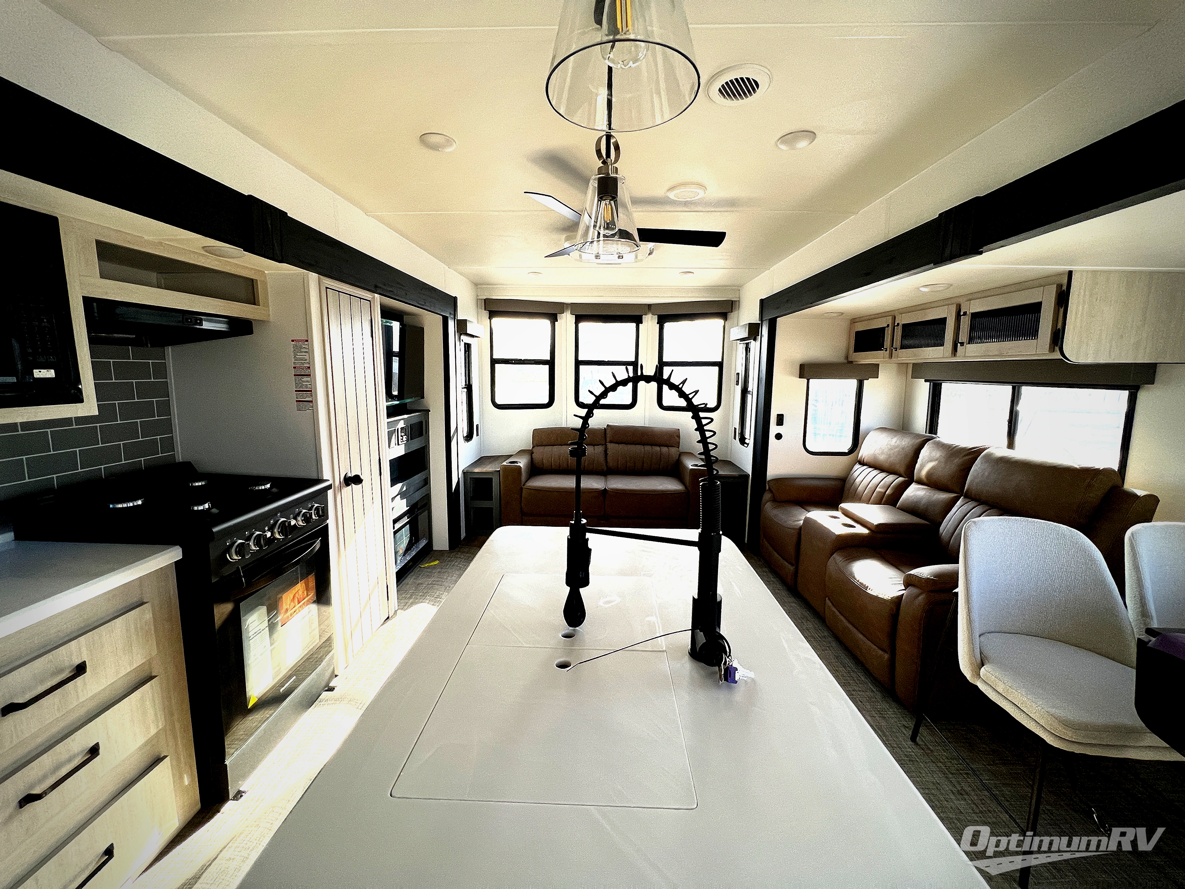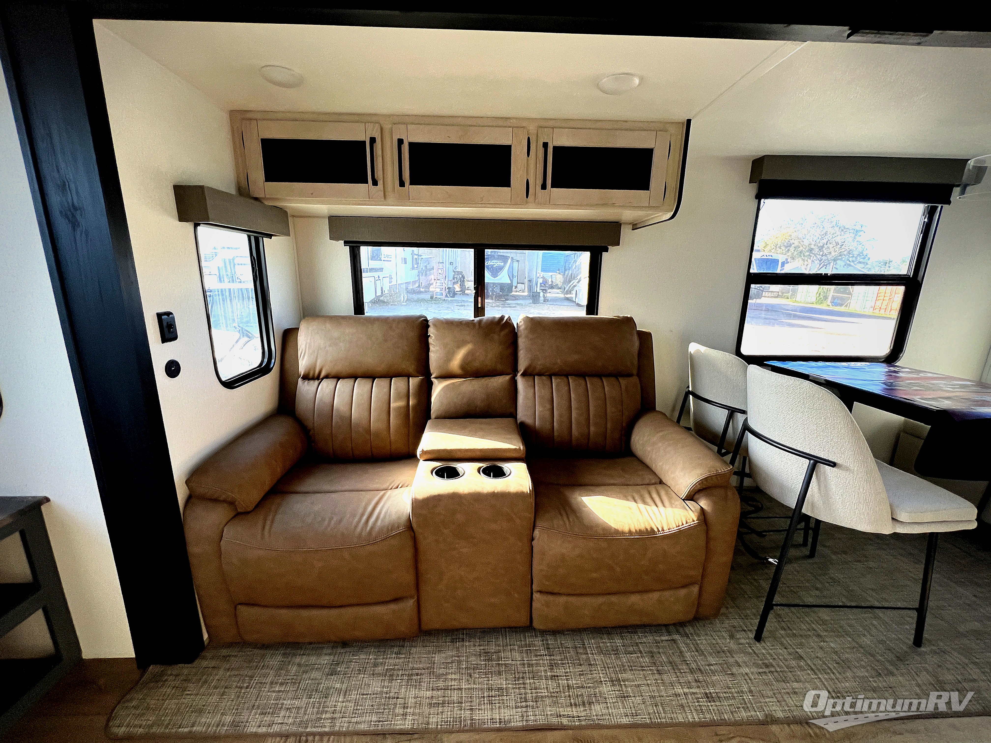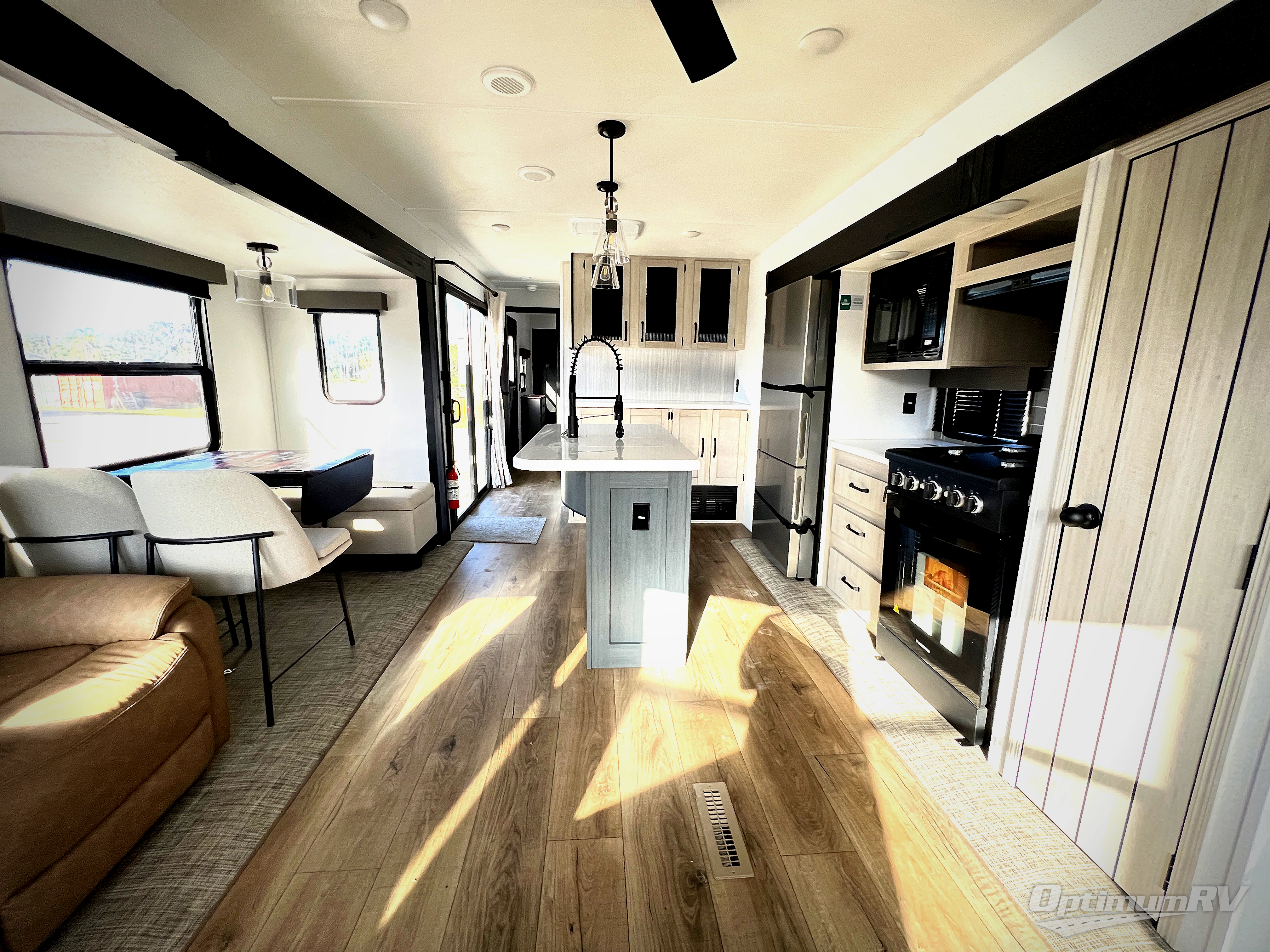 Get ready to enjoy your destination for a weekend or even longer in comfort with the front living and kitchen combined area. The sofa and booth dinette offer relaxing and dining space as well as sleeping space when needed. There are two recliners you are sure to love, as well as a fireplace to make it feel more like home. There is a kitchen island to prepare and serve meals from and wash the dishes. The kitchen offers full amenities including a stainless steel refrigerator and plenty of storage. You will surely enjoy the natural lighting from the patio door, and the second entry/exit is located in the rear private bedroom where you can sleep like a royalty on the king bed. There is also a closet with the option to add washer and dryer prep if you choose!