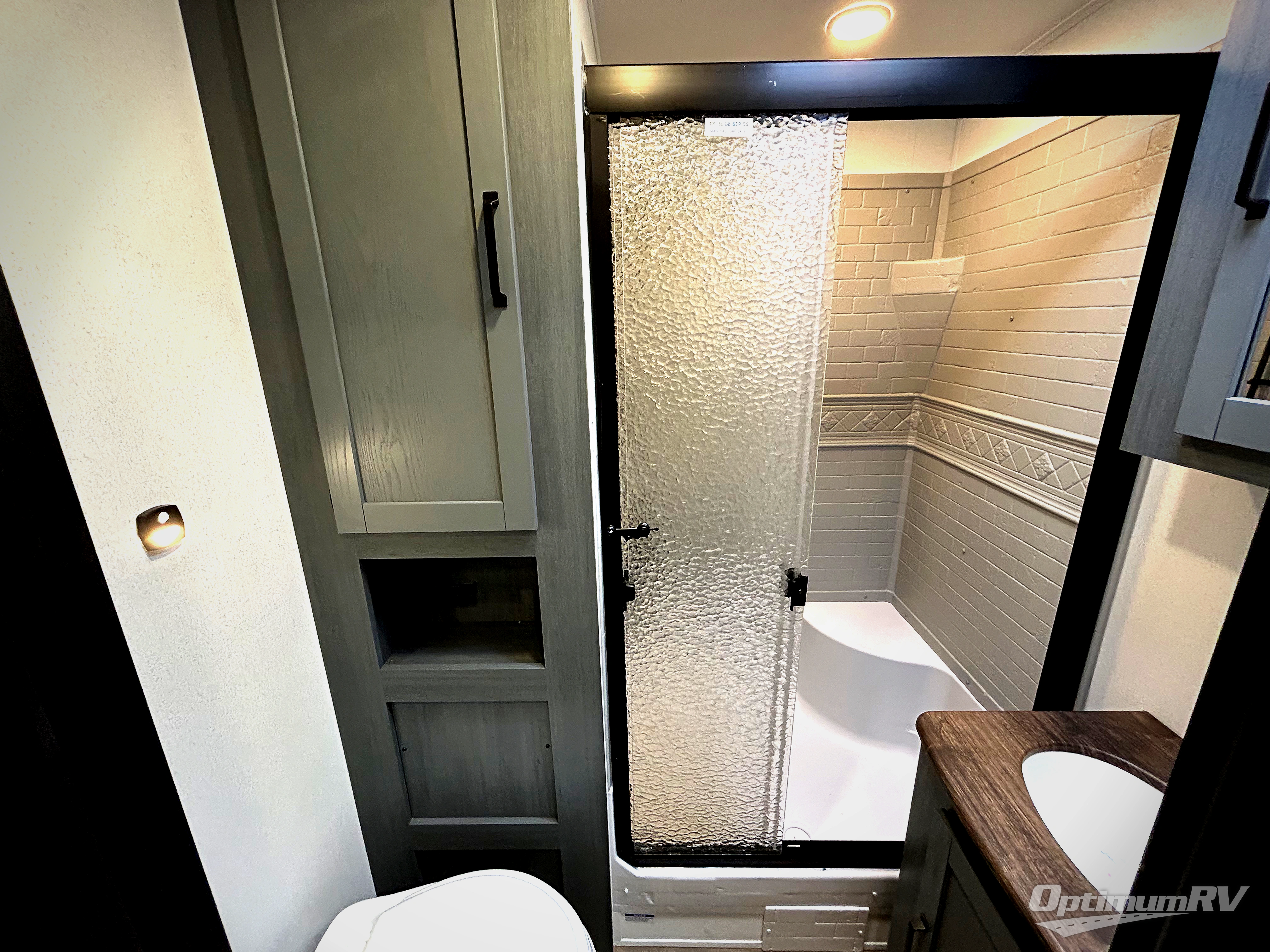 Get ready to enjoy your destination for a weekend or even longer in comfort with the front living and kitchen combined area. The sofa and booth dinette offer relaxing and dining space as well as sleeping space when needed. There are two recliners you are sure to love, as well as a fireplace to make it feel more like home. There is a kitchen island to prepare and serve meals from and wash the dishes. The kitchen offers full amenities including a stainless steel refrigerator and plenty of storage. You will surely enjoy the natural lighting from the patio door, and the second entry/exit is located in the rear private bedroom where you can sleep like a royalty on the king bed. There is also a closet with the option to add washer and dryer prep if you choose!