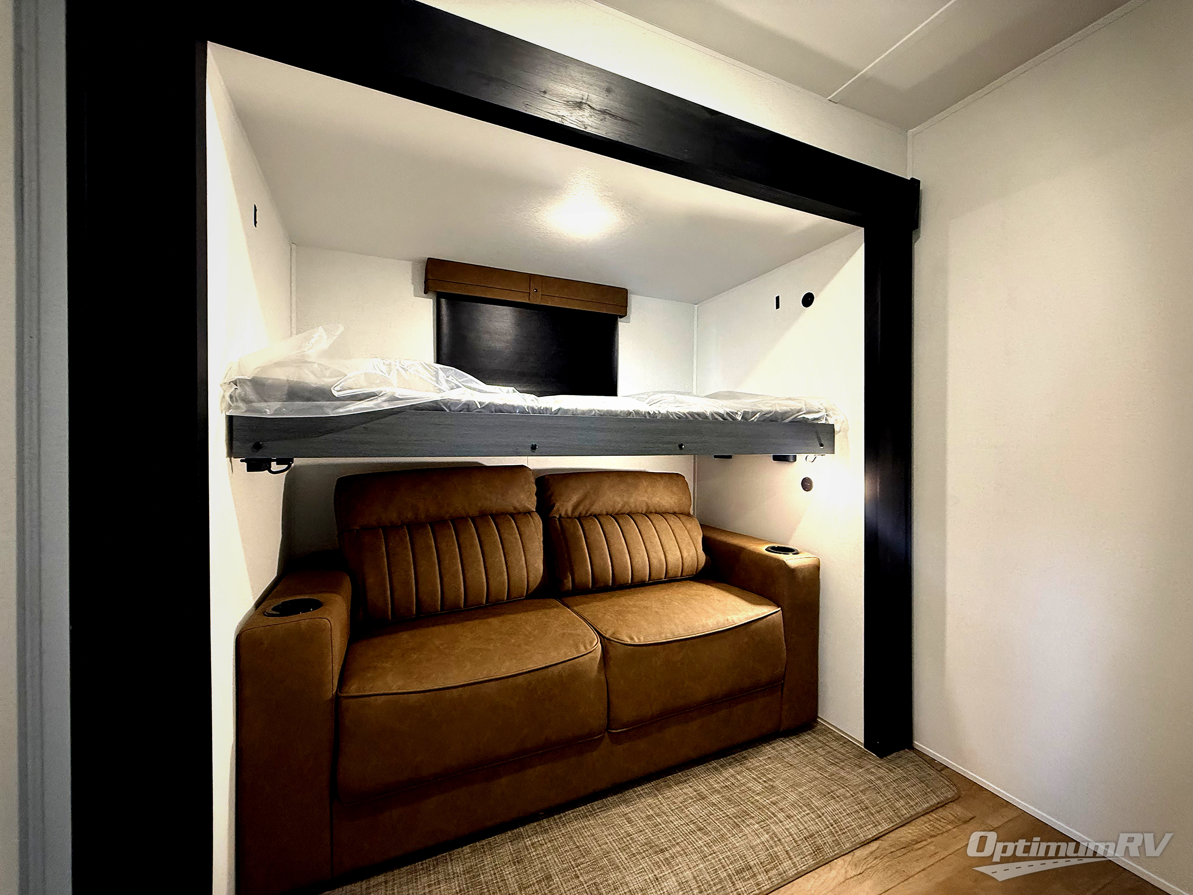 Everyone will want to join you when you head back out to the lake to stay in this trailer! With the middle bunkhouse that includes a bunk above a jiffy sofa and a closet, this can be your kids room or guest's headquarters. You will have your own privacy when needed in the front bedroom which includes a queen bed slide and two closets. There is also a dresser and a space within a closet for a washer/dryer prep. The full bathroom is conveniently located between the two rooms, and the rear of the trailer offers a combined living and kitchen area. The dual slides give you lots of floor space around the kitchen island as you prep dinner. There is also a table and chairs to dine at, plus theater seating and a sofa for even more seating and sleeping space!