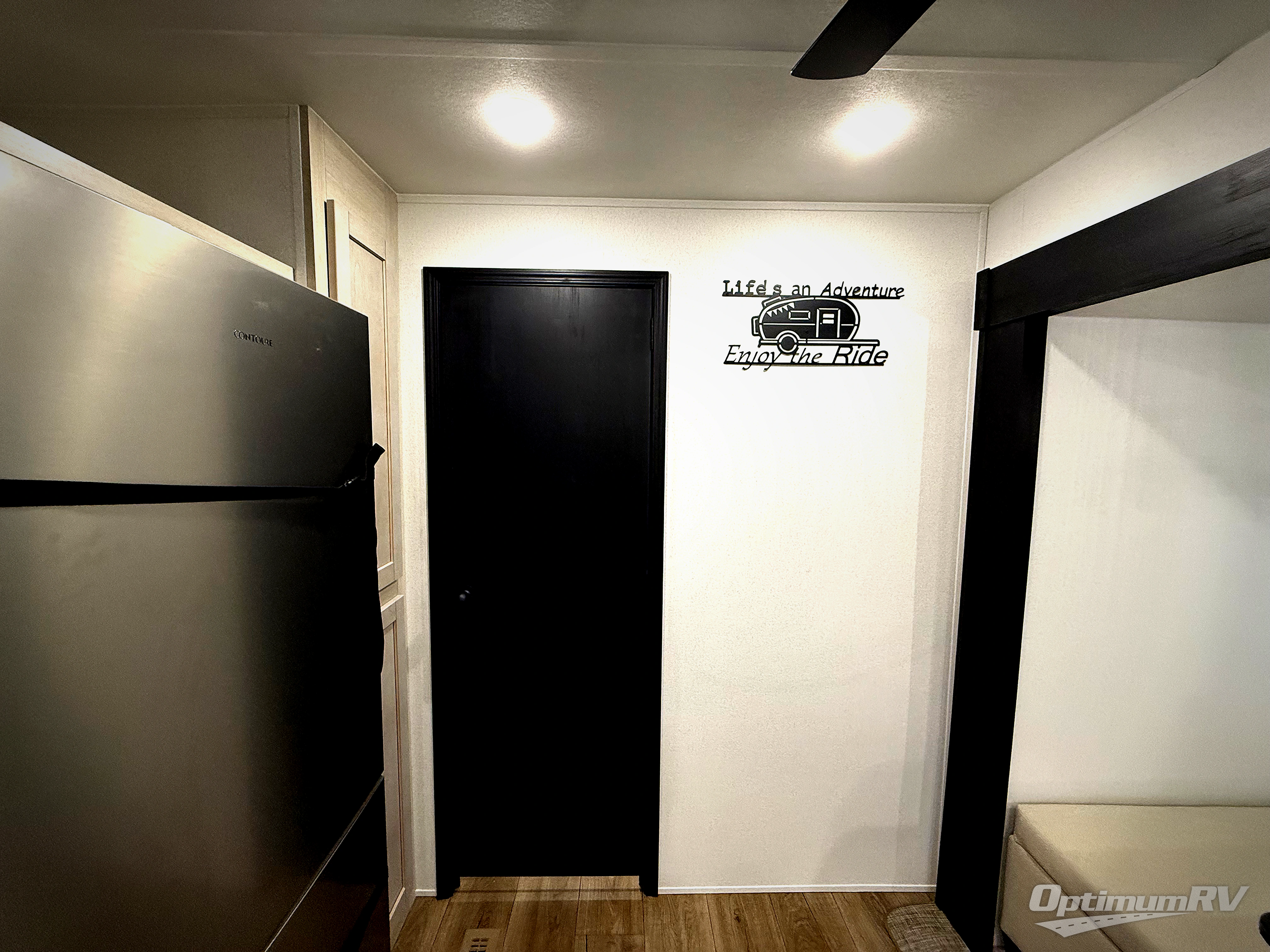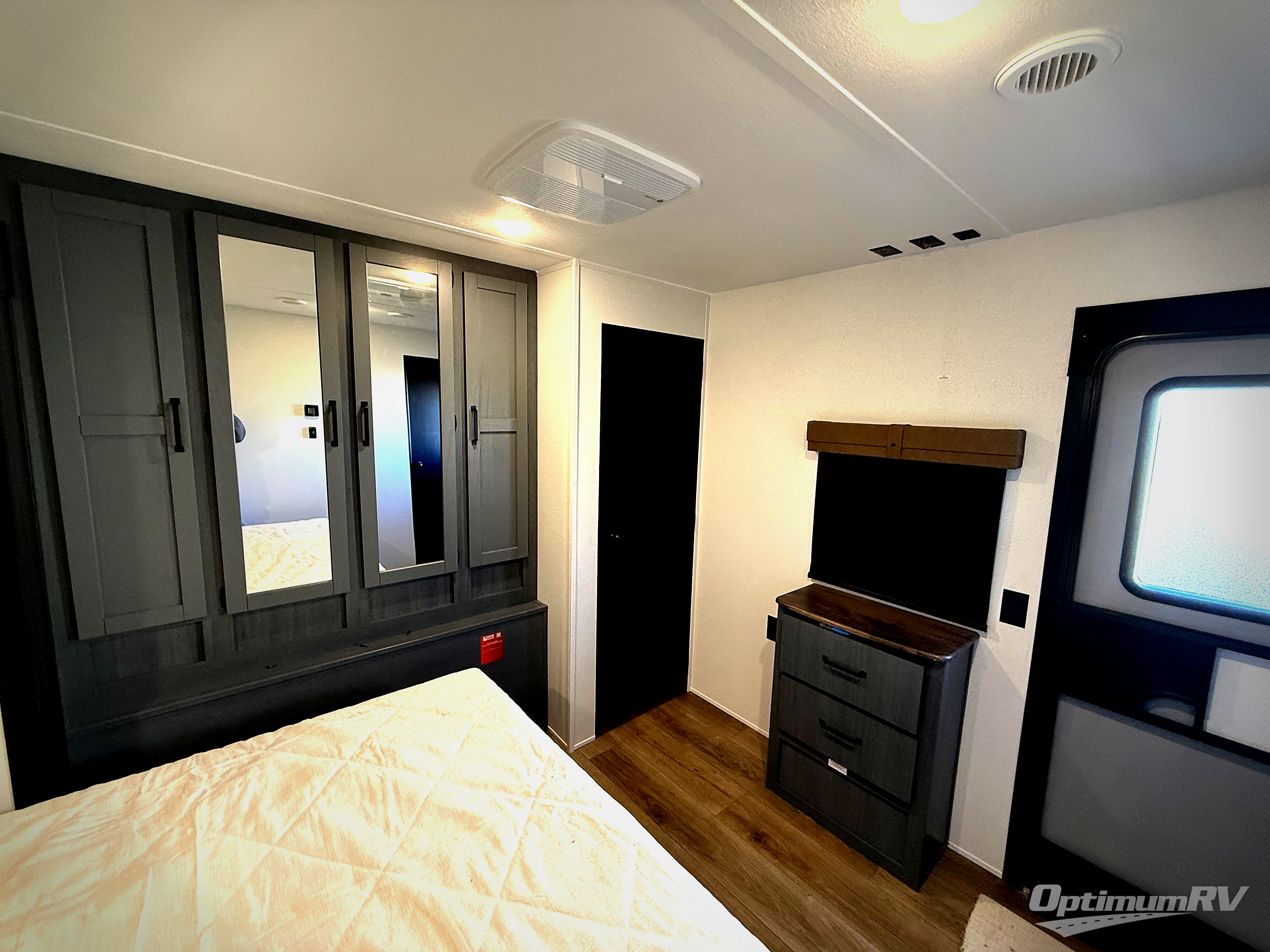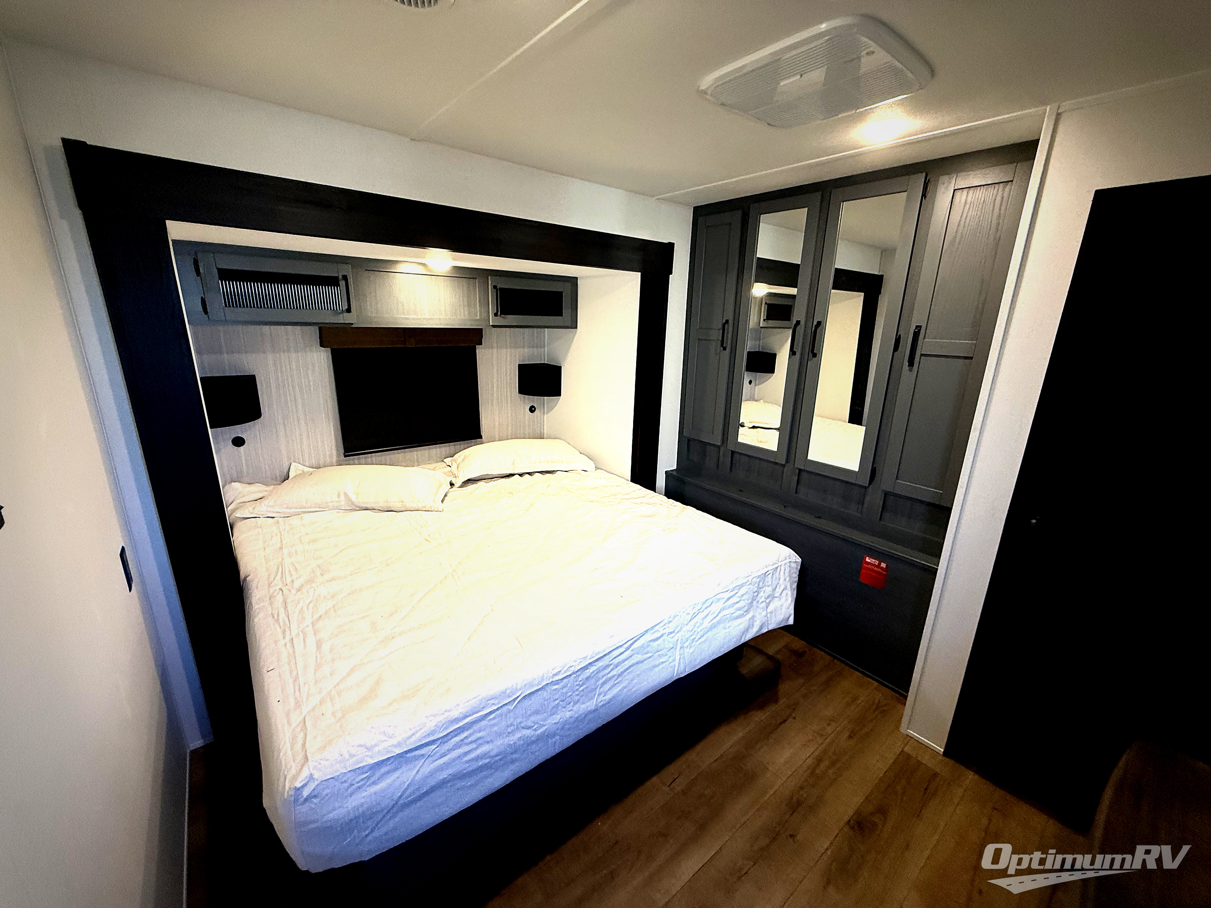 Get out of town and start enjoying the beautiful weather and scenery where you have chosen to place this destination trailer. This spacious trailer has three slide outs for lots of interior floor space, plus two entries for convenience. The front bedroom offers a king bed slide, two closets, and a dresser. The rear bedroom suite includes a full bathroom and a queen bed slide, a vanity and a wardrobe. In between you can relax in the combined living and kitchen area on the sofa or table and chairs while visiting with the cook with full amenities.