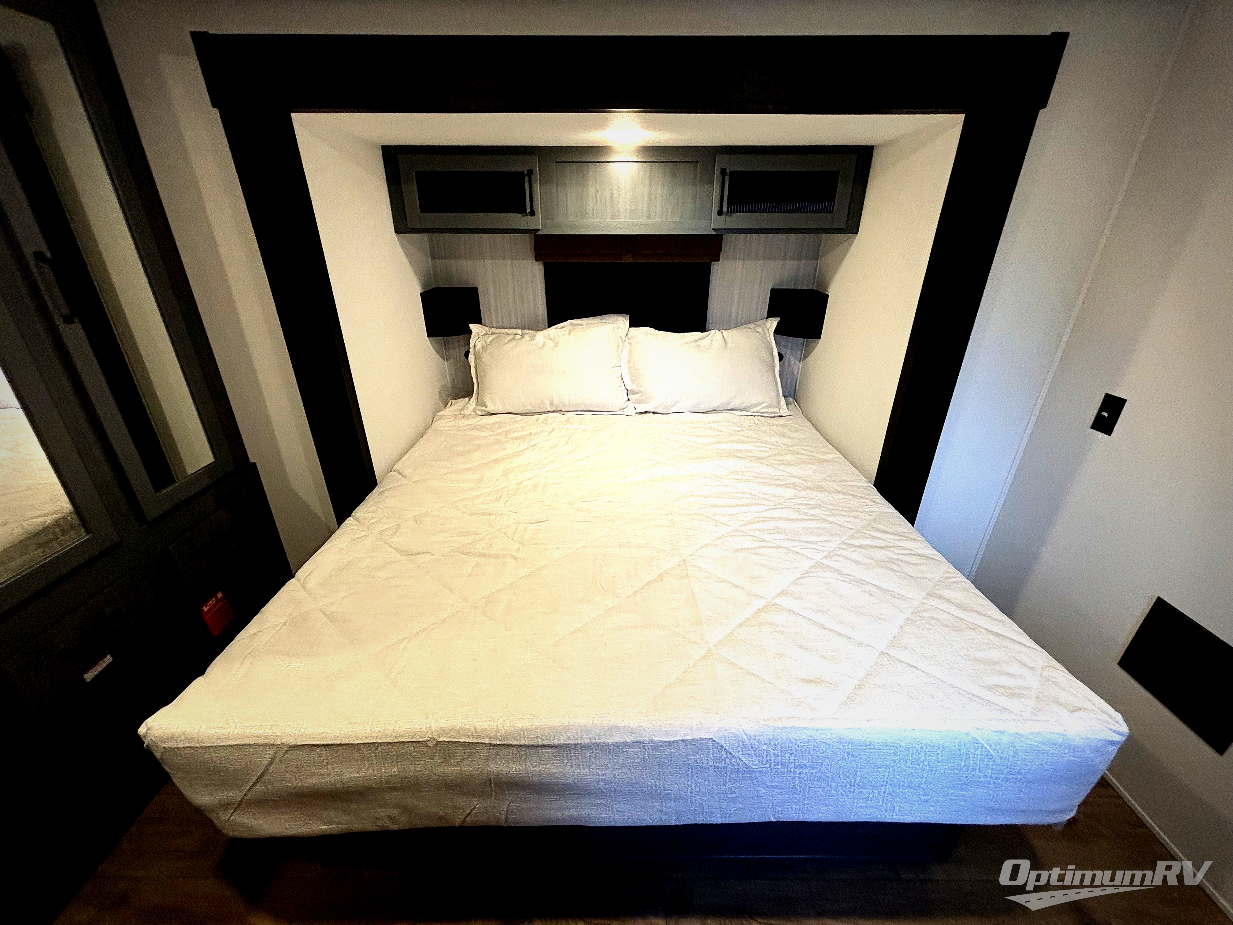 Wherever your destination may be, you can be sure to enjoy it to the fullest with this trailer in tow! With two entry doors, you can enter in through the rear private bedroom or the main living area. The bedroom includes a king bed slide out, a wardrobe/closet to keep your clothes organized, plus a closet with washer and dryer prep. Just outside this room are steps that lead to the large loft area with a 58" x 58" bunk mat and a cabinet on one side, plus two 32" x 69" bunk mats on the other. There is also a cabinet and a wardrobe/closet for plenty of storage space. Once you've headed back downstairs, you can relax on the theater seating, front sofa, or table and chairs with a bench seating. And the chef of your group will love the kitchen with its residential style refrigerator and pantry, kitchen island, and four burner cooktop!