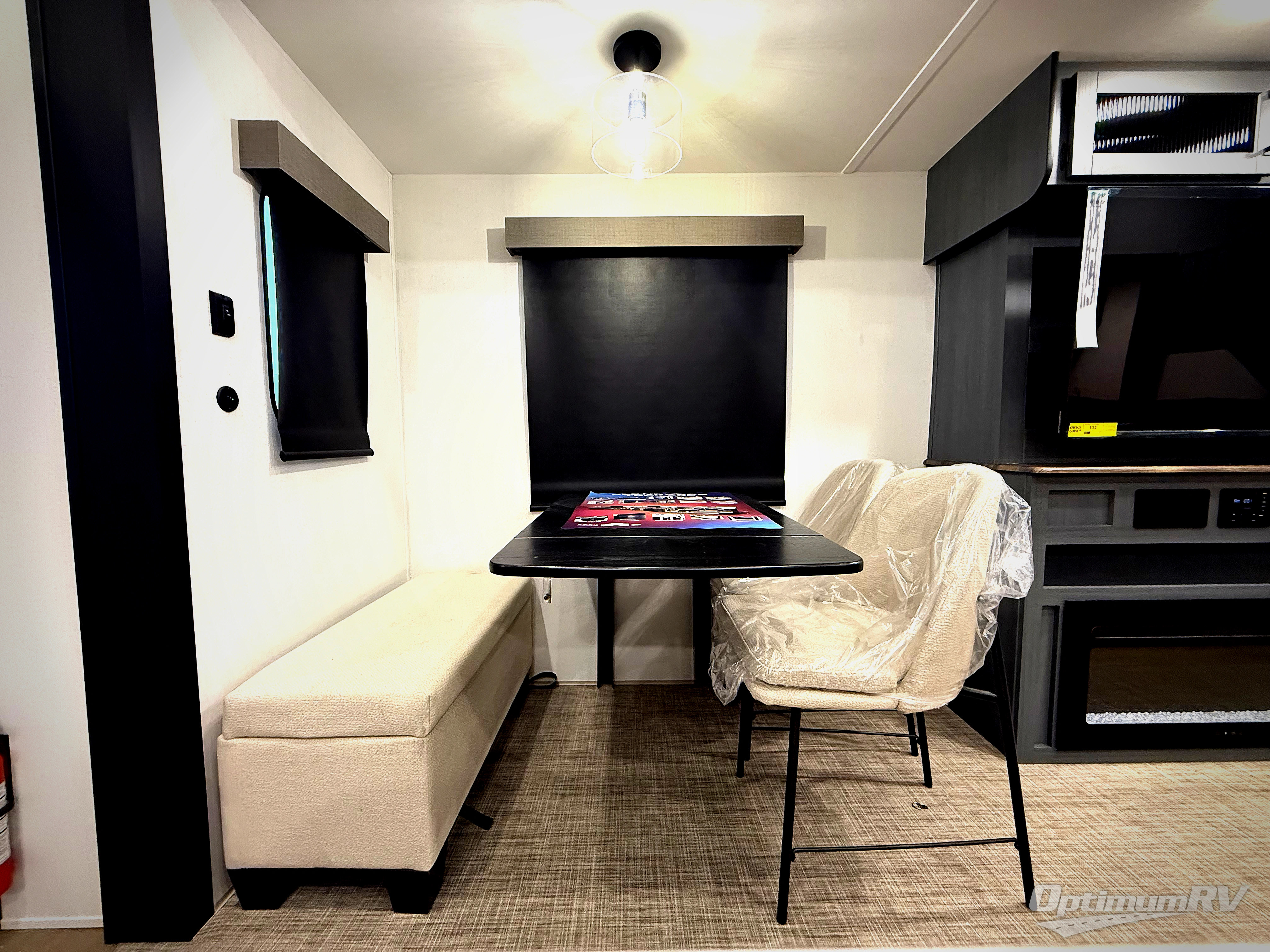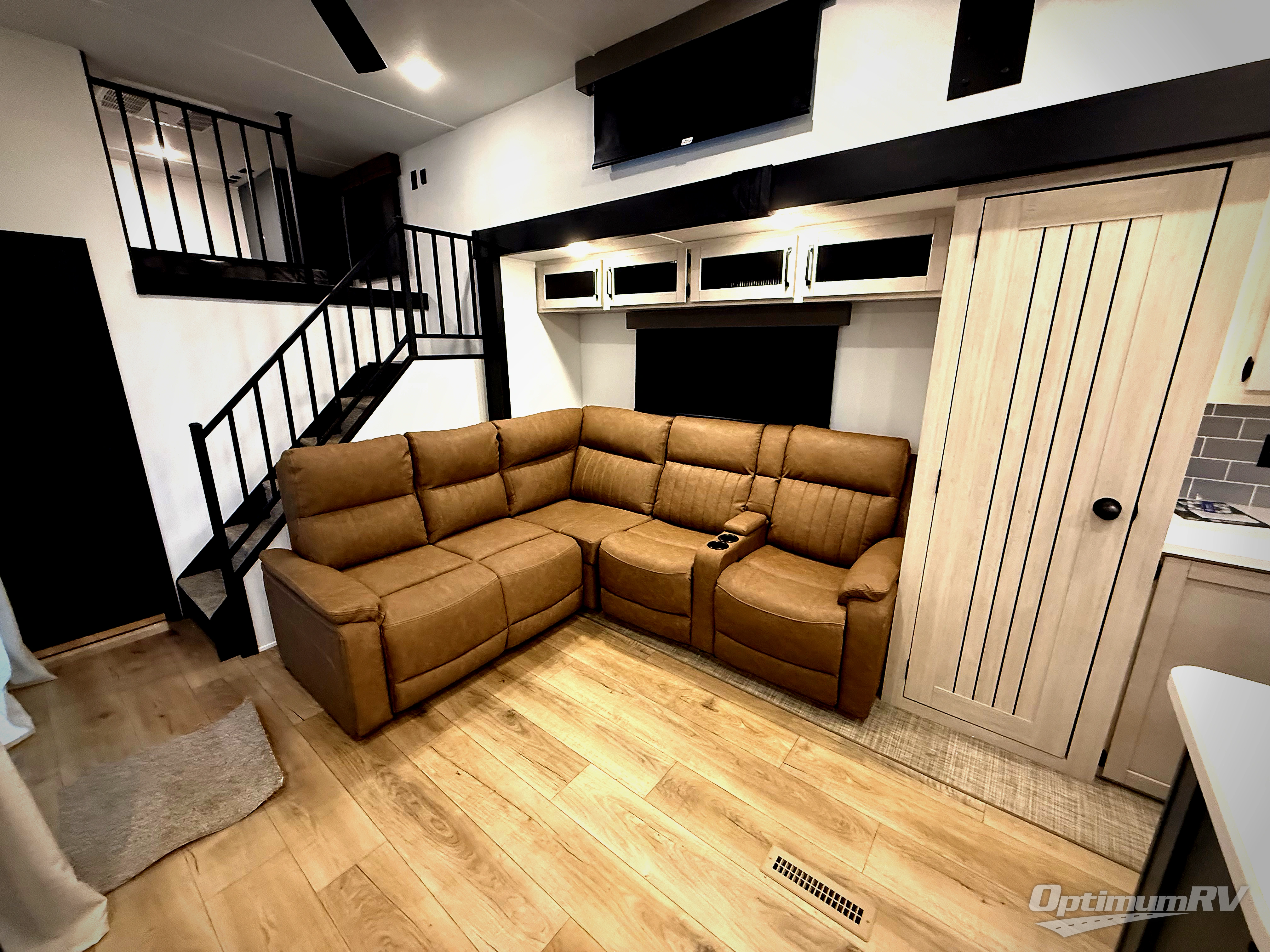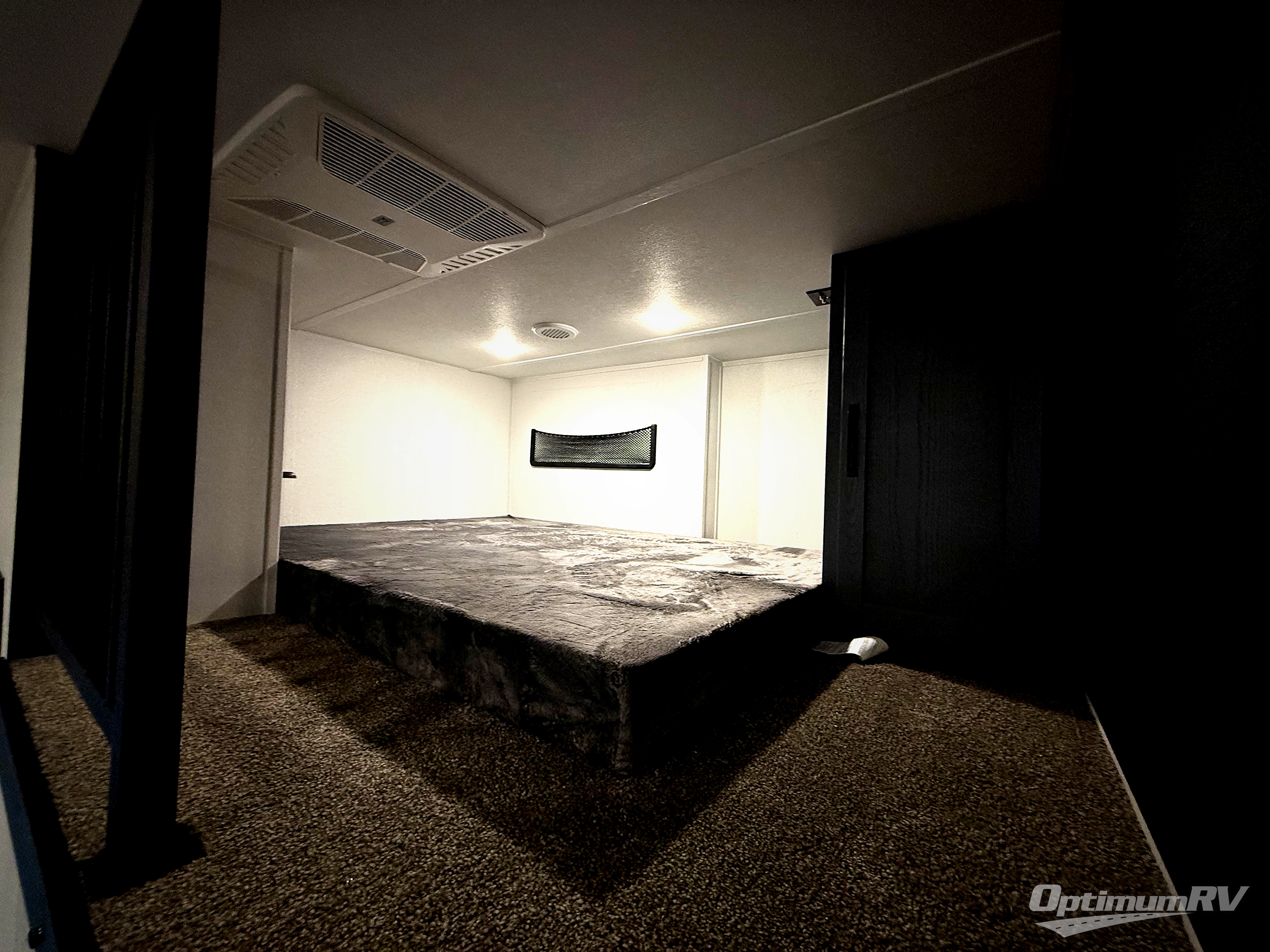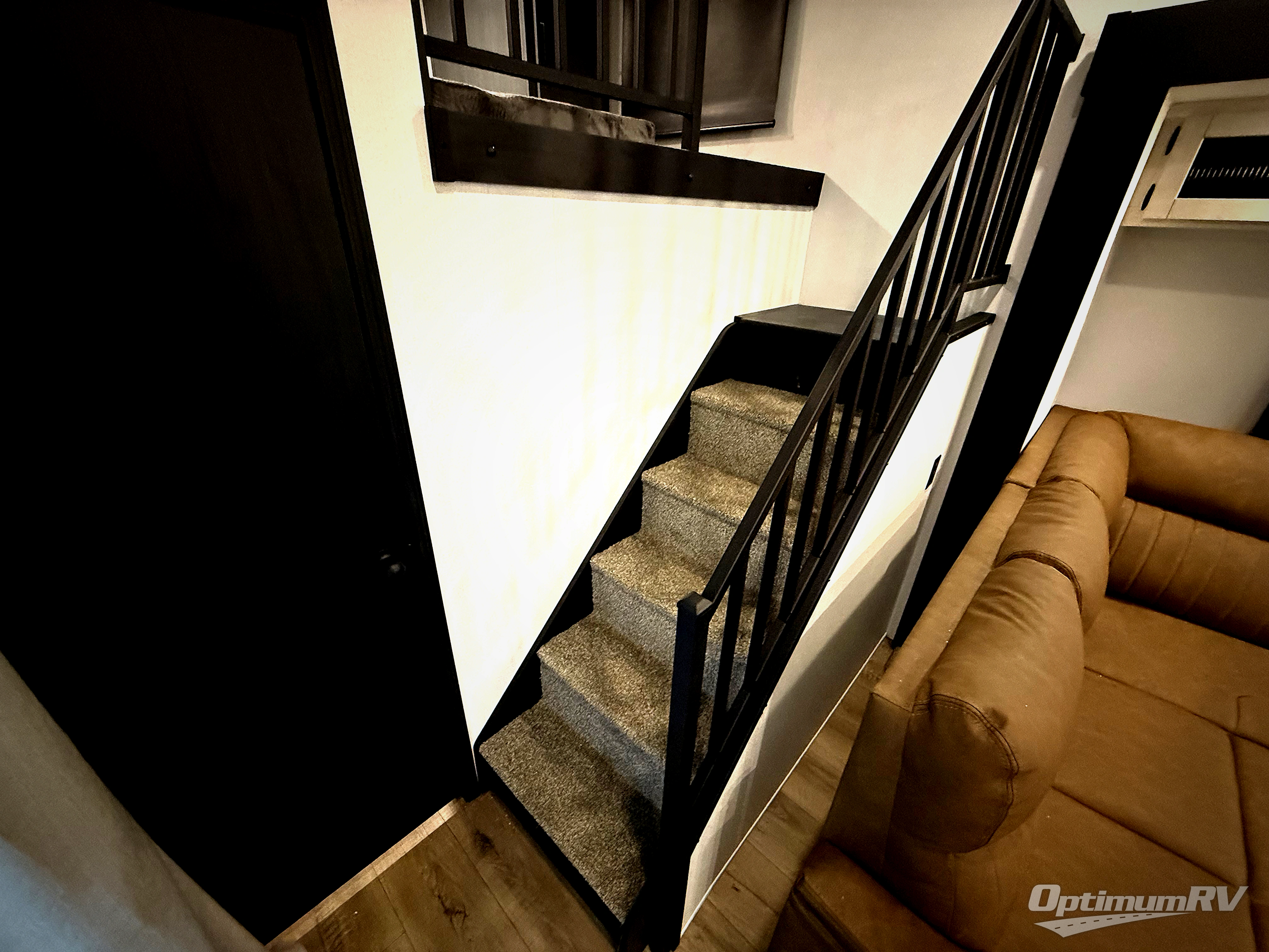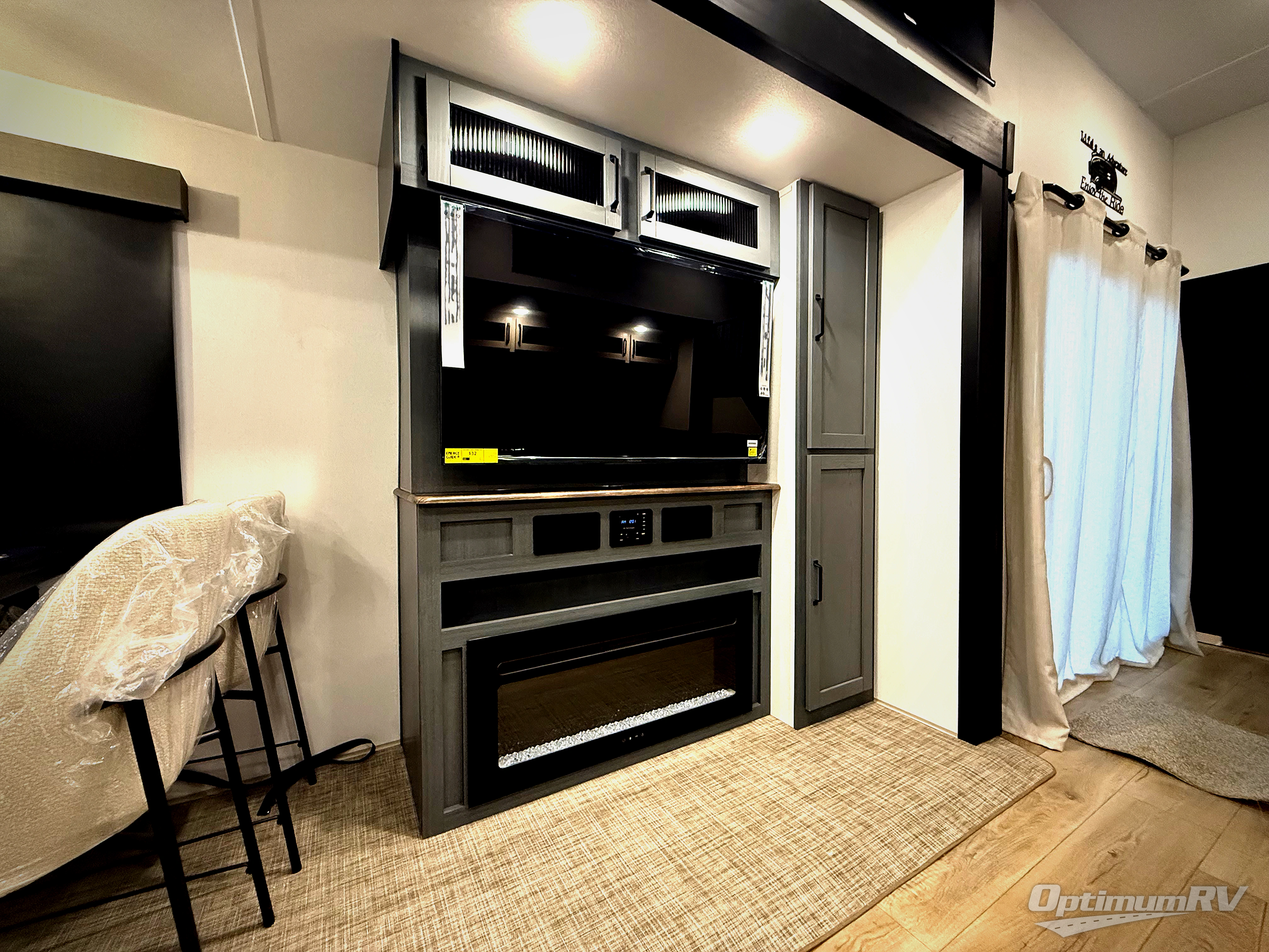 Head to your favorite spots with this destination trailer! With two entry doors, you can easily enter or exit the unit. The front private bedroom includes a king bed slide out, a wardrobe and dresser to keep your clothes organized, plus a countertop for your books or jewelry. Just outside this room is the ladder that leads to the large loft area with two 32" x 80" bunk mats, a cubby, a counter, a nightstand, and cabinets. Once you've headed back downstairs, you can relax on the L-shaped sofa across from the entertainment center with a fireplace and slide-out cabinet or the table and chairs with bench seating. And the chef of your group will love the kitchen with its residential style refrigerator and pantry, kitchen island, and four burner cooktop. The full rear bathroom not only has a 32" x 40" shower with a seat to freshen up in, and a closet with washer/dryer prep, but is also below the second loft with a 32" x 80" bunk mat and closet for storage!