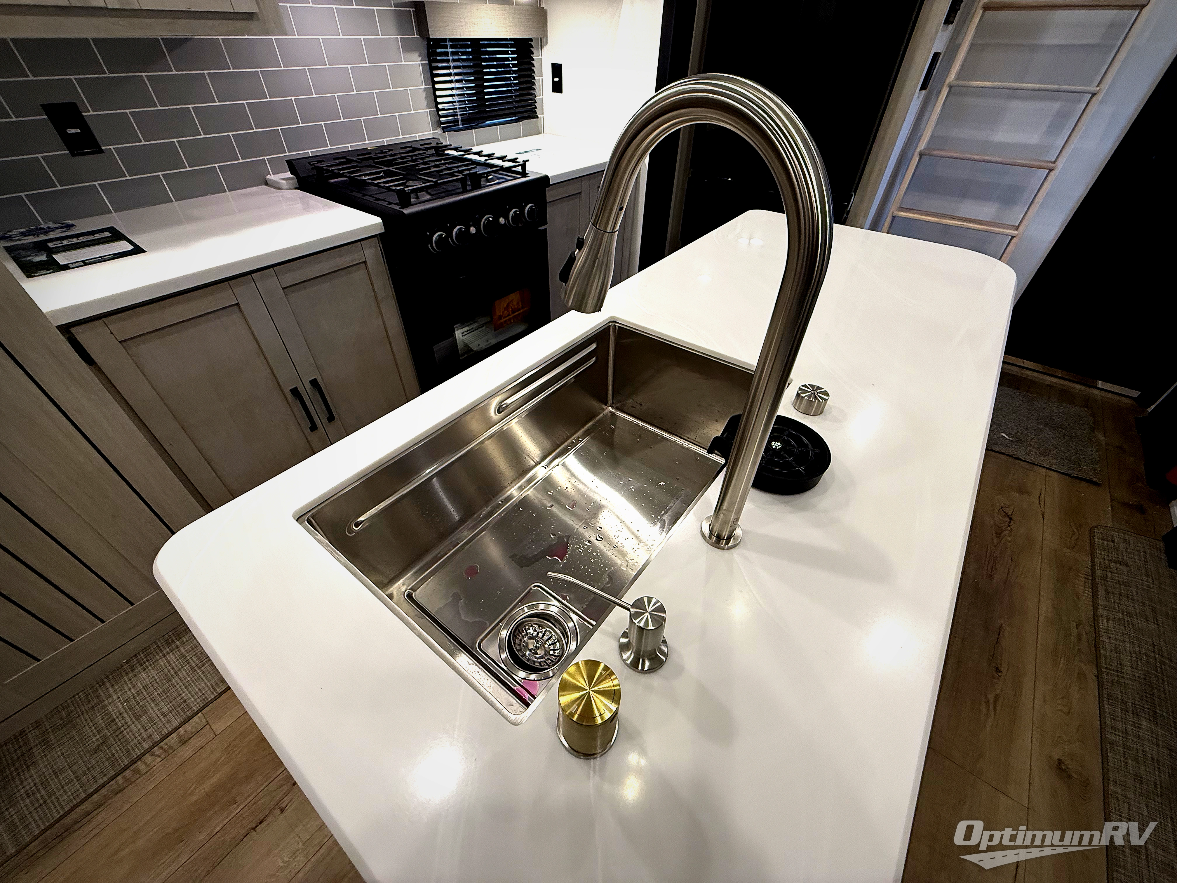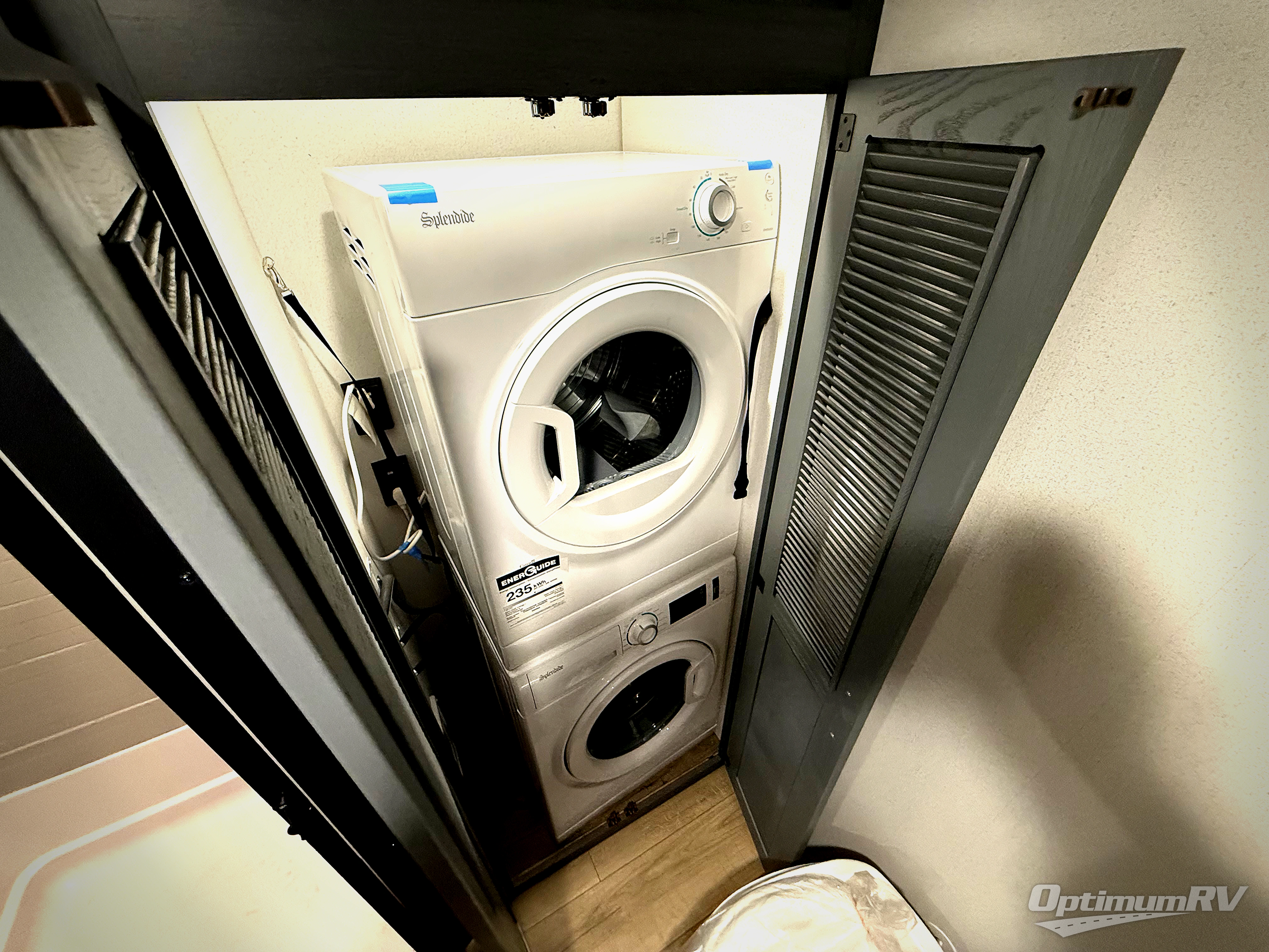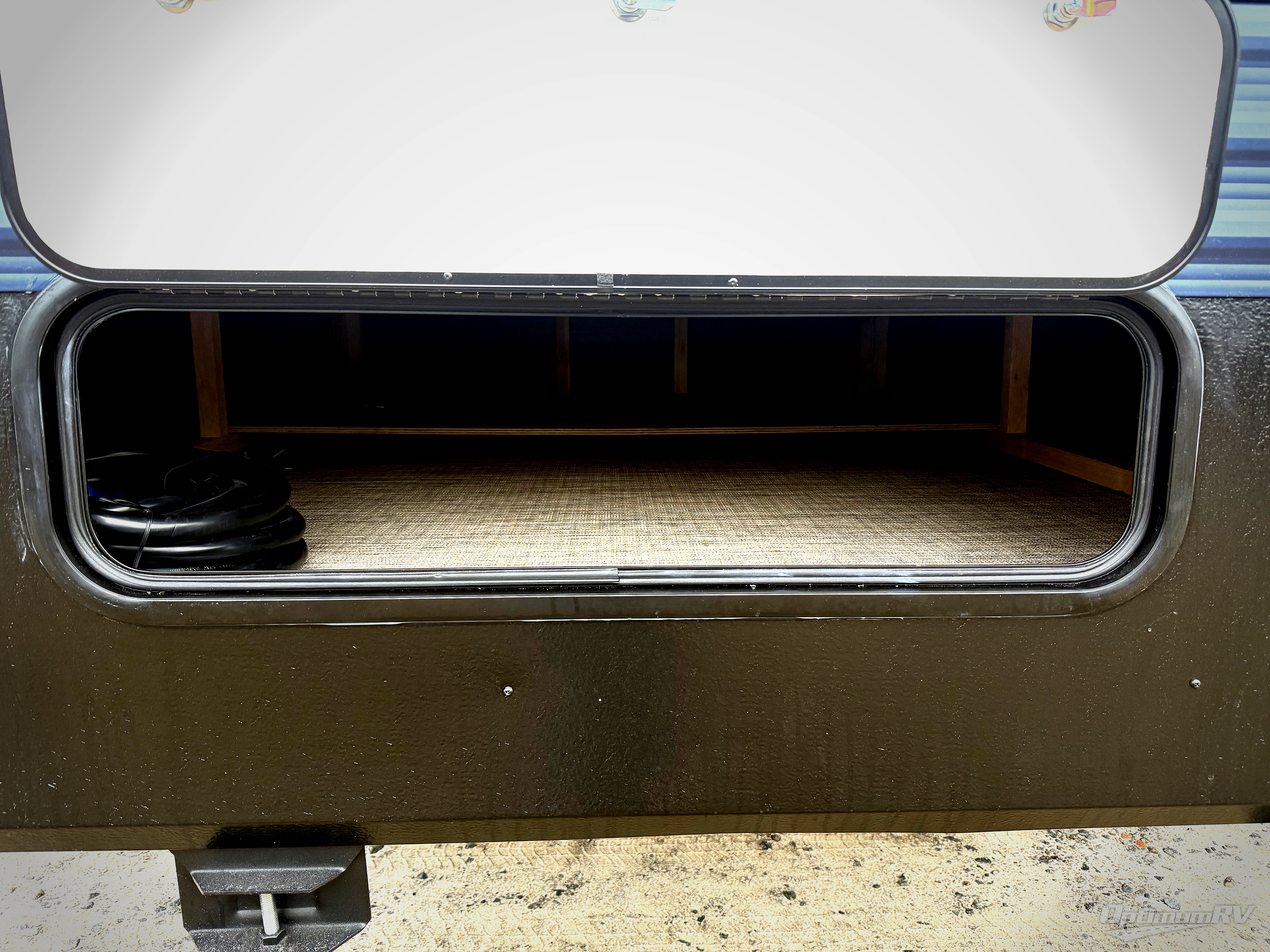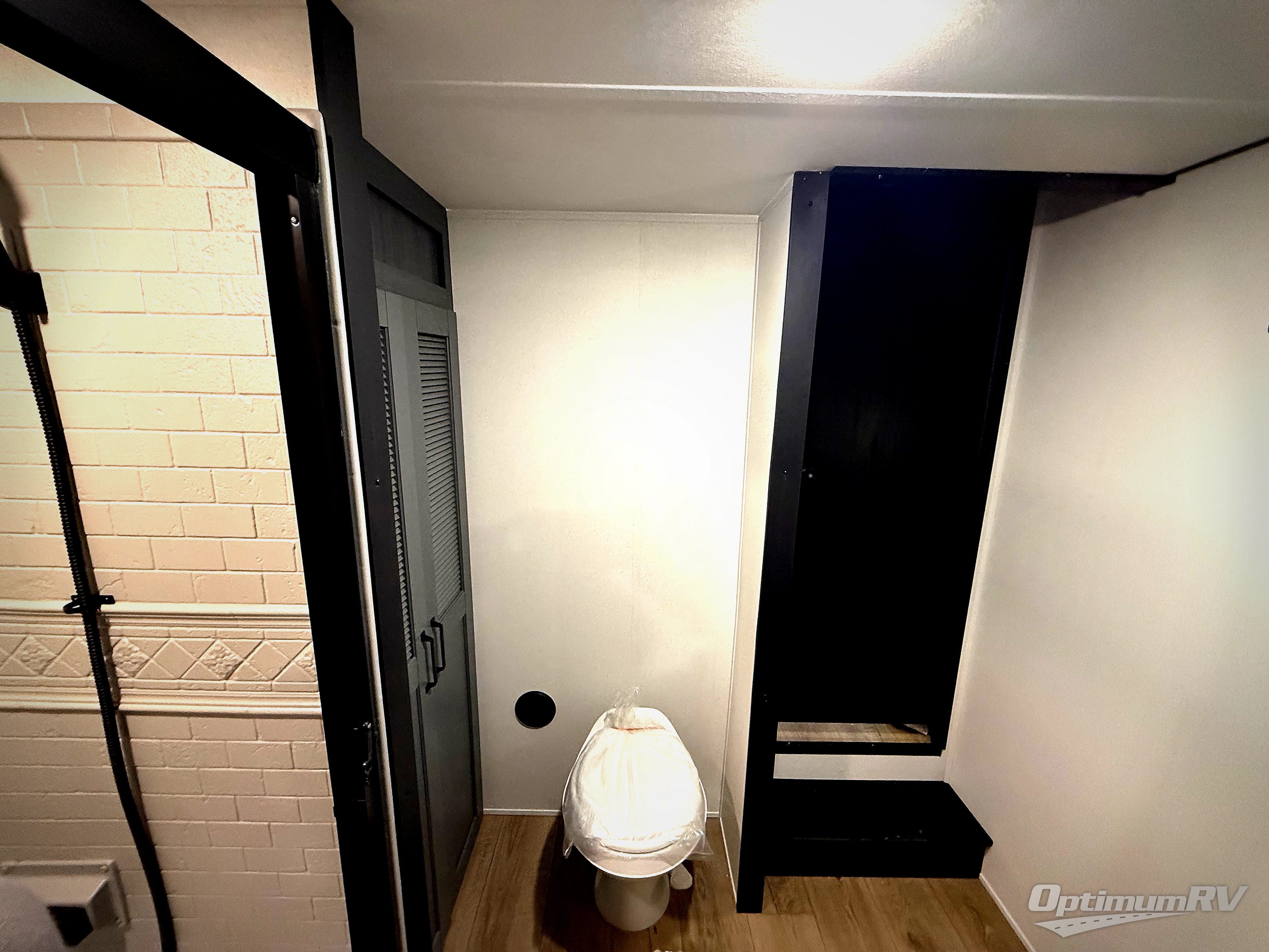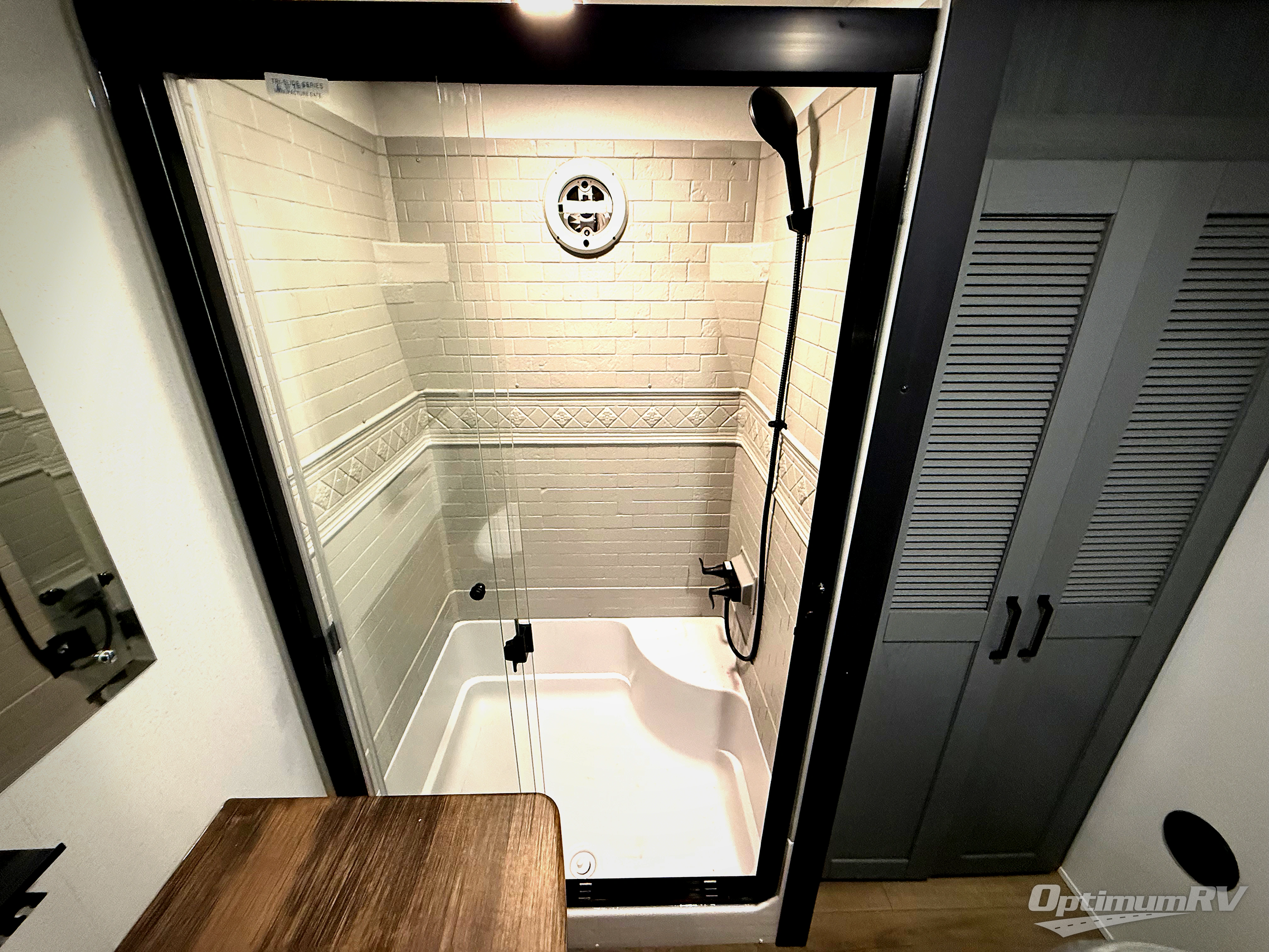 Head to your favorite spots with this destination trailer! With two entry doors, you can easily enter or exit the unit. The front private bedroom includes a king bed slide out, a wardrobe and dresser to keep your clothes organized, plus a countertop for your books or jewelry. Just outside this room is the ladder that leads to the large loft area with two 32" x 80" bunk mats, a cubby, a counter, a nightstand, and cabinets. Once you've headed back downstairs, you can relax on the L-shaped sofa across from the entertainment center with a fireplace and slide-out cabinet or the table and chairs with bench seating. And the chef of your group will love the kitchen with its residential style refrigerator and pantry, kitchen island, and four burner cooktop. The full rear bathroom not only has a 32" x 40" shower with a seat to freshen up in, and a closet with washer/dryer prep, but is also below the second loft with a 32" x 80" bunk mat and closet for storage!