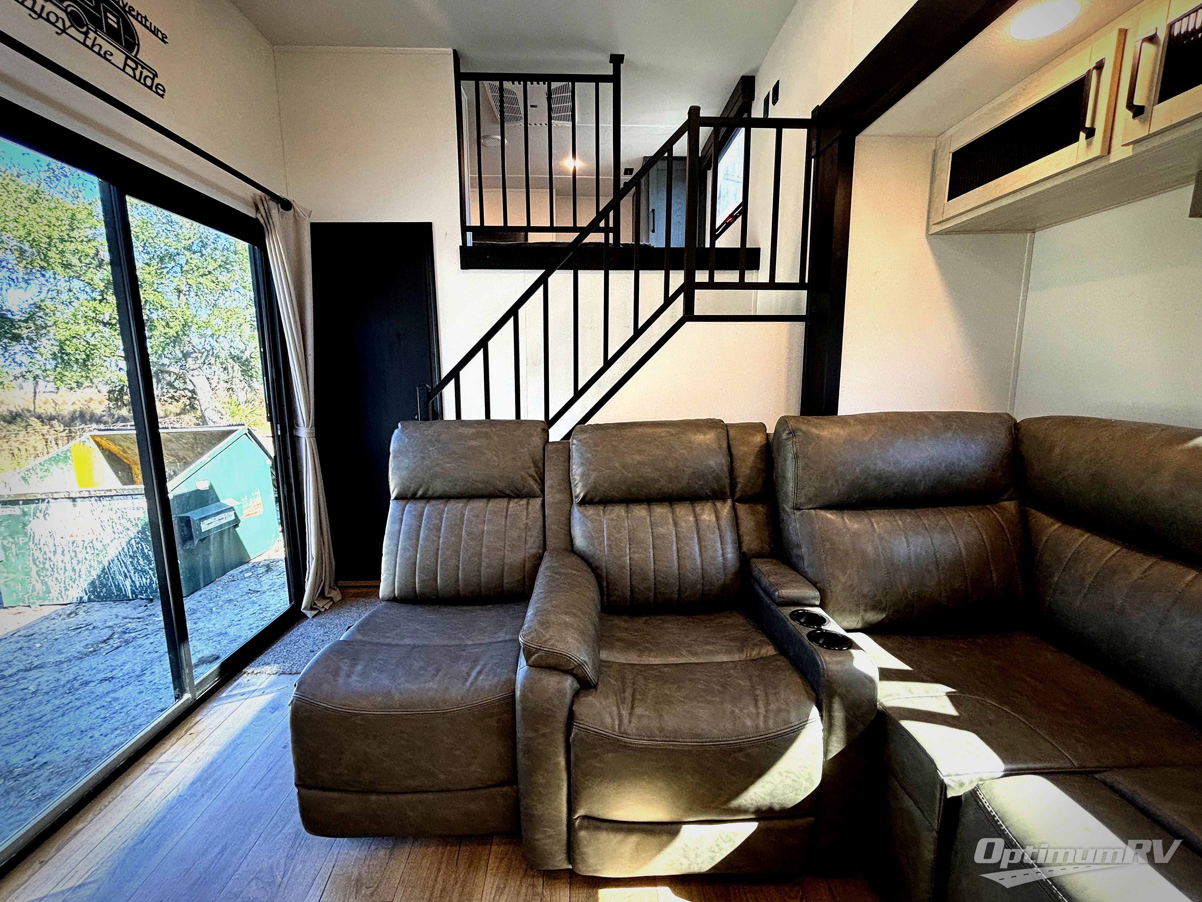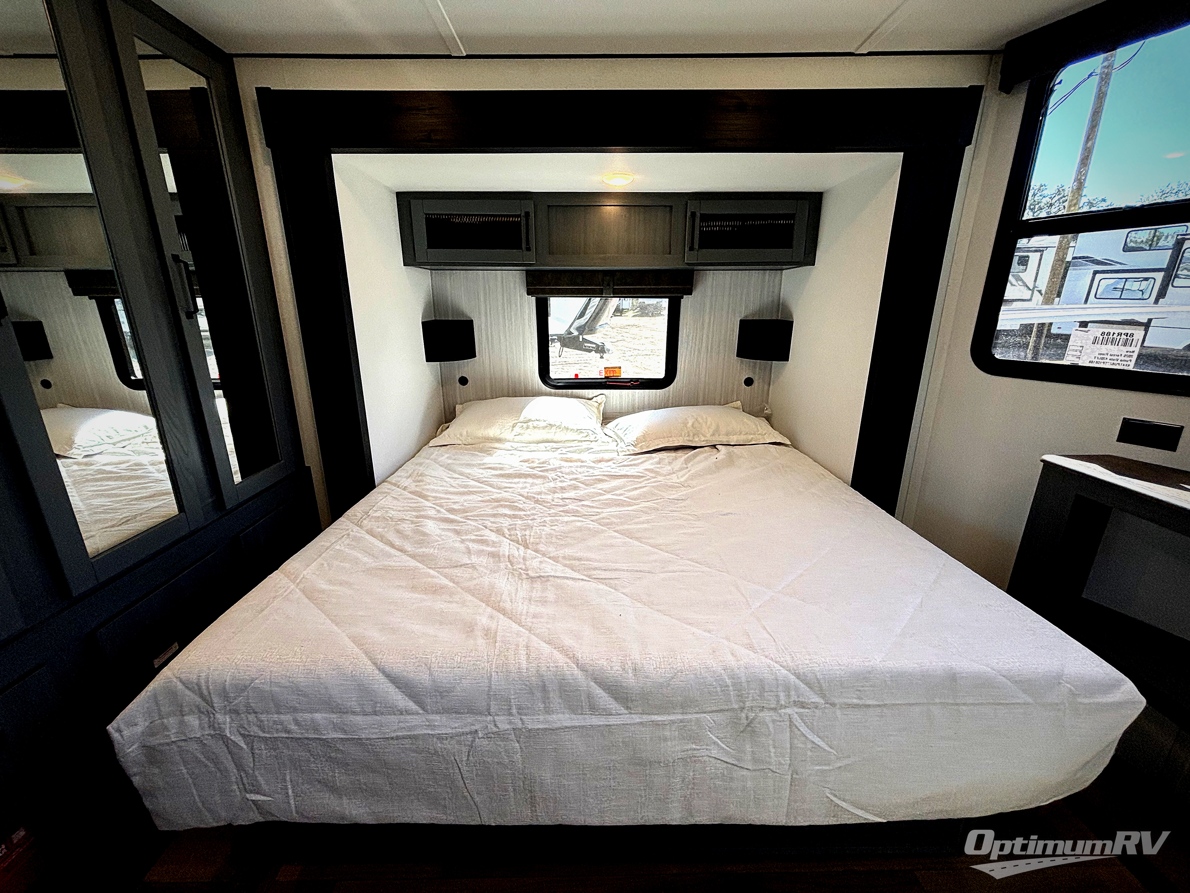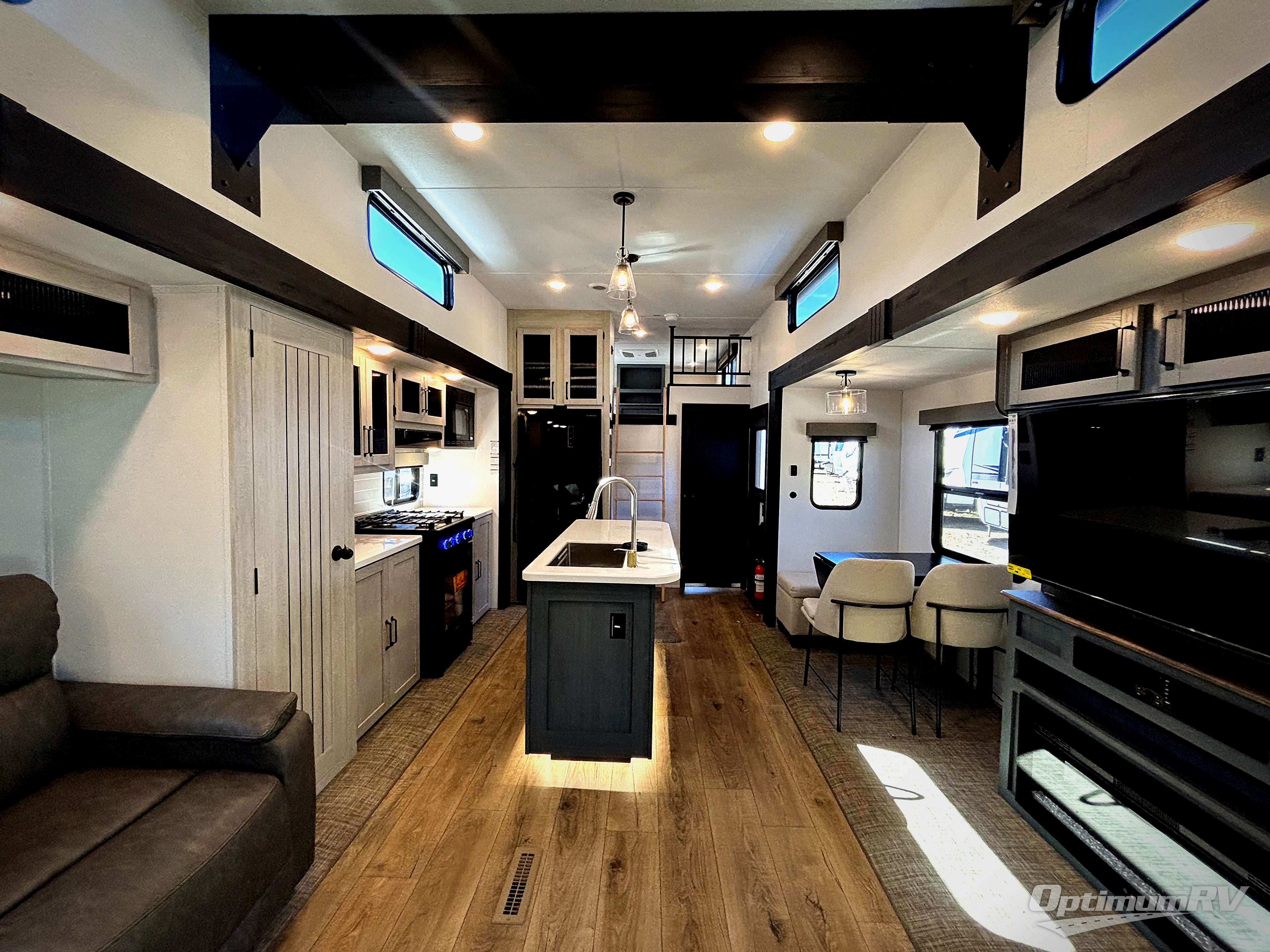 Head to your favorite spots with this destination trailer! With two entry doors, you can easily enter or exit the unit. The front private bedroom includes a king bed slide out, a wardrobe and dresser to keep your clothes organized, plus a countertop for your books or jewelry. Just outside this room is the ladder that leads to the large loft area with two 32" x 80" bunk mats, a cubby, a counter, a nightstand, and cabinets. Once you've headed back downstairs, you can relax on the L-shaped sofa across from the entertainment center with a fireplace and slide-out cabinet or the table and chairs with bench seating. And the chef of your group will love the kitchen with its residential style refrigerator and pantry, kitchen island, and four burner cooktop. The full rear bathroom not only has a 32" x 40" shower with a seat to freshen up in, and a closet with washer/dryer prep, but is also below the second loft with a 32" x 80" bunk mat and closet for storage!