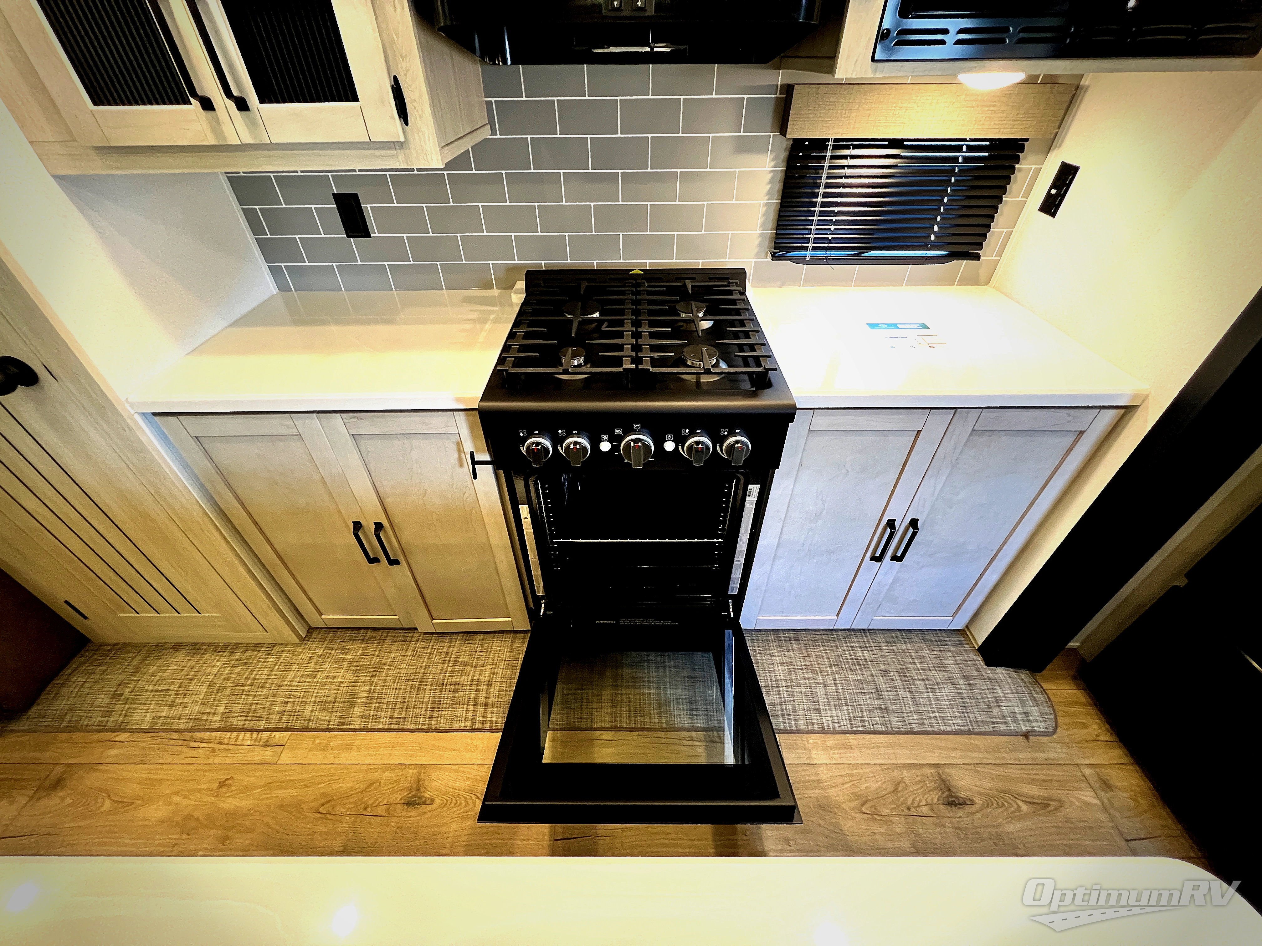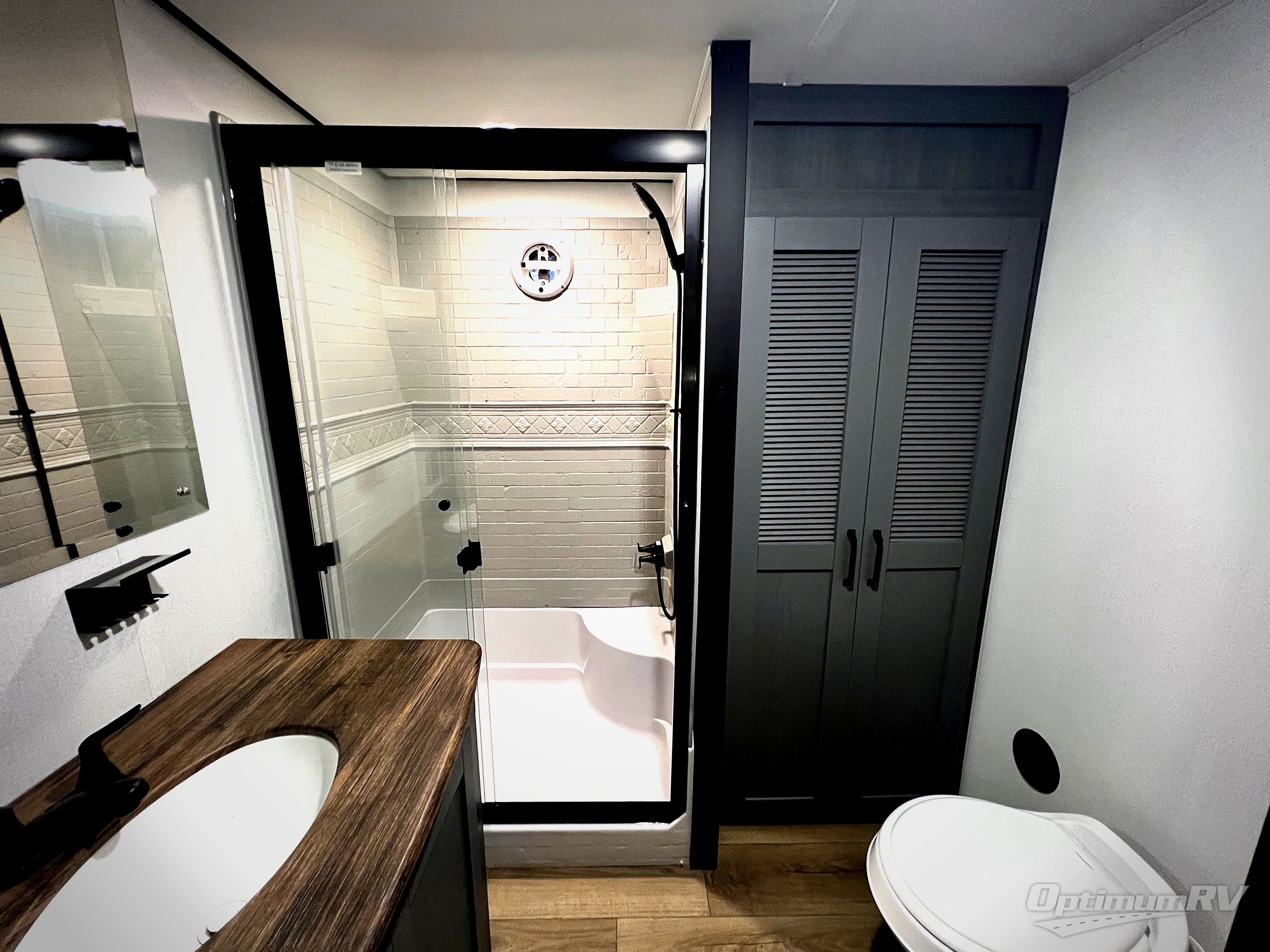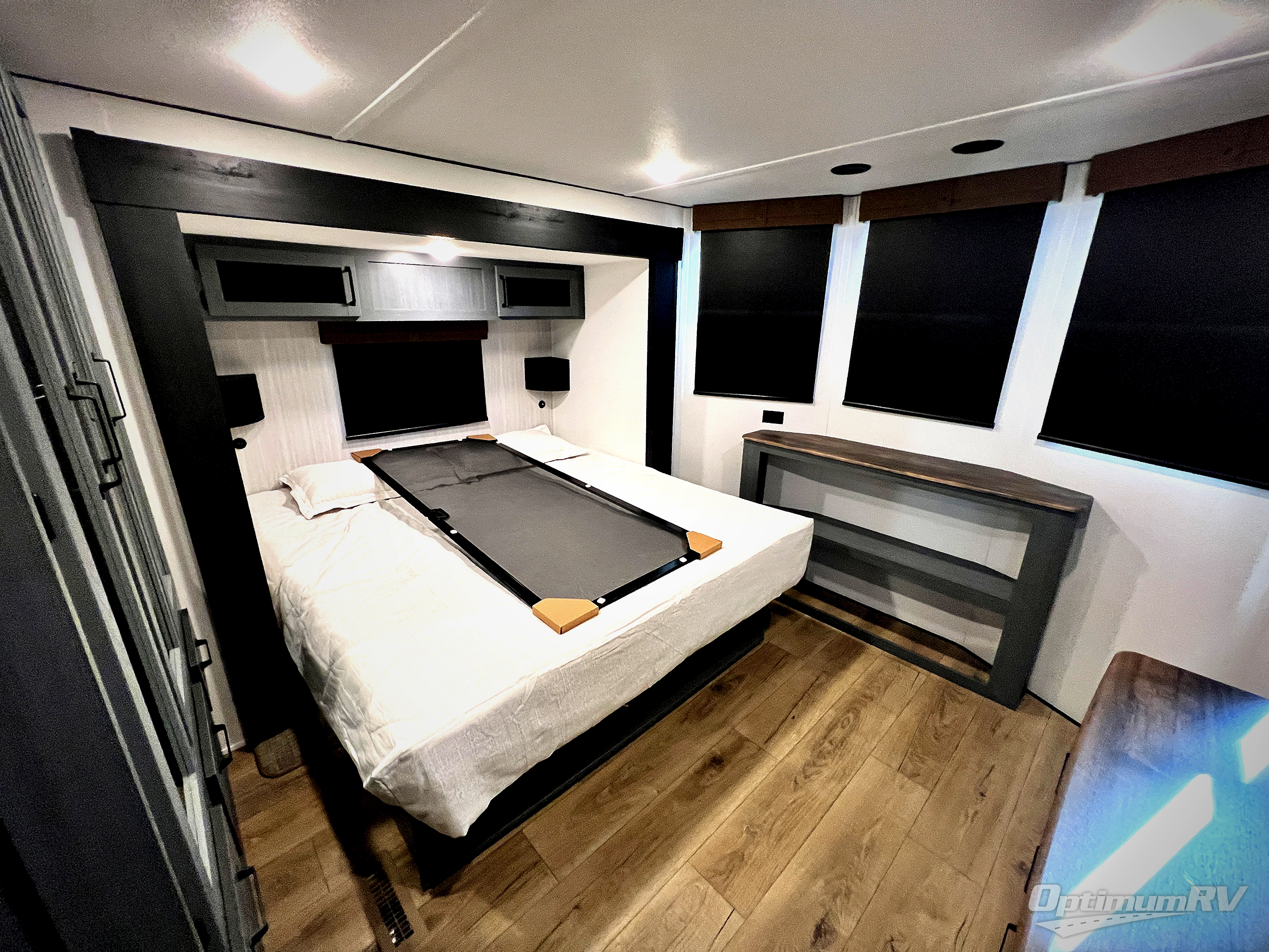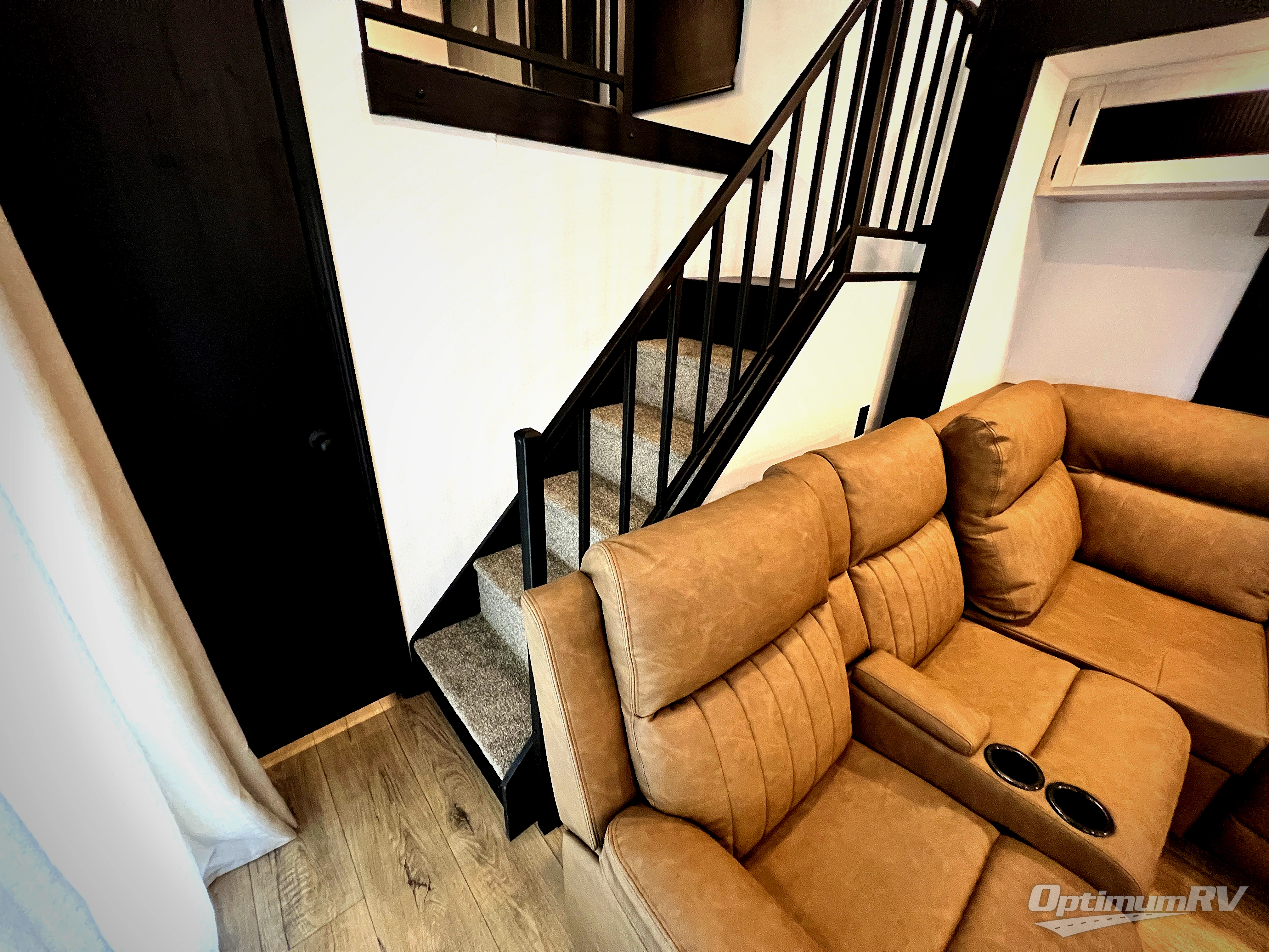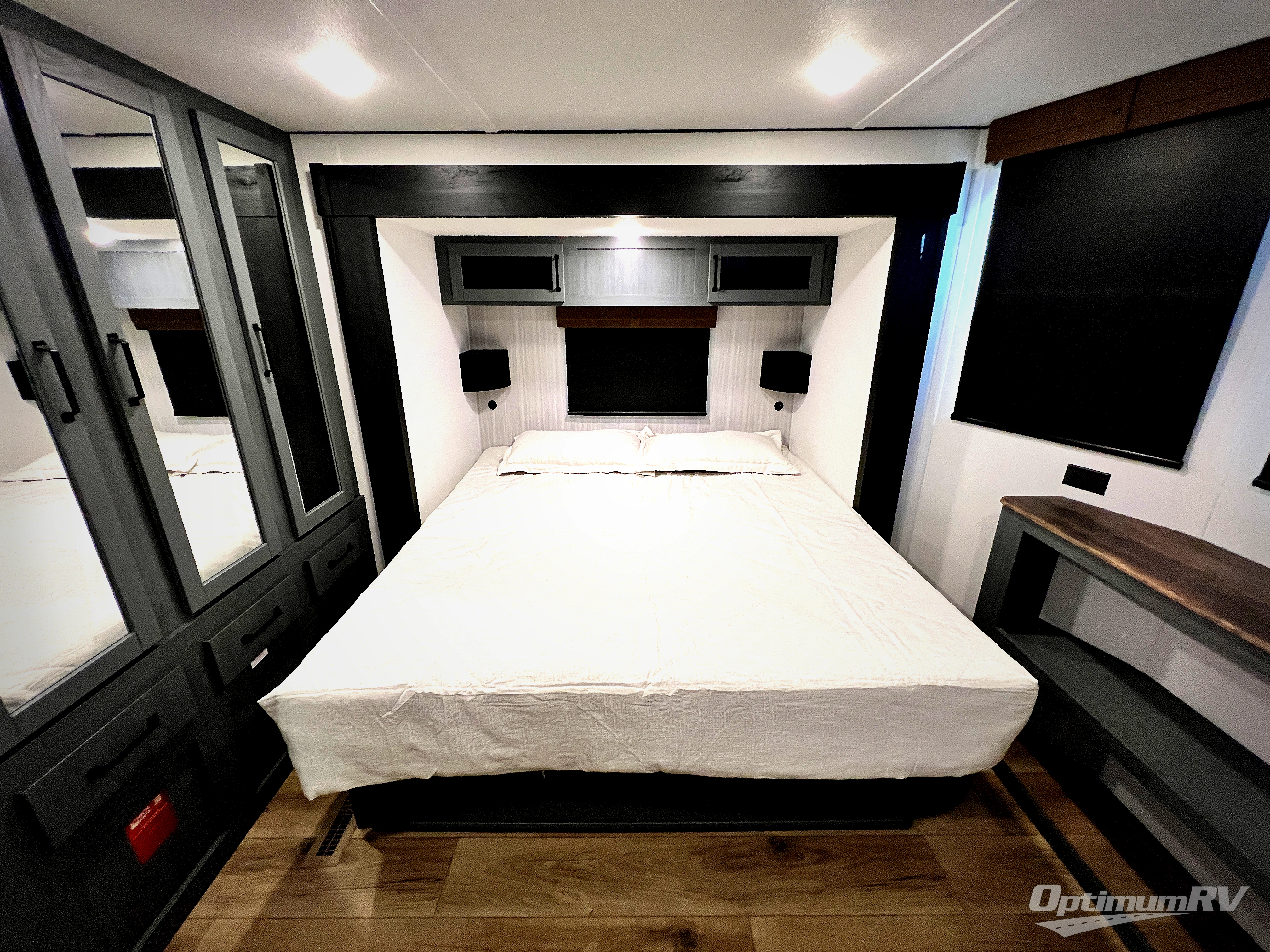 Head to your favorite spots with this destination trailer! With two entry doors, you can easily enter or exit the unit. The front private bedroom includes a king bed slide out, a wardrobe and dresser to keep your clothes organized, plus a countertop for your books or jewelry. Just outside this room is the ladder that leads to the large loft area with two 32" x 80" bunk mats, a cubby, a counter, a nightstand, and cabinets. Once you've headed back downstairs, you can relax on the L-shaped sofa across from the entertainment center with a fireplace and slide-out cabinet or the table and chairs with bench seating. And the chef of your group will love the kitchen with its residential style refrigerator and pantry, kitchen island, and four burner cooktop. The full rear bathroom not only has a 32" x 40" shower with a seat to freshen up in, and a closet with washer/dryer prep, but is also below the second loft with a 32" x 80" bunk mat and closet for storage!