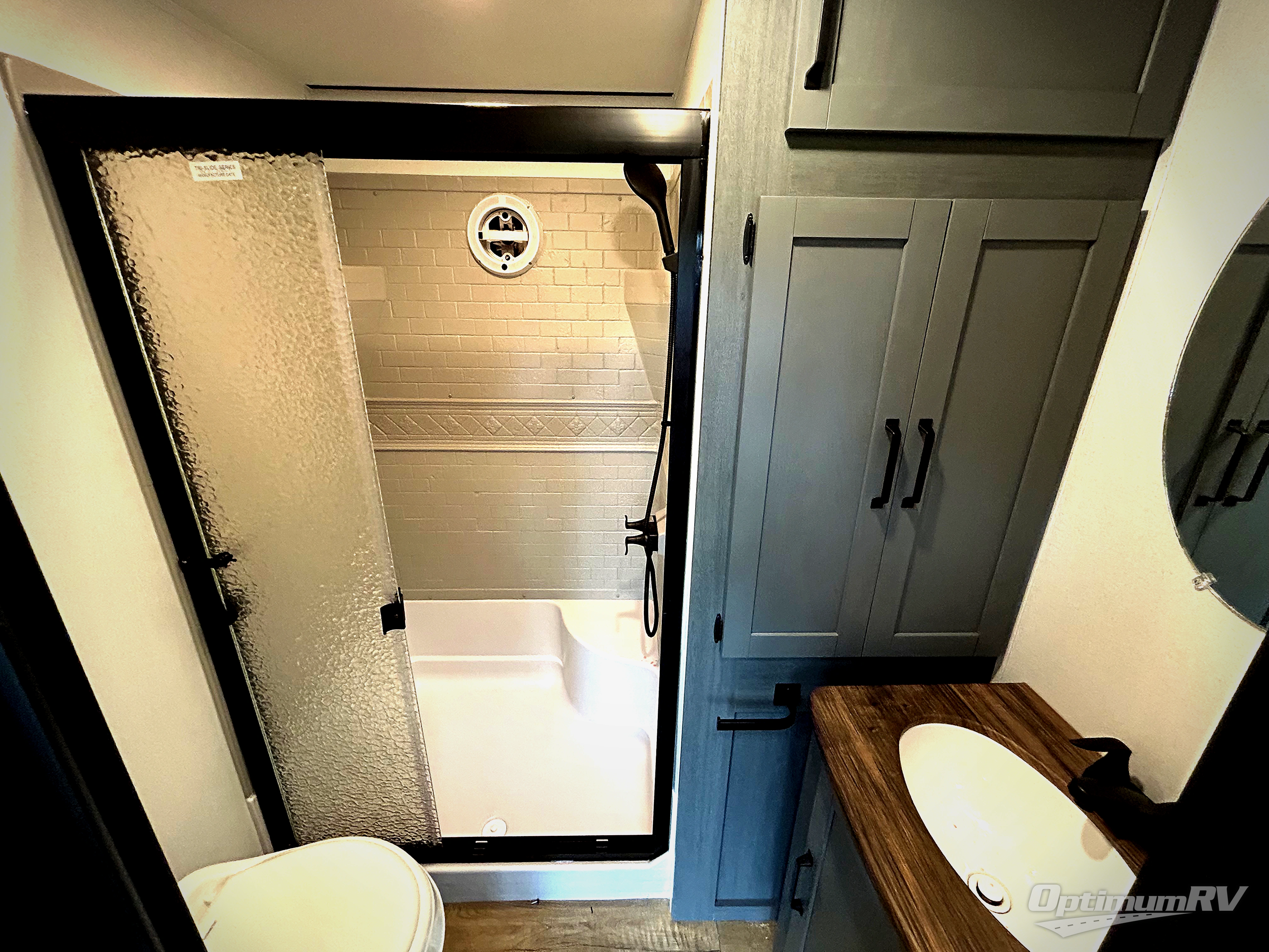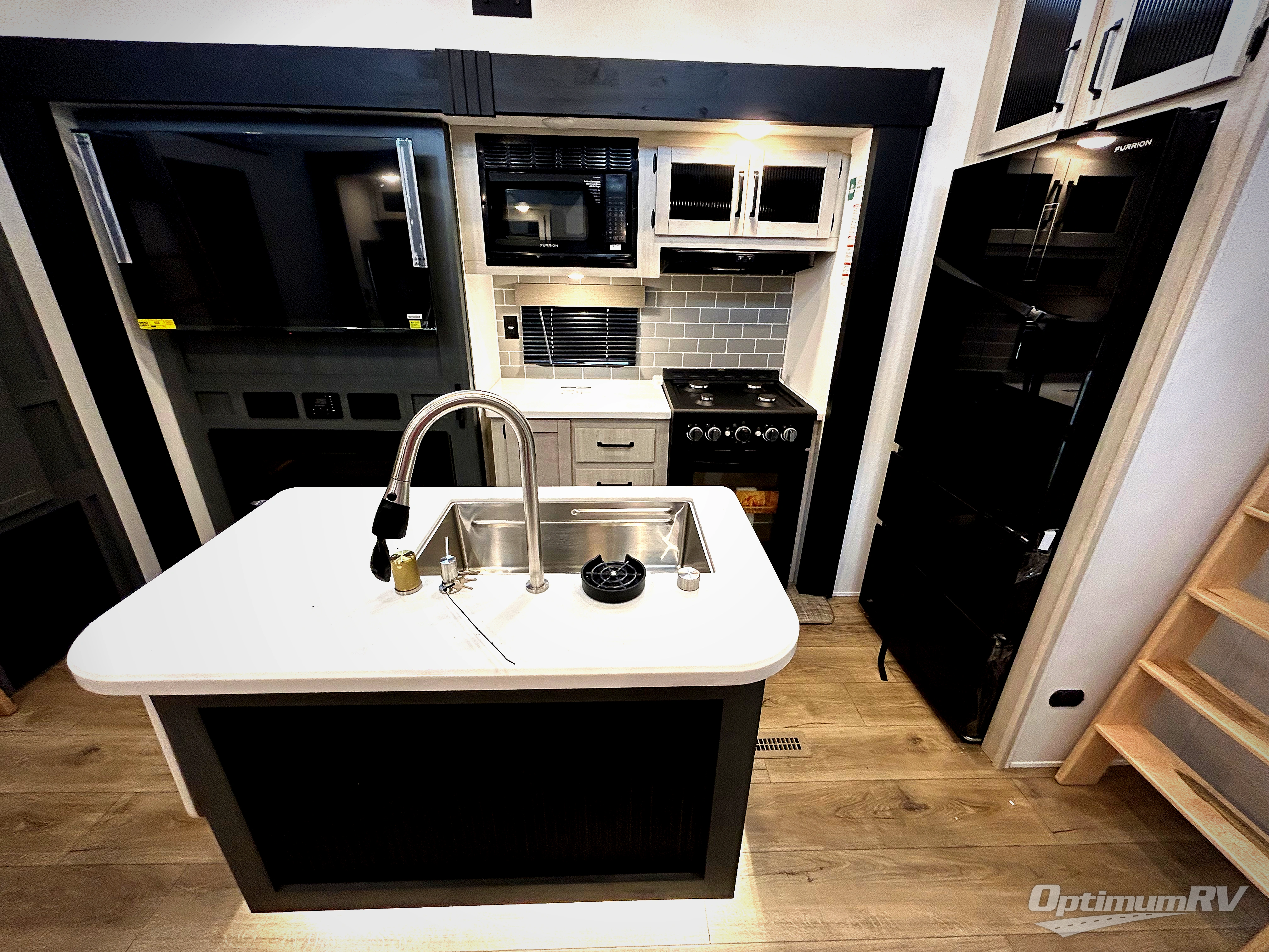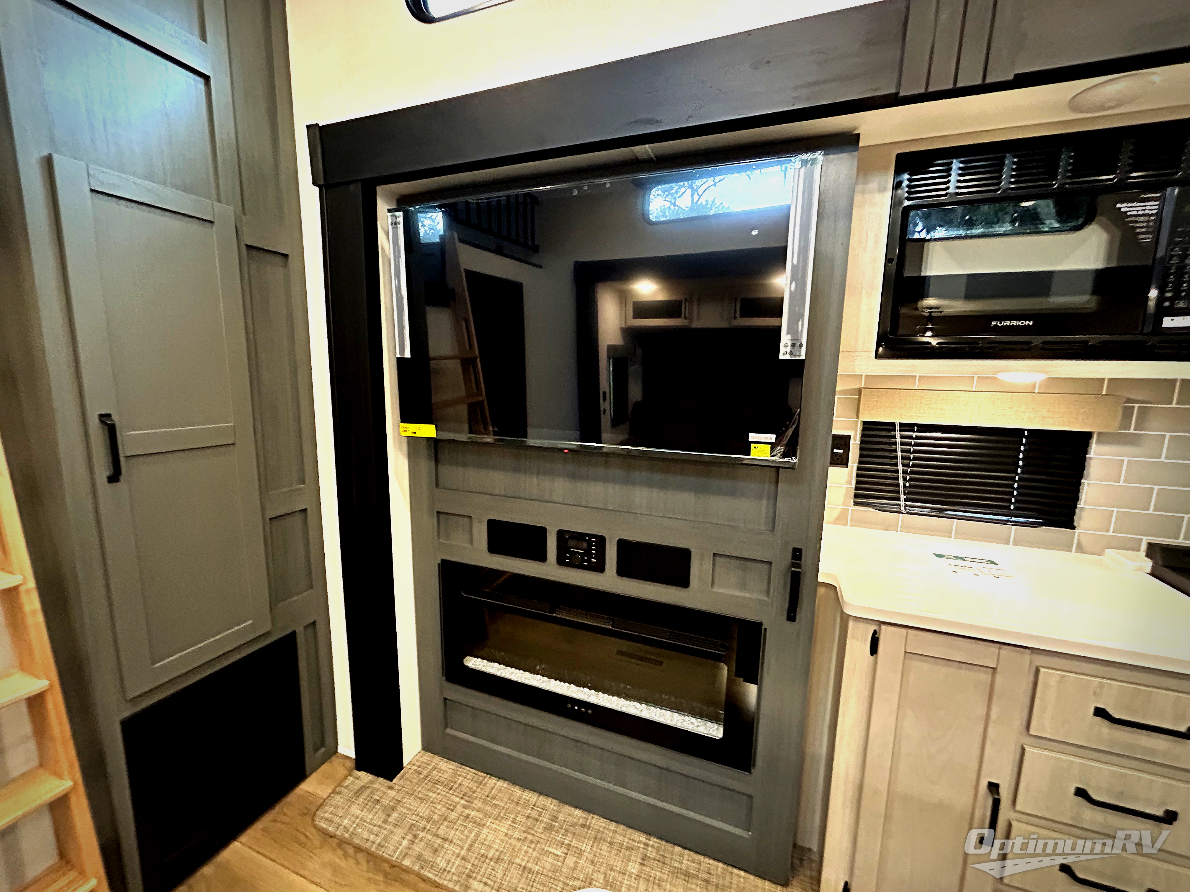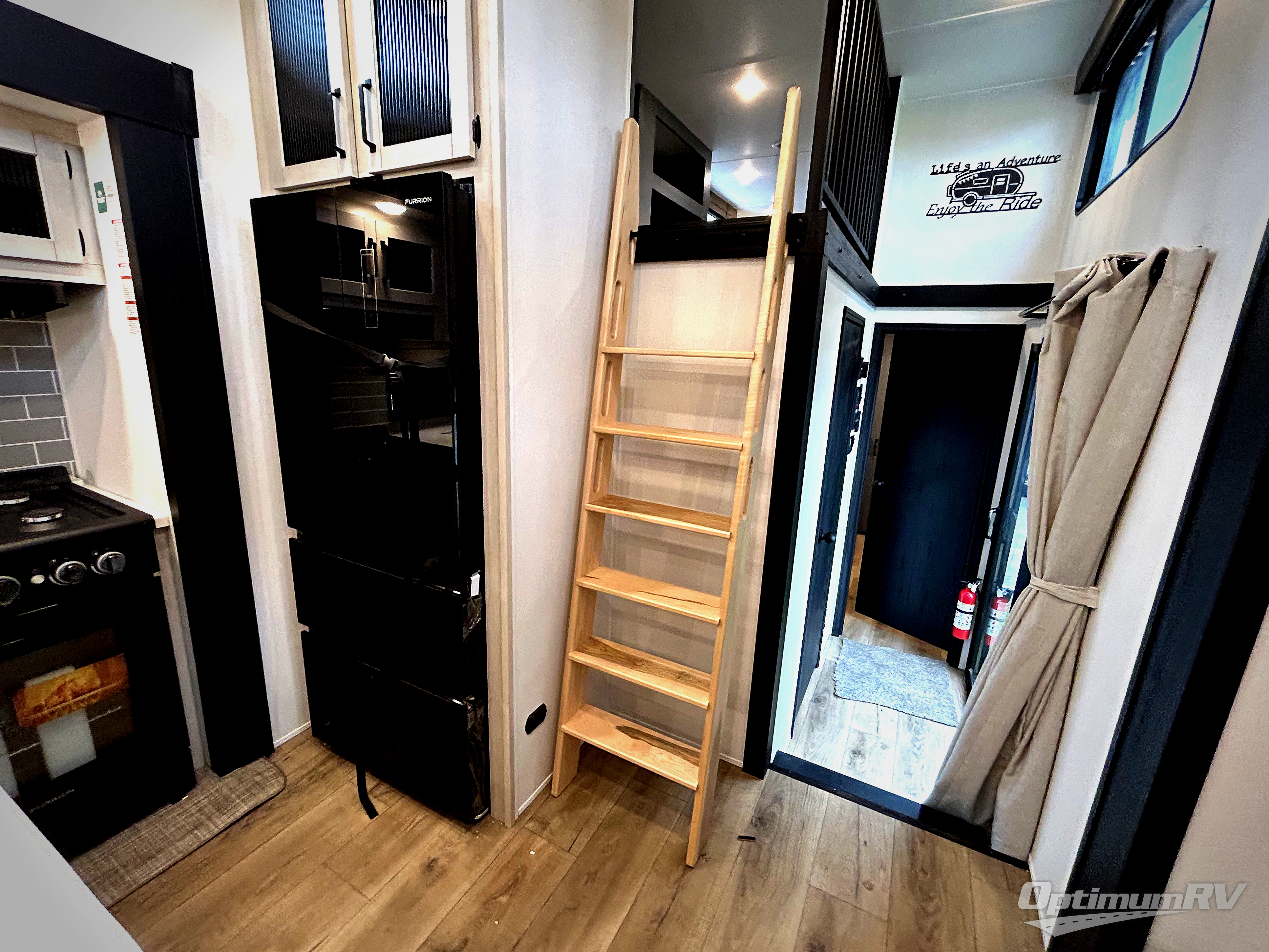 Head to your favorite spots with this destination trailer! With two entry doors, you can easily enter or exit the unit. The front private bedroom includes a king bed slide out, a wardrobe and dresser to keep your clothes organized, plus a countertop for your books or jewelry. Just outside this room is the ladder that leads to the large loft area with two 32" x 80" bunk mats, a cubby, a counter, a nightstand, and cabinets. Once you've headed back downstairs, you can relax on the L-shaped sofa across from the entertainment center with a fireplace and slide-out cabinet or the free-standing table with a bench and two seats. And the chef of your group will love the kitchen with its residential style refrigerator and pantry, kitchen island, and four burner cooktop. The full rear bathroom not only has a 32" x 40" shower with a seat to freshen up in and a closet prepped to add the optional washer and dryer, but is also below the second loft with a 32" x 80" bunk mat and closet for storage!