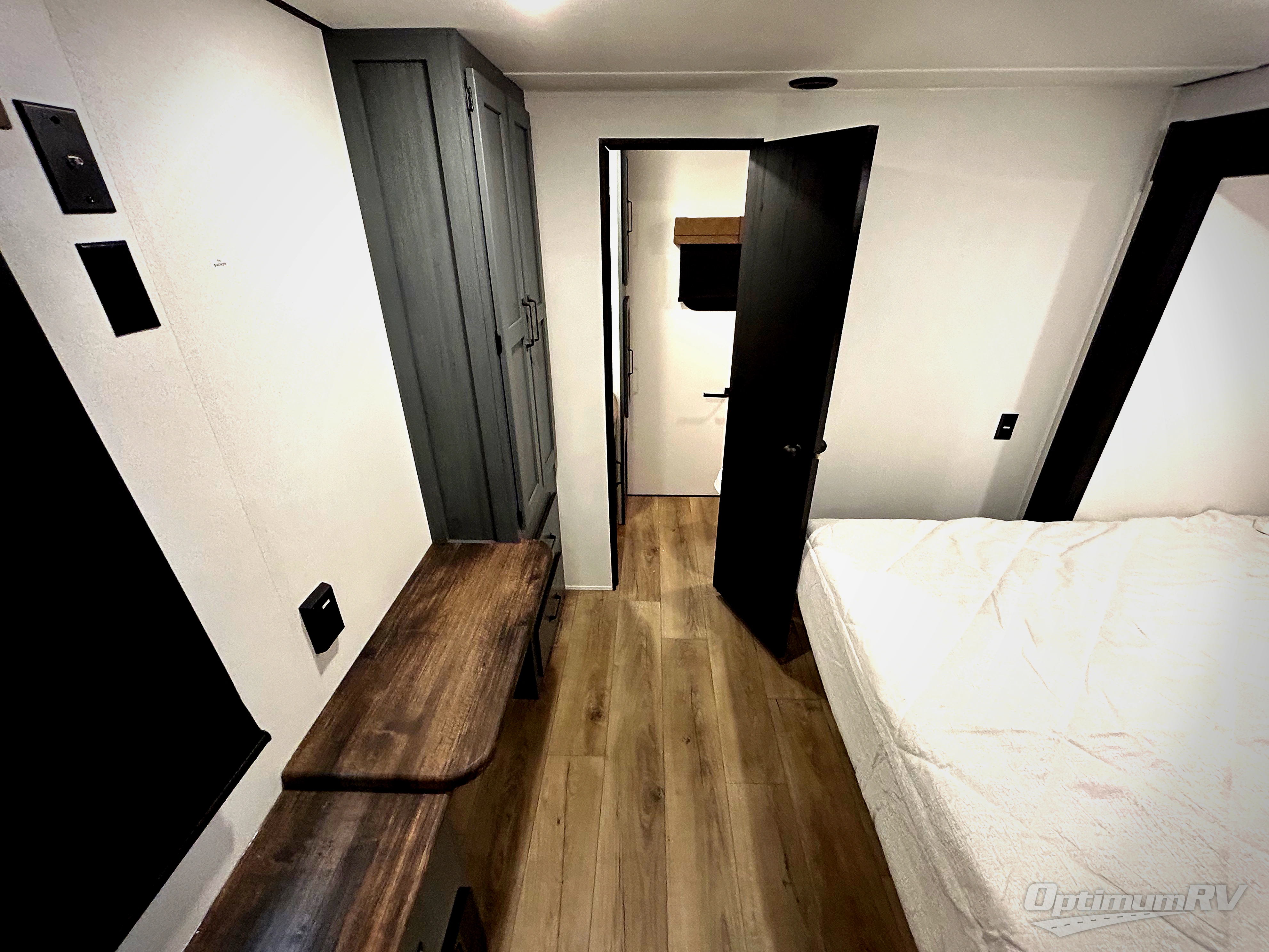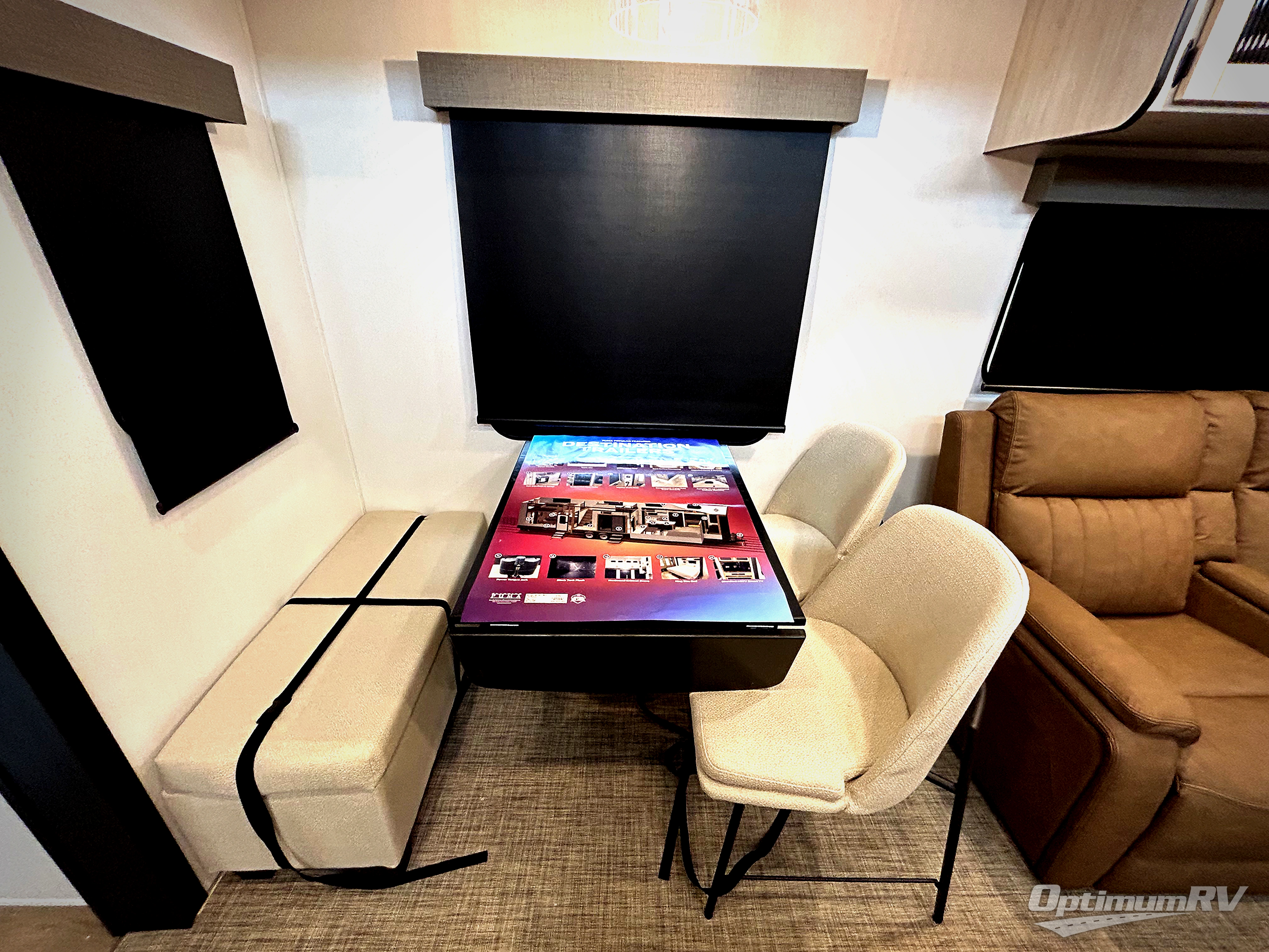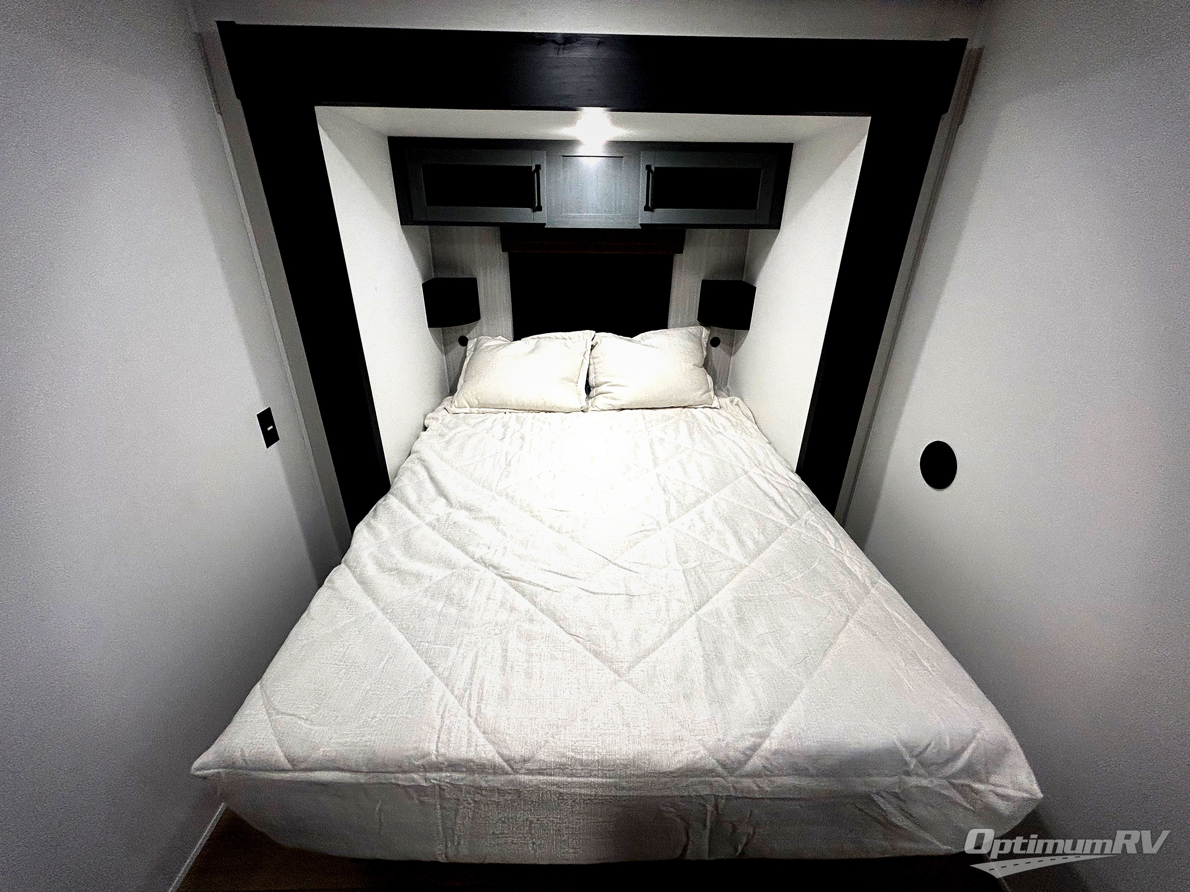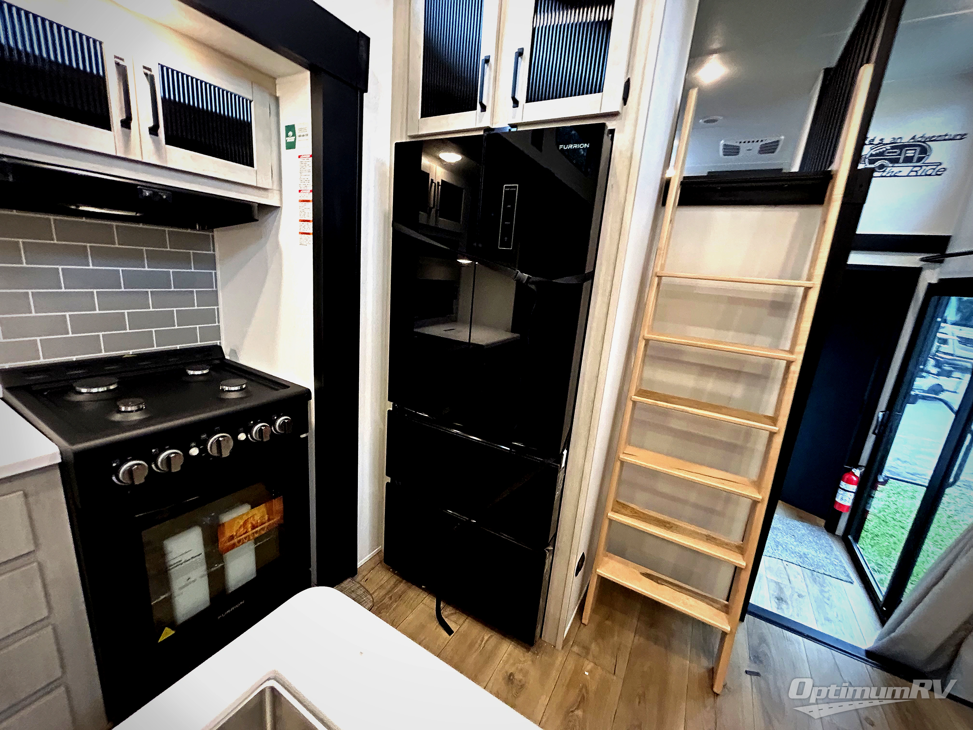 Head to your favorite spots with this destination trailer! With two entry doors, you can easily enter or exit the unit. The front private bedroom includes a king bed slide out, a wardrobe and dresser to keep your clothes organized, plus a countertop for your books or jewelry. Just outside this room is the ladder that leads to the large loft area with two 32" x 80" bunk mats, a cubby, a counter, a nightstand, and cabinets. Once you've headed back downstairs, you can relax on the L-shaped sofa across from the entertainment center with a fireplace and slide-out cabinet or the free-standing table with a bench and two seats. And the chef of your group will love the kitchen with its residential style refrigerator and pantry, kitchen island, and four burner cooktop. The full rear bathroom not only has a 32" x 40" shower with a seat to freshen up in and a closet prepped to add the optional washer and dryer, but is also below the second loft with a 32" x 80" bunk mat and closet for storage!